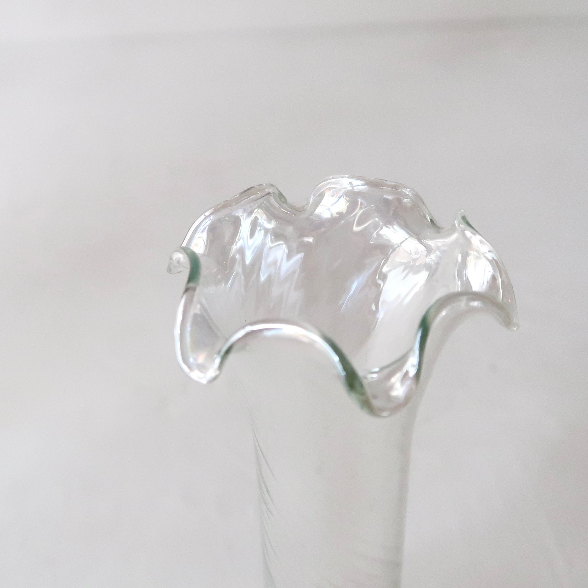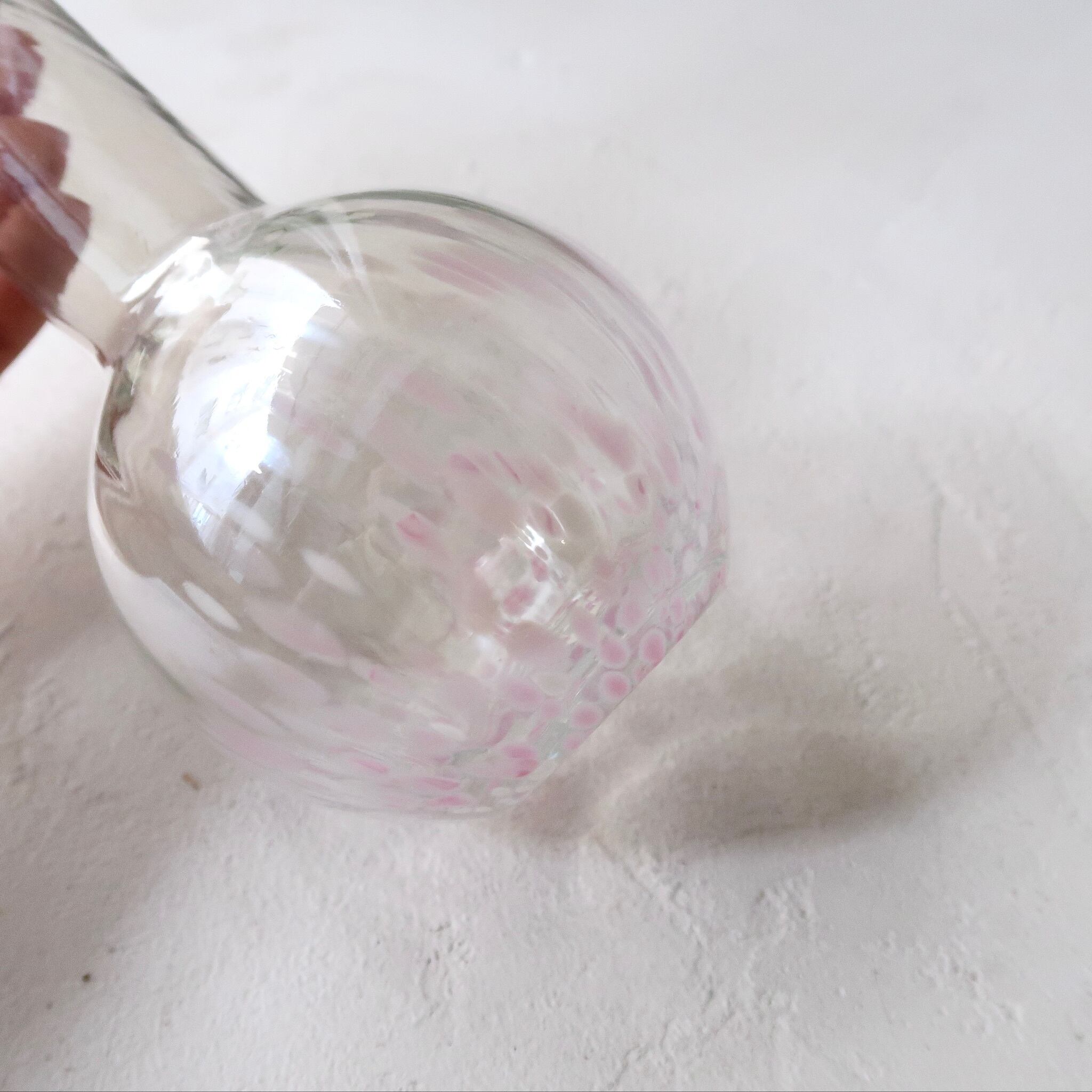 オーロラ感のあるツヤっとした質感に、底のほうには舞い散る桜の花びらのような春らしいマーブル。ふちはひらひら、フラスコのようなフォルム。
