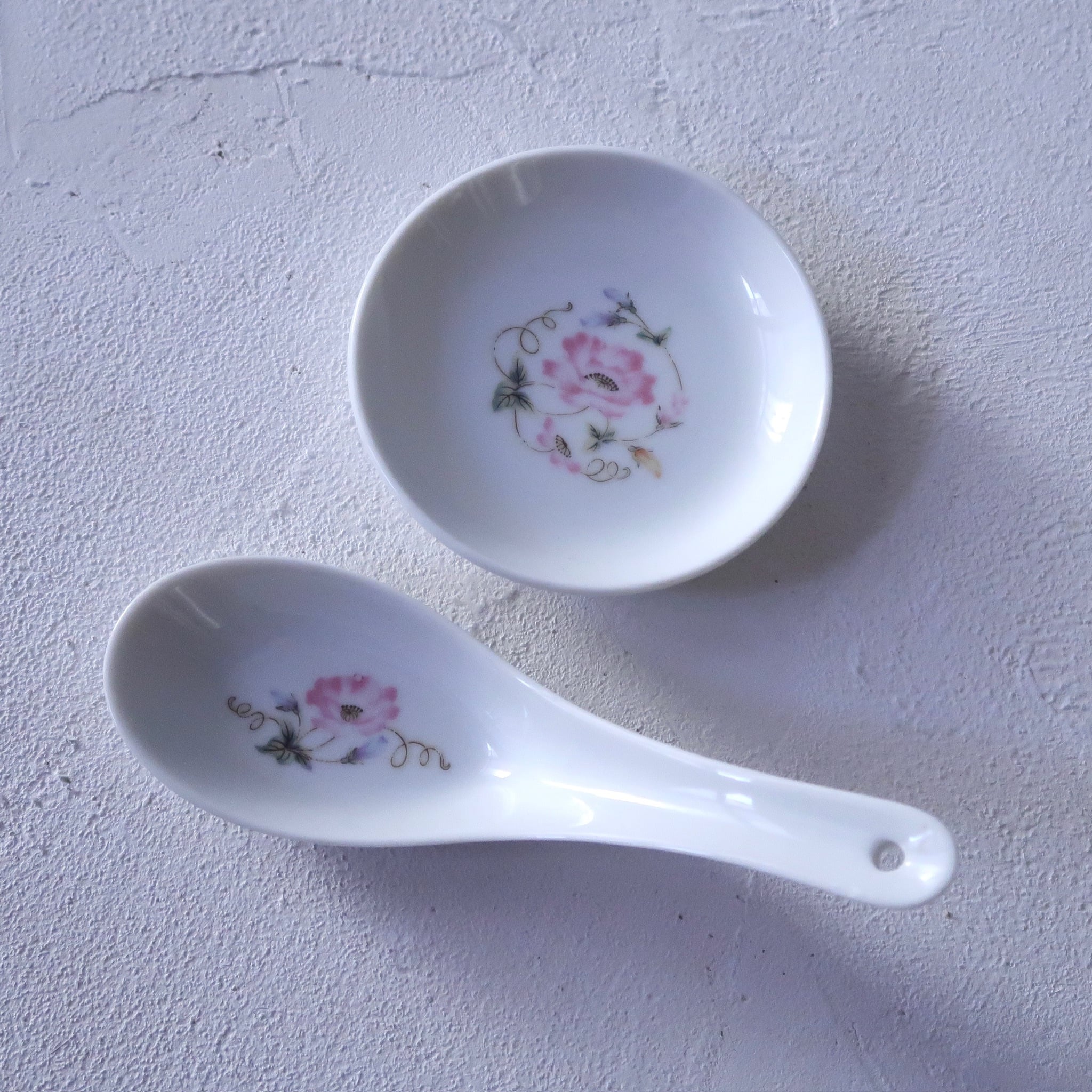 【台湾食器】淡いピンクのお花 レンゲと豆皿