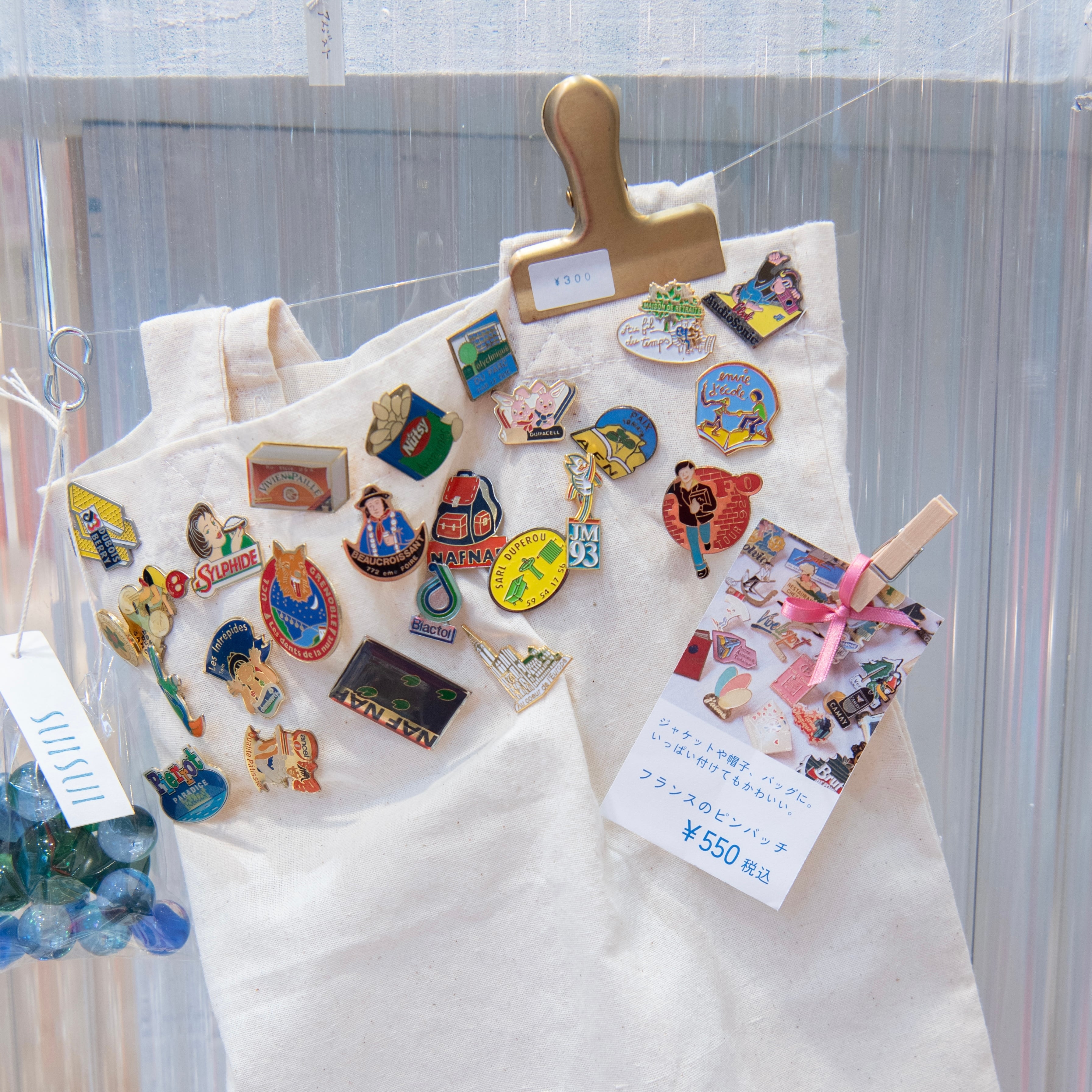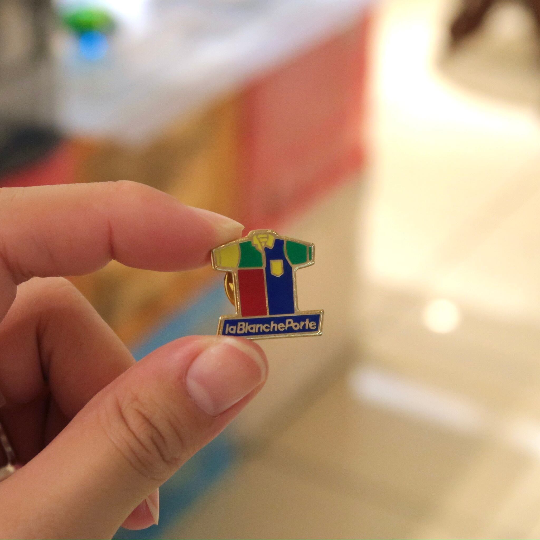 赤、黄、緑、青のハイコントラストのシャツのピンバッチ。一つでも存在感抜群!デニムに合いそうです。