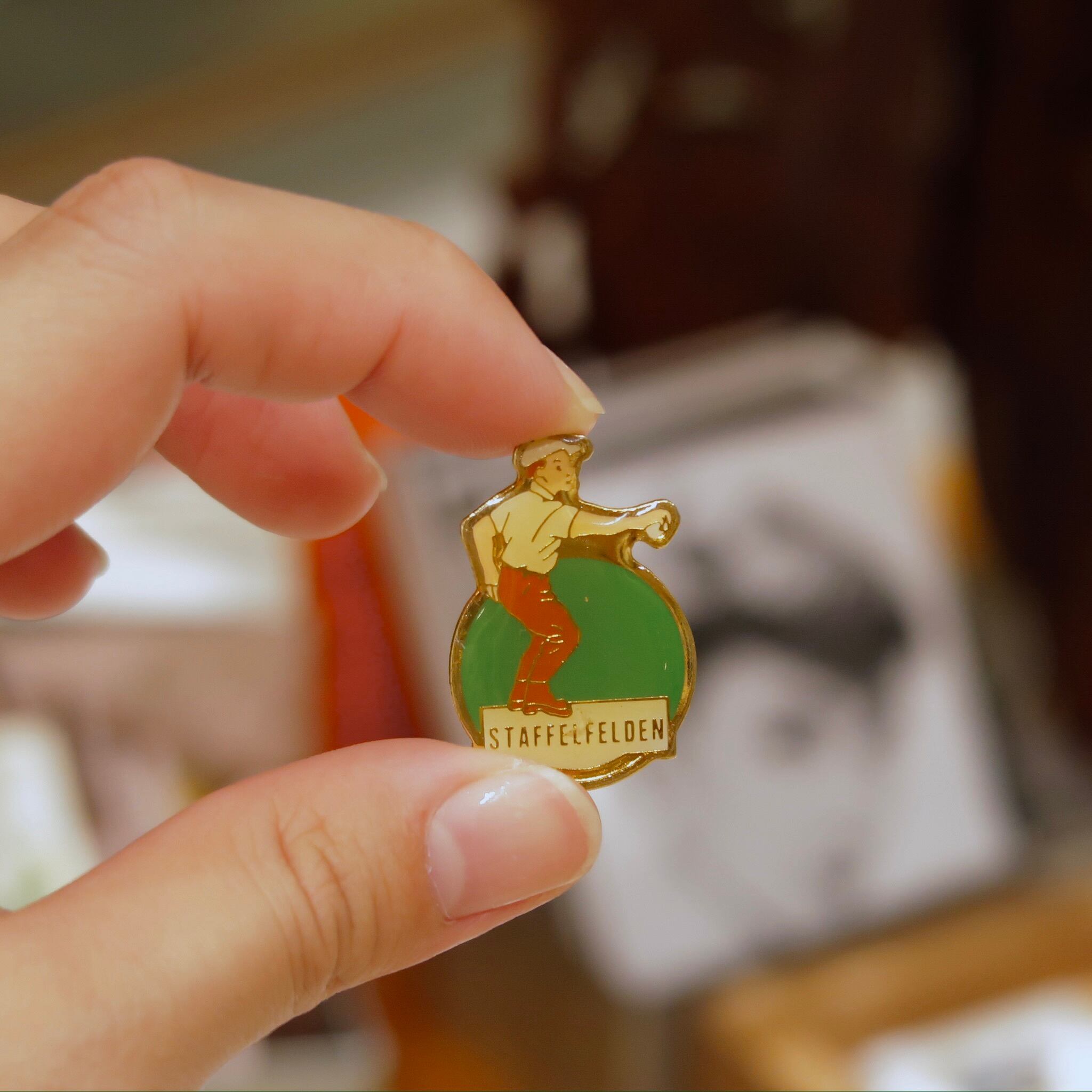 ハンチング帽を被ったお兄さんのピンバッチ。スポーツをしているのでしょうか。踊っているようなポーズがユニークでかわいい。