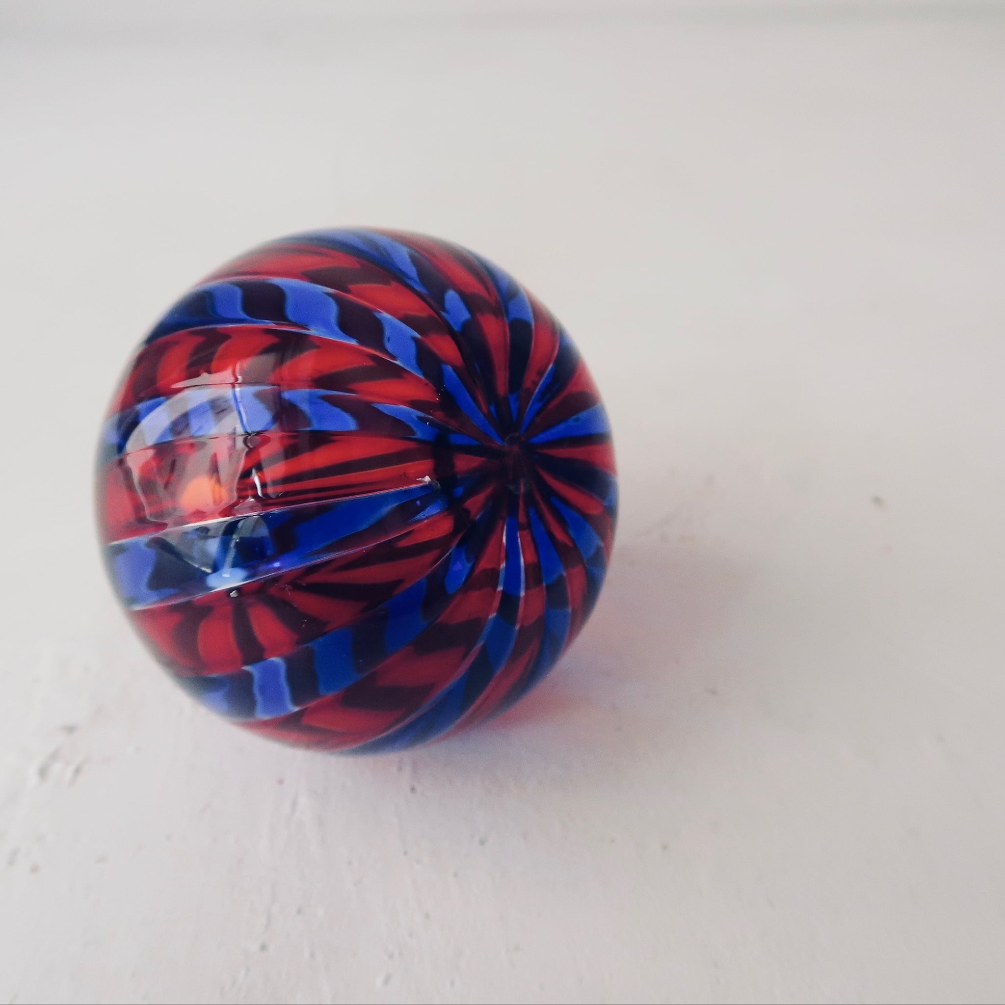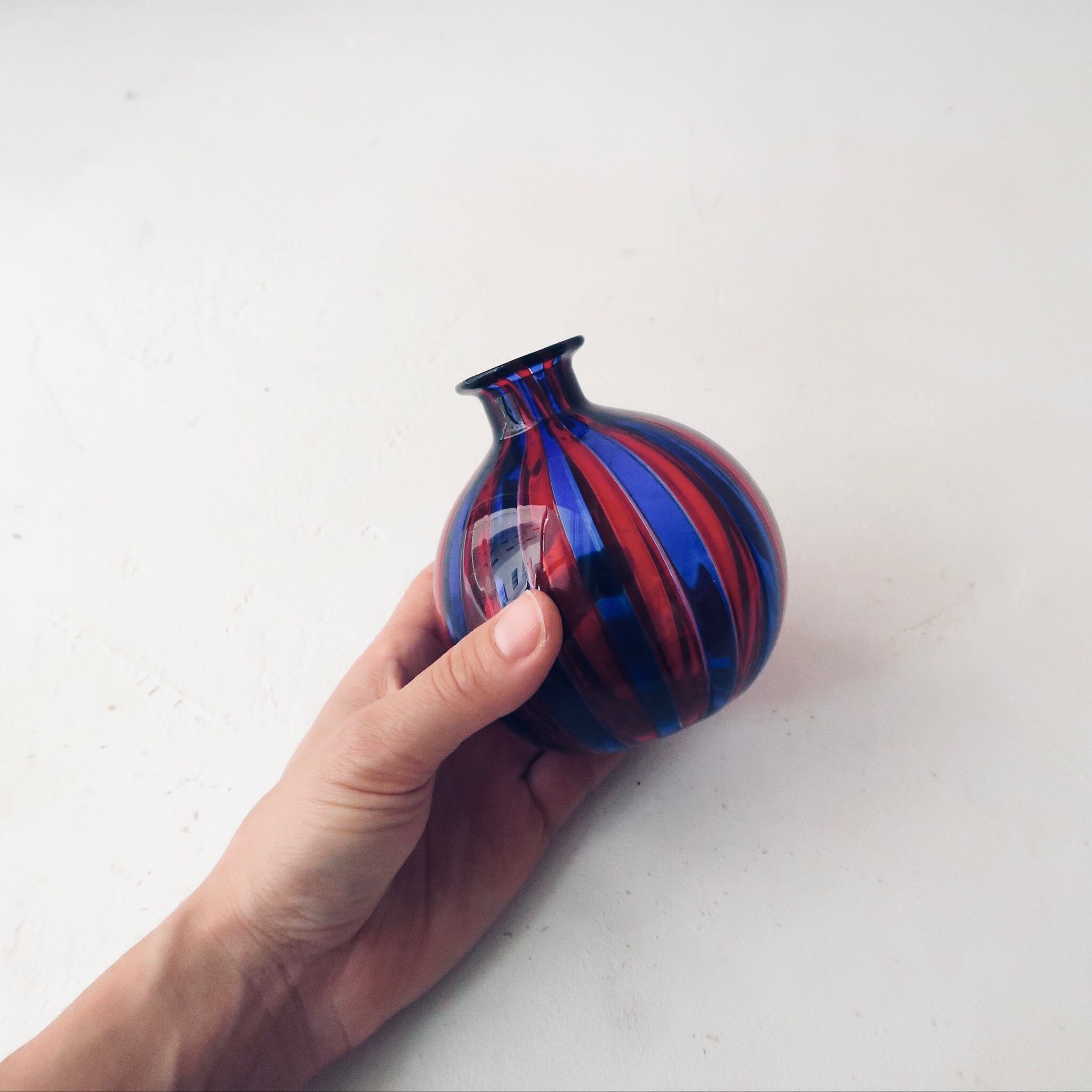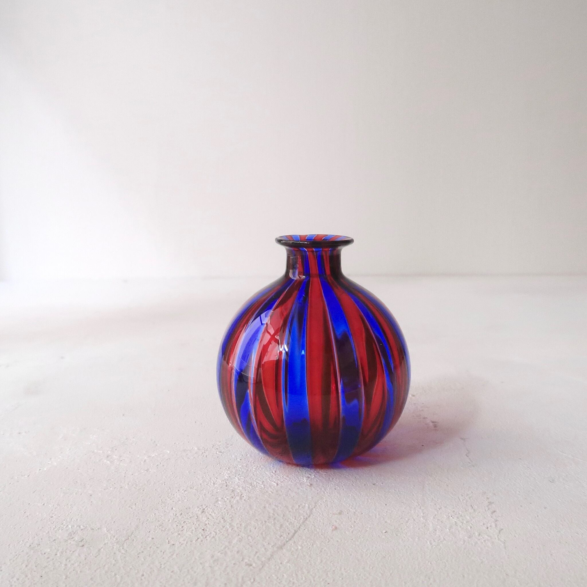 赤と青のストライプが目を惹く、まんまるな花瓶。