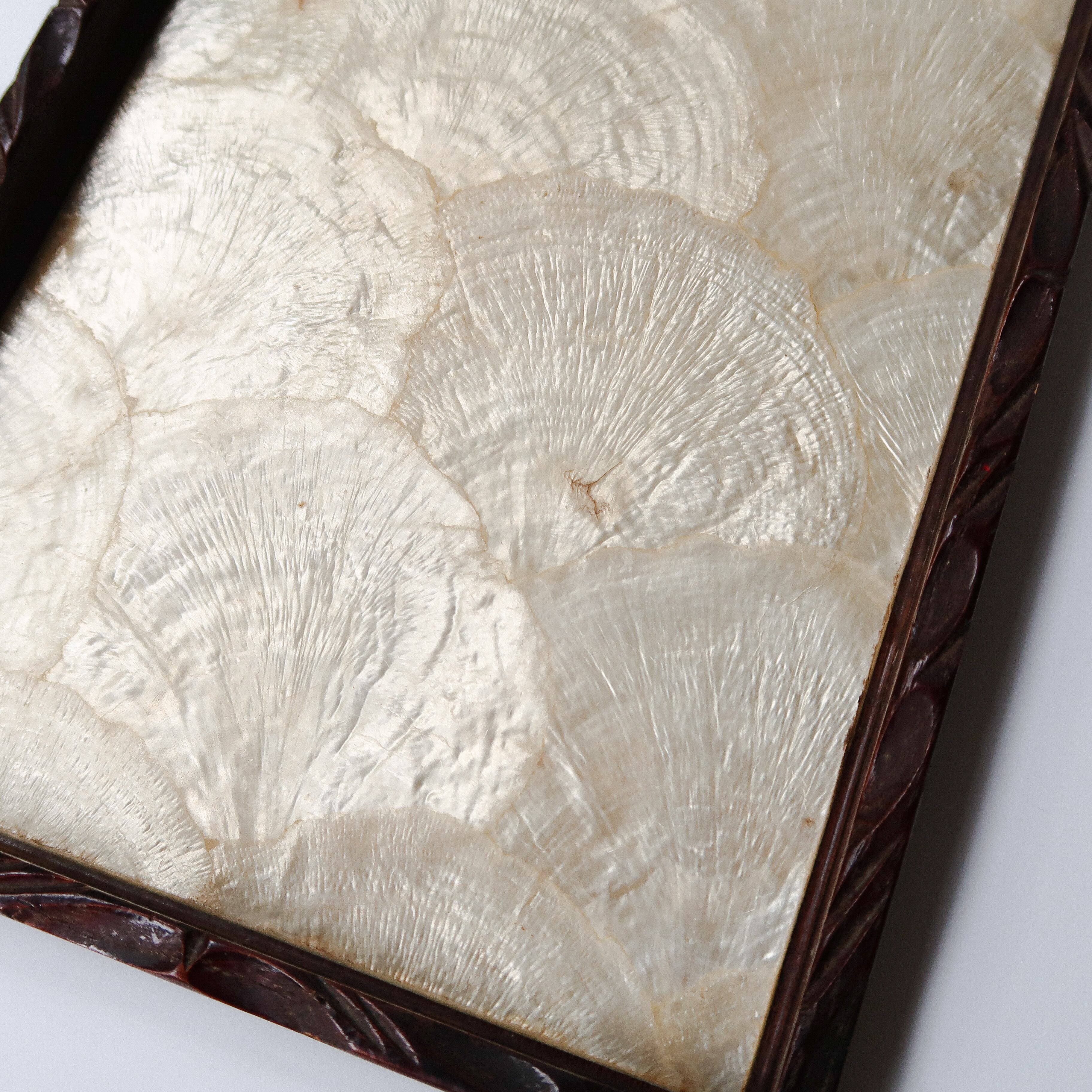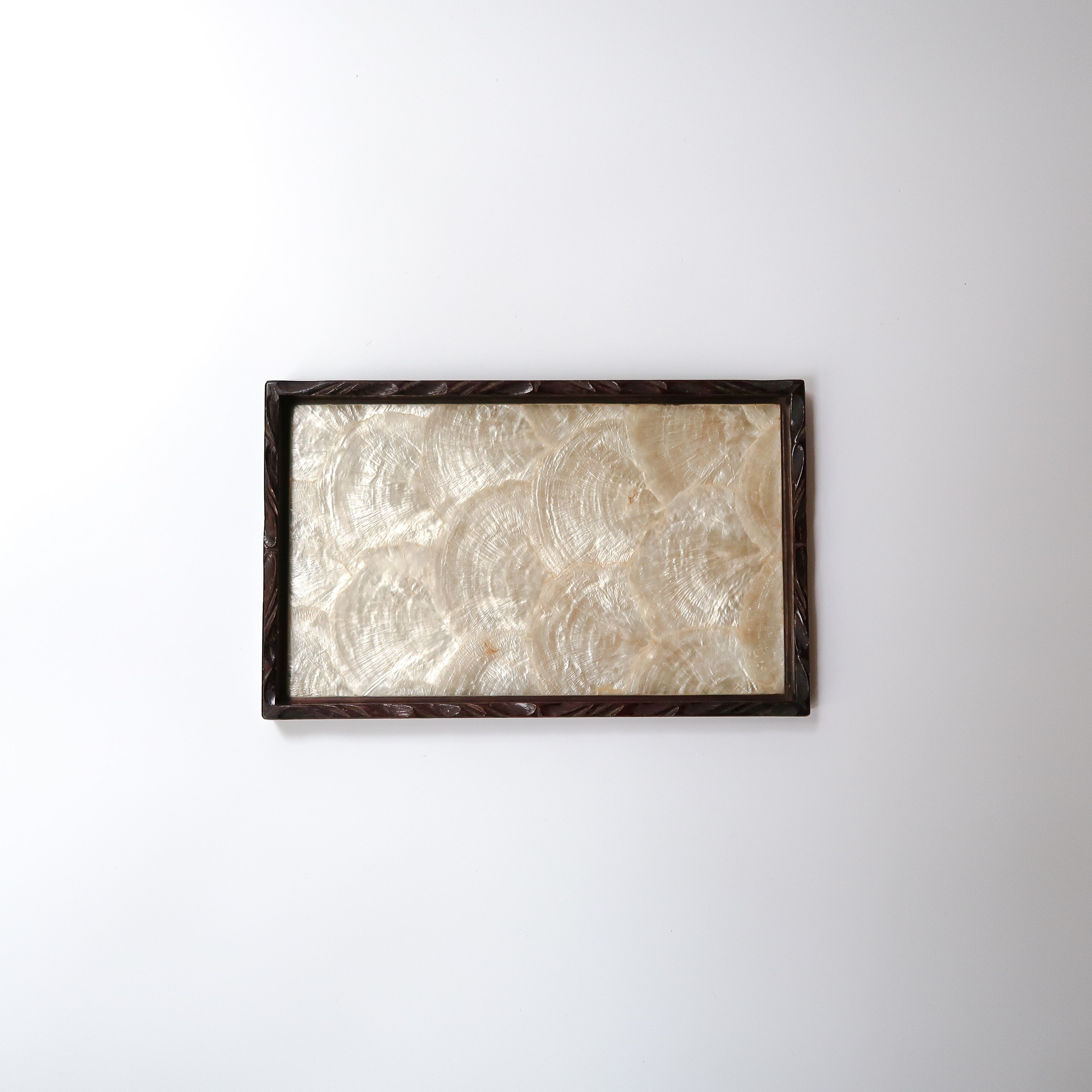 仕入れたときは土がかぶっていましたが、水洗いしたらぴかぴかになりました。木彫りのふちどりもレトロでかわいいです。シェルの部分をマスキングして、ふちどりを白に塗ってもいいかも。