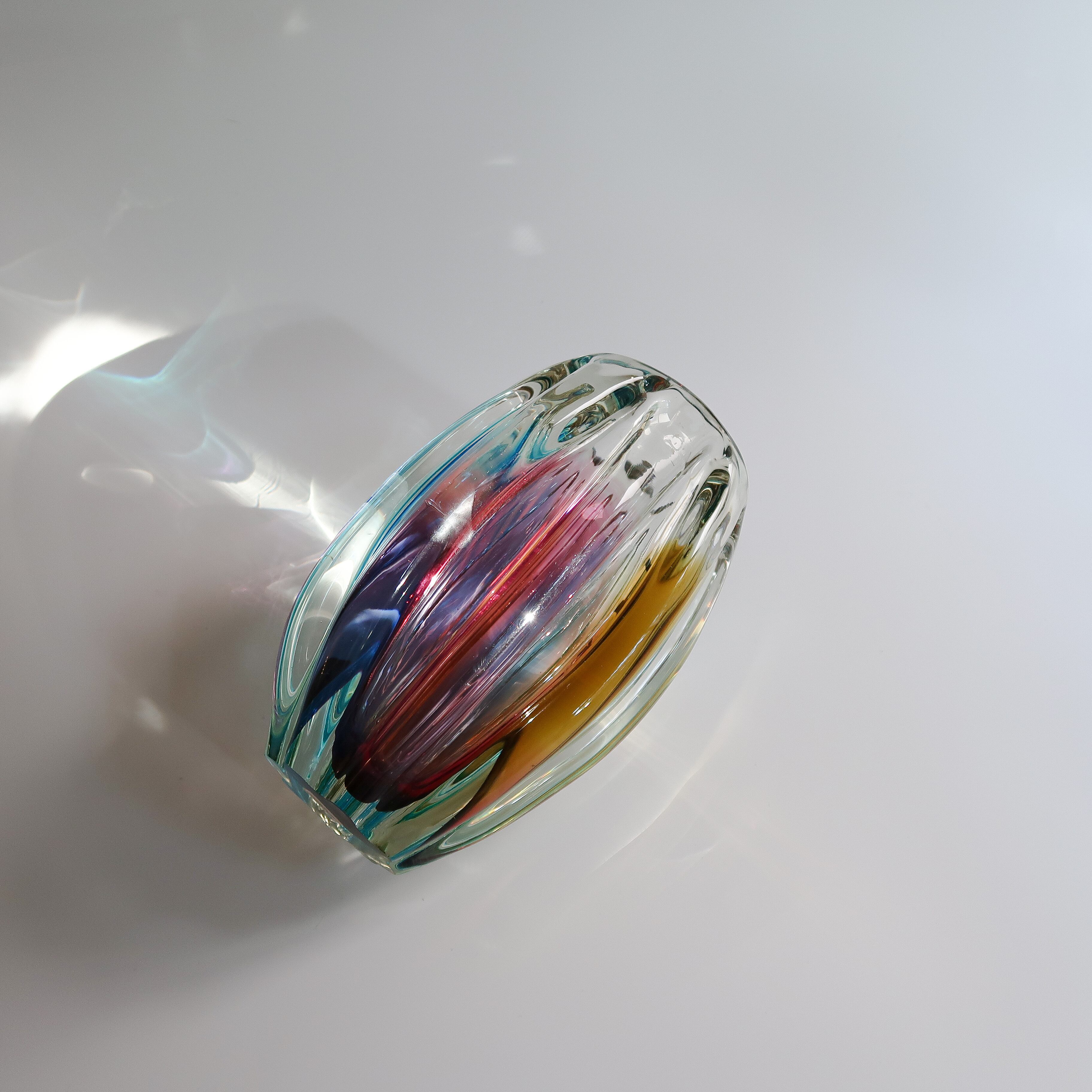 光に当たると、三色をとおしてうるうるっとかがやくおおきな花瓶です。