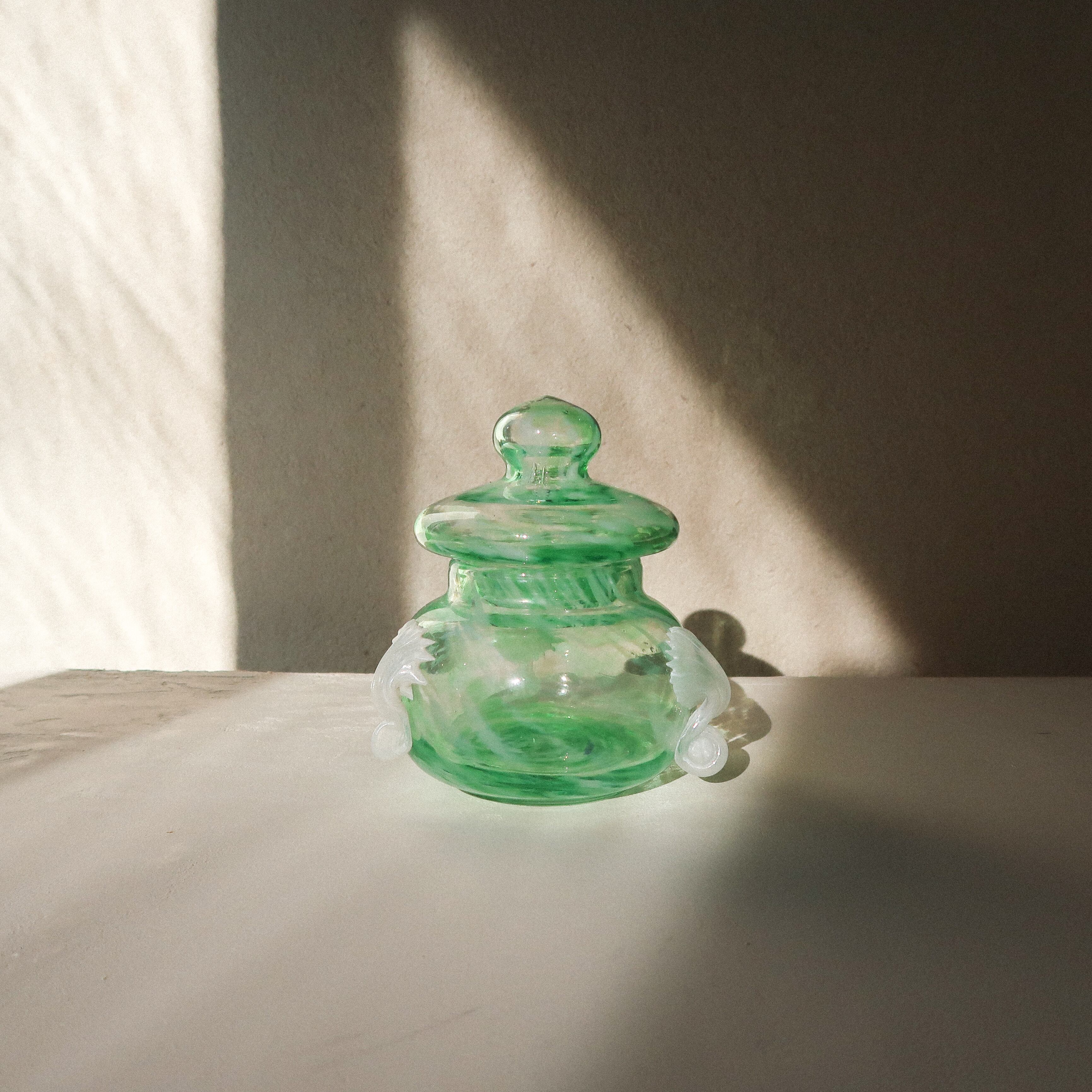 緑と白のマーブルのガラスの容器に、大きなつまみの蓋がついています。蓋まで薄く吹いてつくられているところがかわいいポイント。