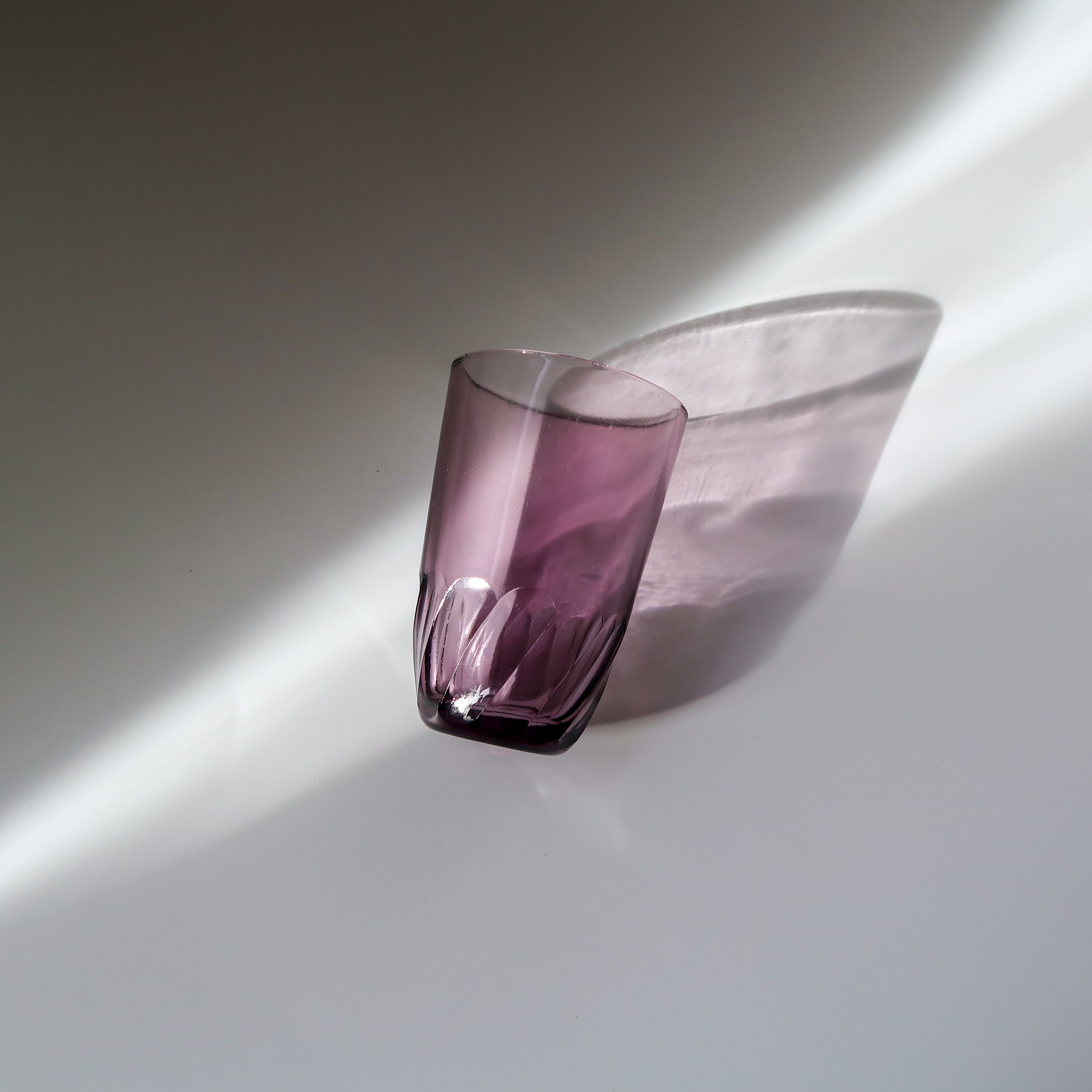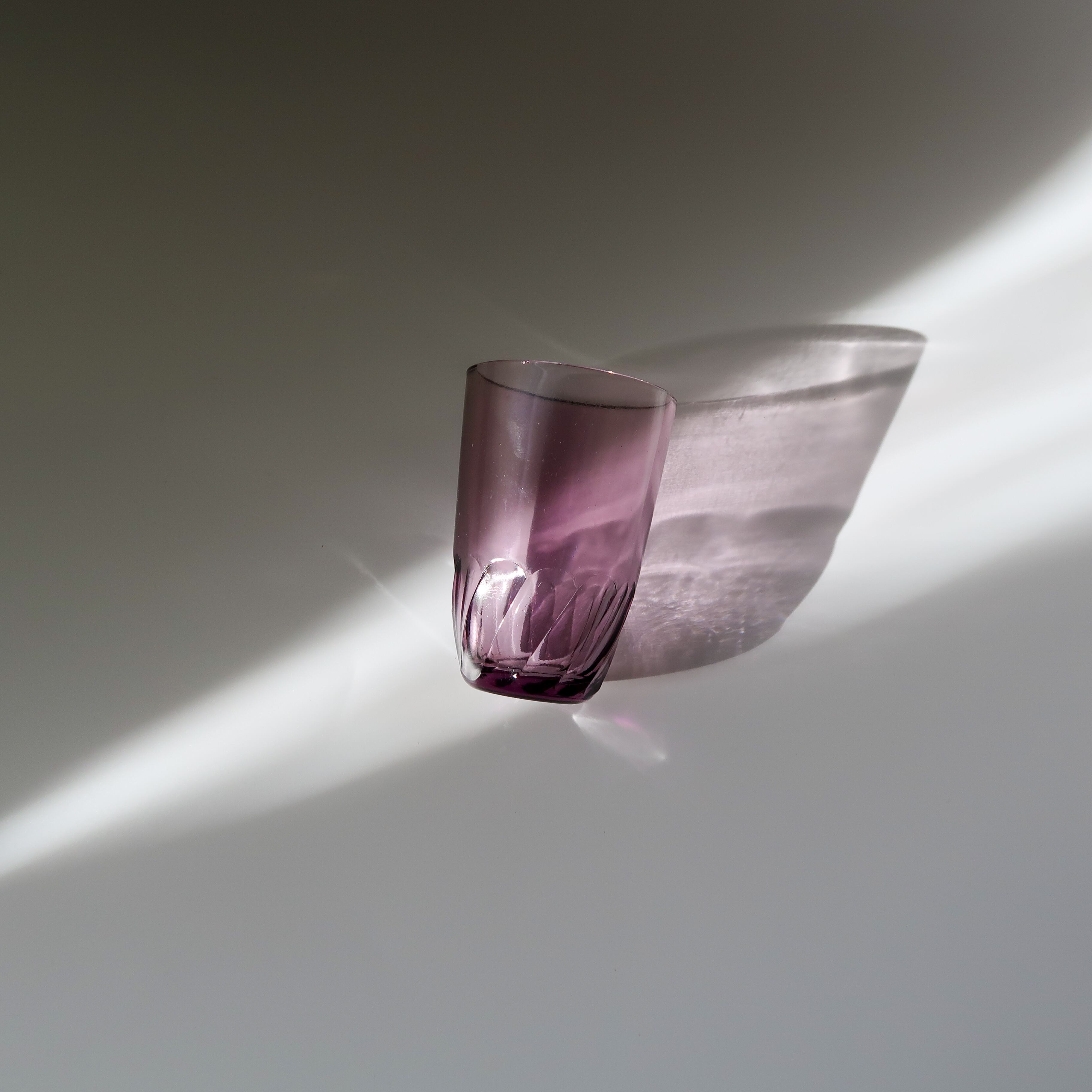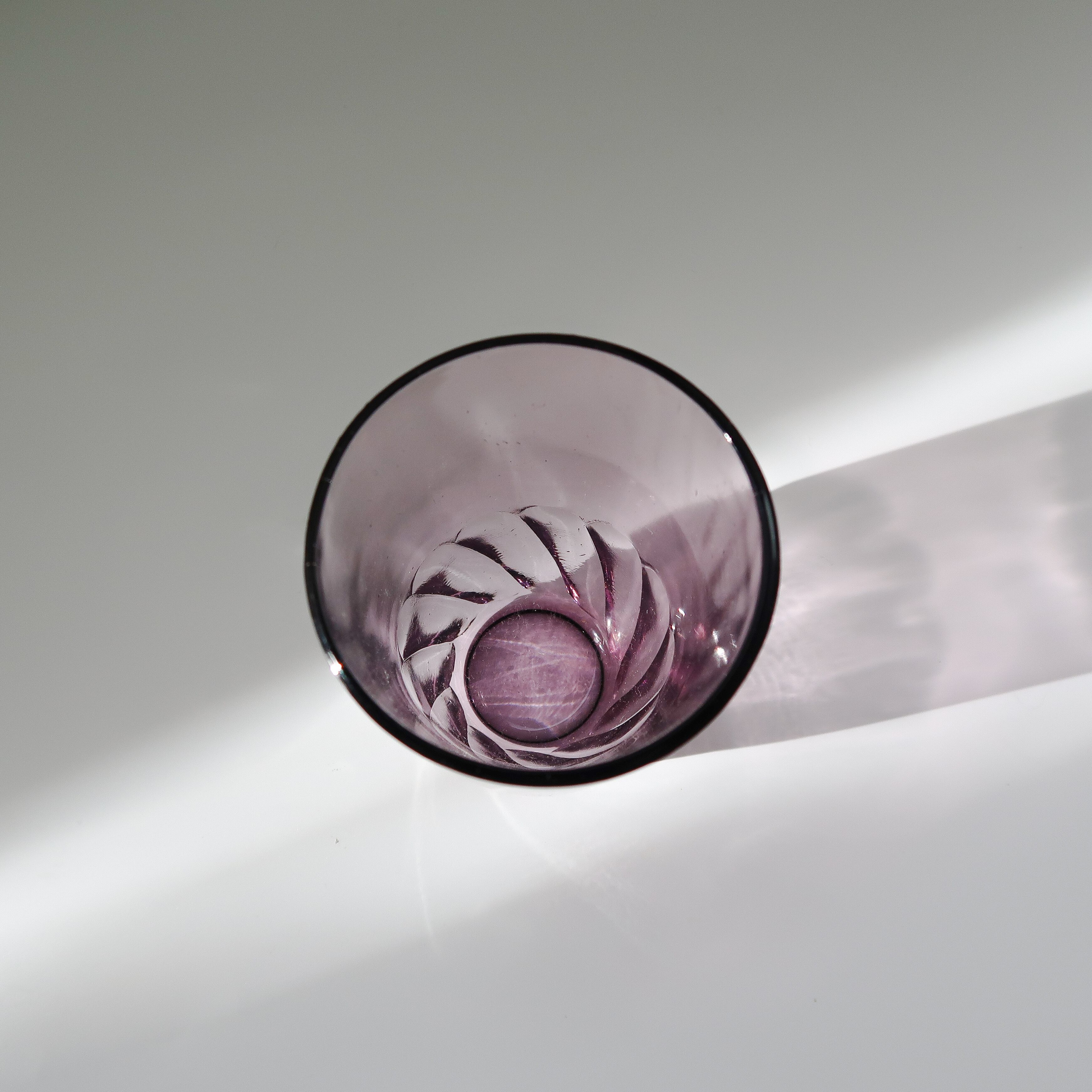 ぼわ〜っと色づいたパープルのコップ。ゆらぎのあるガラスに、底へむかってひねりが加えられています。