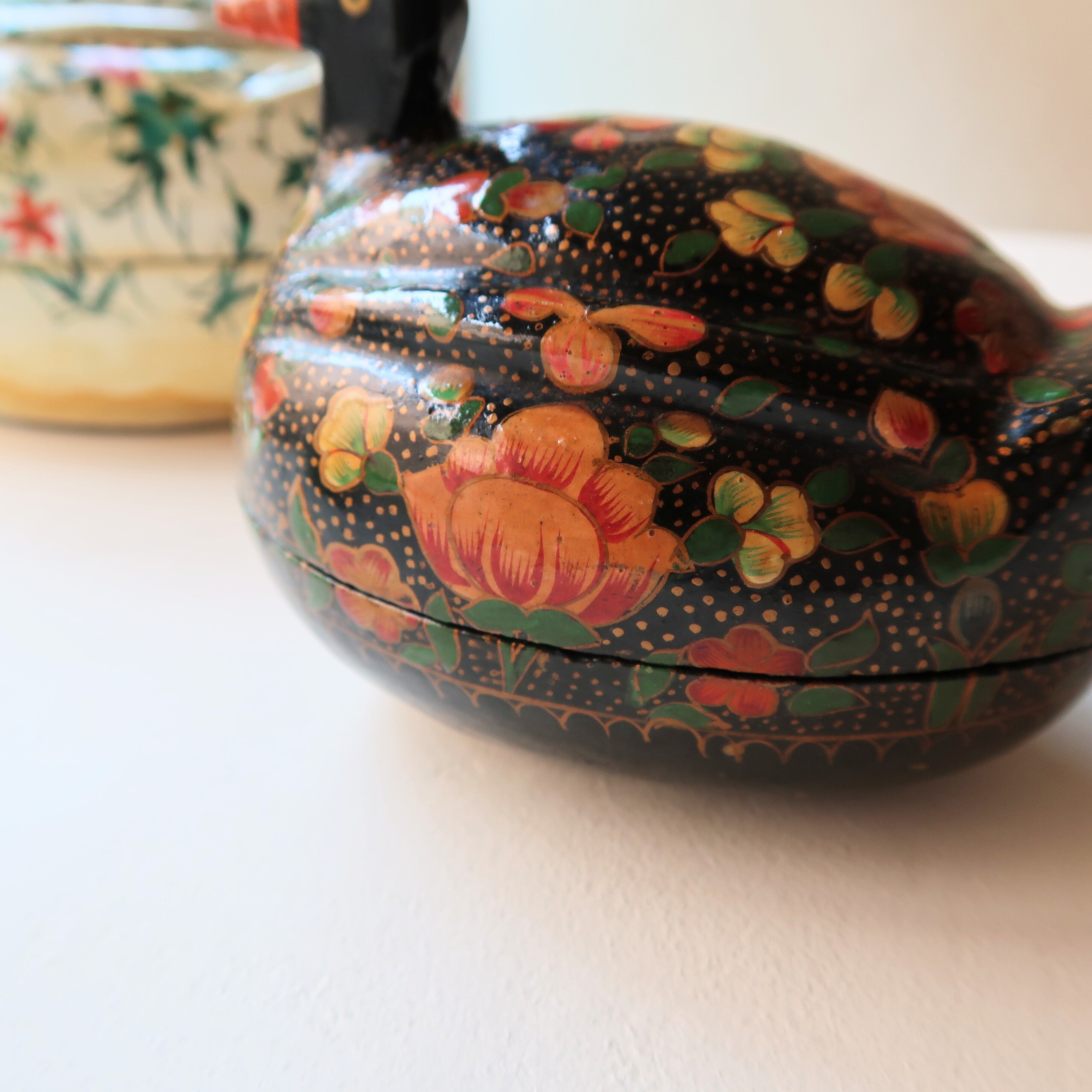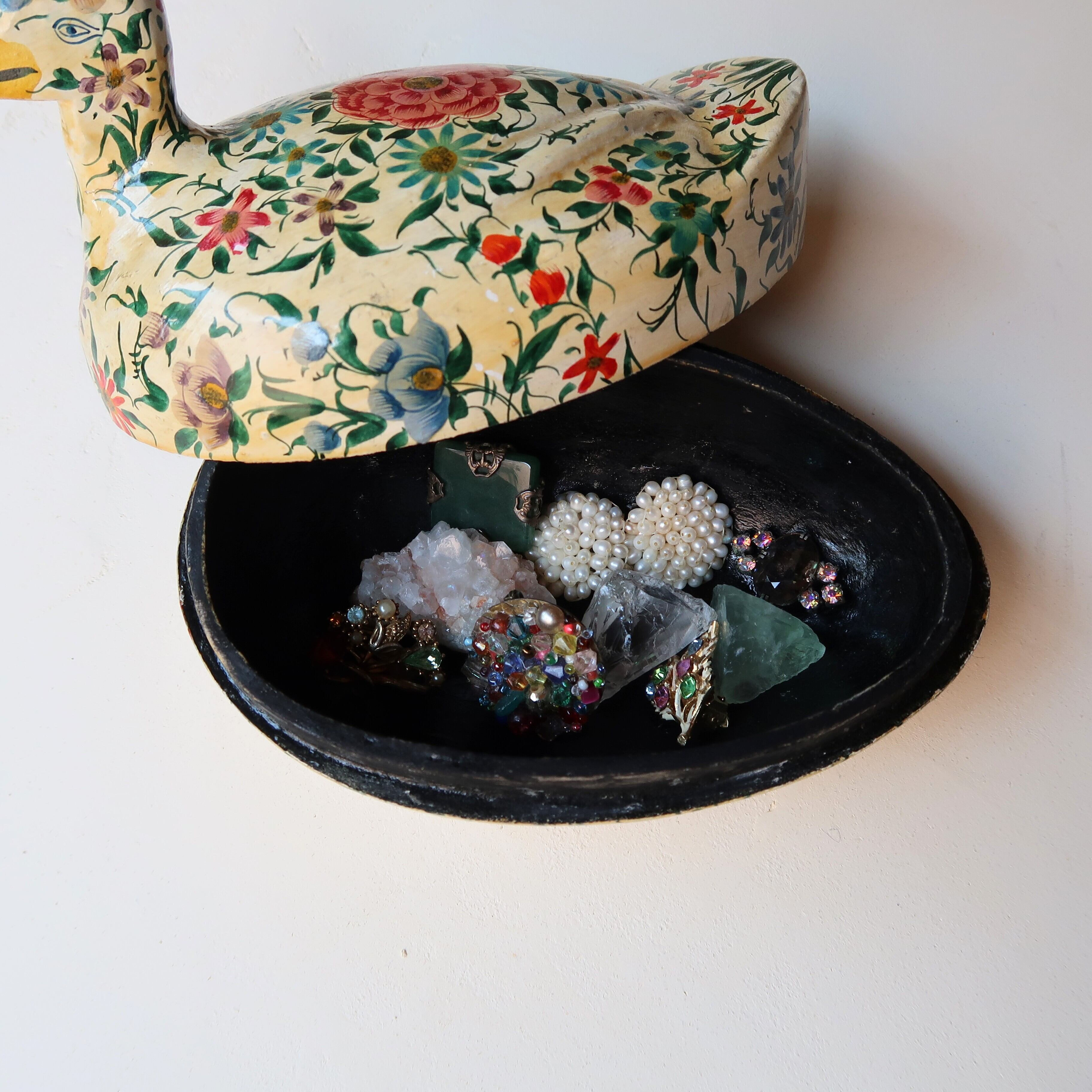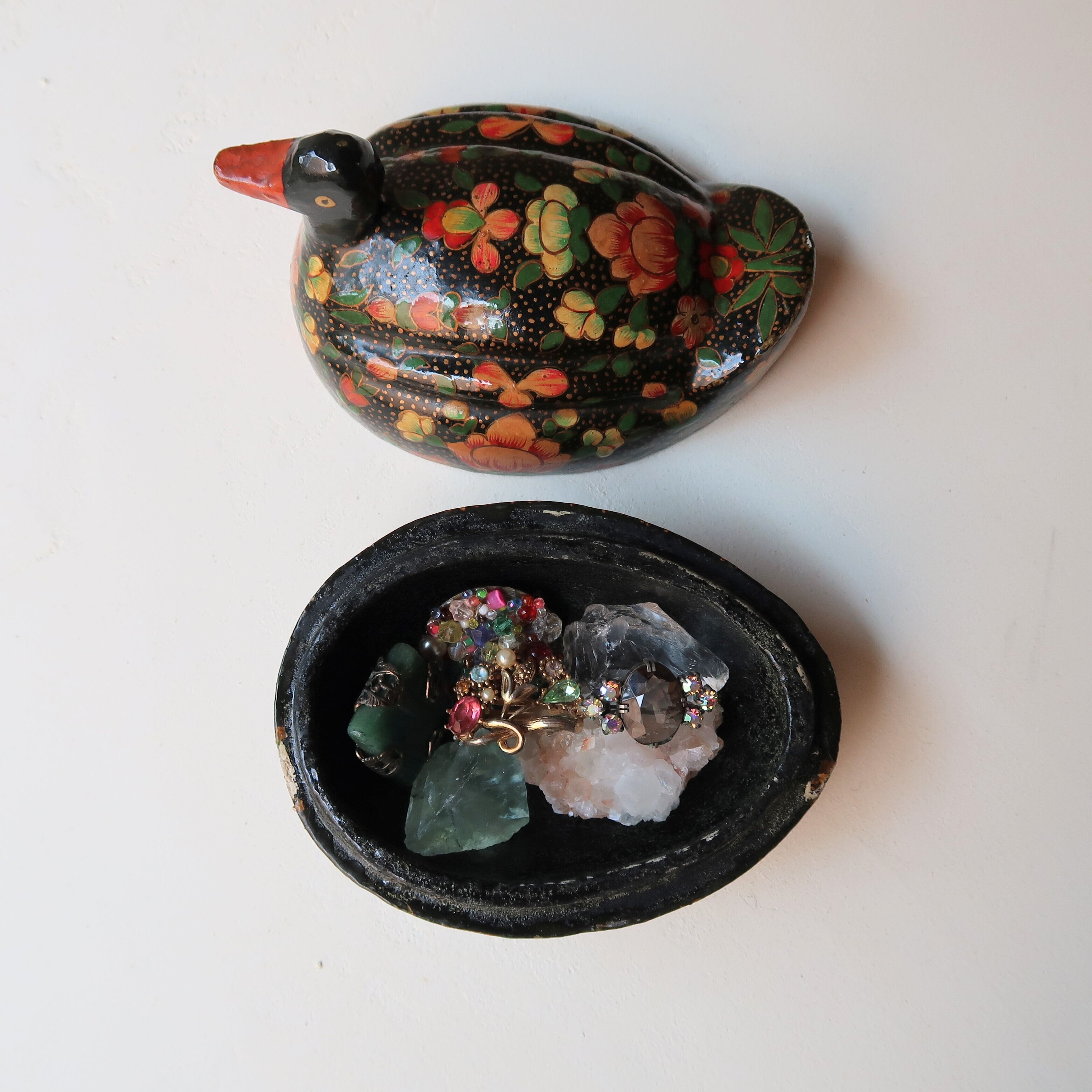 おなかのところで上下に開くようなっているとりのアクセサリーケース。開けると、たまご型におおきなくぼみがあるので、ざっくりといろいろ入れられそうです。