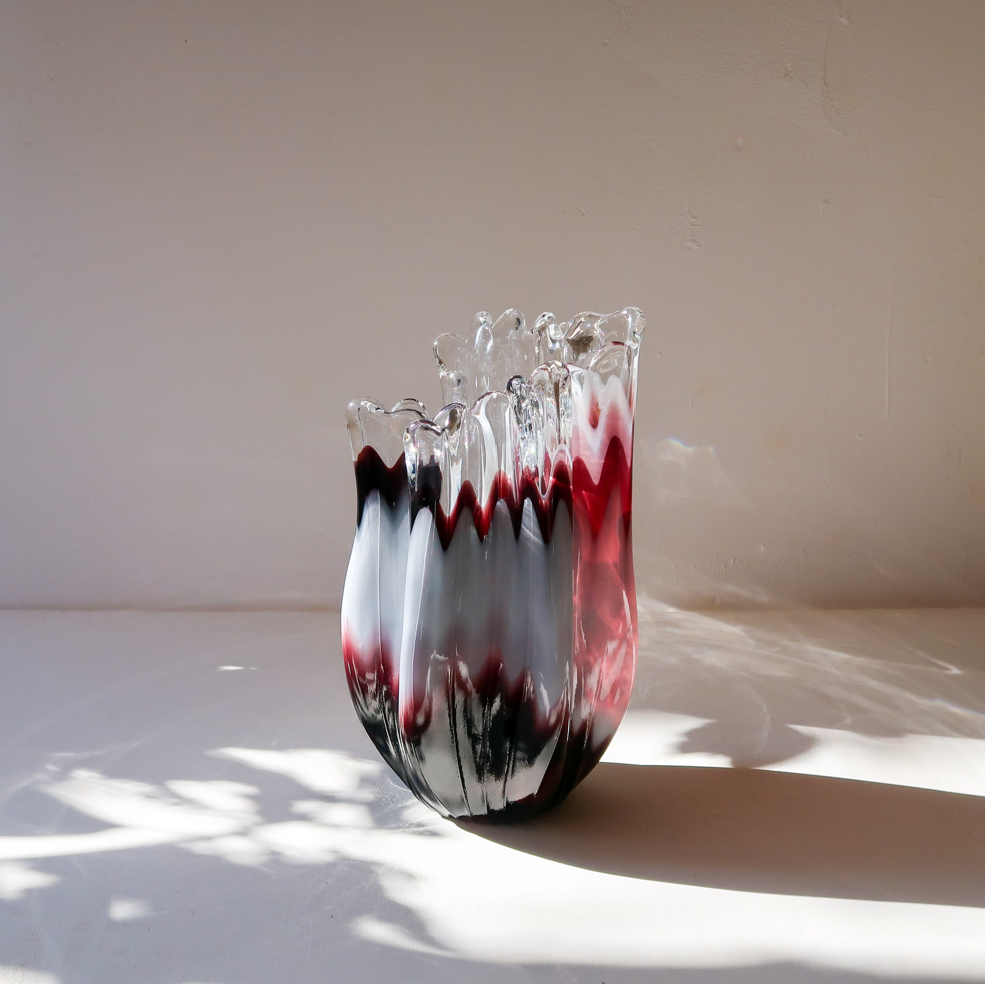 ギザギザもようの深い紫が、光に当たると明るい紫になって綺麗。深い紫によって、クリアなフリルより透明に見えてくる、モダンな花瓶です。