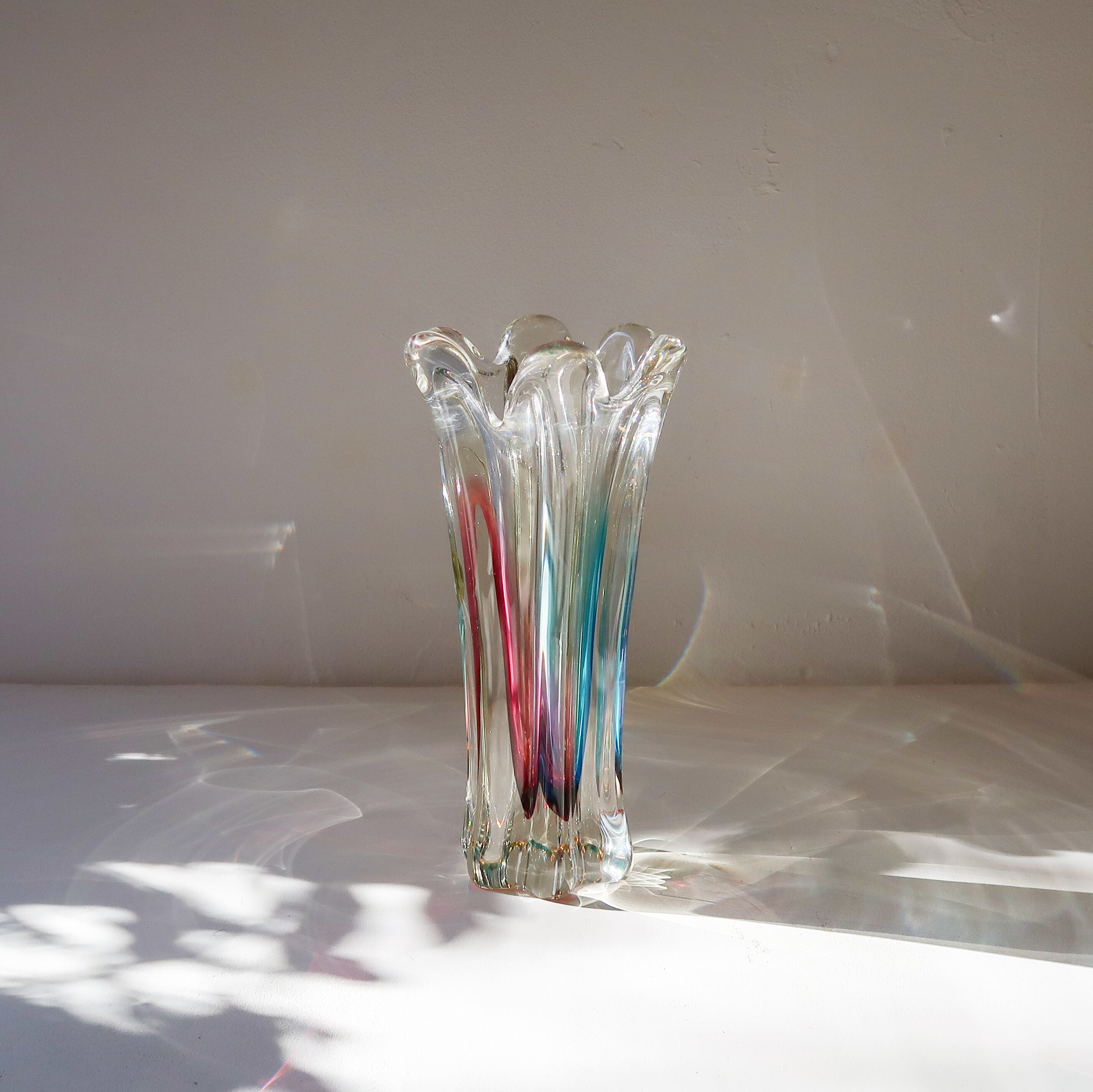 光に当たると、三色をとおしてうるうるっとかがやくおおきな花瓶です。