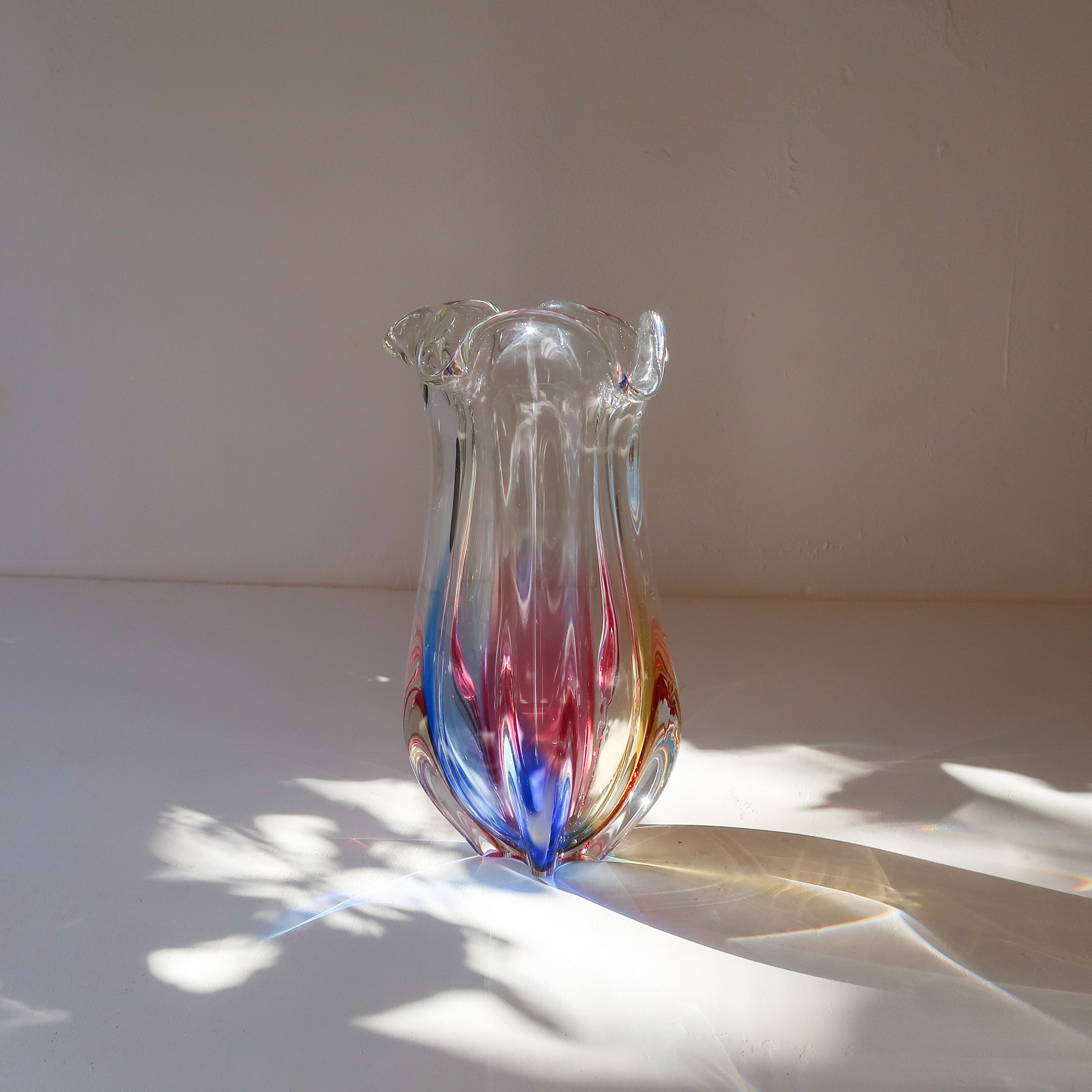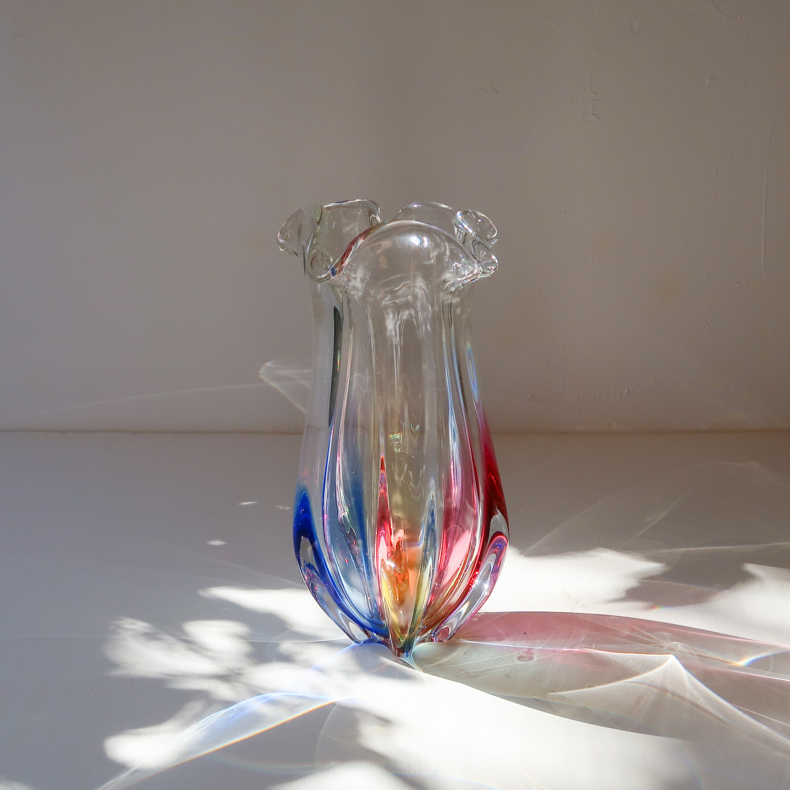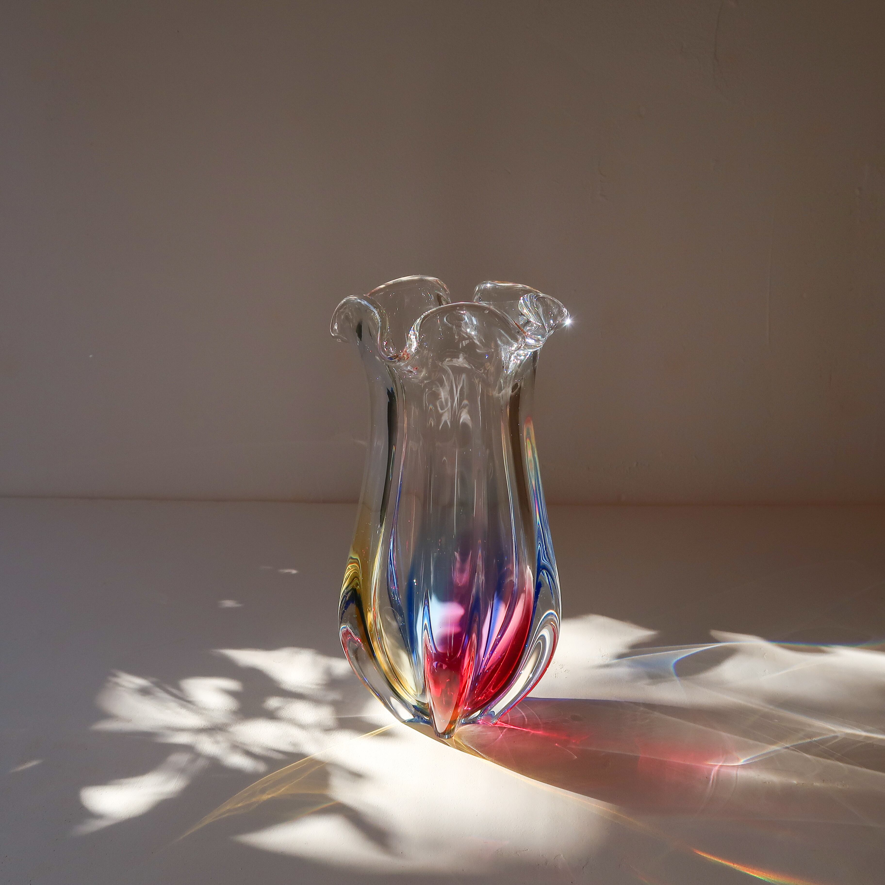 光に当たると、三色をとおしてうるうるっとかがやくおおきな花瓶です。