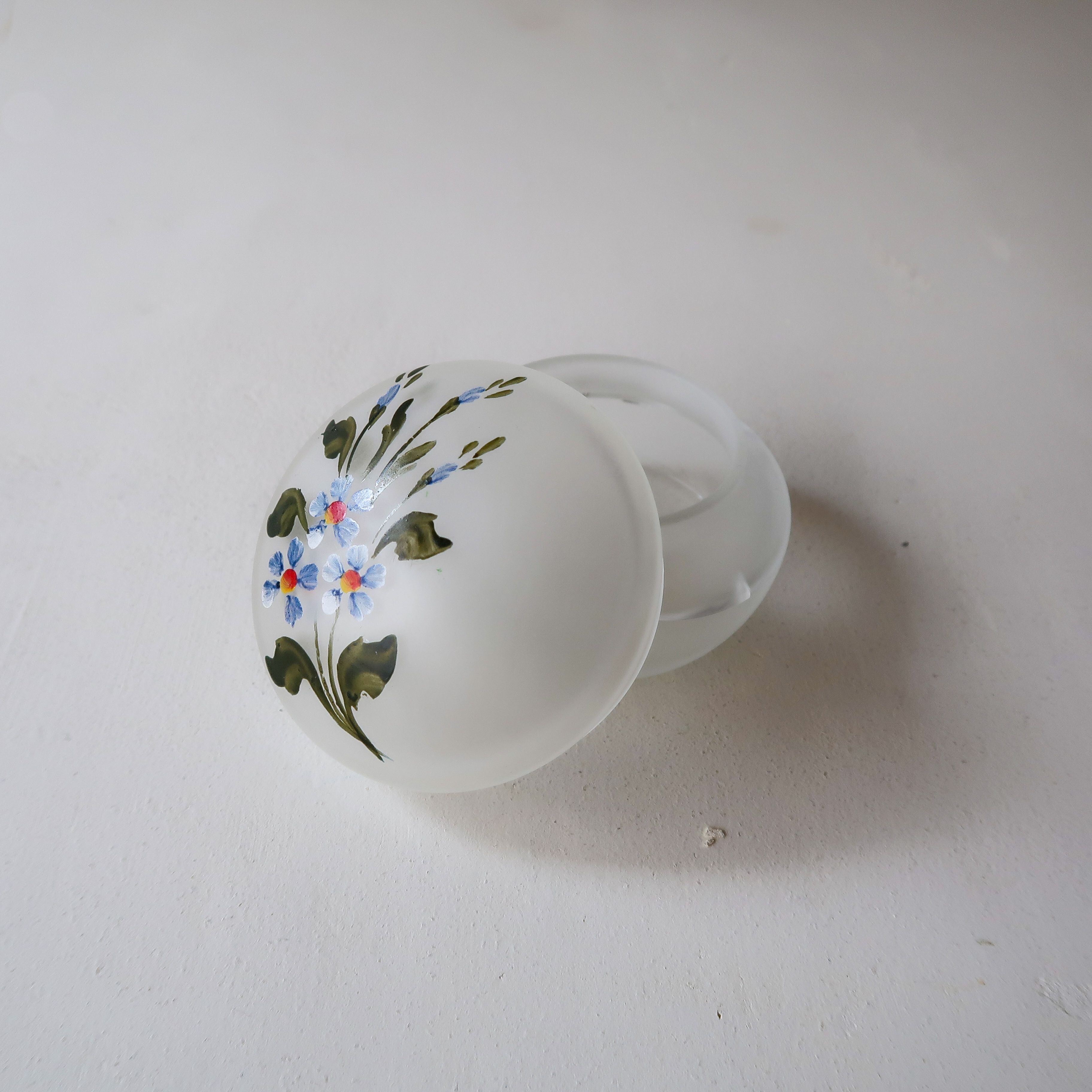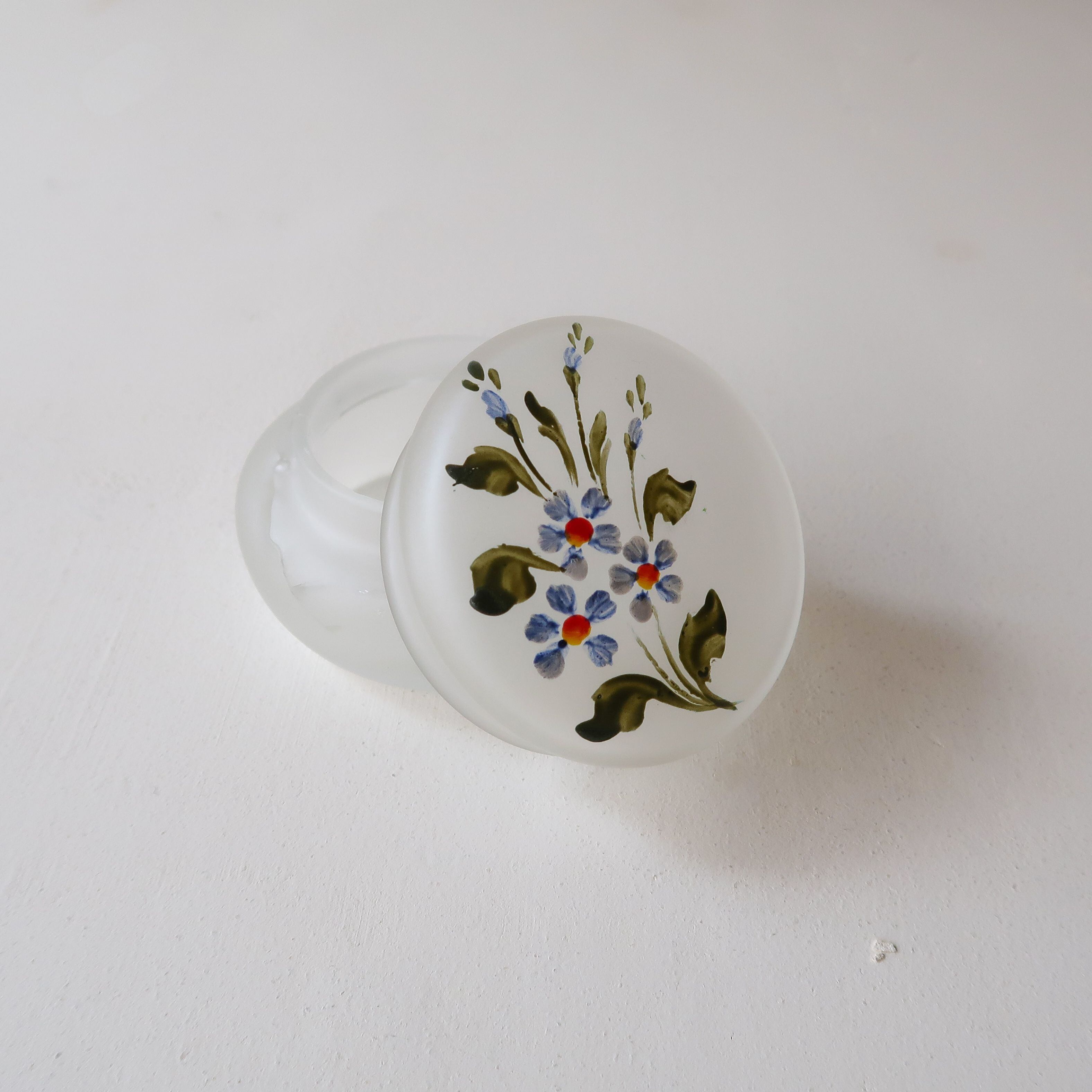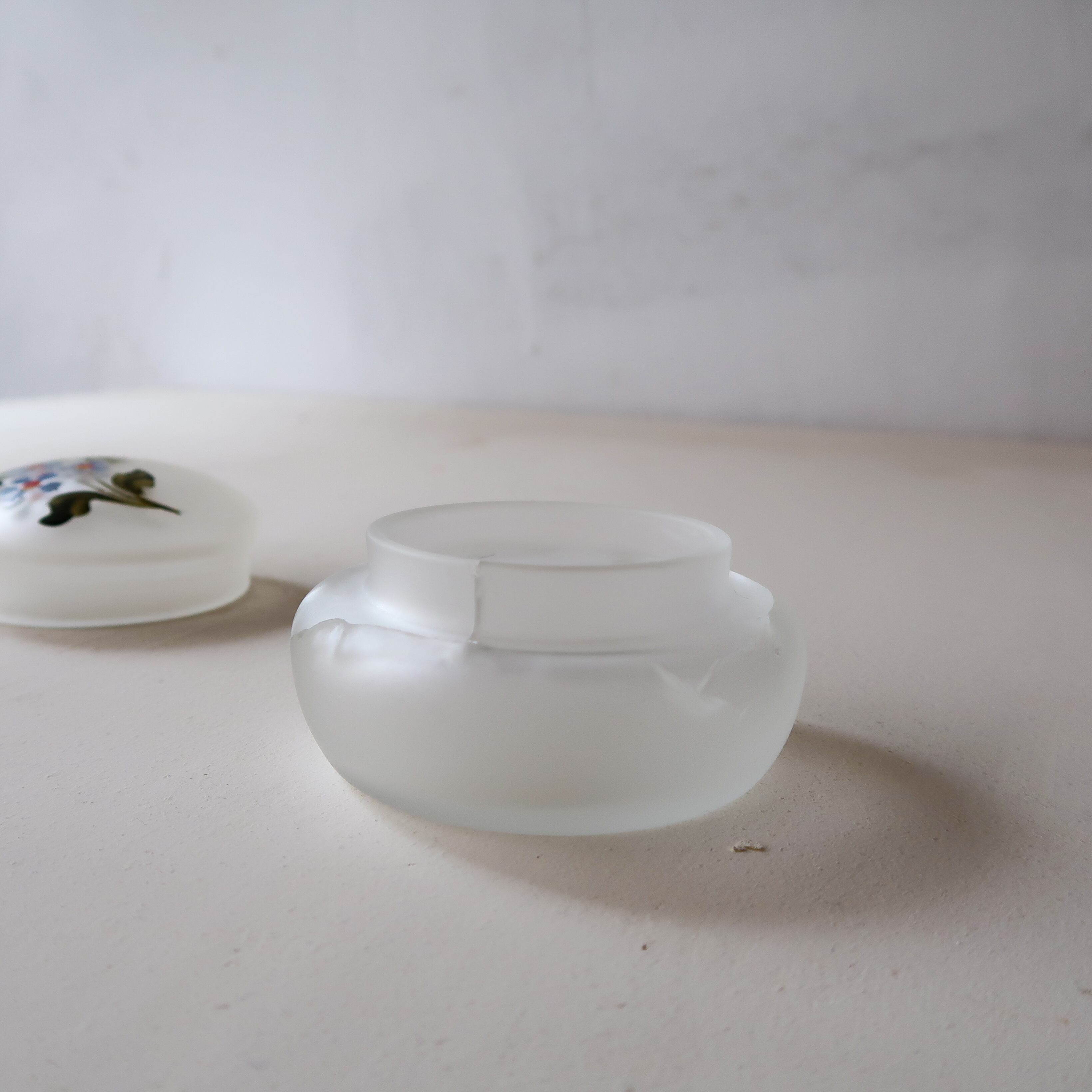 フラワーペイントがほどこされた、すりガラスのガラスケース。ペイントのフタはとっても可愛いのですが、ちょっと問題が。容器部分に、かなり大きめにヒビが入っているのです。継ぎ目にアレンジを施したりして使っていただける方、ぜひ。