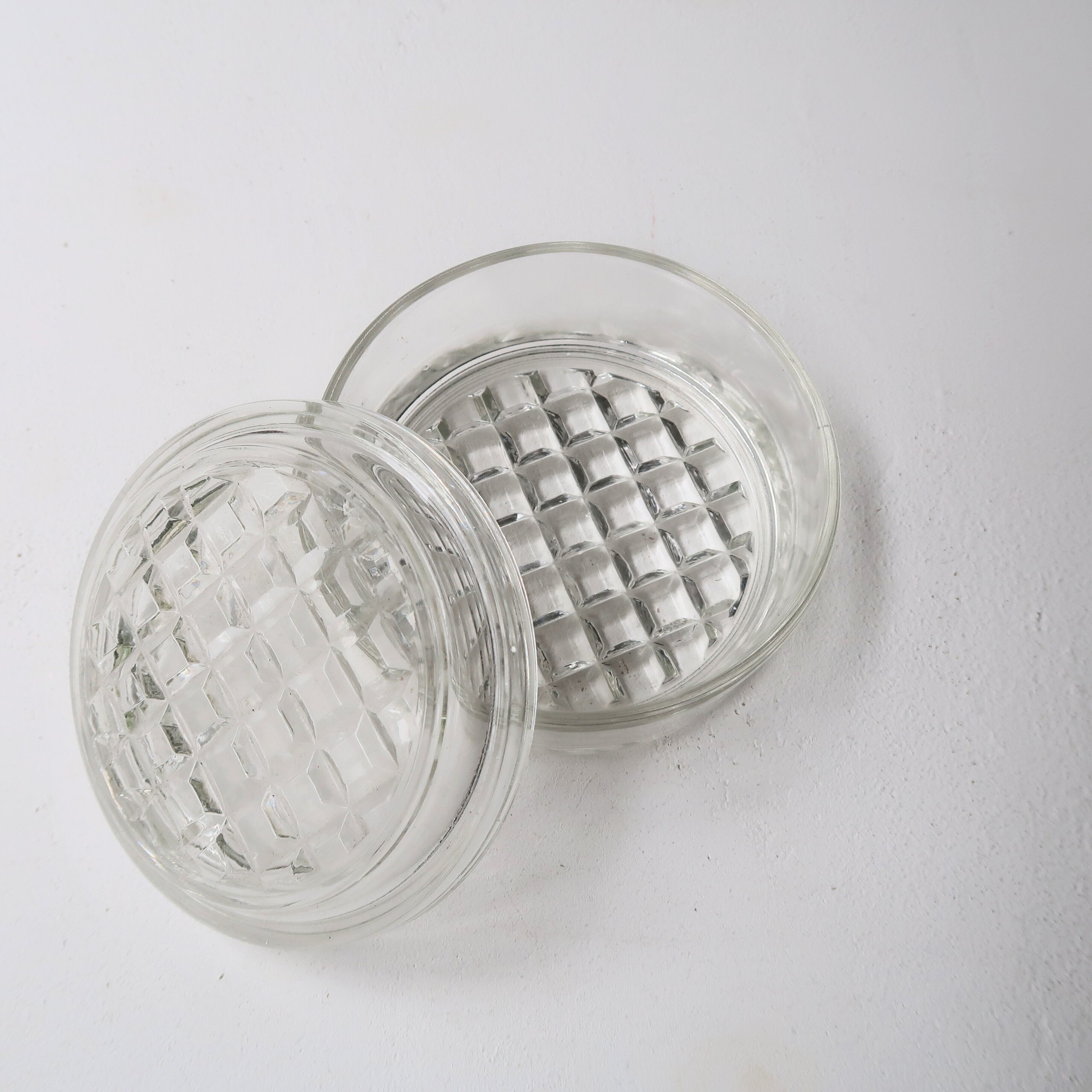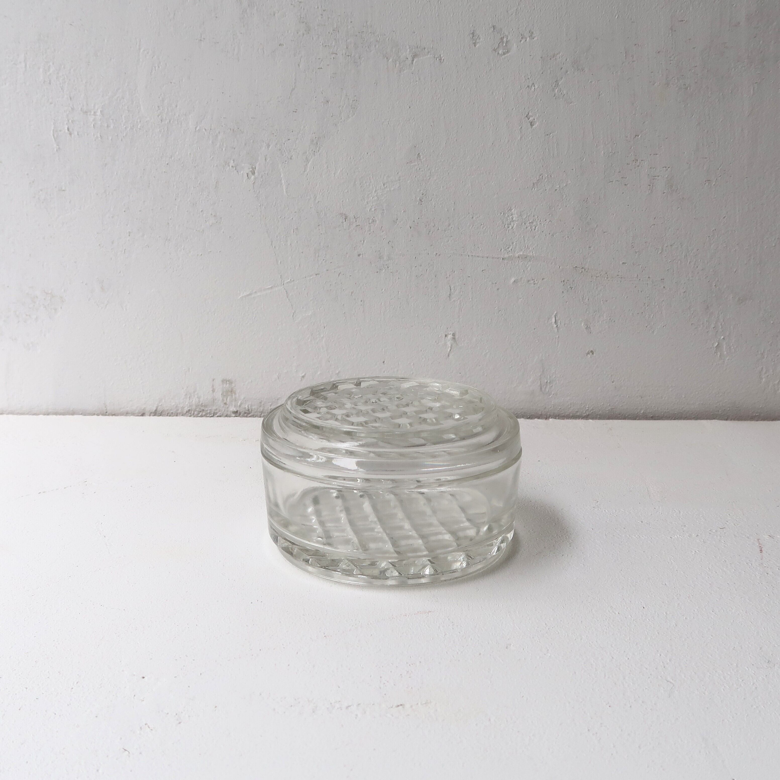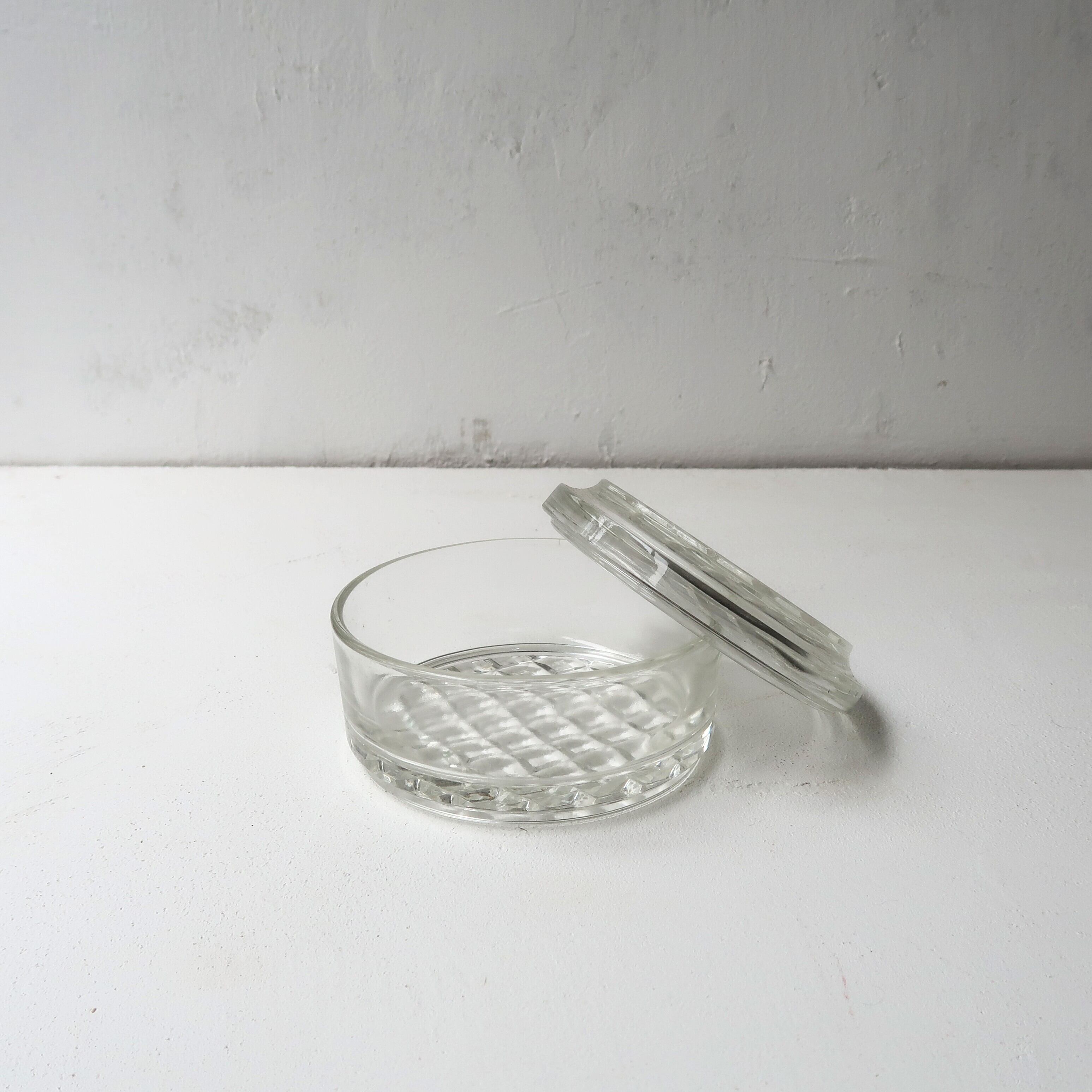 格子?あみあみ?チェック?向きによって見方が変わるガラスのケース。厚みがあるので、丈夫そうです。蓋がついているので、アクセサリーを入れて飾ったり?