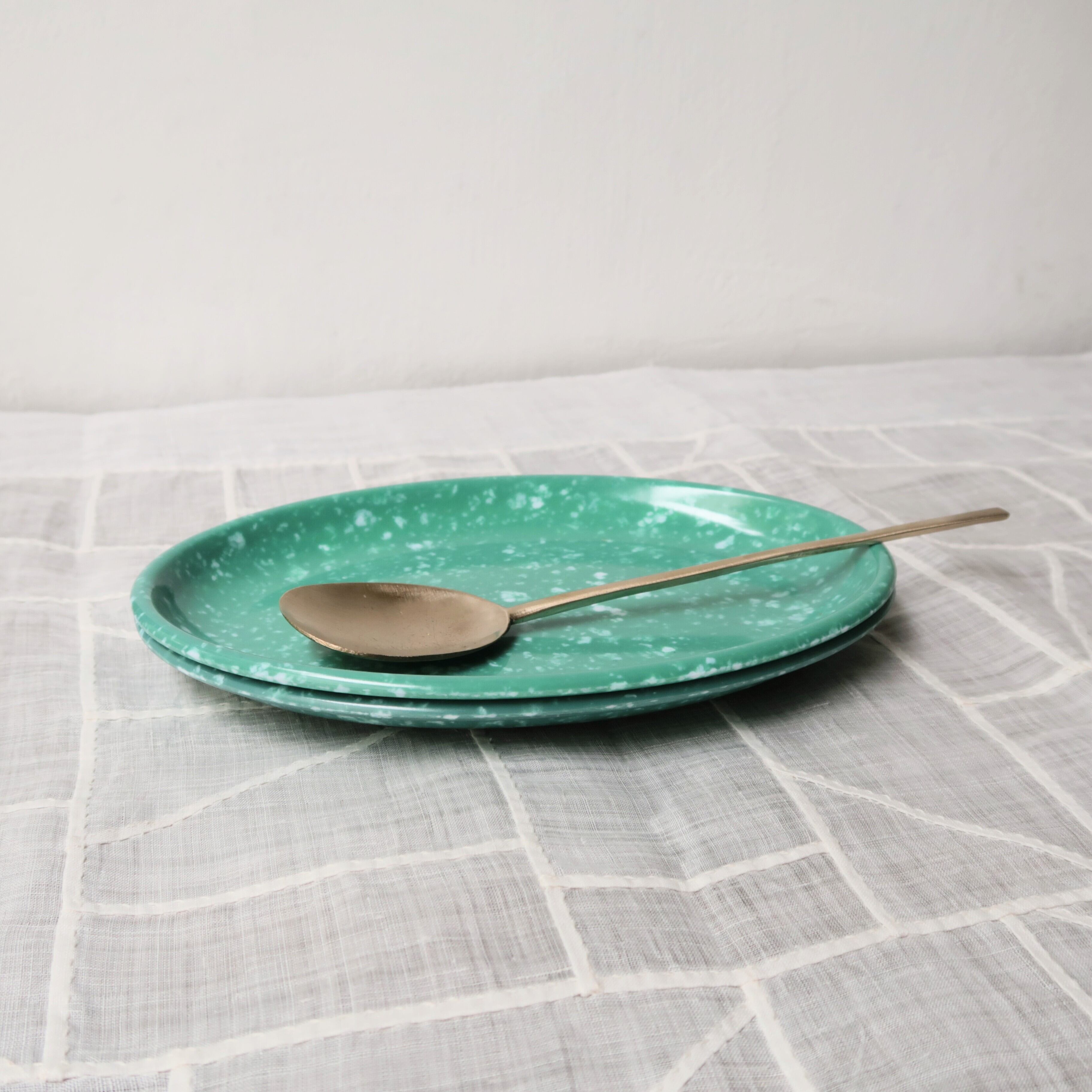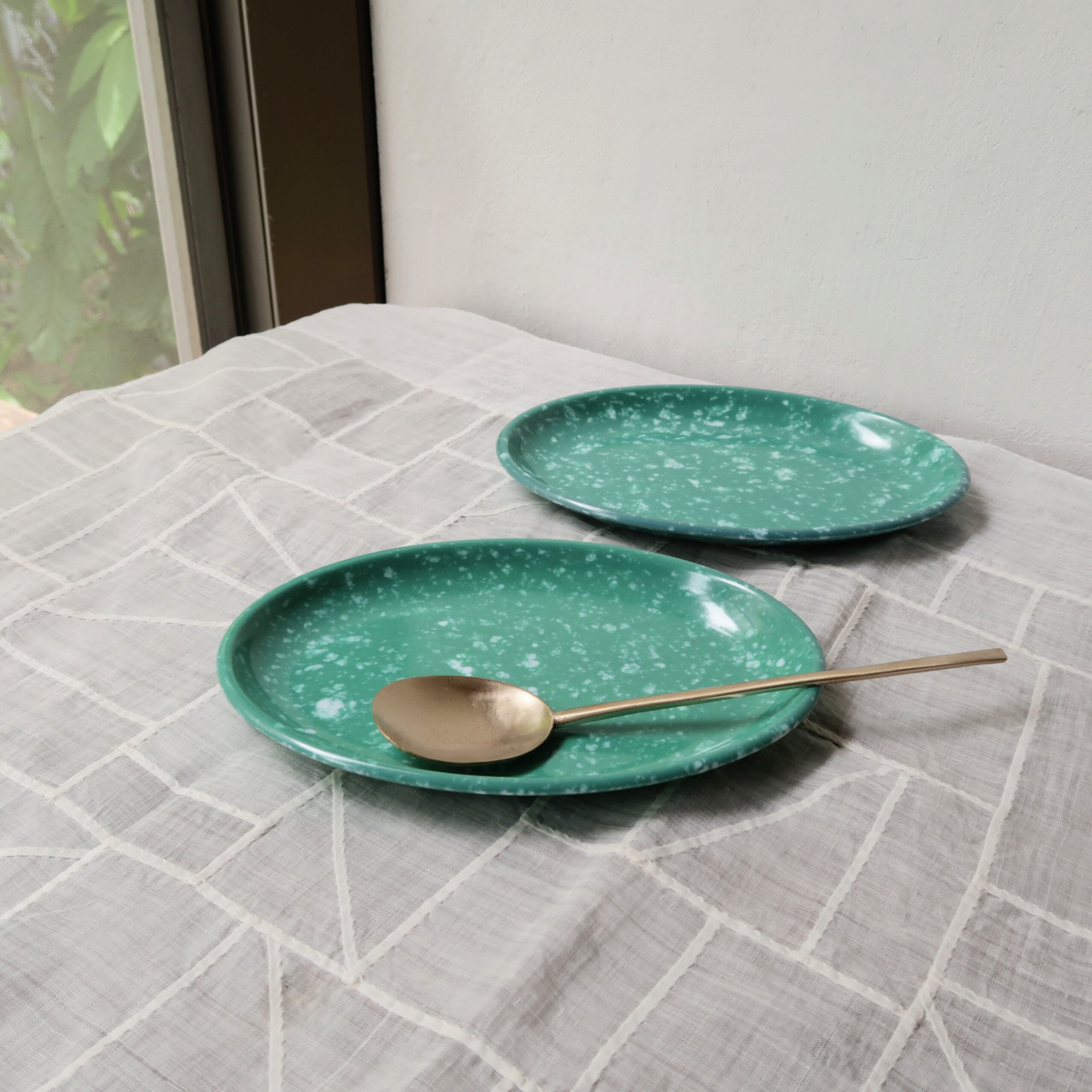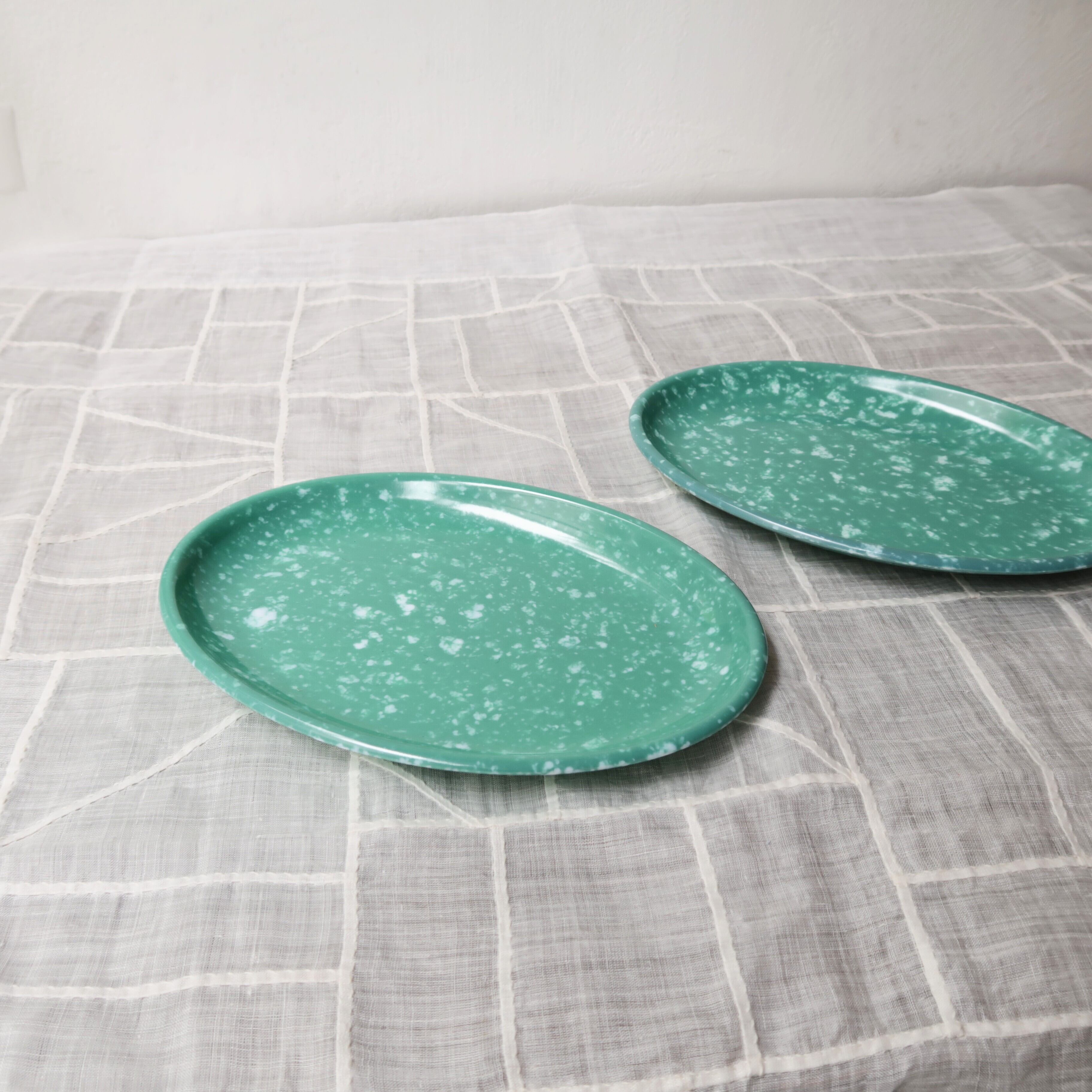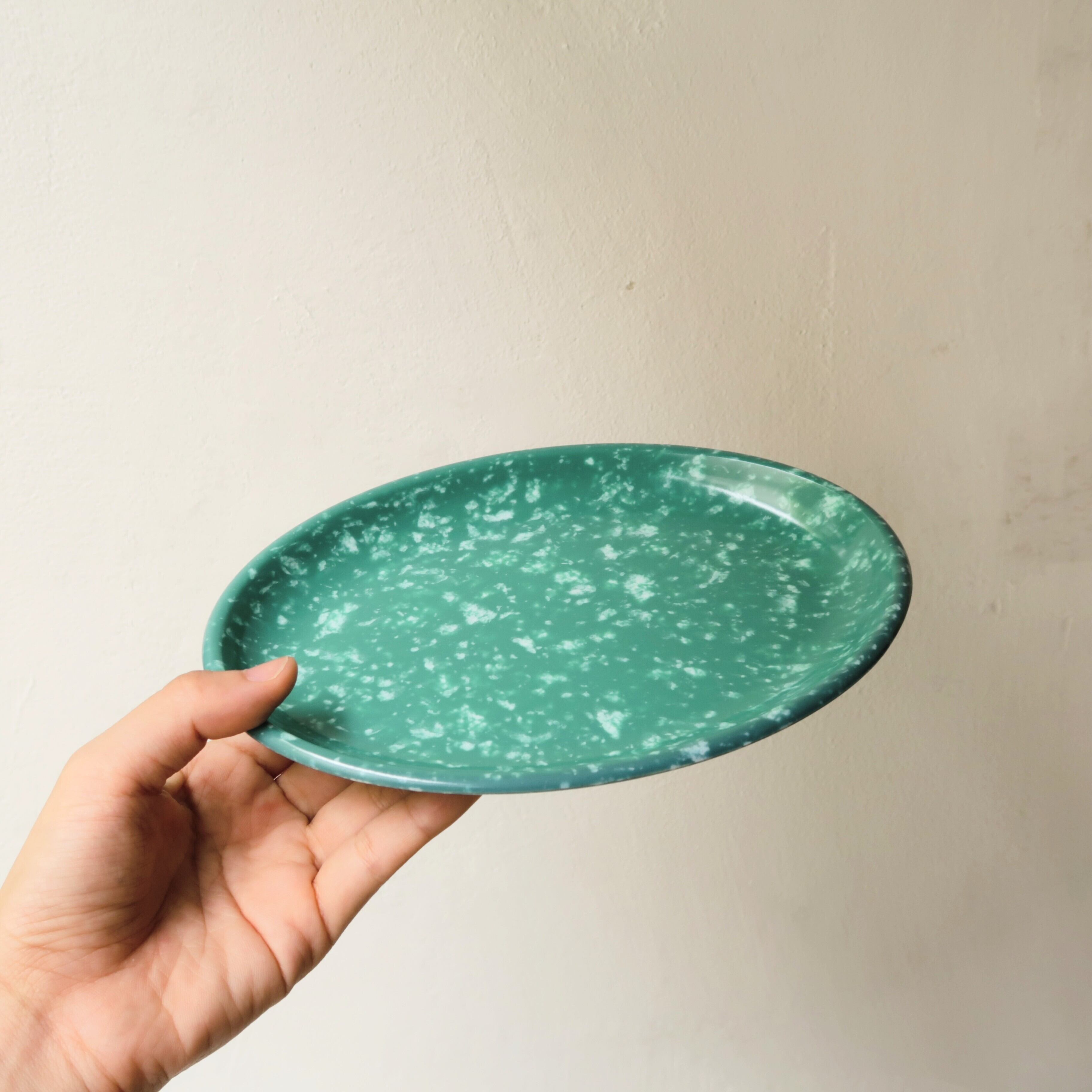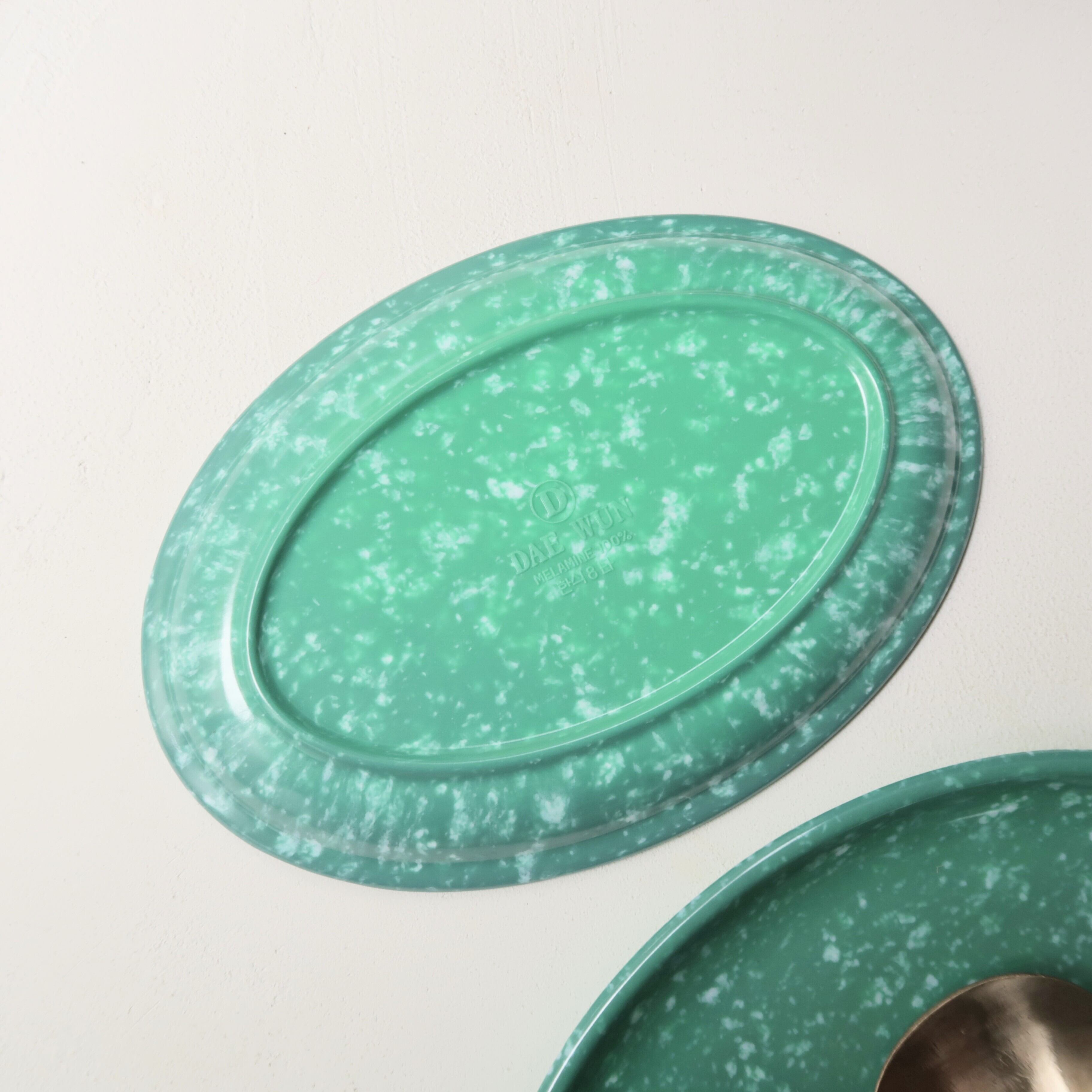韓国の市場でチャプチェがのっていたグリーンのプレート。一目惚れして、別の形ですがセレクトしました。メラミン製で、市場でもガツガツ使われていたので、割れにくく使い勝手はバツグン。