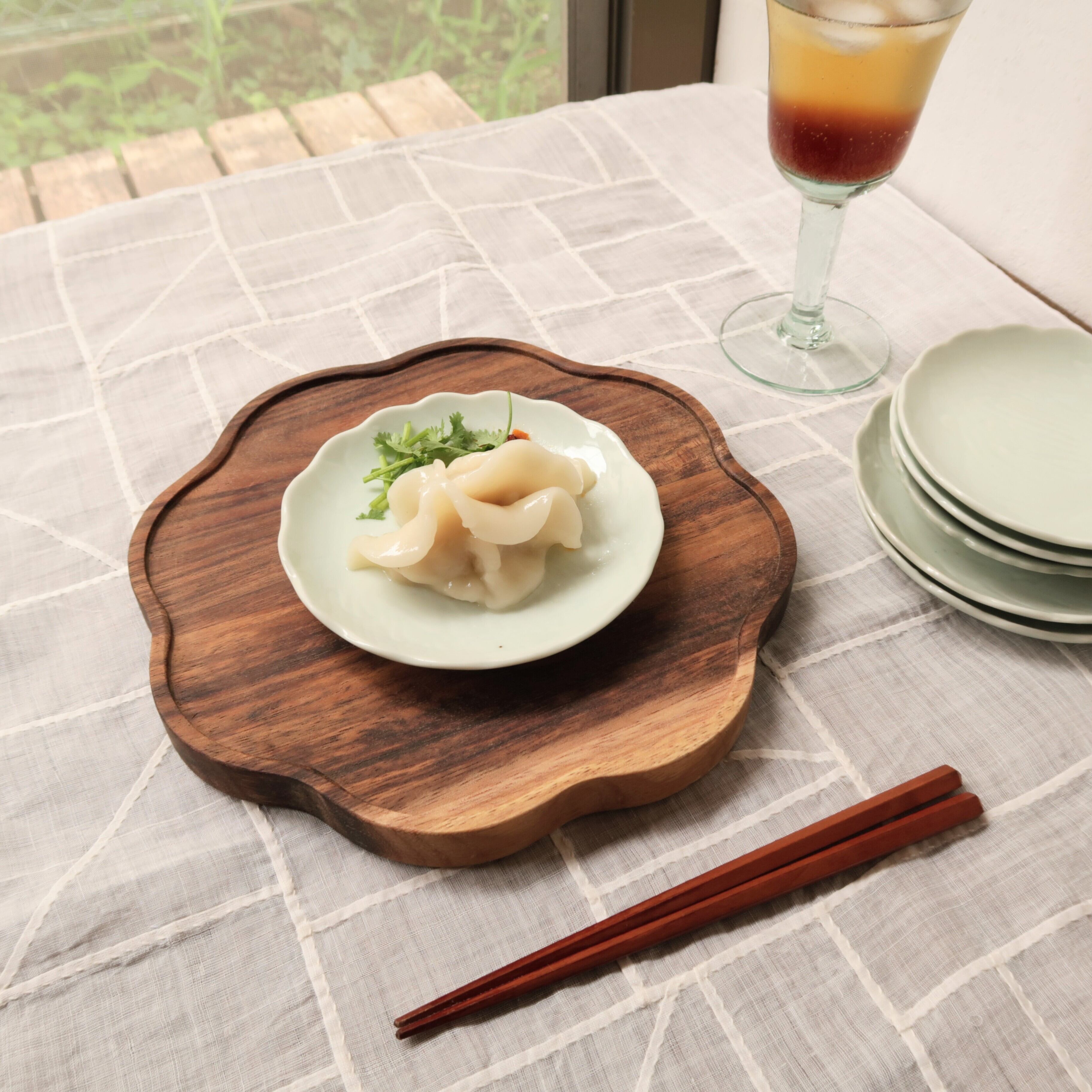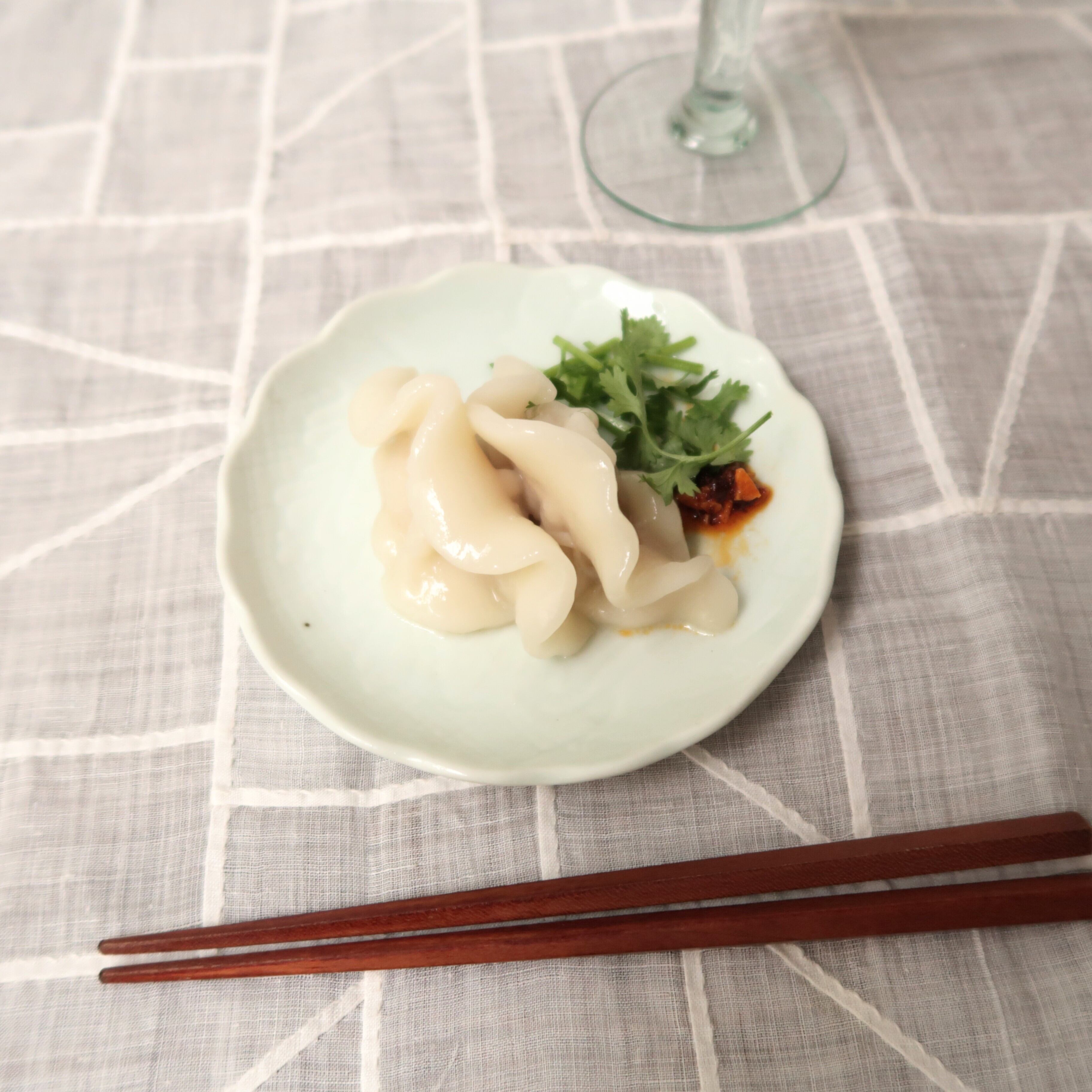 青みがかったお皿。さっそく水餃子を食べる器に。パクチーと食べるラー油がよく似合う。