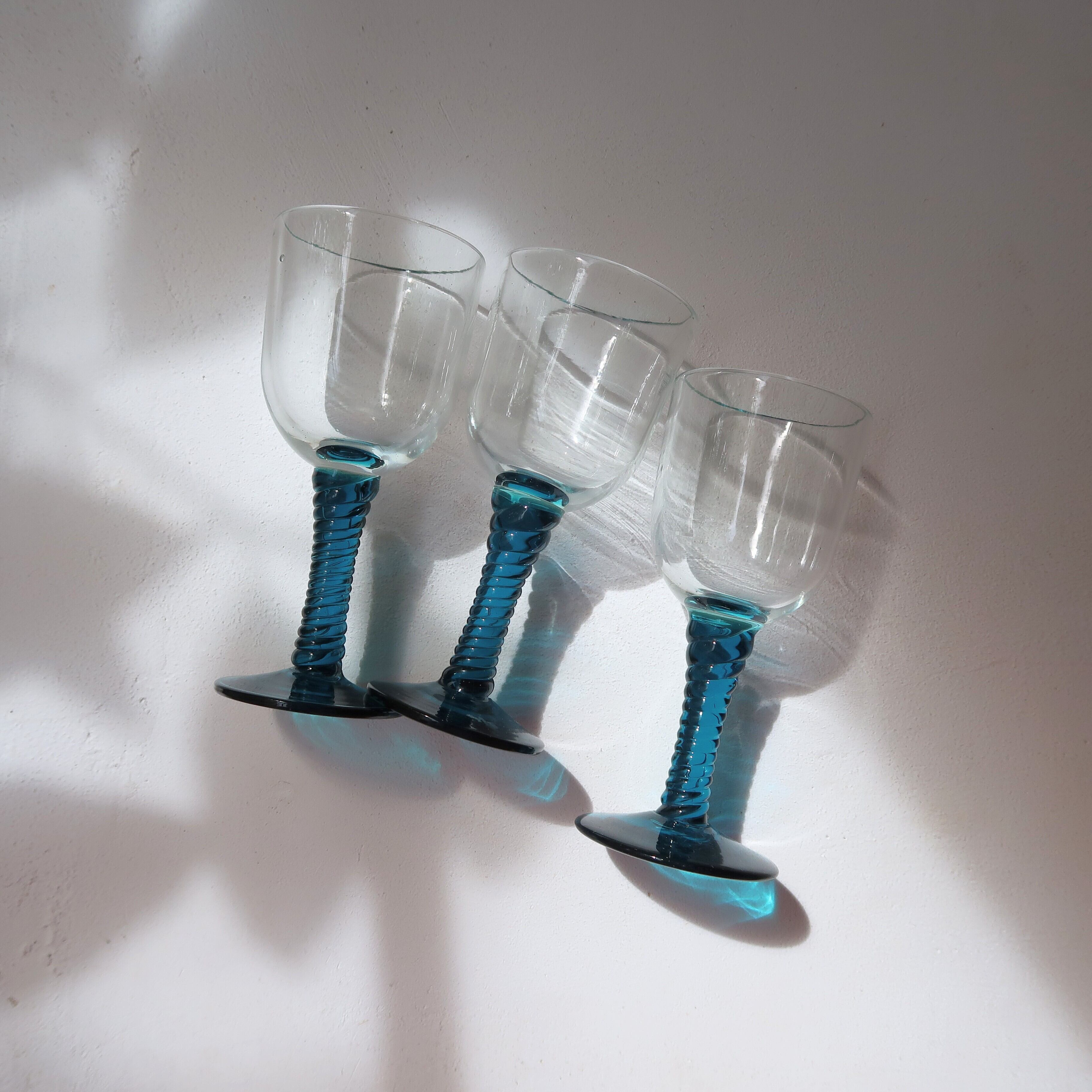 きれいな瑠璃色の脚がキュートなミニグラス。ところどころ気泡が入っていたり、とうめい部分のガラスにゆらぎがあったりと、愛らしいグラスです。