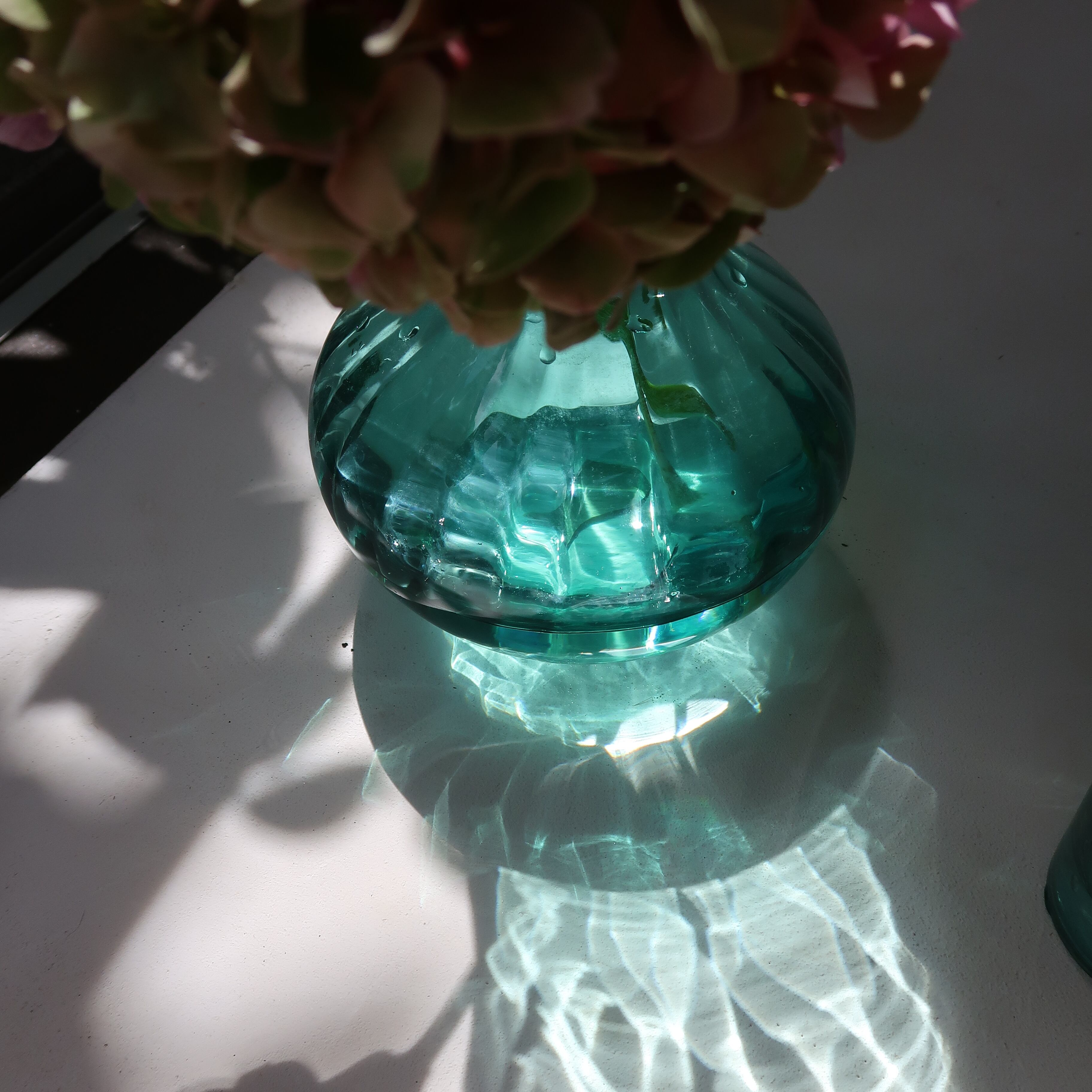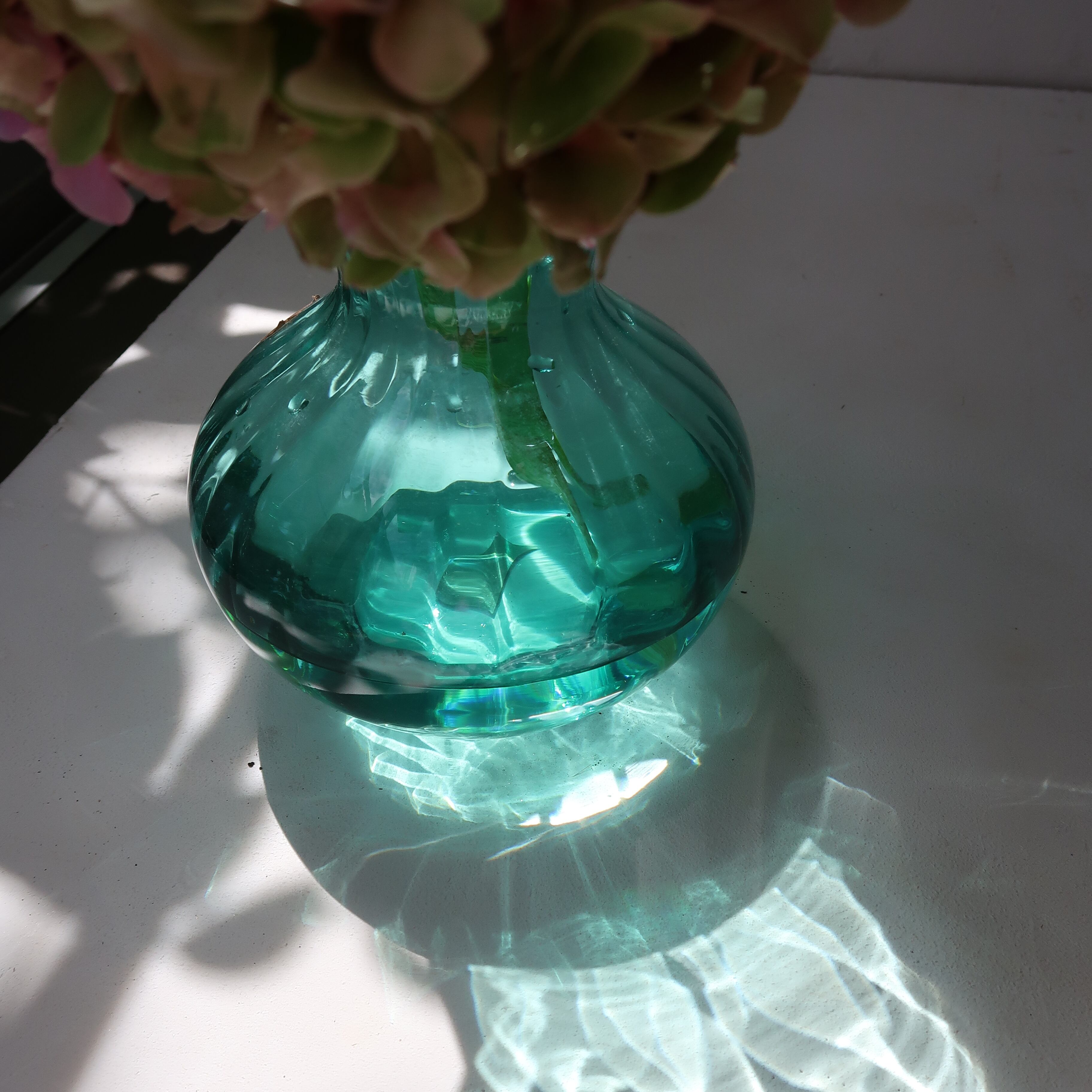 ひらひらがかわいい花瓶。わさっと生けられる大ぶりなのがうれしい大きさです。少し薄手なので、水を入れたときに光に当たってきらきらする様子も、透きとおってきれい。