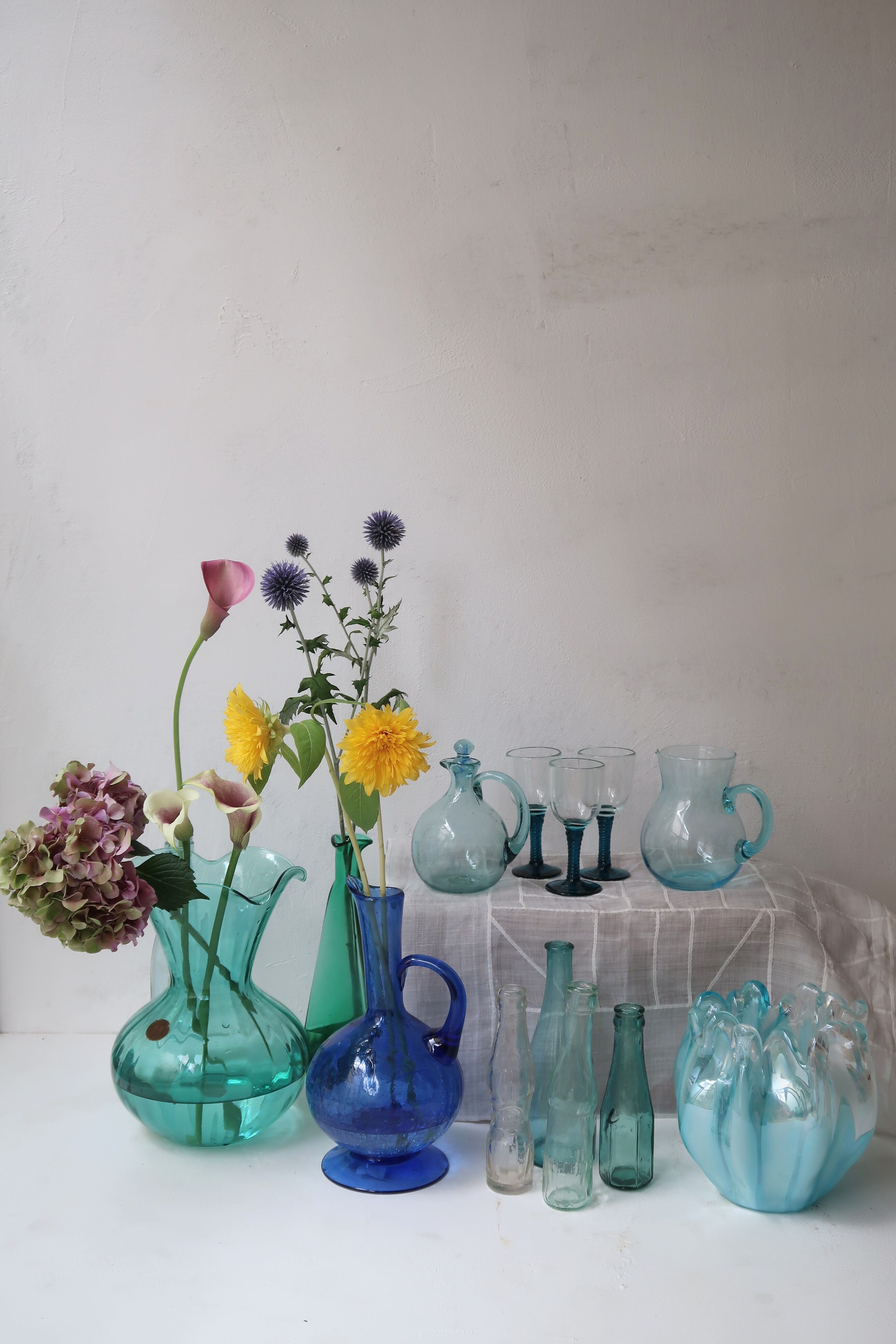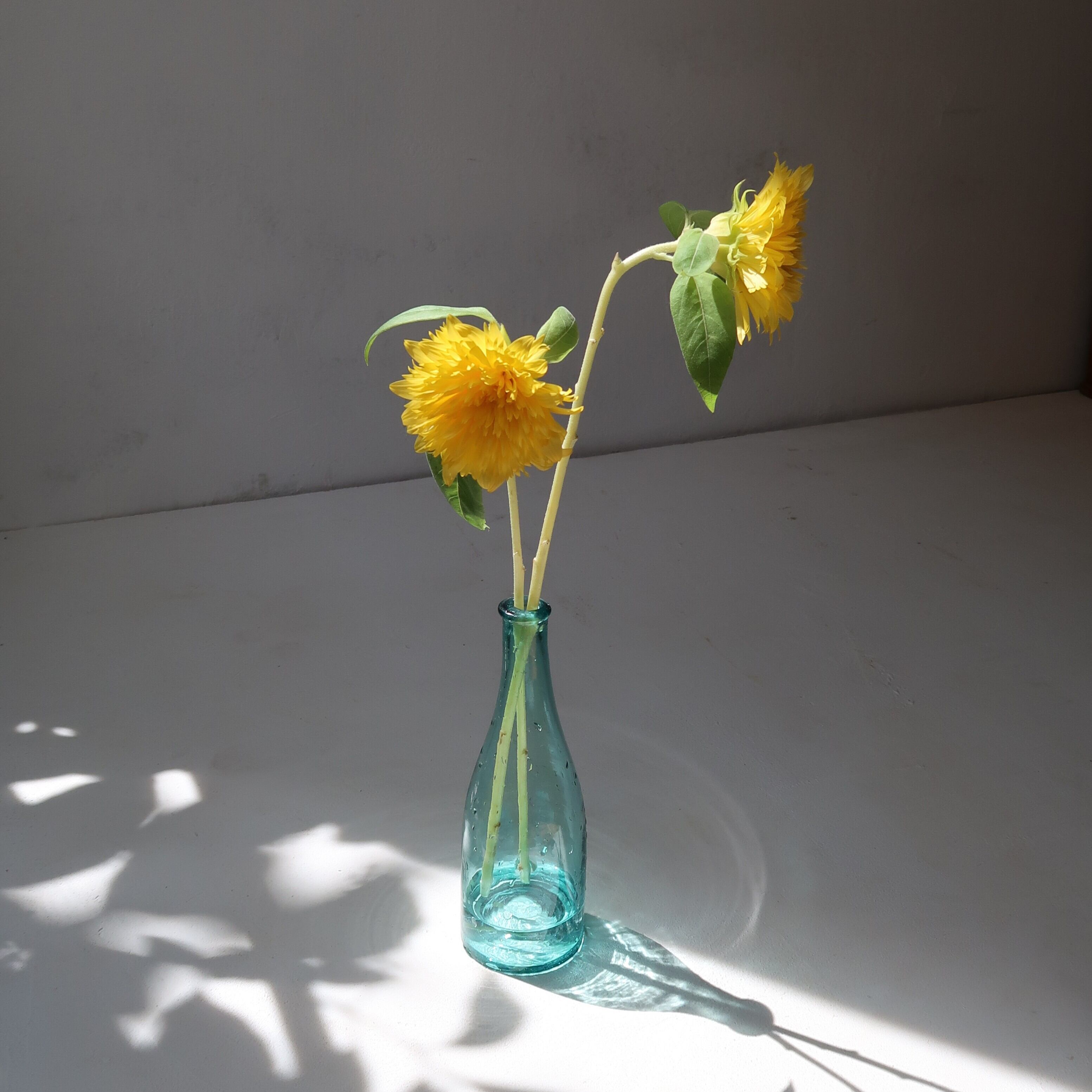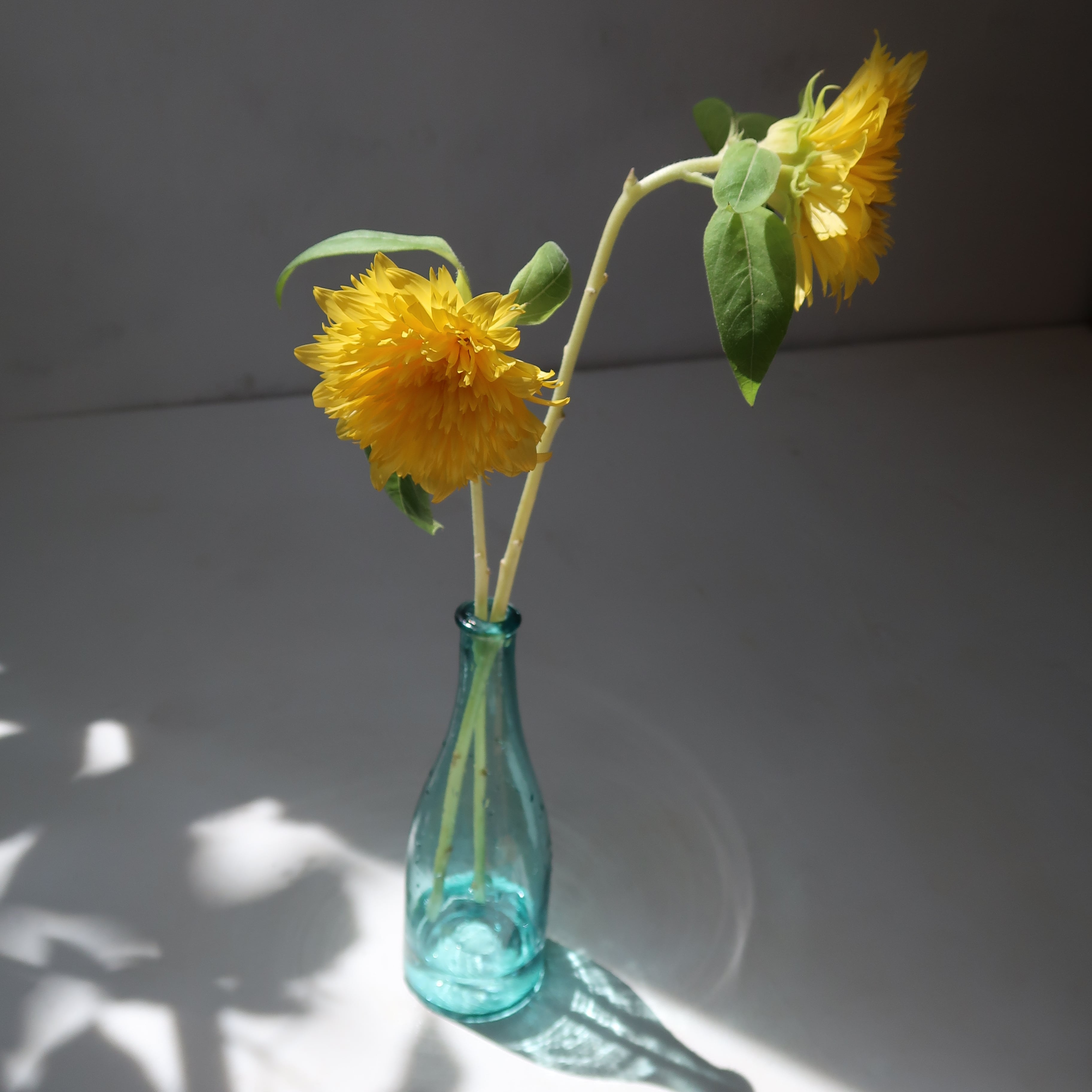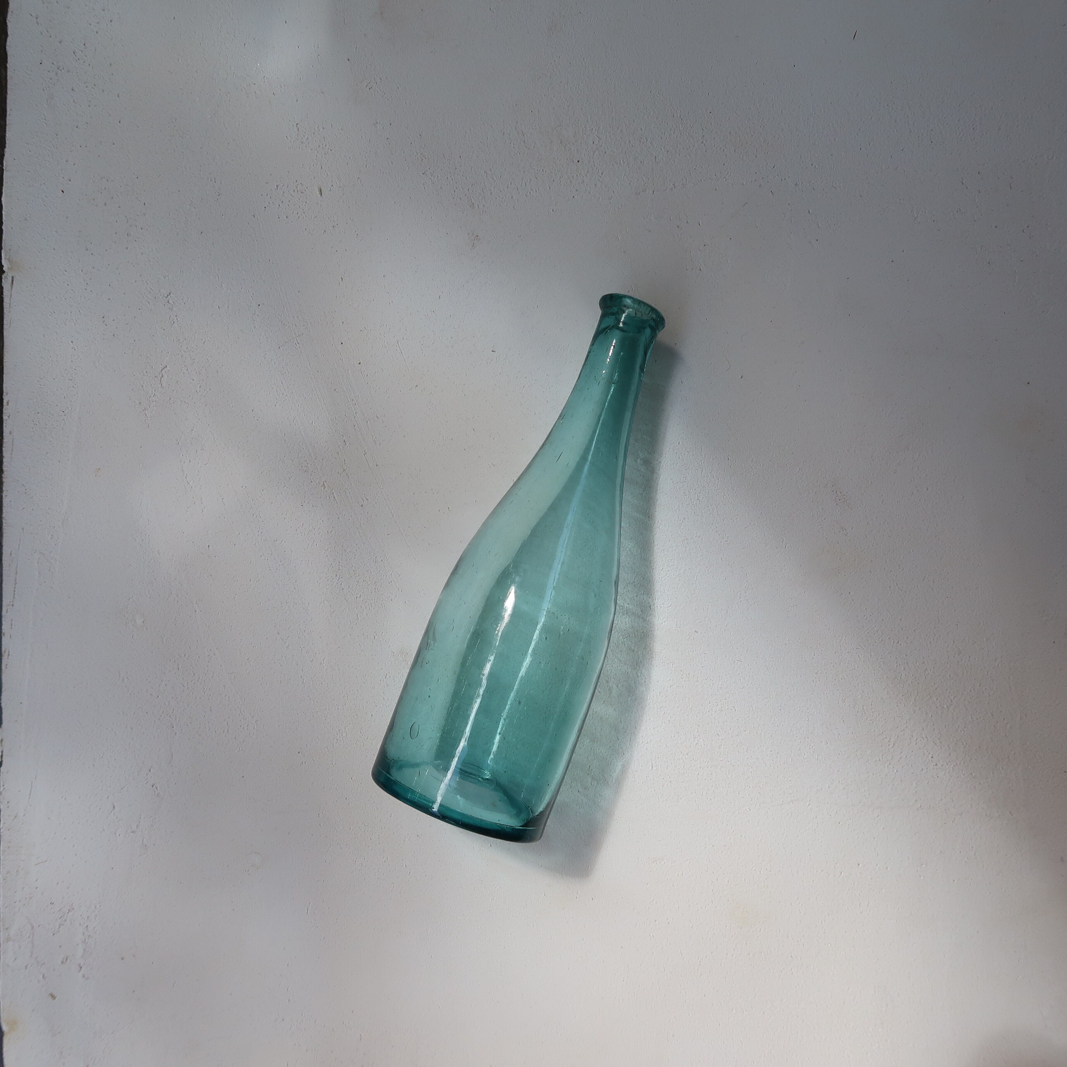 理想的な空き瓶の形をした空き瓶。もとは何が入っていたのでしょう。ゆるやかな気泡が愛らしく、青と緑のあいだのような色合いのガラスもかわいい。夏はひまわりが似合いそうです。