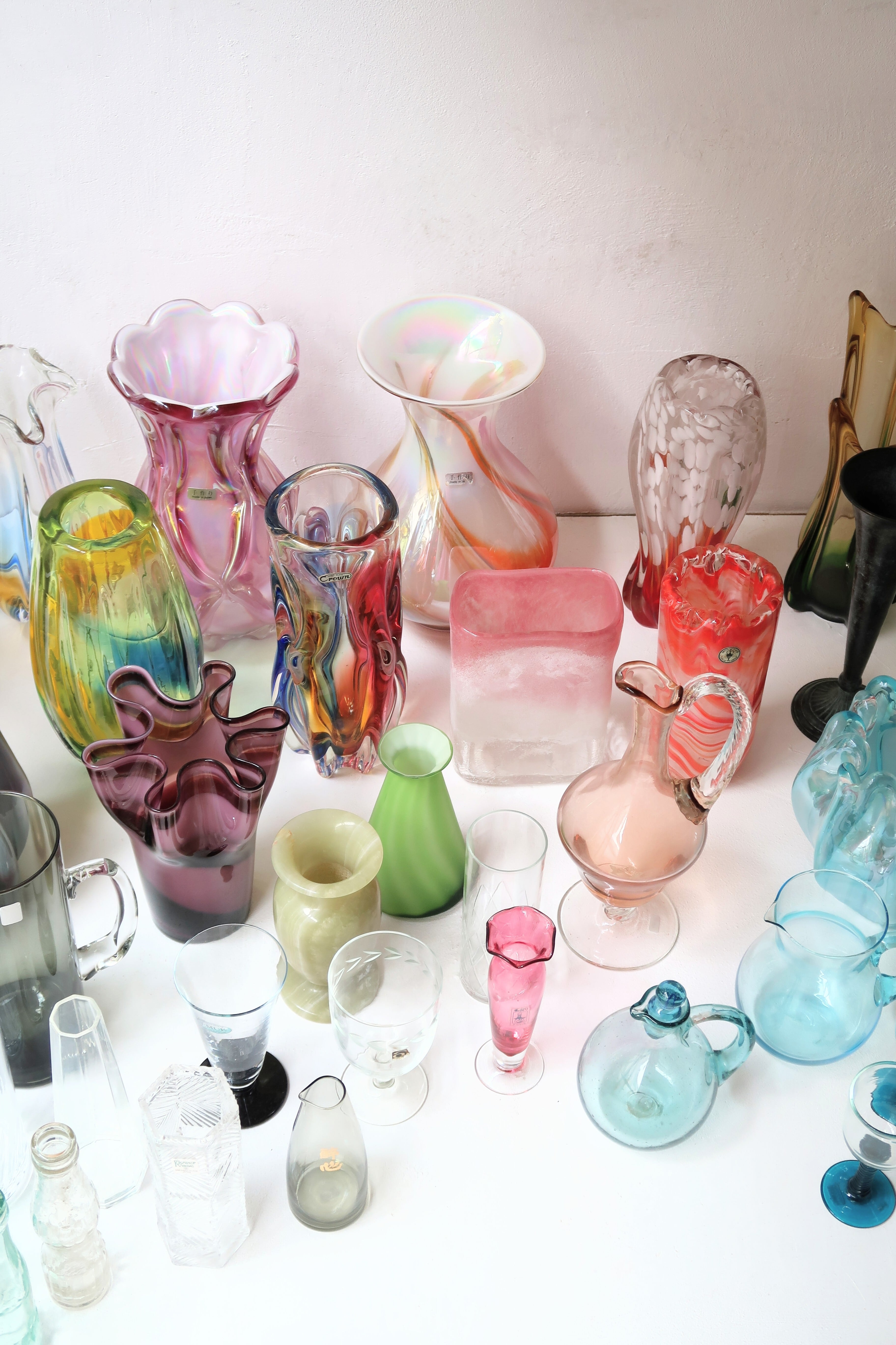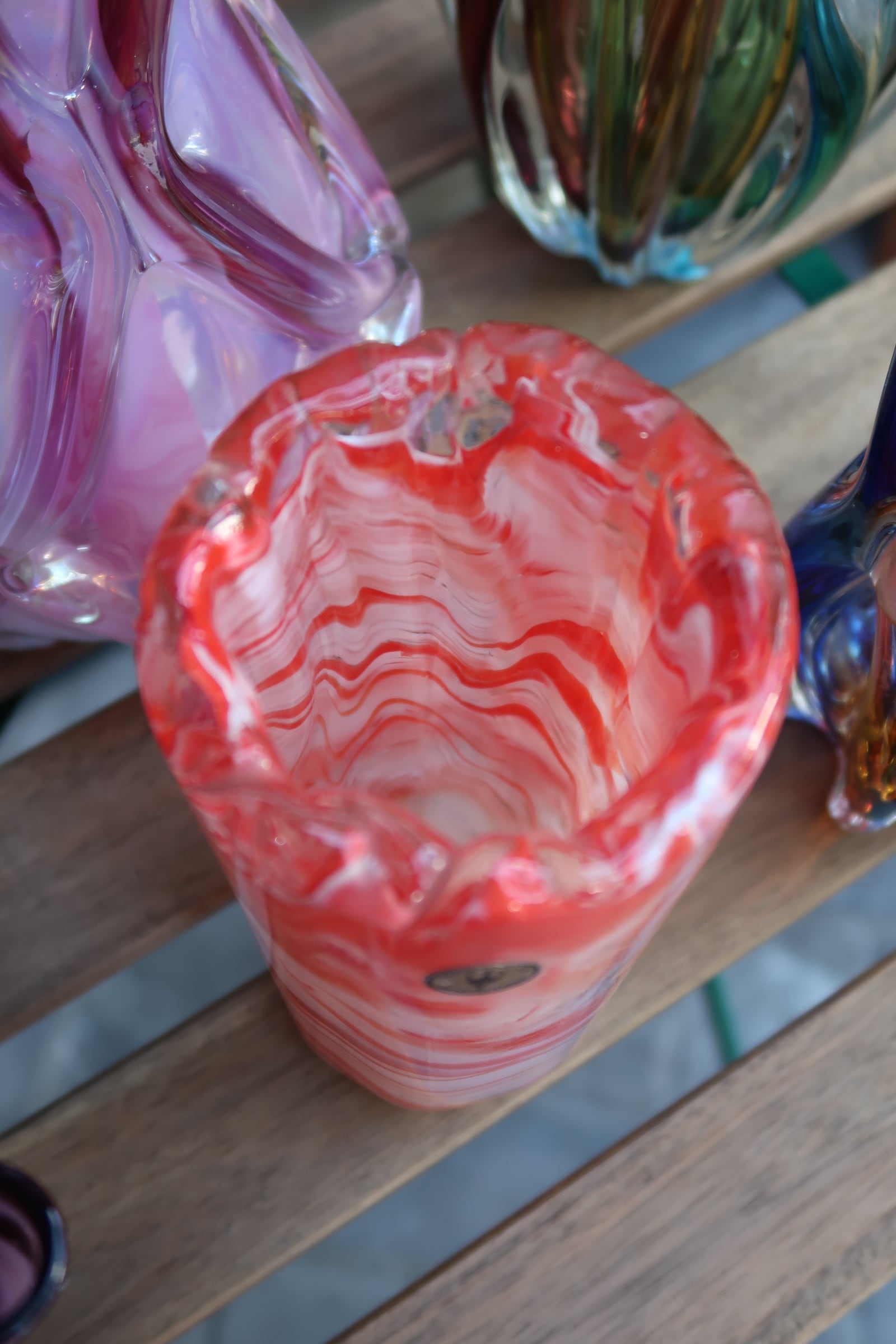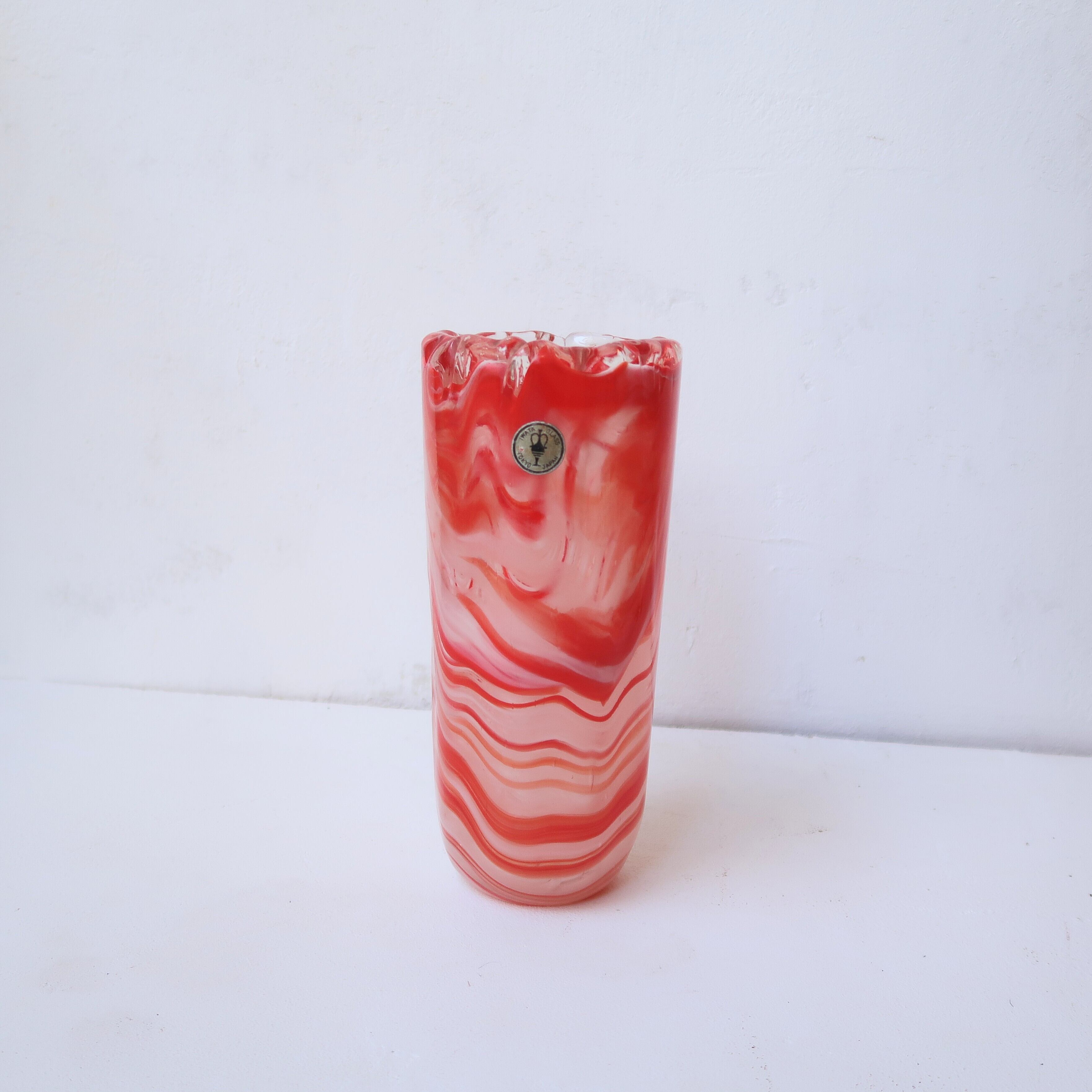 赤と白のマーブル具合がかわいいガラスの花瓶。空間がぱっと明るくなる鮮やかな色合い。比較的小ぶりで、一輪挿しとして使えます。