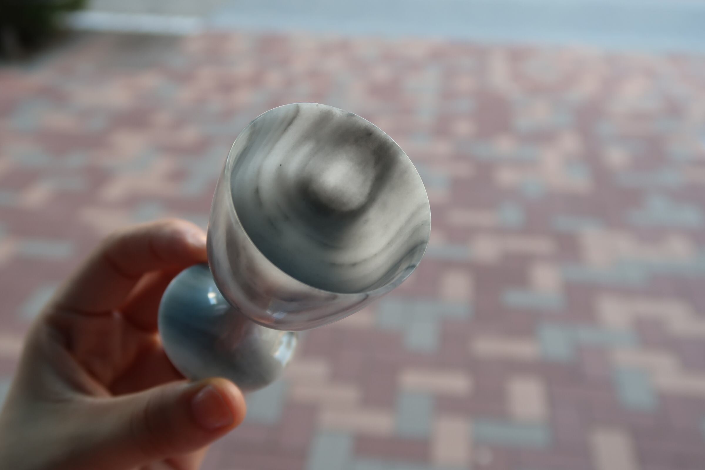 石でくりぬかれてできている盃。光をとおすくらい薄いのです。石の層の模様もかわいい…!ふちがうすくカケてでこぼこしているところもありますが、おおむねかわいいです。ピアスやリングを入れておいても◎