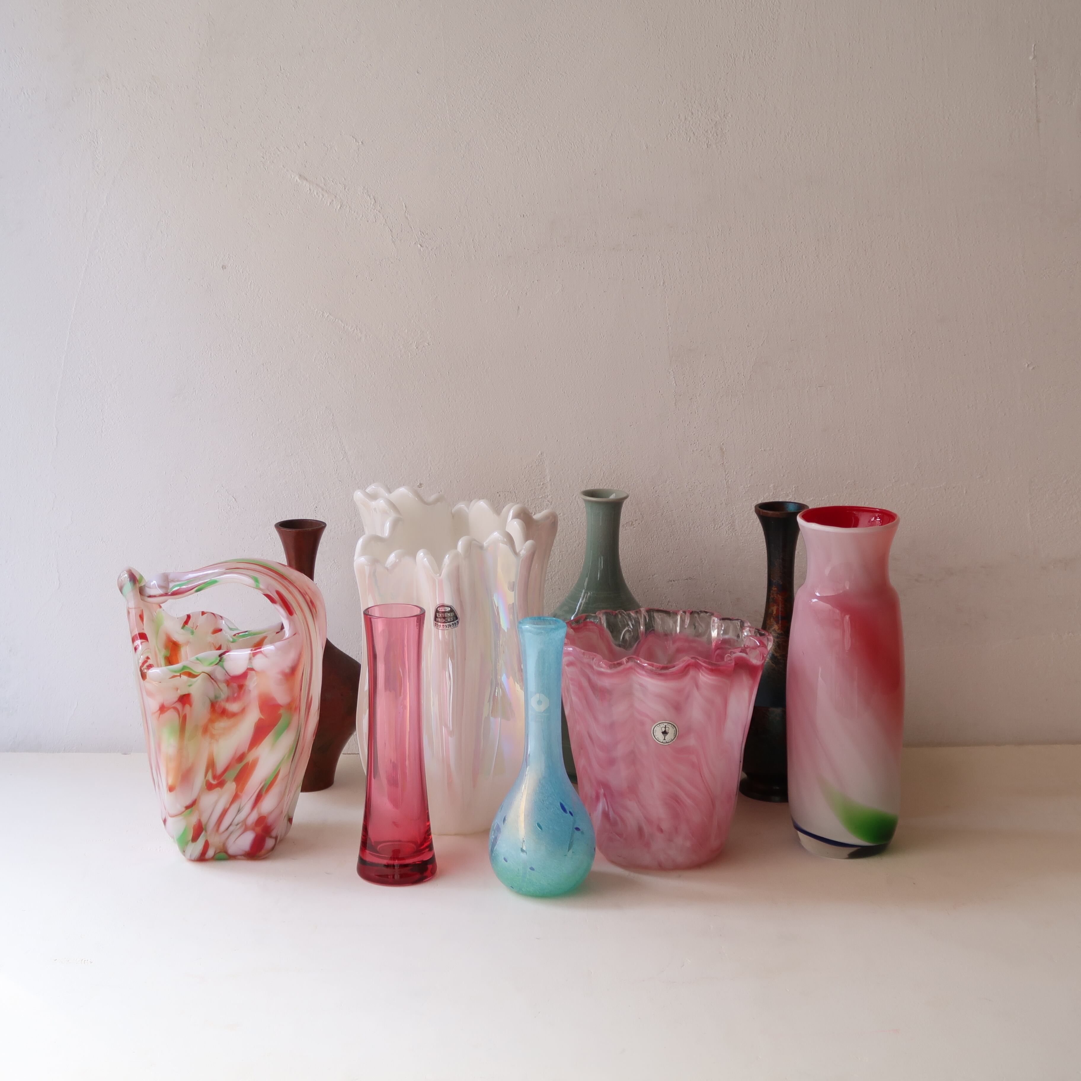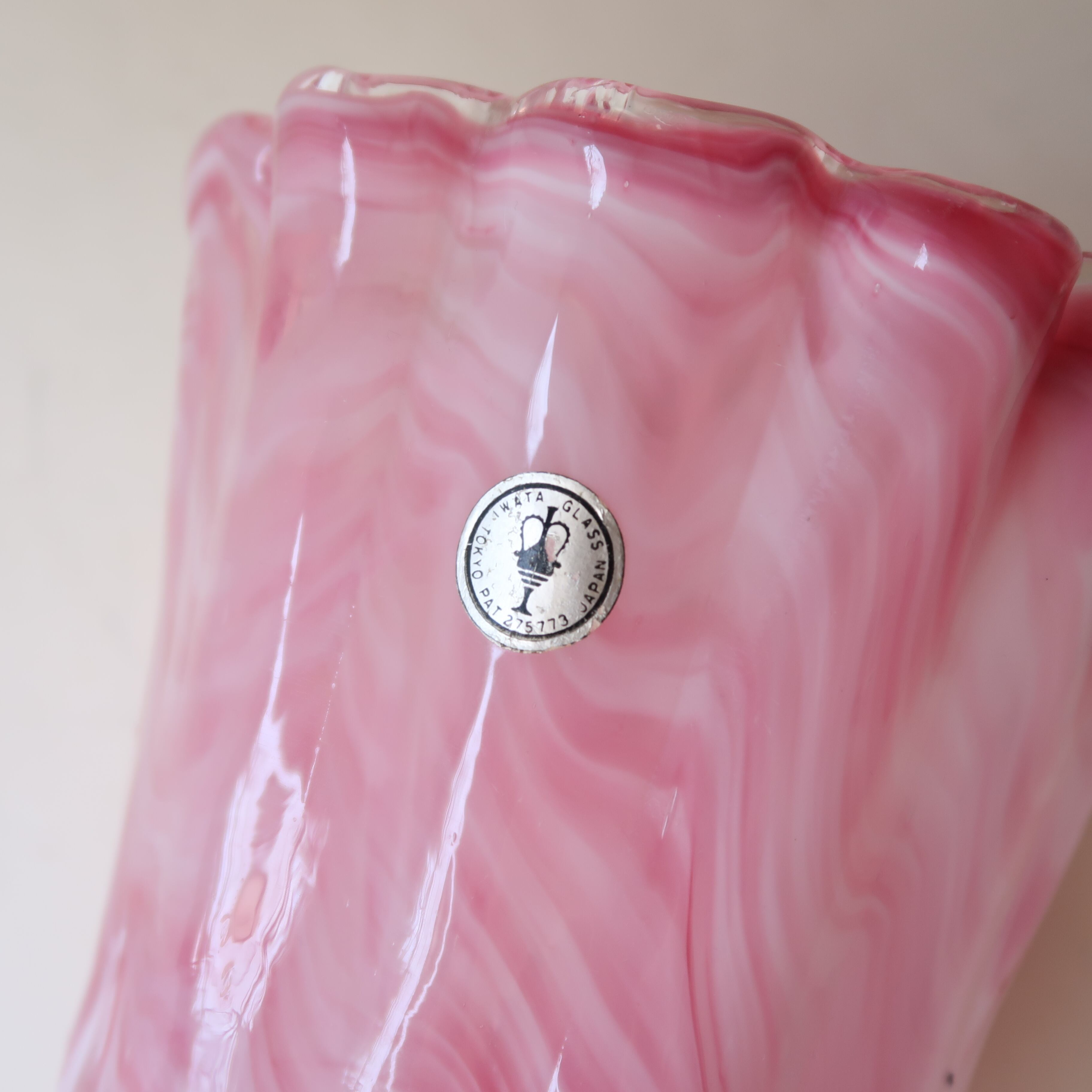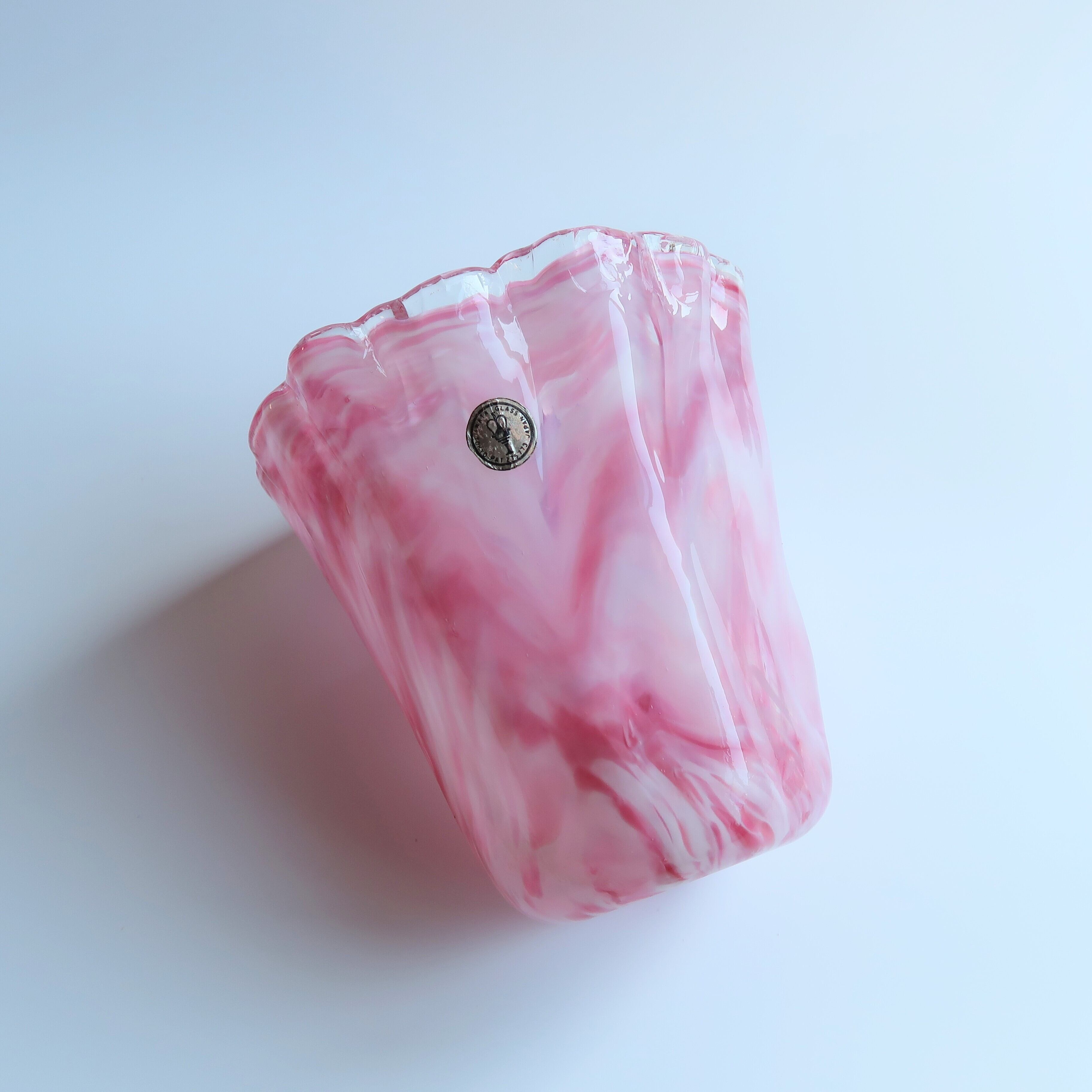 かわいいピンクとミルキーな白、そして透明。それらが混ざりあったような表情が愛らしい花瓶です。口が広いので、ぴょんぴょんと何輪か生けるとよいのではないかなと。ふちが透明なのも、氷みたいでかわいいです。