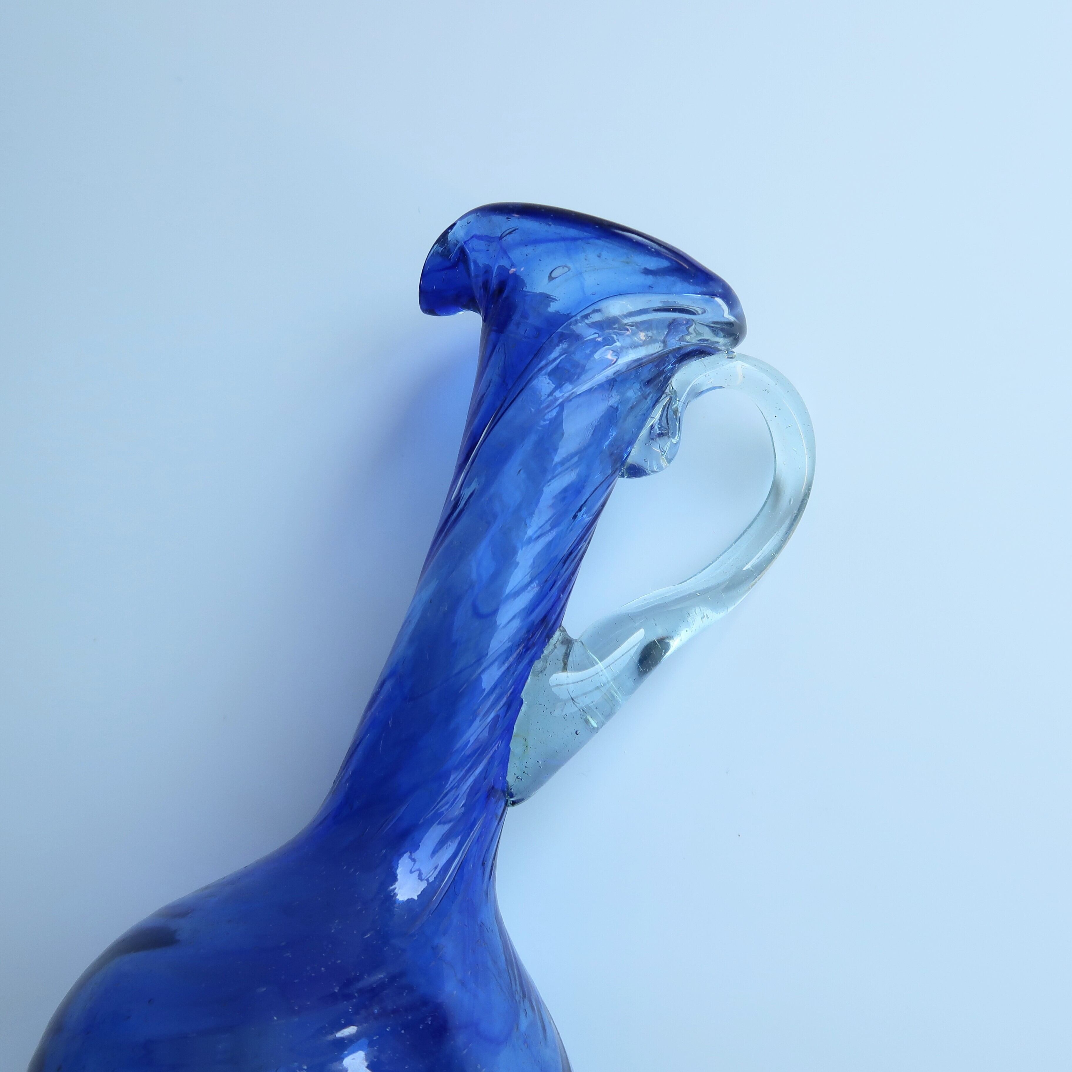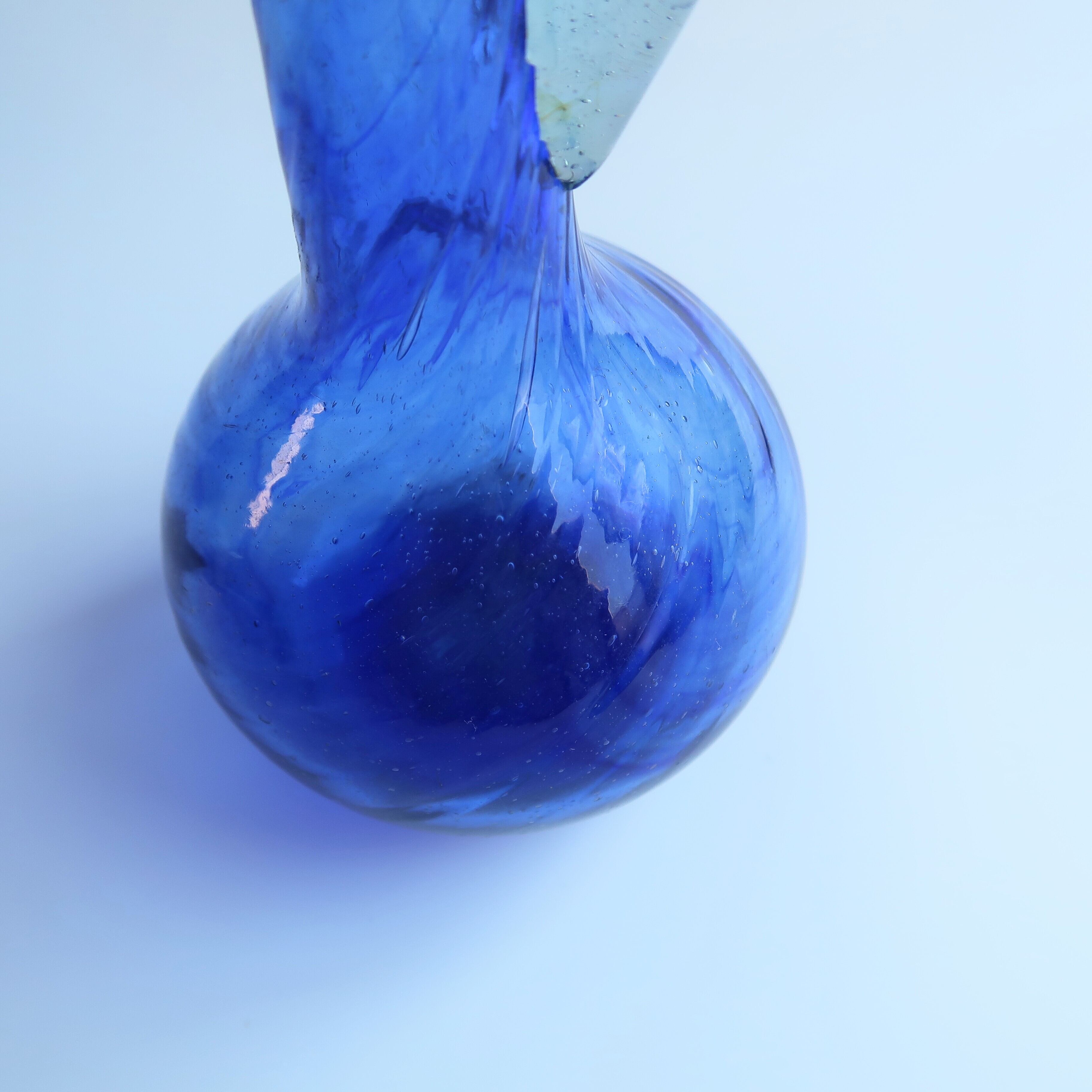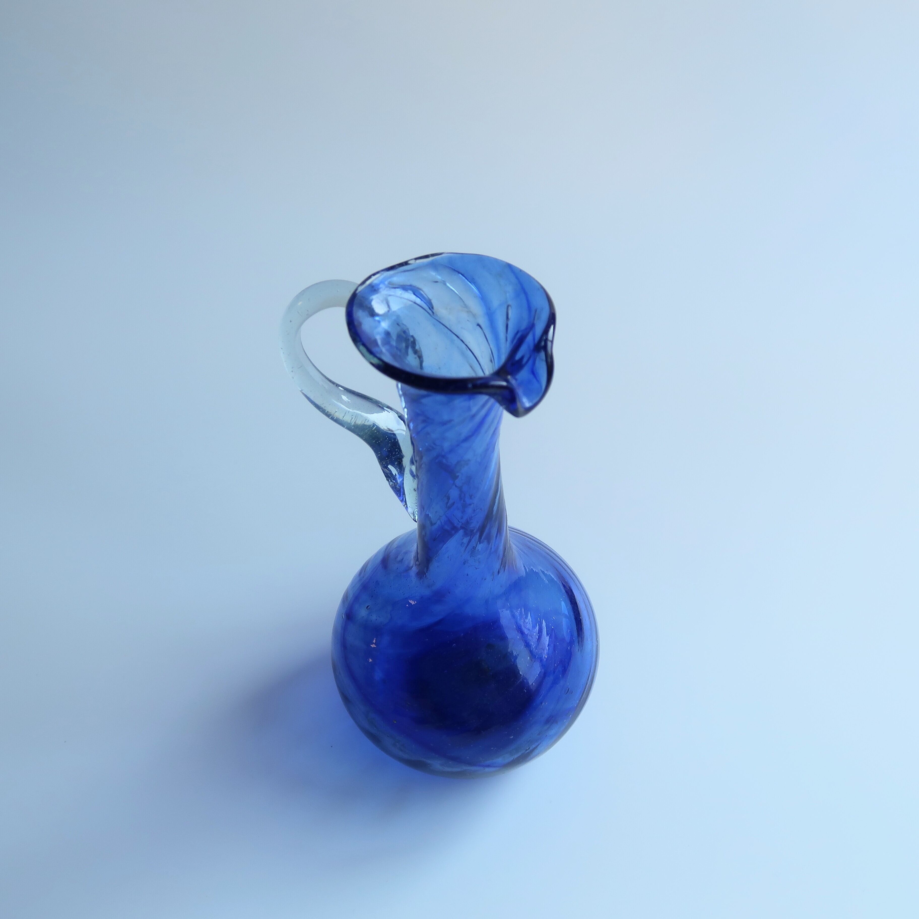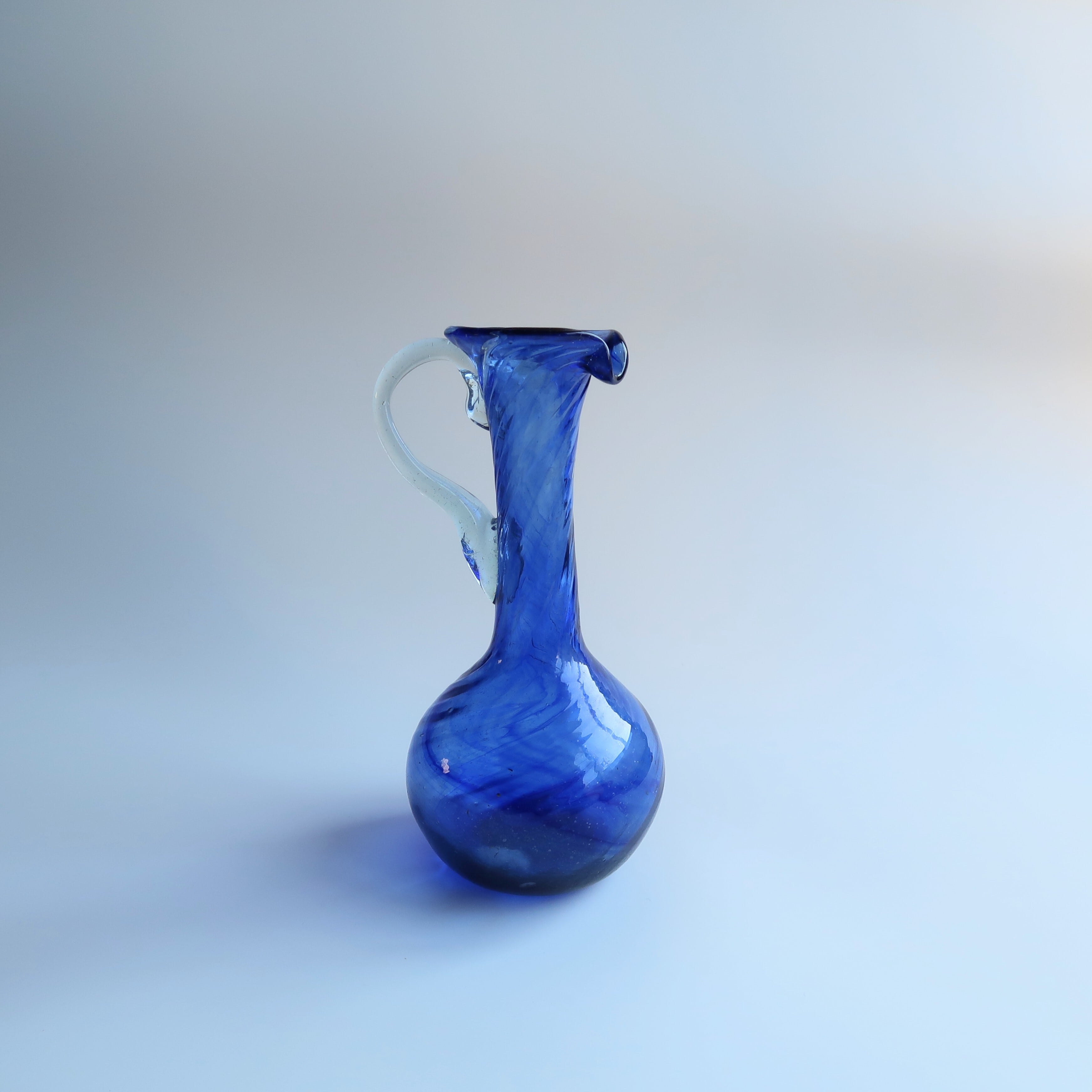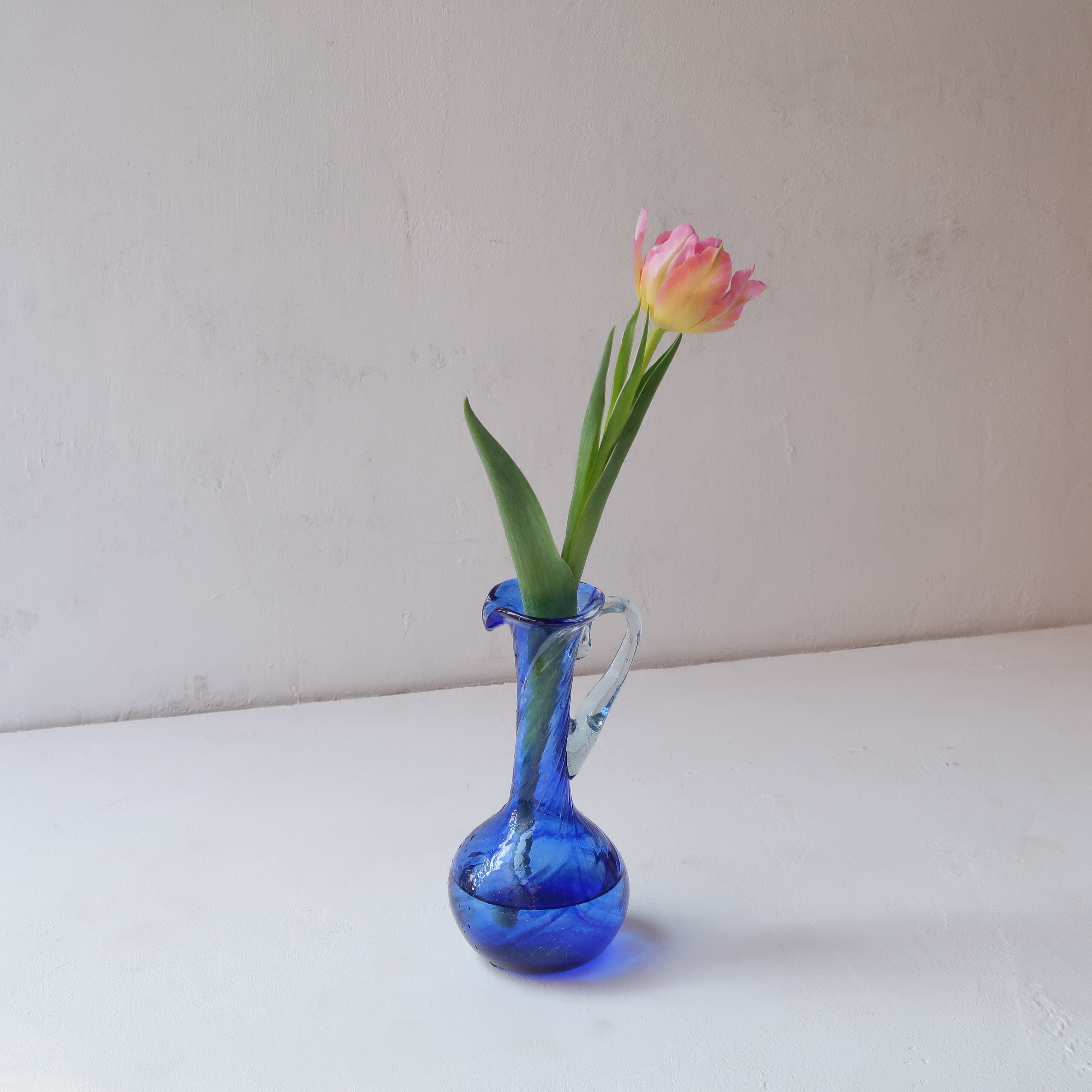 ひねりのきいた青いボディと、水色透明の取っ手がかわいい花瓶。すこし小ぶりで、一輪挿しとしても活躍しそう。丸いフラスコのようなボディは青が少しまだらで、手作りのような表情がかわいいです。