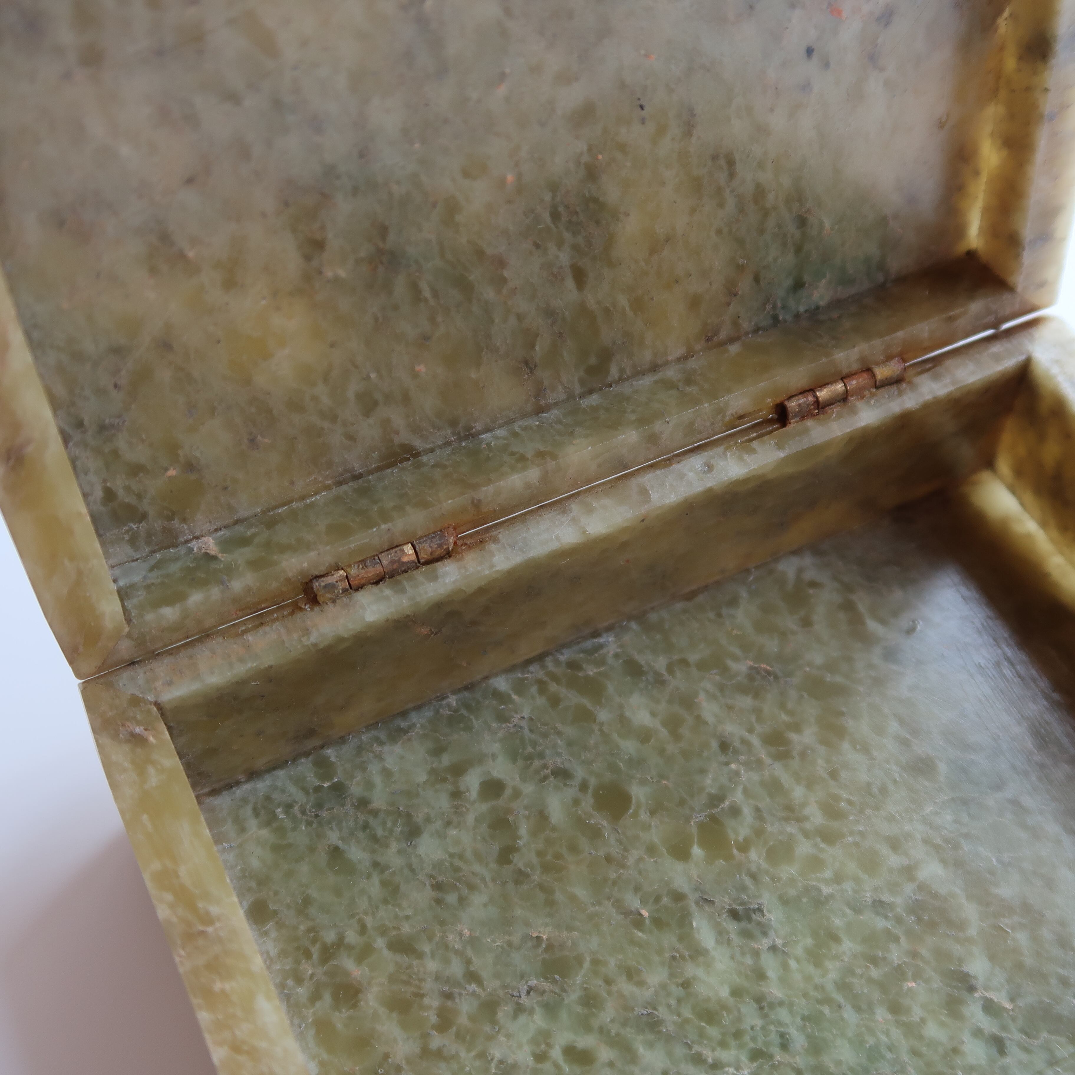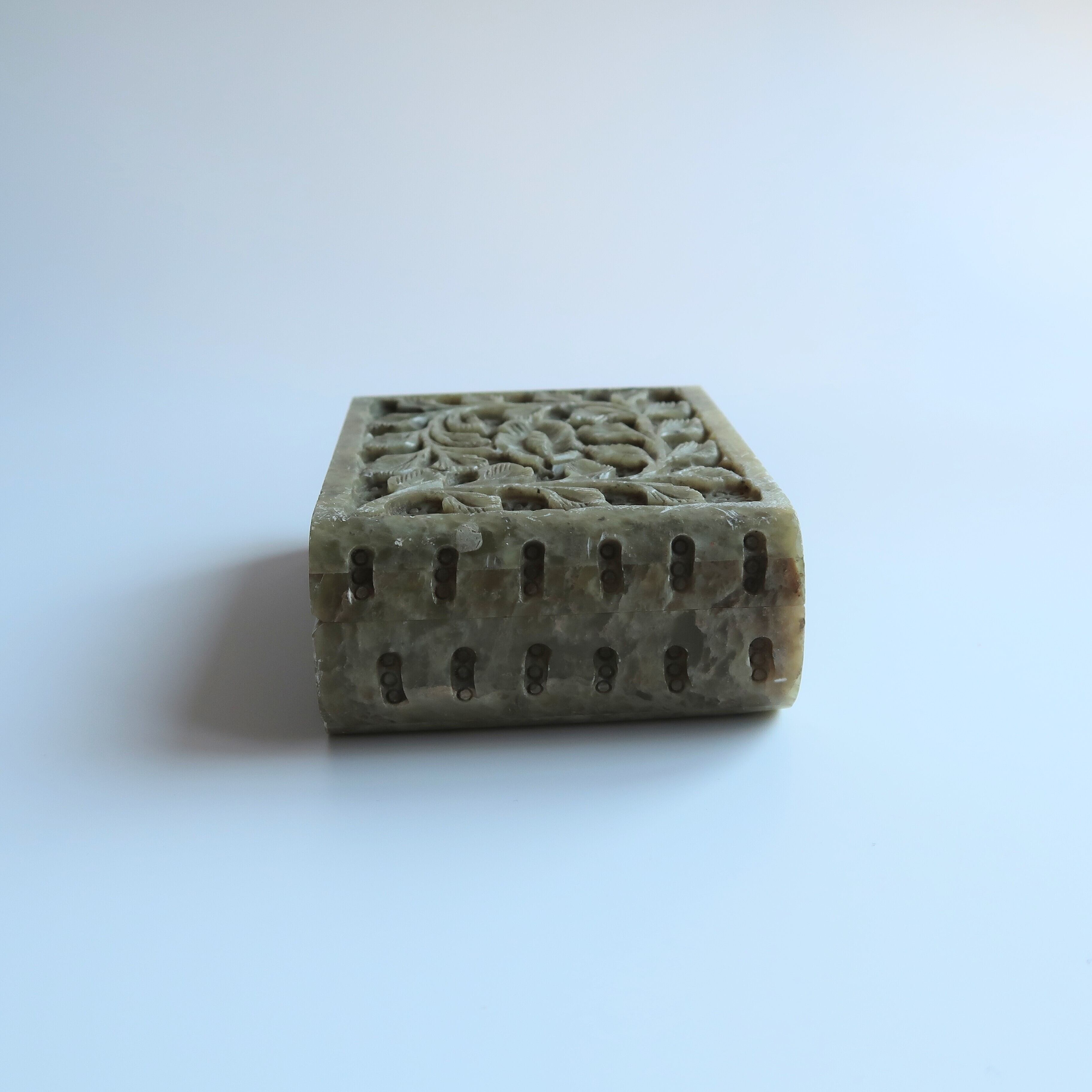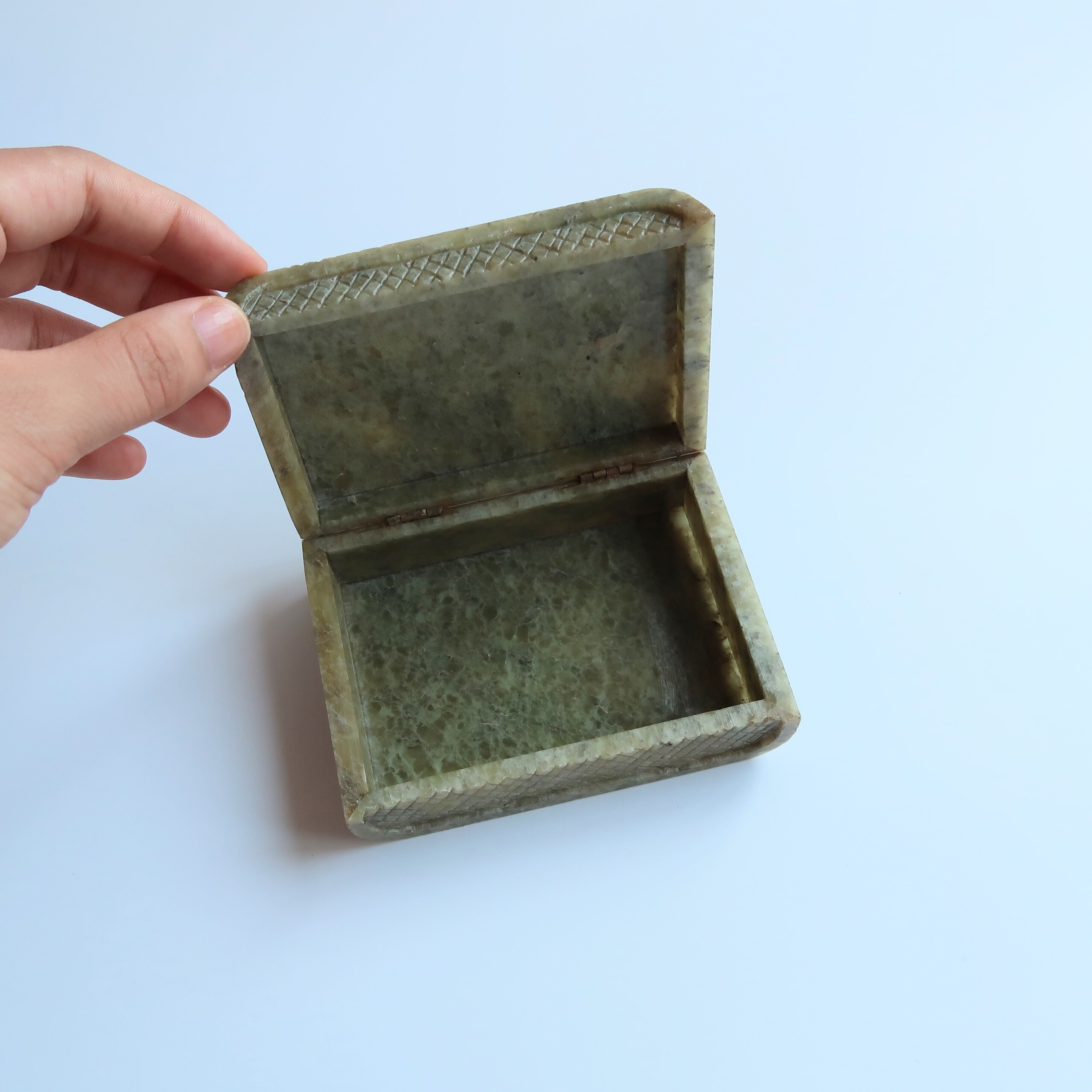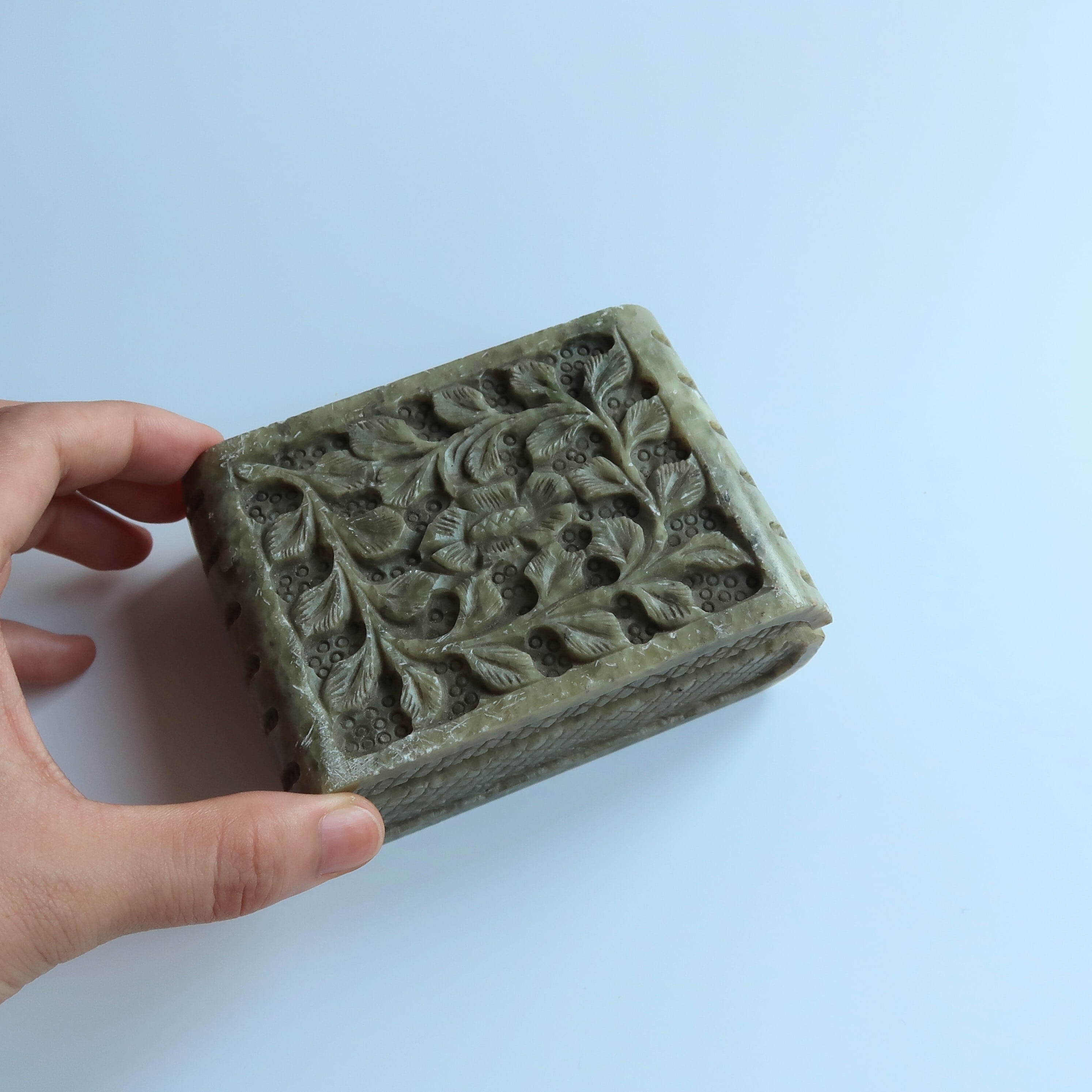 草木のリースとお花の彫りがかわいいジュエリーボックス。石製で、模様が彫られてでこぼこしています。表面は草花だけが彫られていると思いきや、背景に丸々もいて、芸が細かいんです。
