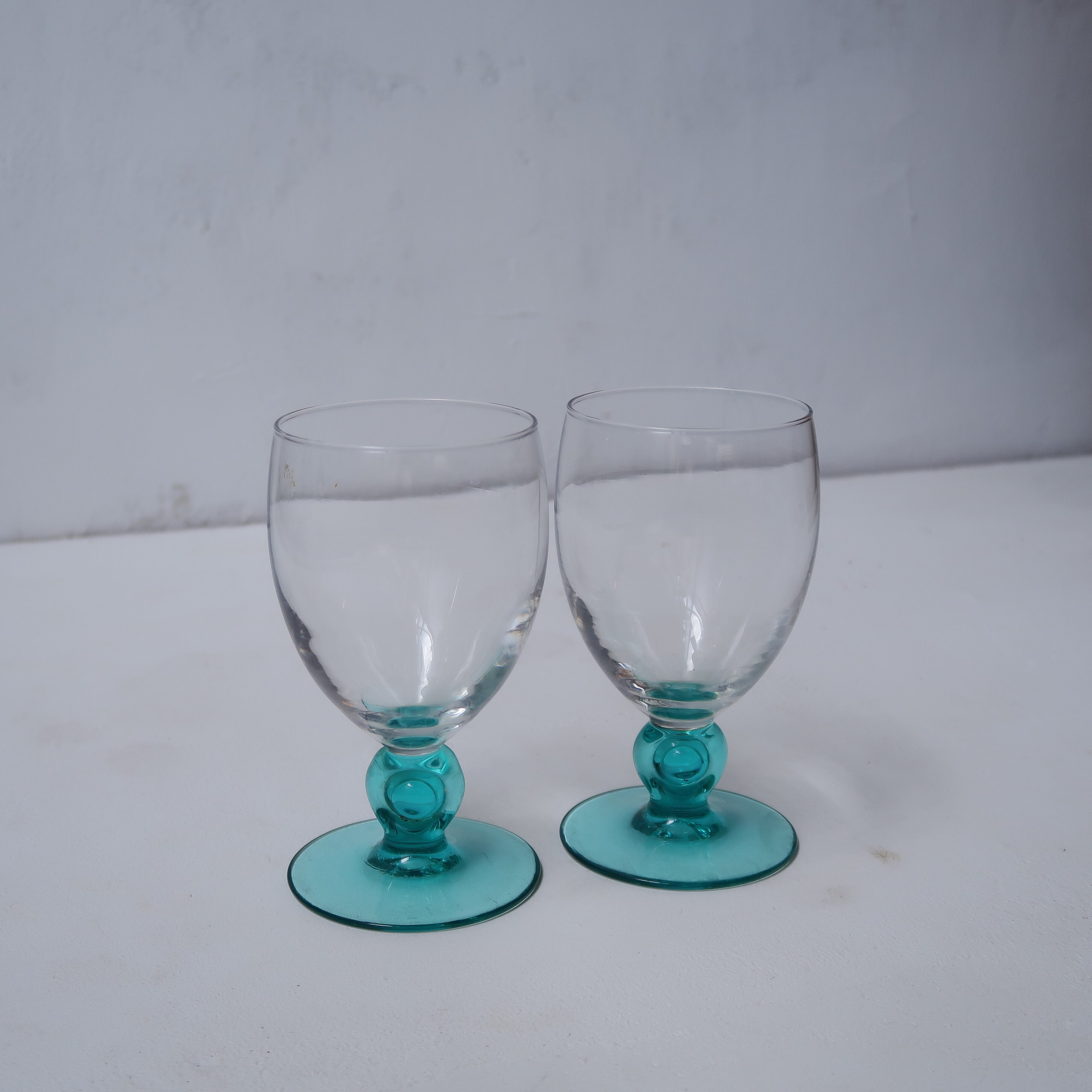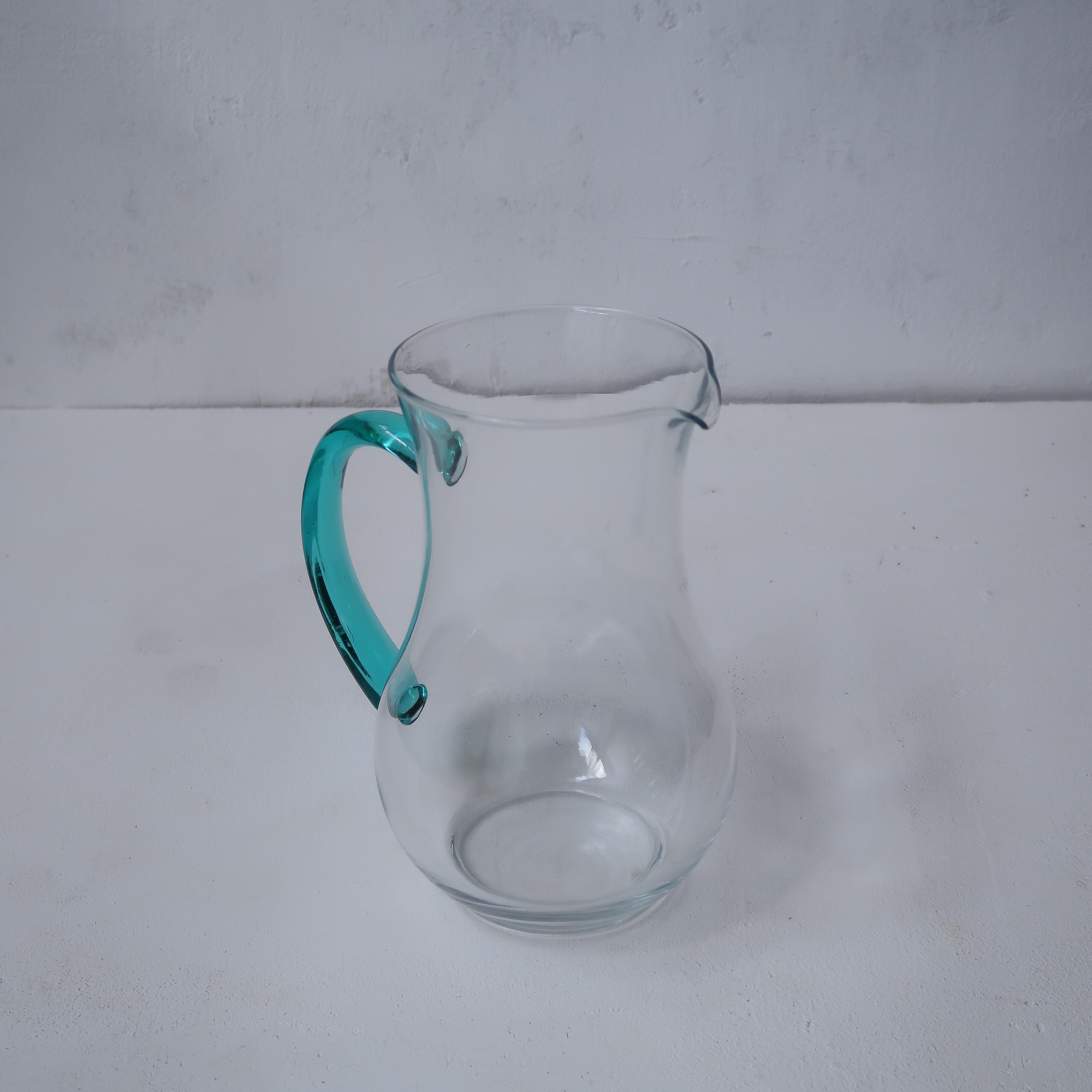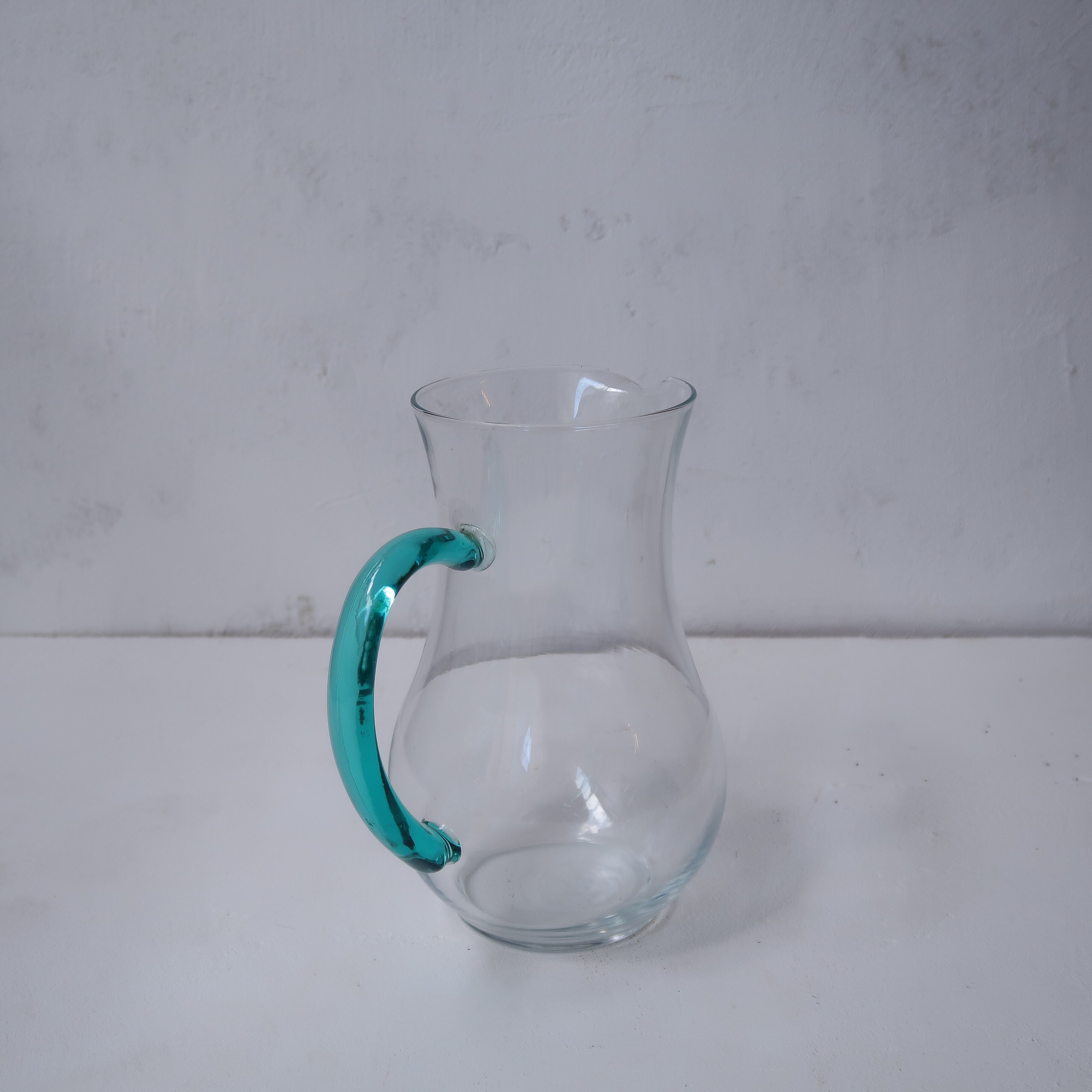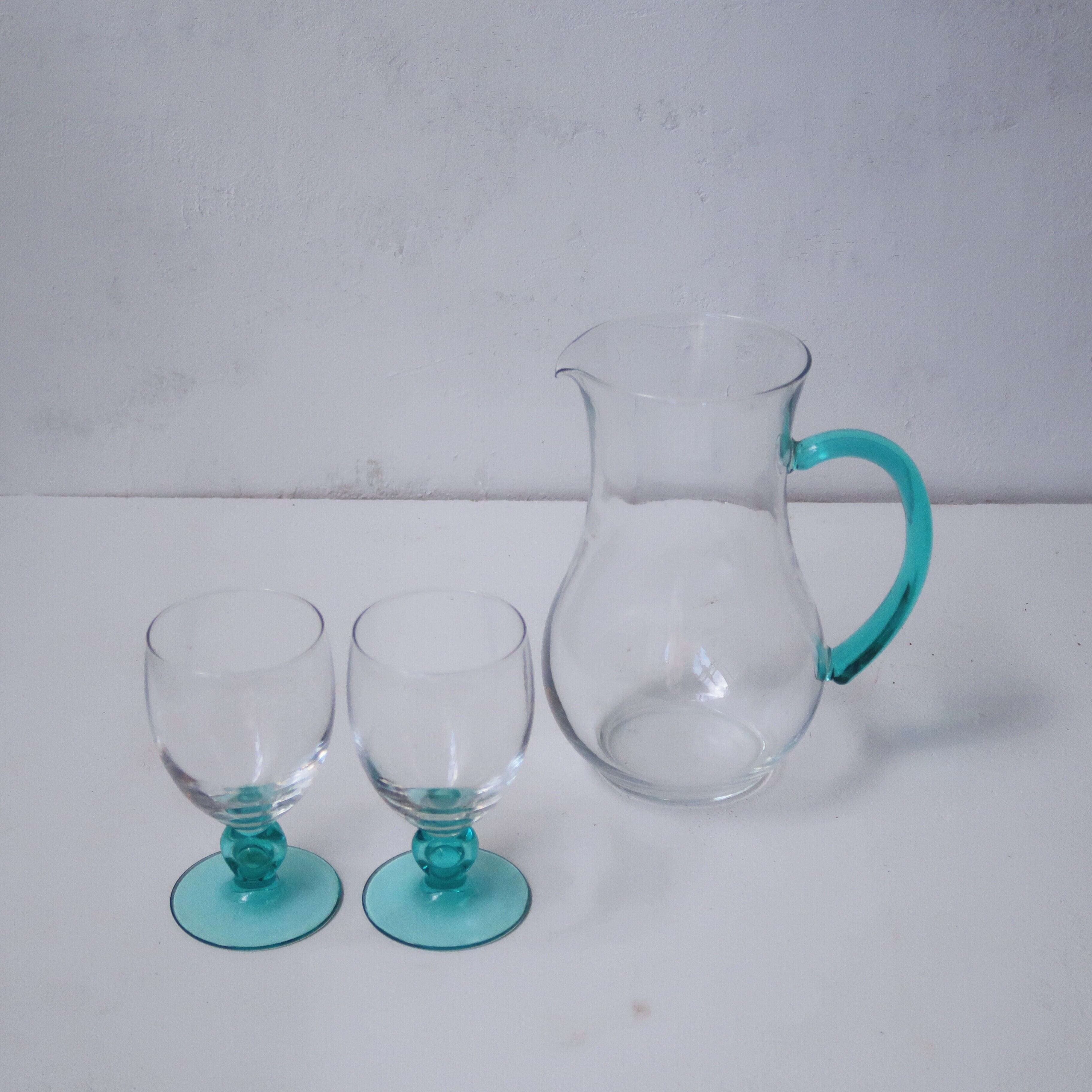 ピッチャーの取っ手、グラスのステムの鮮やかな水色が特徴的な一品。