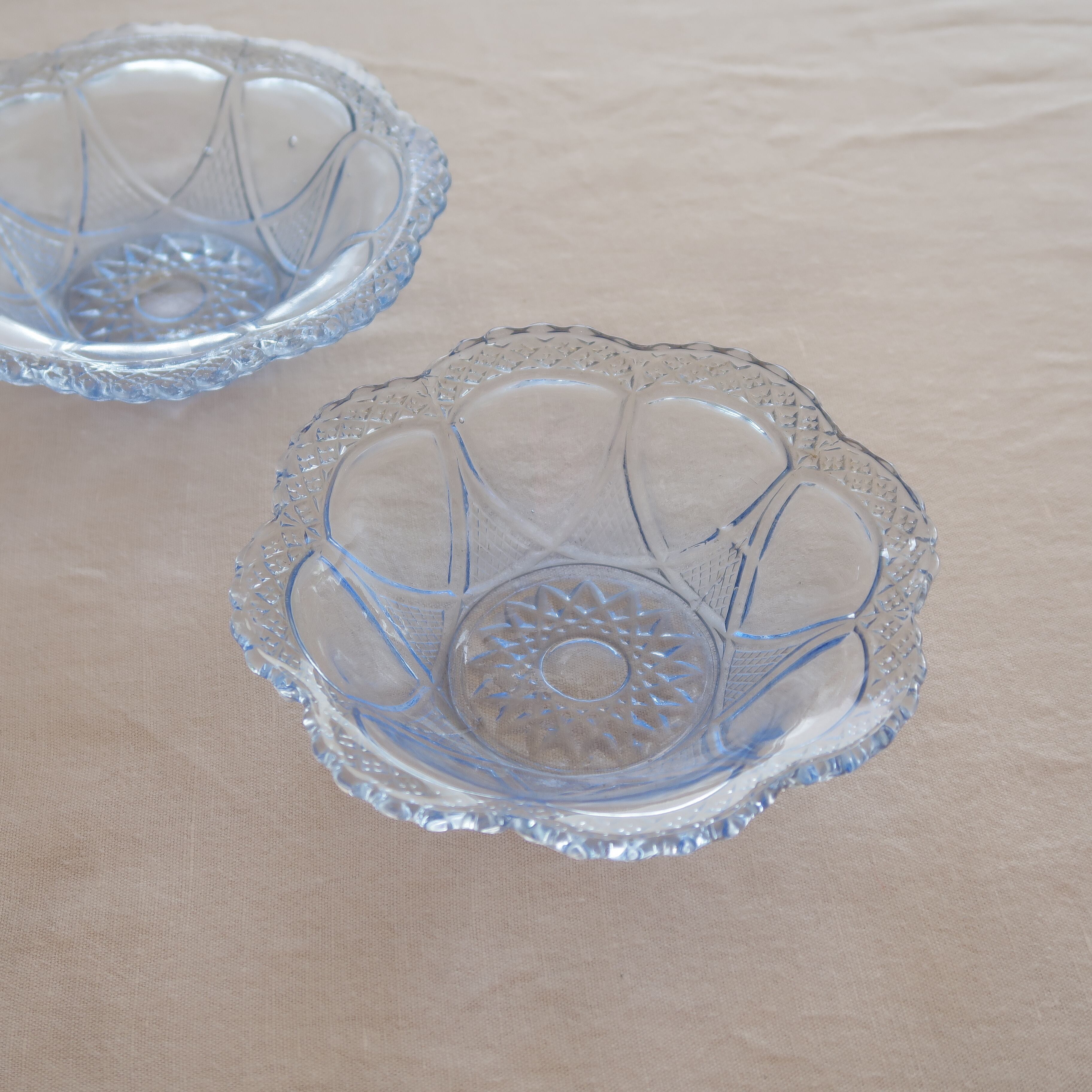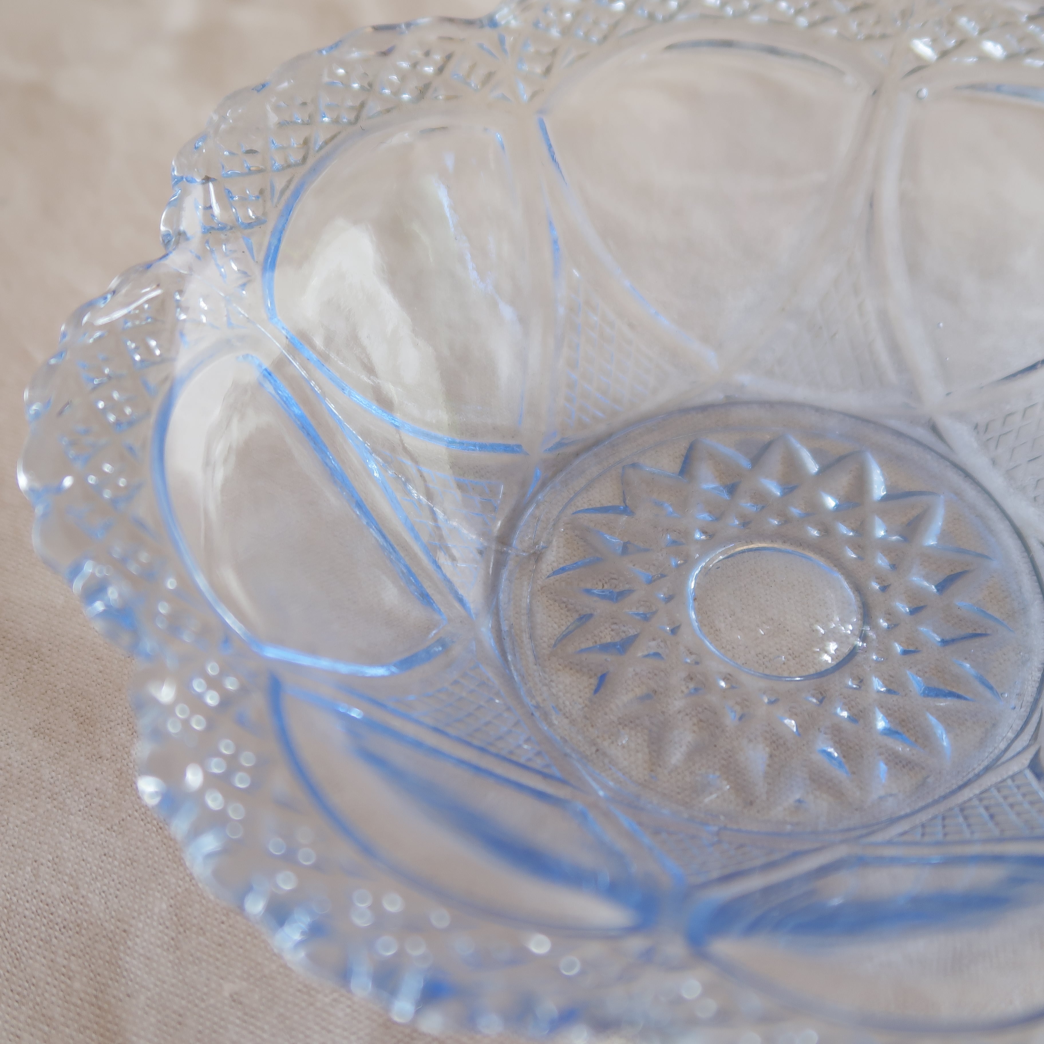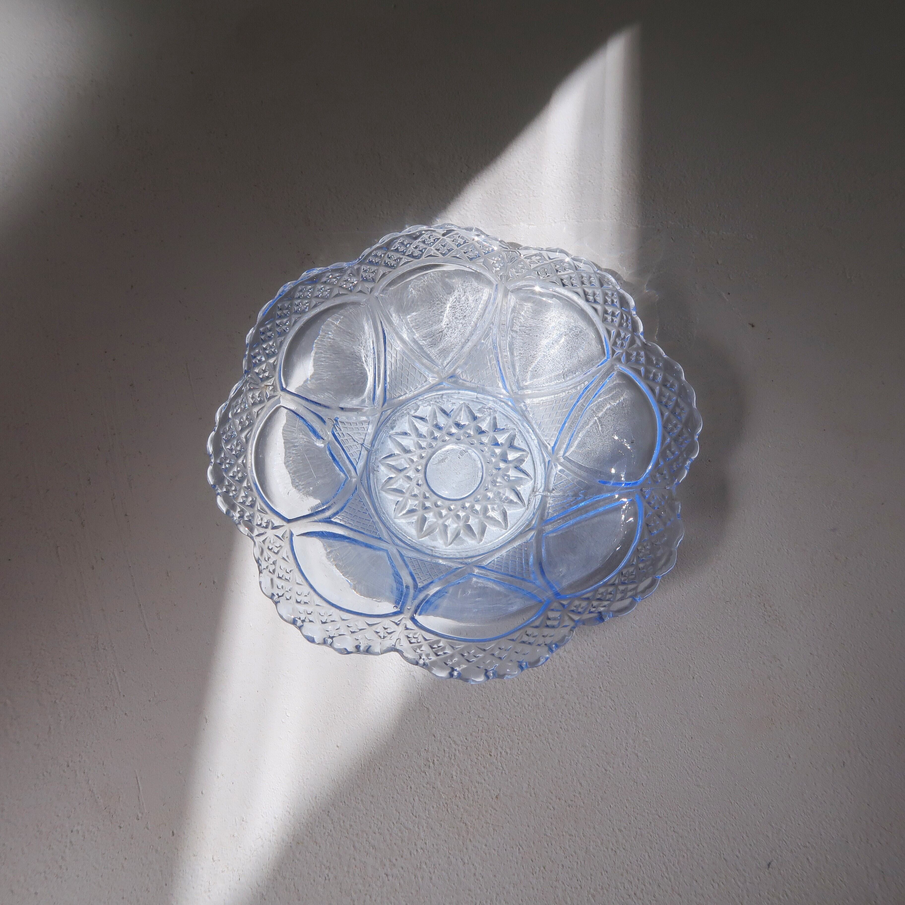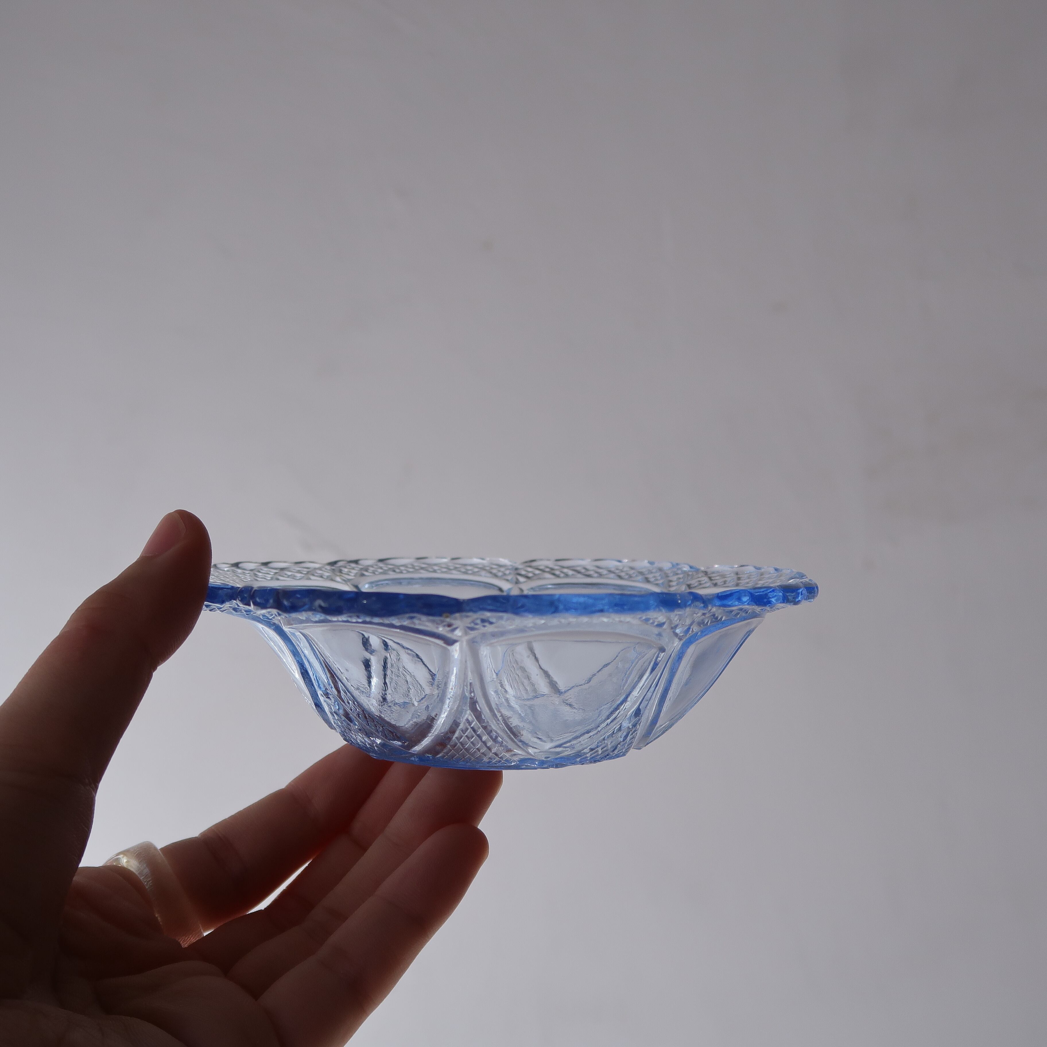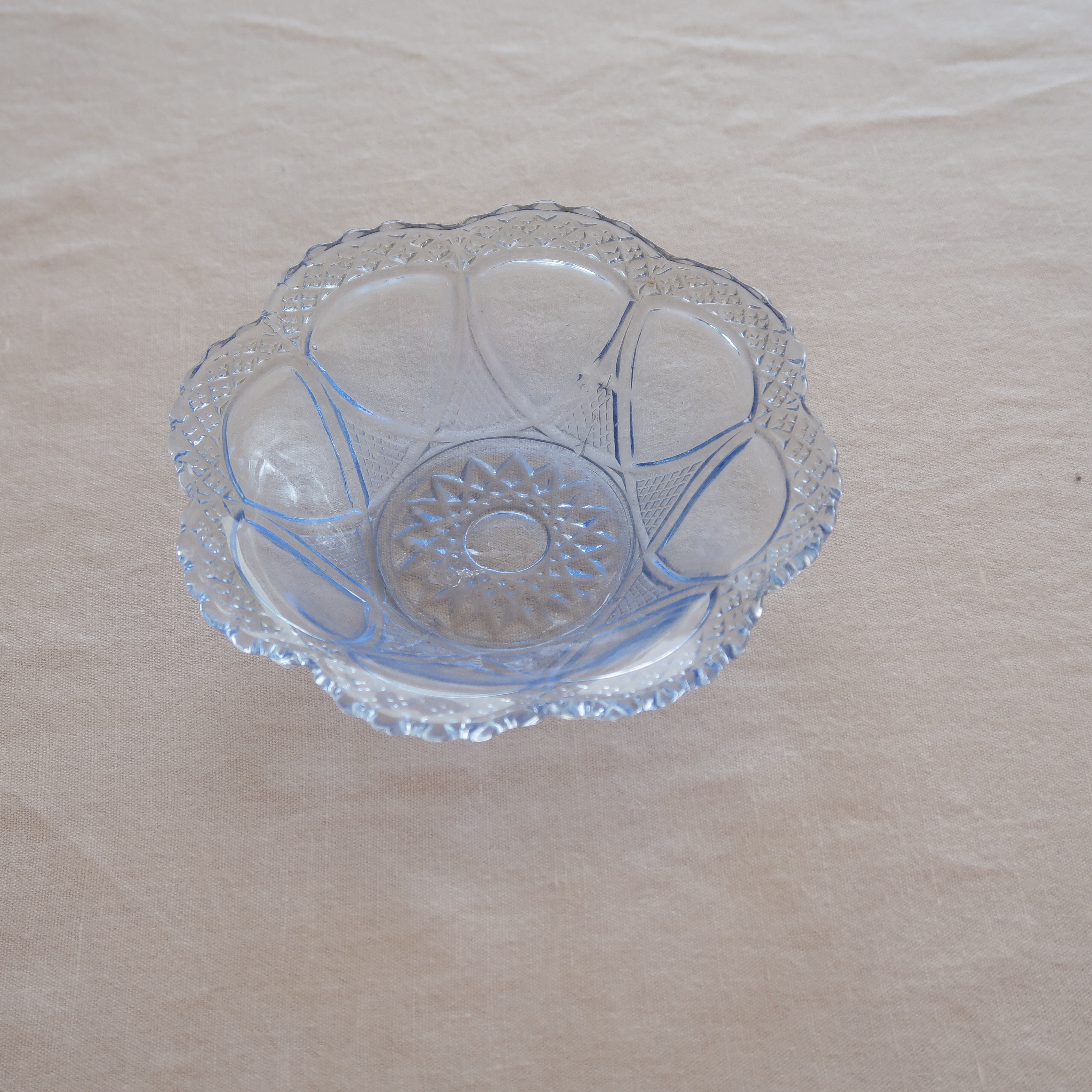 すこし深さがあって、ふちのレースがかわいいガラスのお皿。上から見ると花びらのような形になっていて、愛らしいです。光にあたるとますますかわいい。冷たいものや甘いもの、お気に入りのジュエリーなどの光るものを入れてもよさそうです。