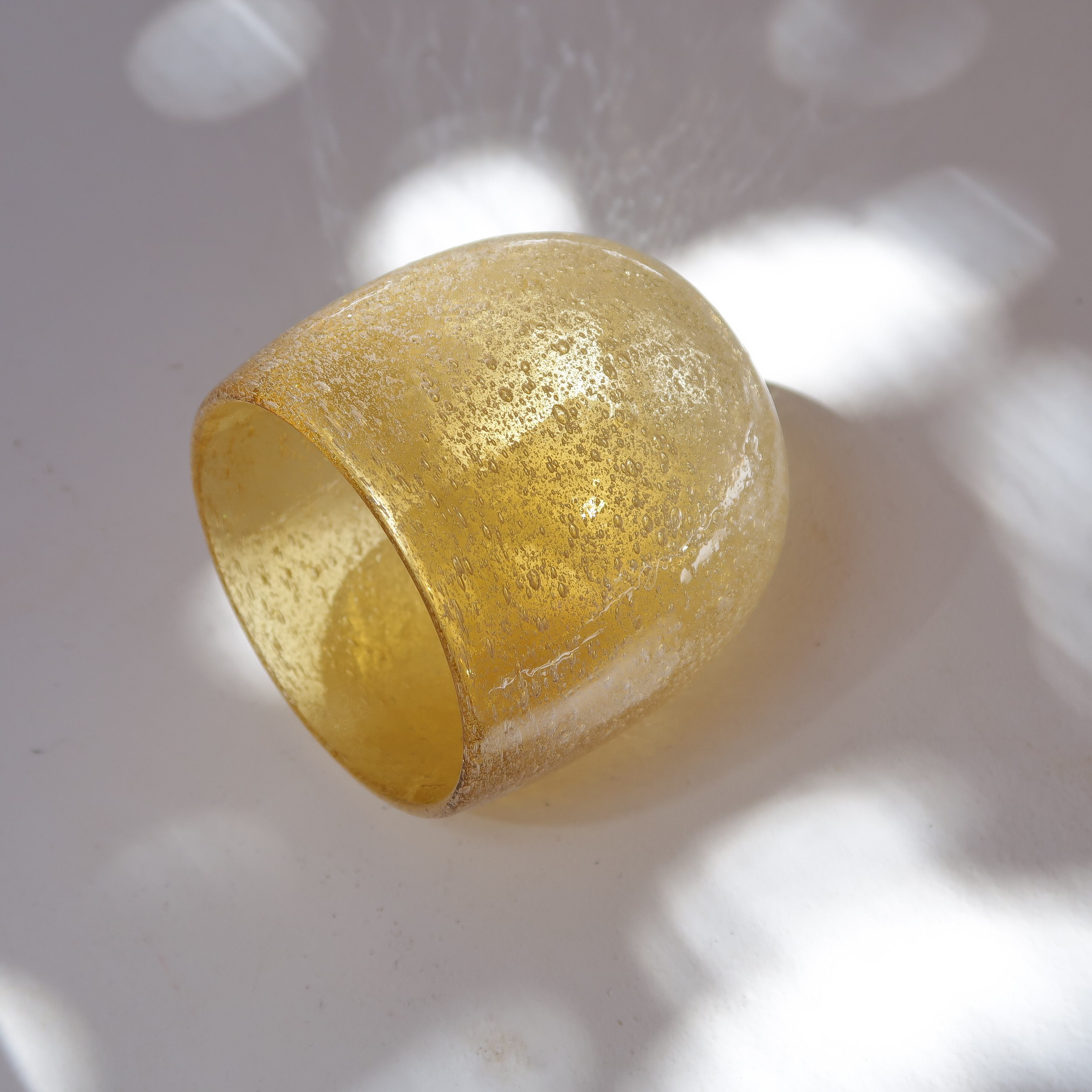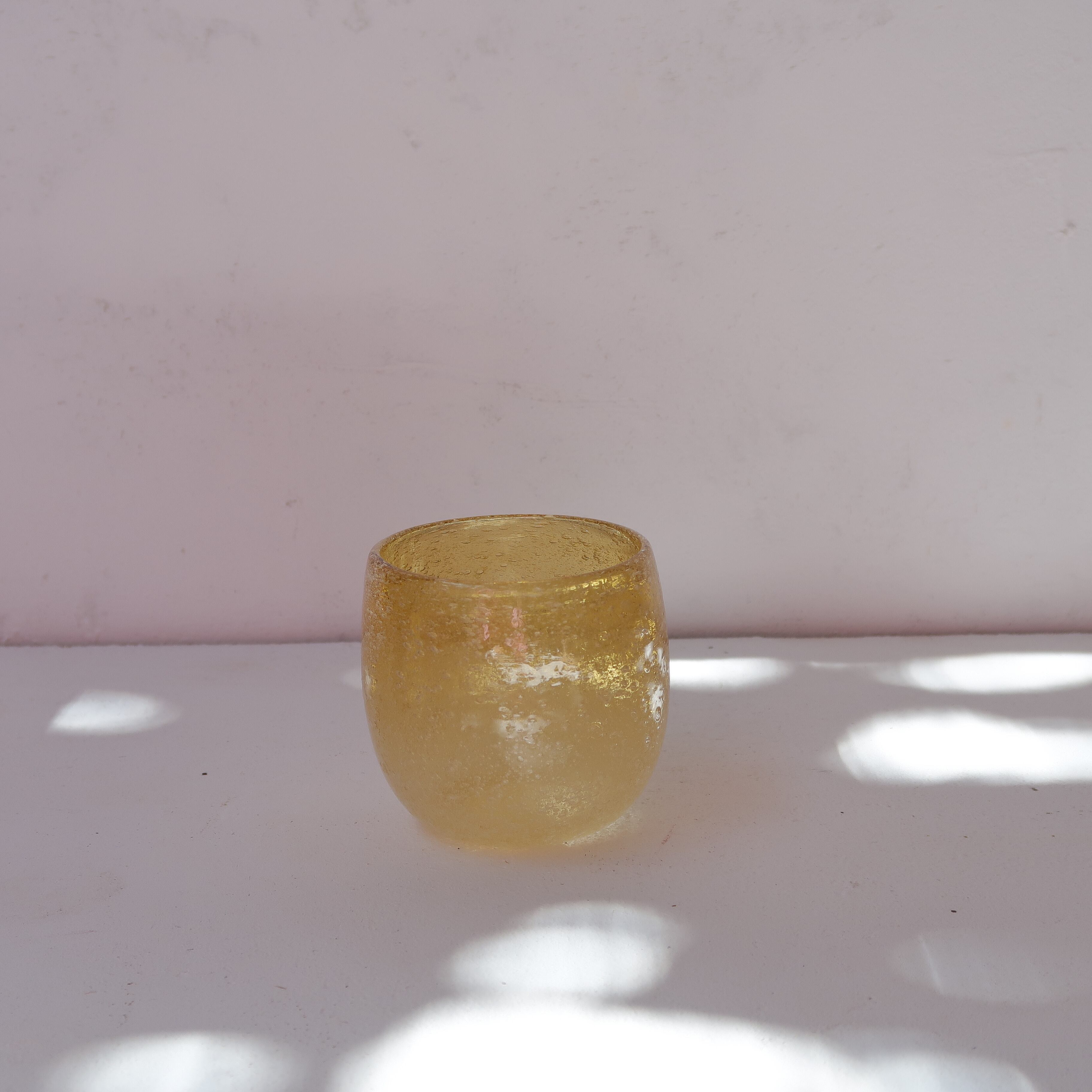 気泡がたくさん入ってシュワシュワしているかのようなコップ。色合いはどちらかというときつね色。飲み口のあたりは、飴色になってきているような少しこんがりとした色合いです。細かくくだいた氷で梅酒など?