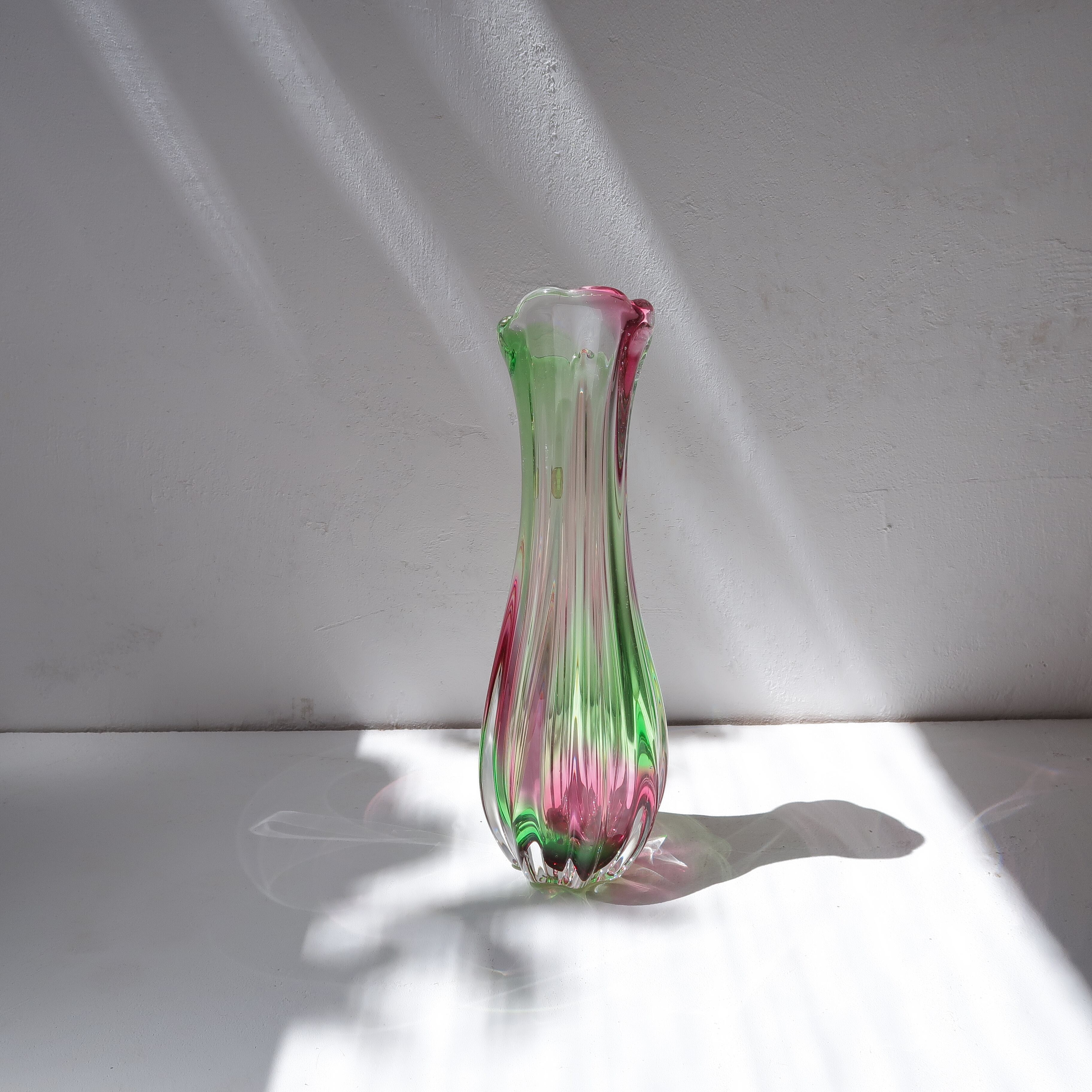 ピンクとグリーンの鮮やかな組み合わせがとってもかわいい花瓶。ぽてっとしたガラスでできていて、ずしっと重たい。縦にラインが入っているのですっきりとした印象がありながら、底の丸みやふちのひらひらが、かわいさも演出してくれています。光にあたると、きらきらしてかわいいです。