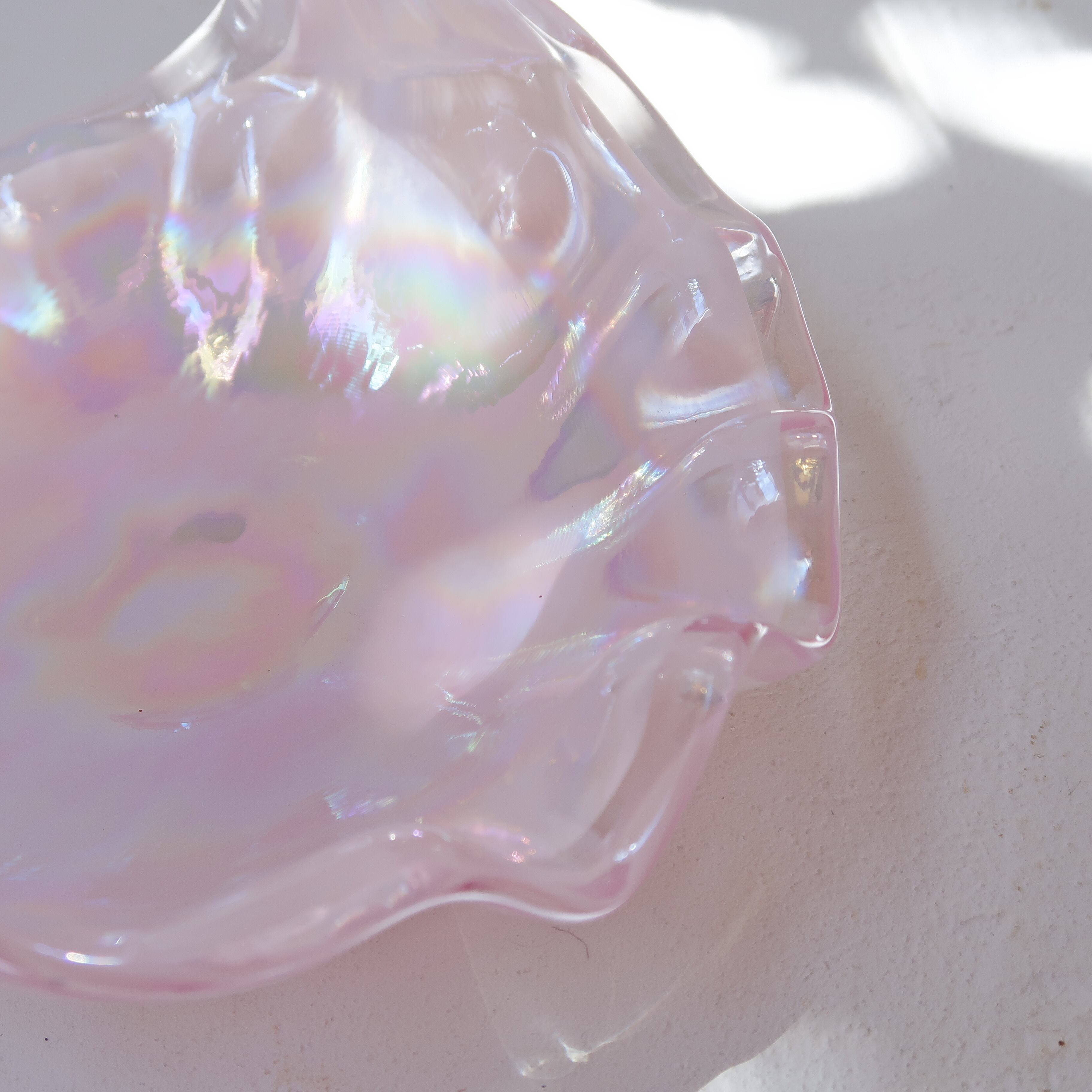 オーロラのようなかがやきがまばゆい、ガラスのフルーツバスケット。ひらひらとしたお皿に、地続きでガラスの持ち手がついてます。まるで、フルーツバスケットみたいな。
