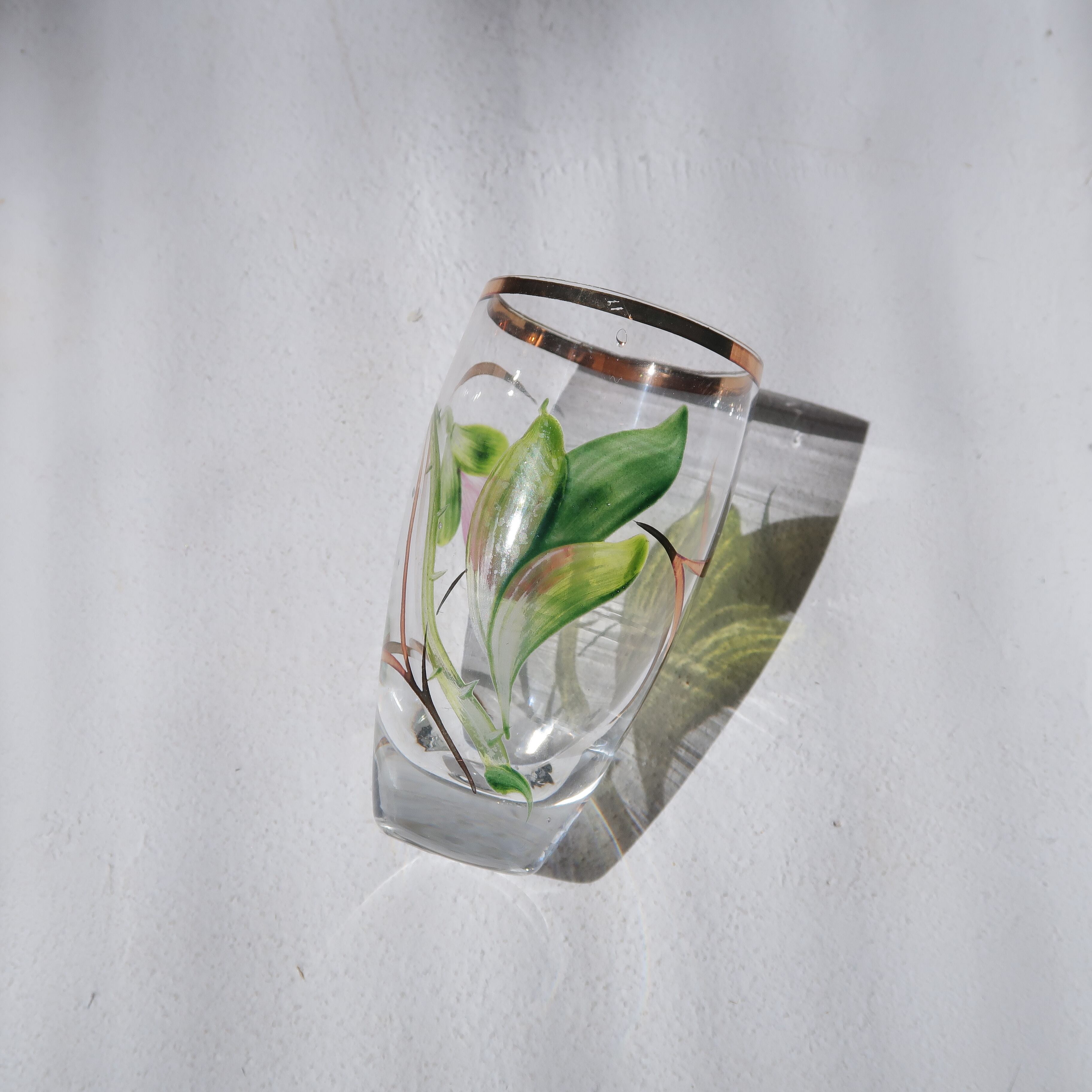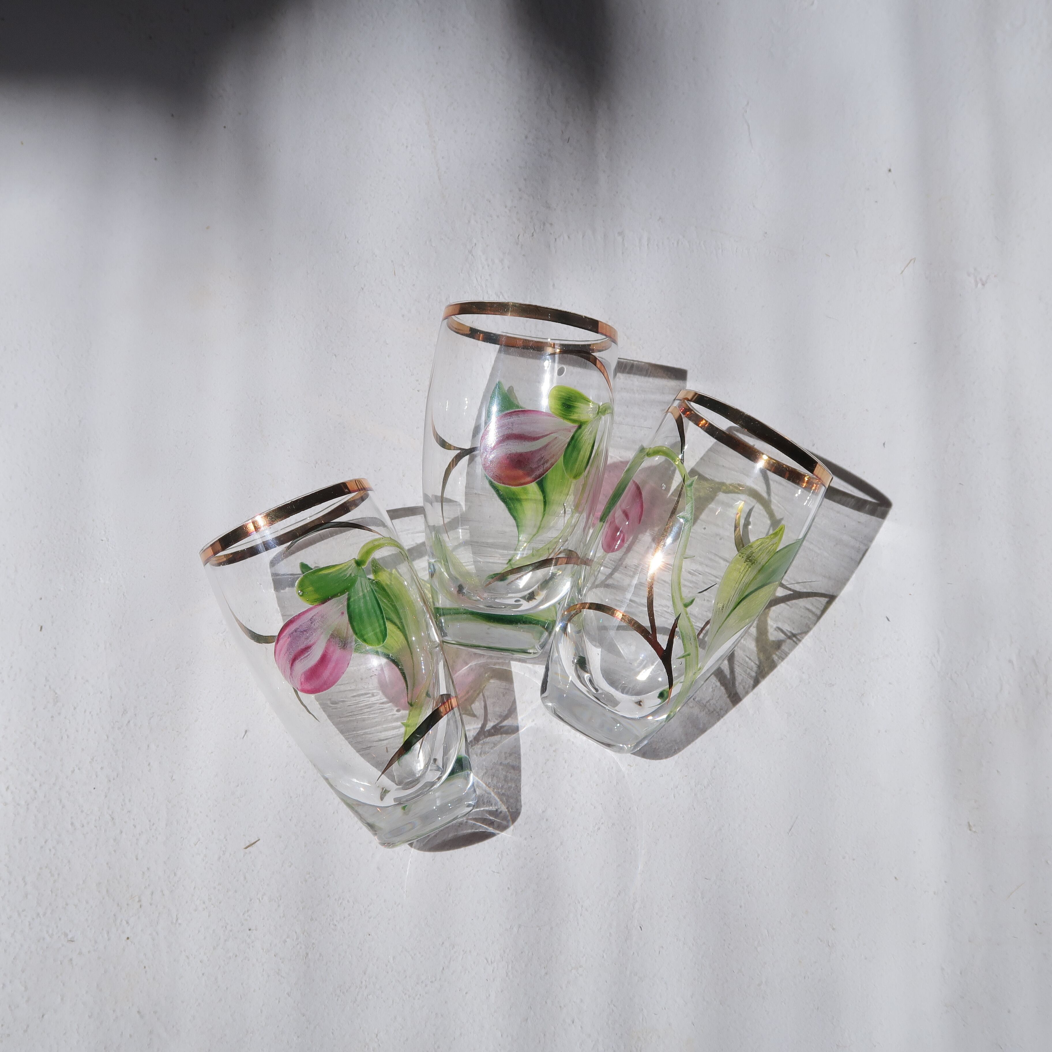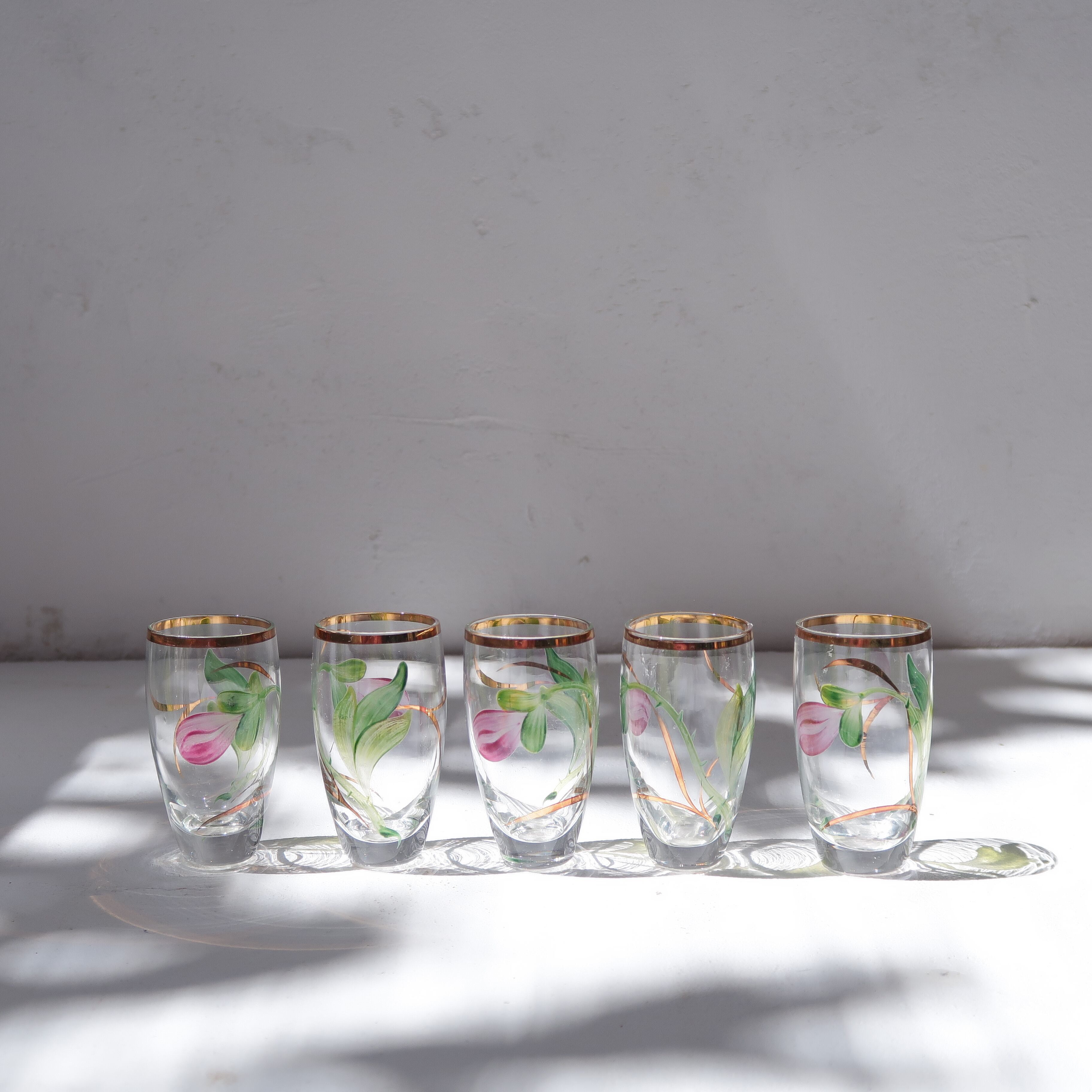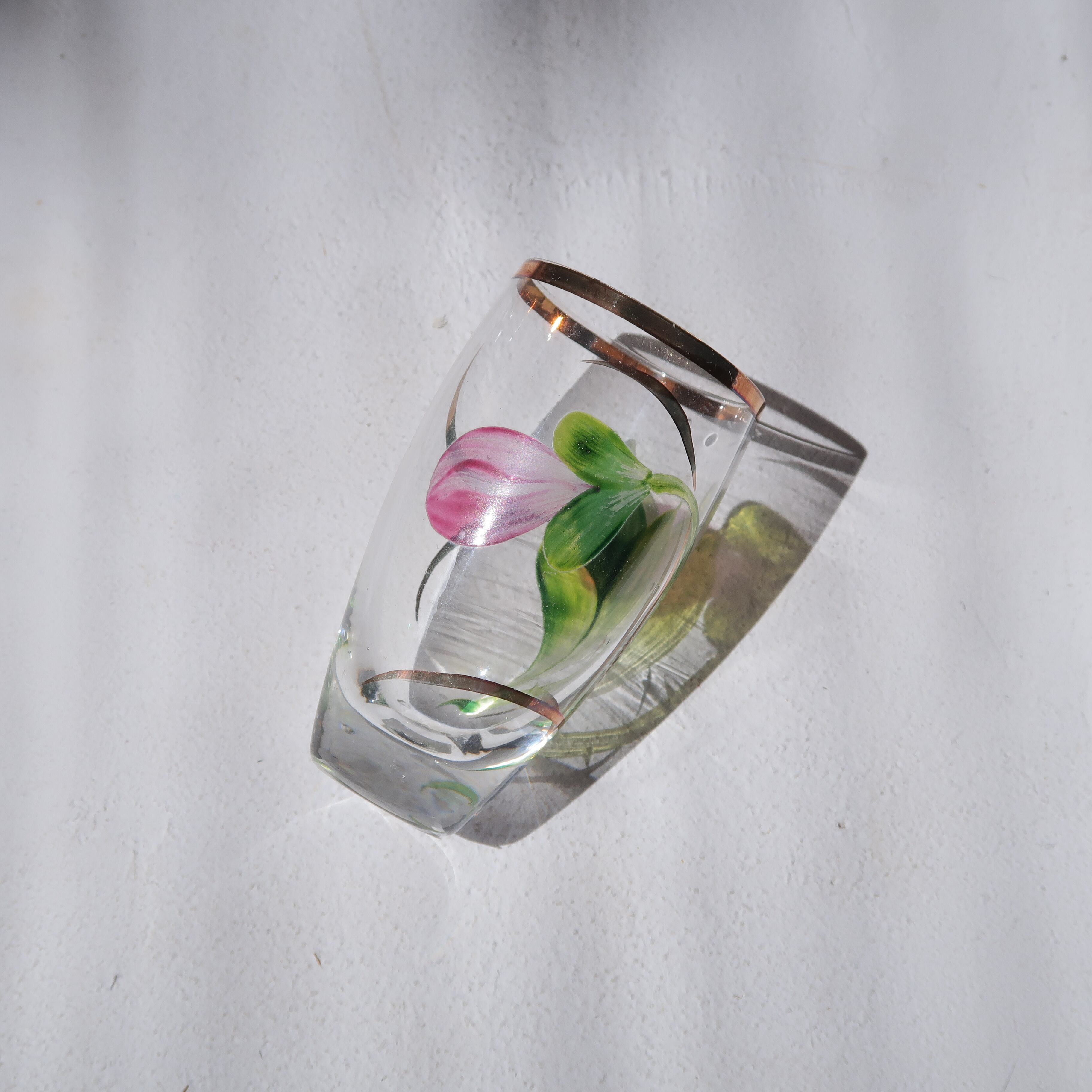 ピンクのお花がペイントされたガラスのミニグラス。ゴールドのふちやラインが入っていて、華やかな印象があります。