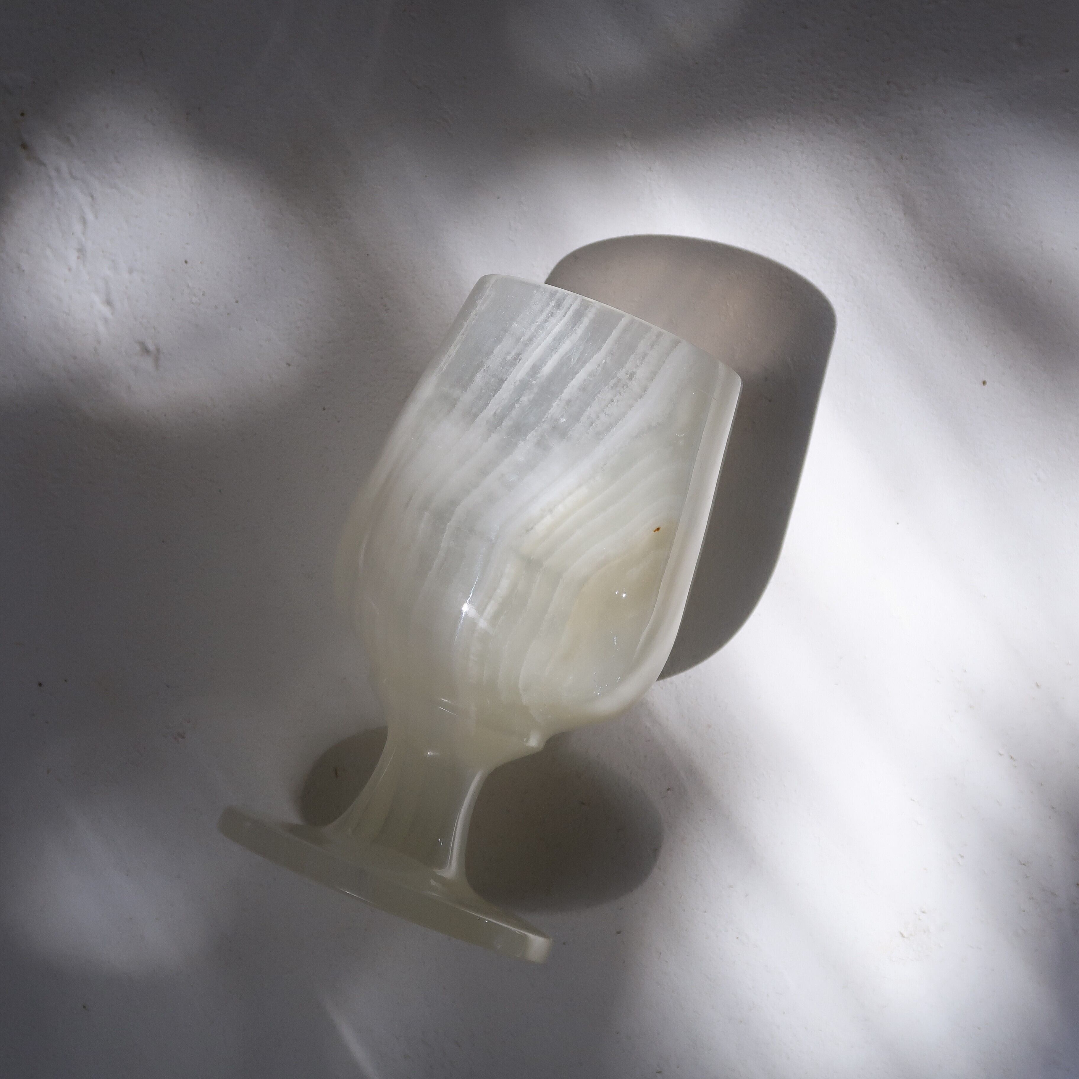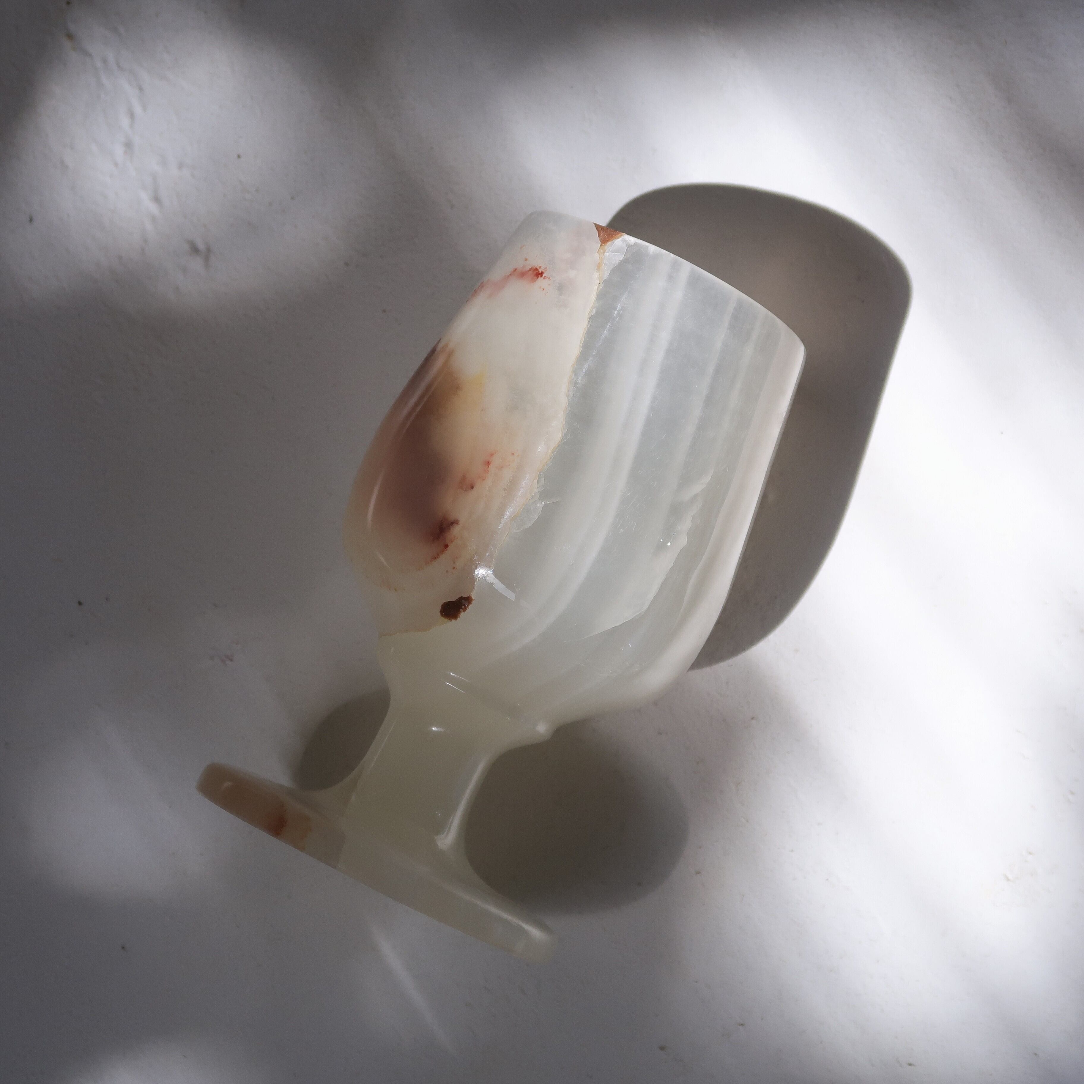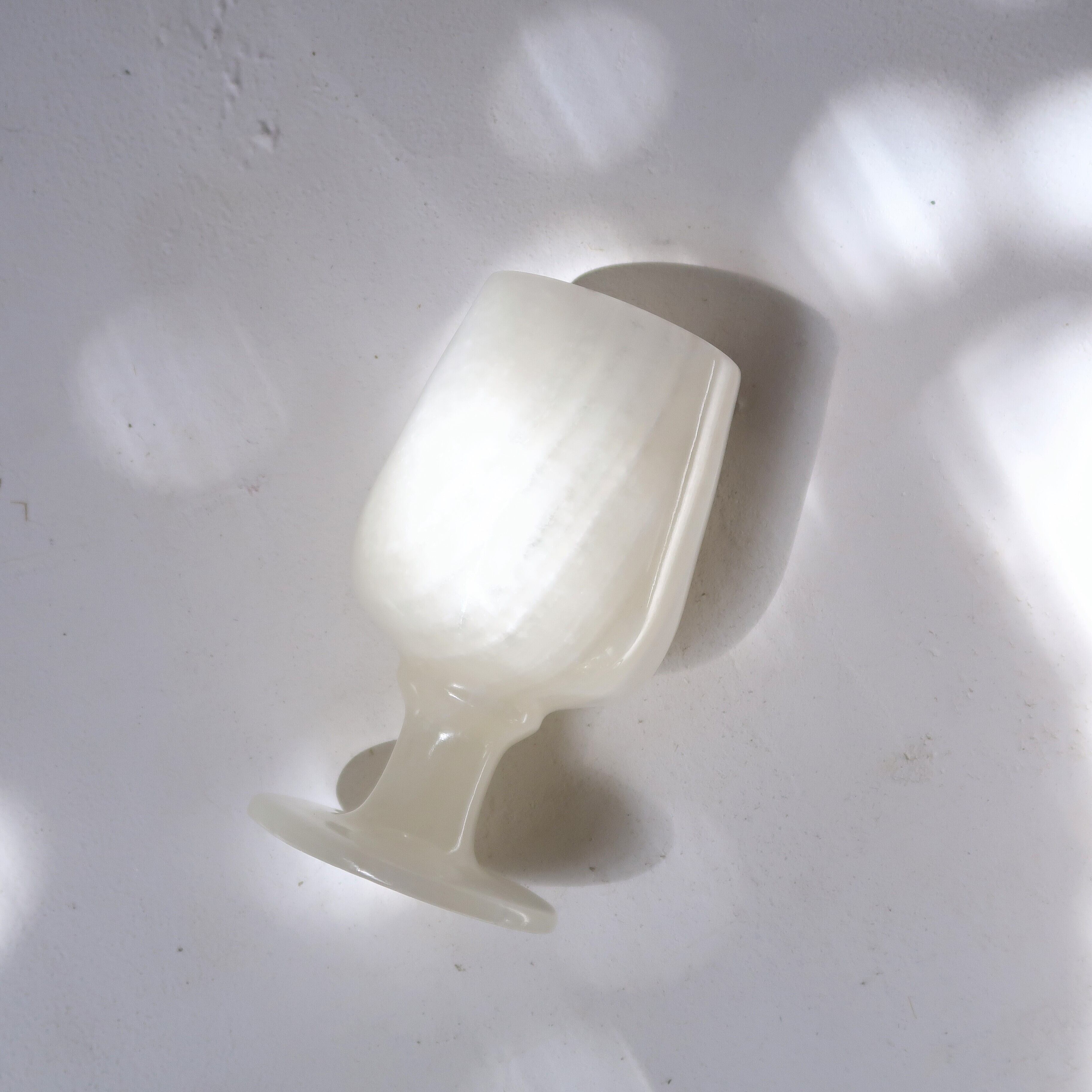 石の層が見えるくらい、白くて透明な石のゴブレット。光に当たると透けてきれいです。ピアスを引っ掛けておいたり、ネックレスを掛けたり。はたまた、キャンドルホルダーとしてもお使いいただけます。