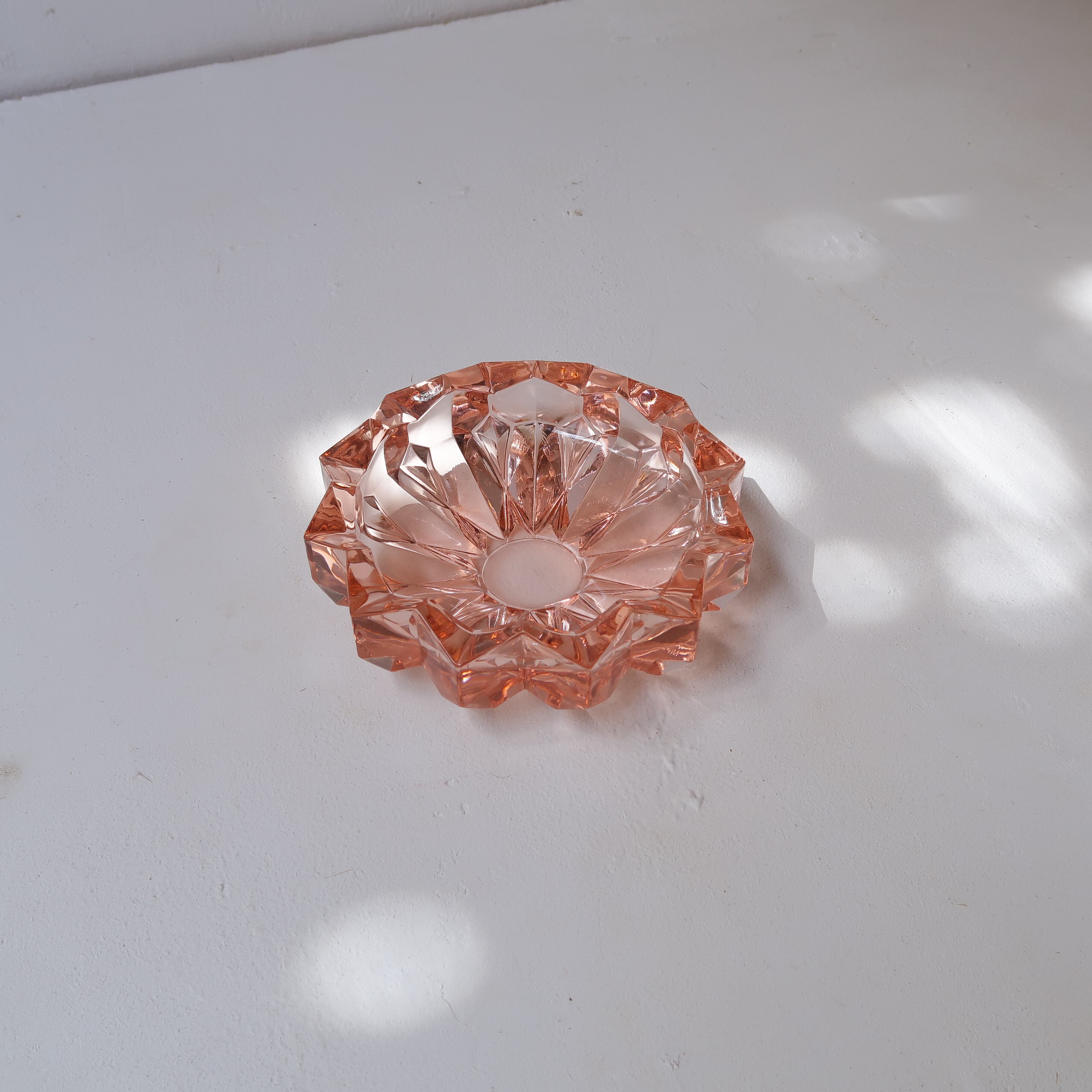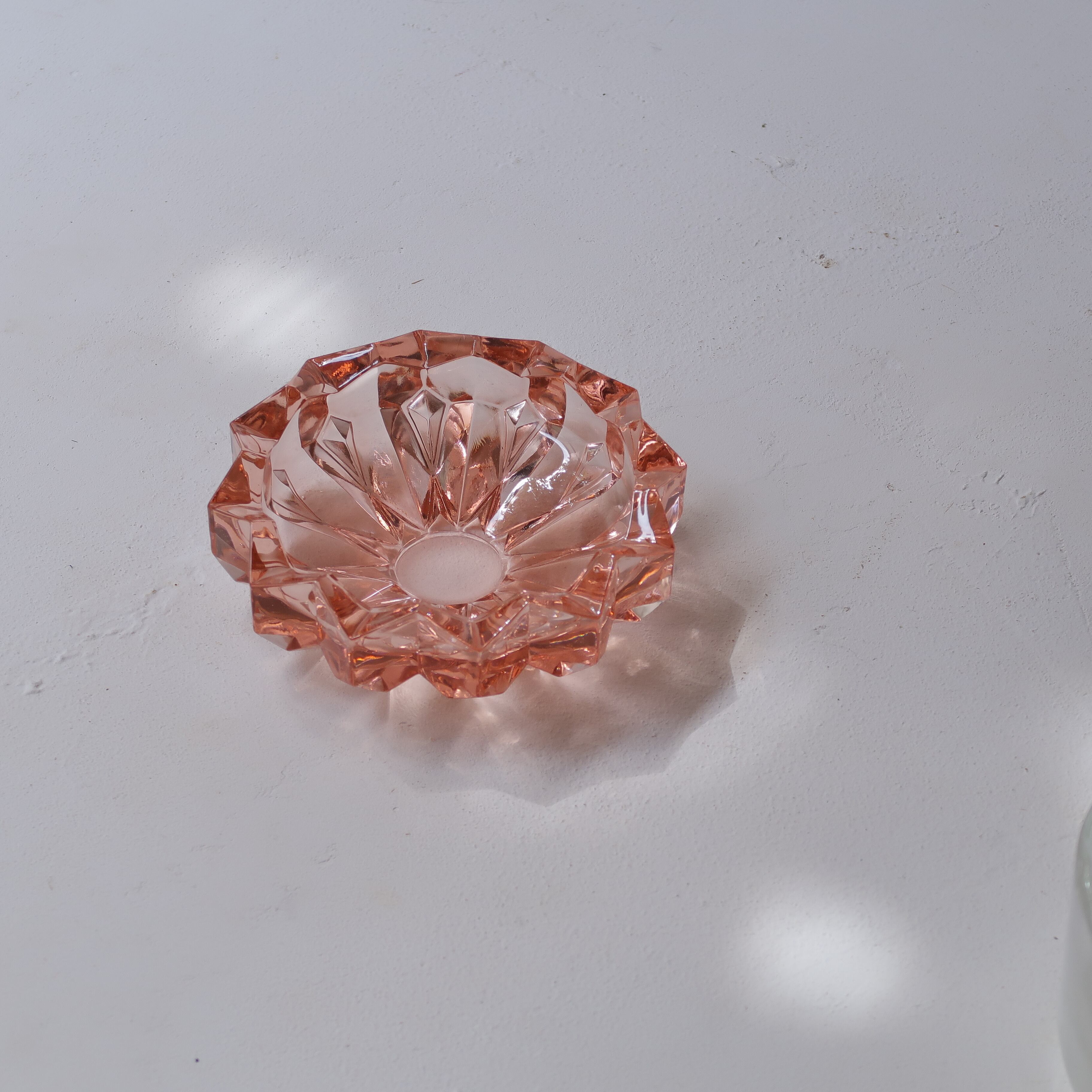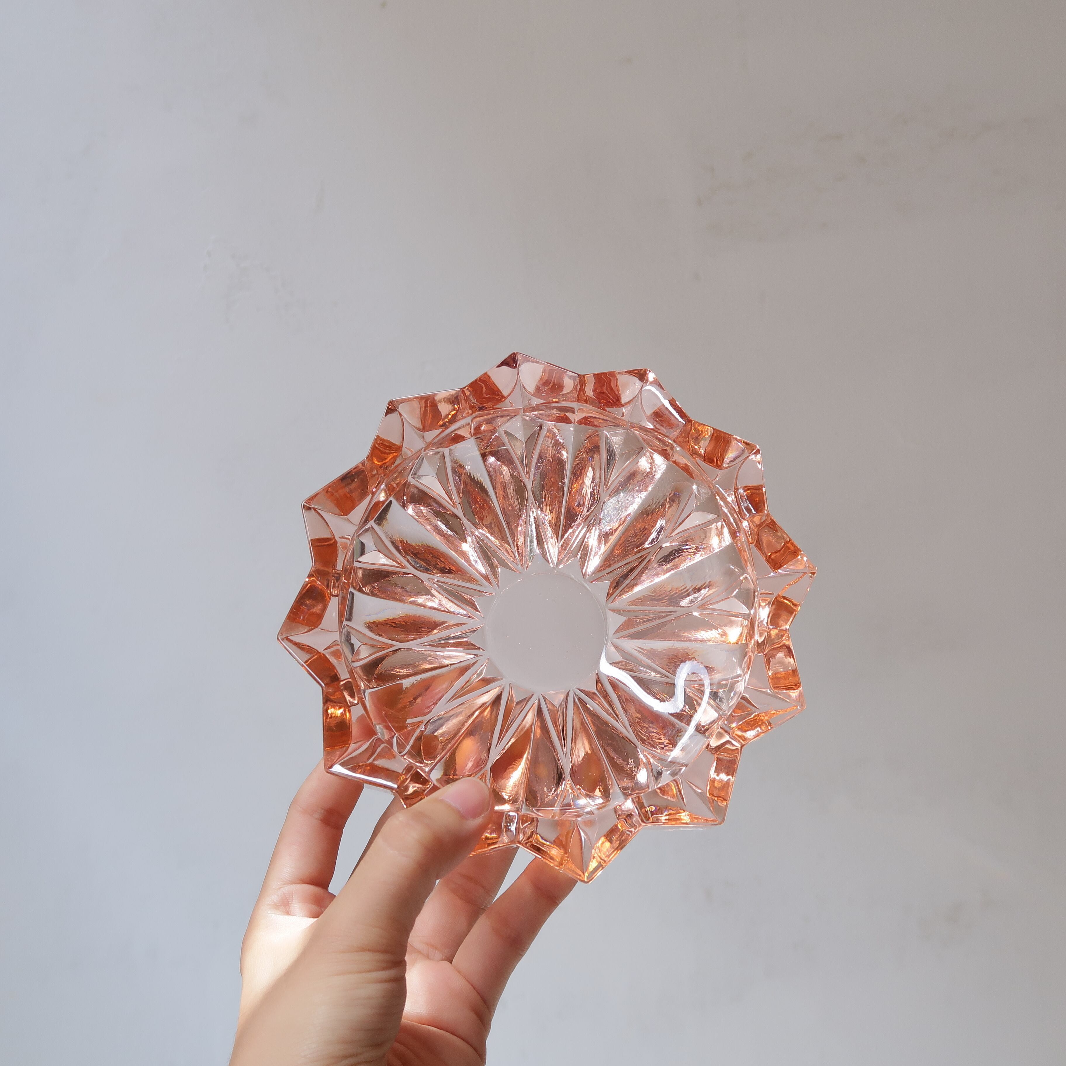 ずしっと重たい、ガラスのジュエリートレイ。ゼラチンでできたゼリーのような色合いと、厚みのあるガラスがかわいい。もとは灰皿で、凸凹した形によってキラキラとしています。アクセサリーを置いておくのに◎