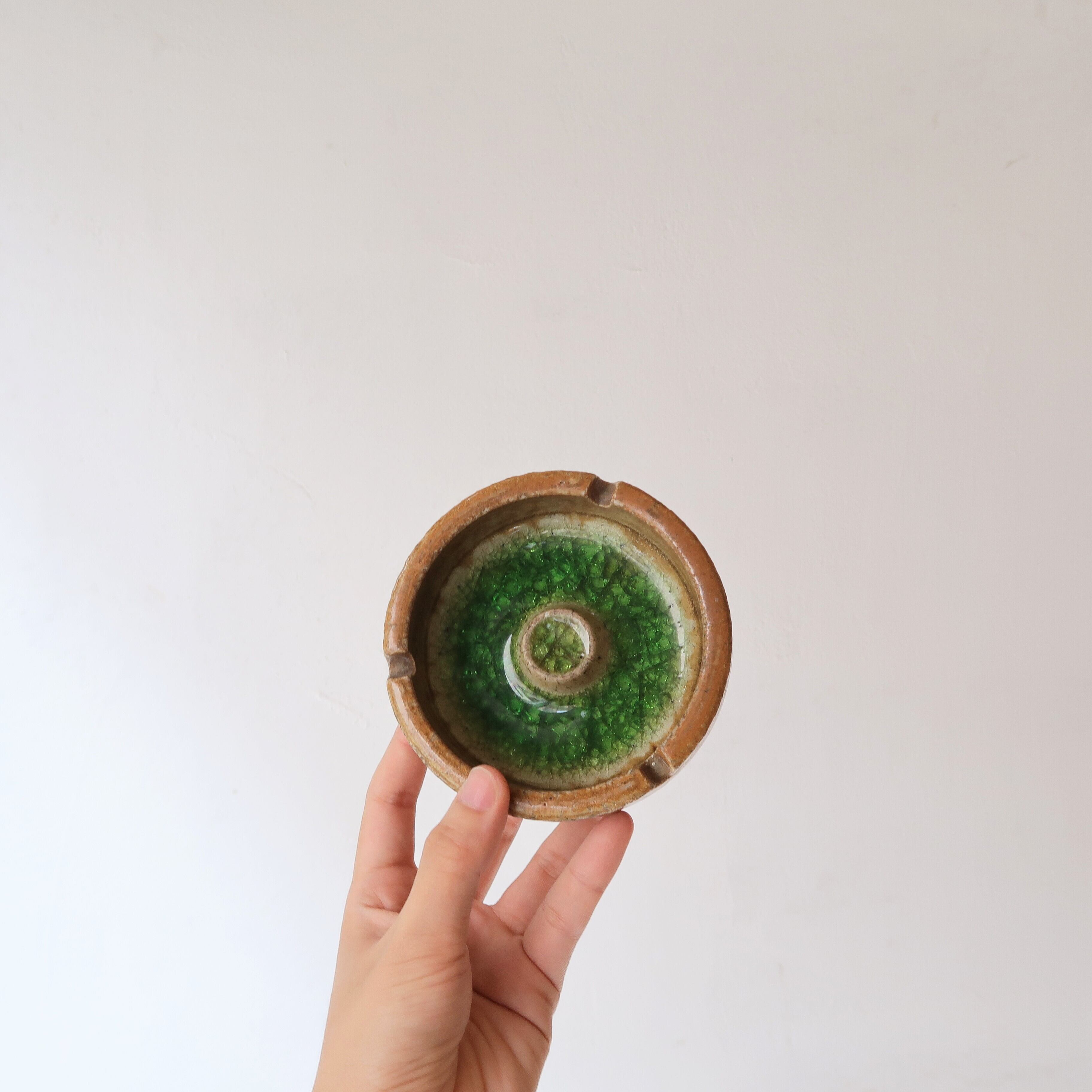 底が見えるくらい透き通っている山奥の湖、みたいなジュエリートレイ。グリーンは木々が映り込んでいるような澄んだ色。きらきらの、元は灰皿です。アクセサリーを置いておくのに◎