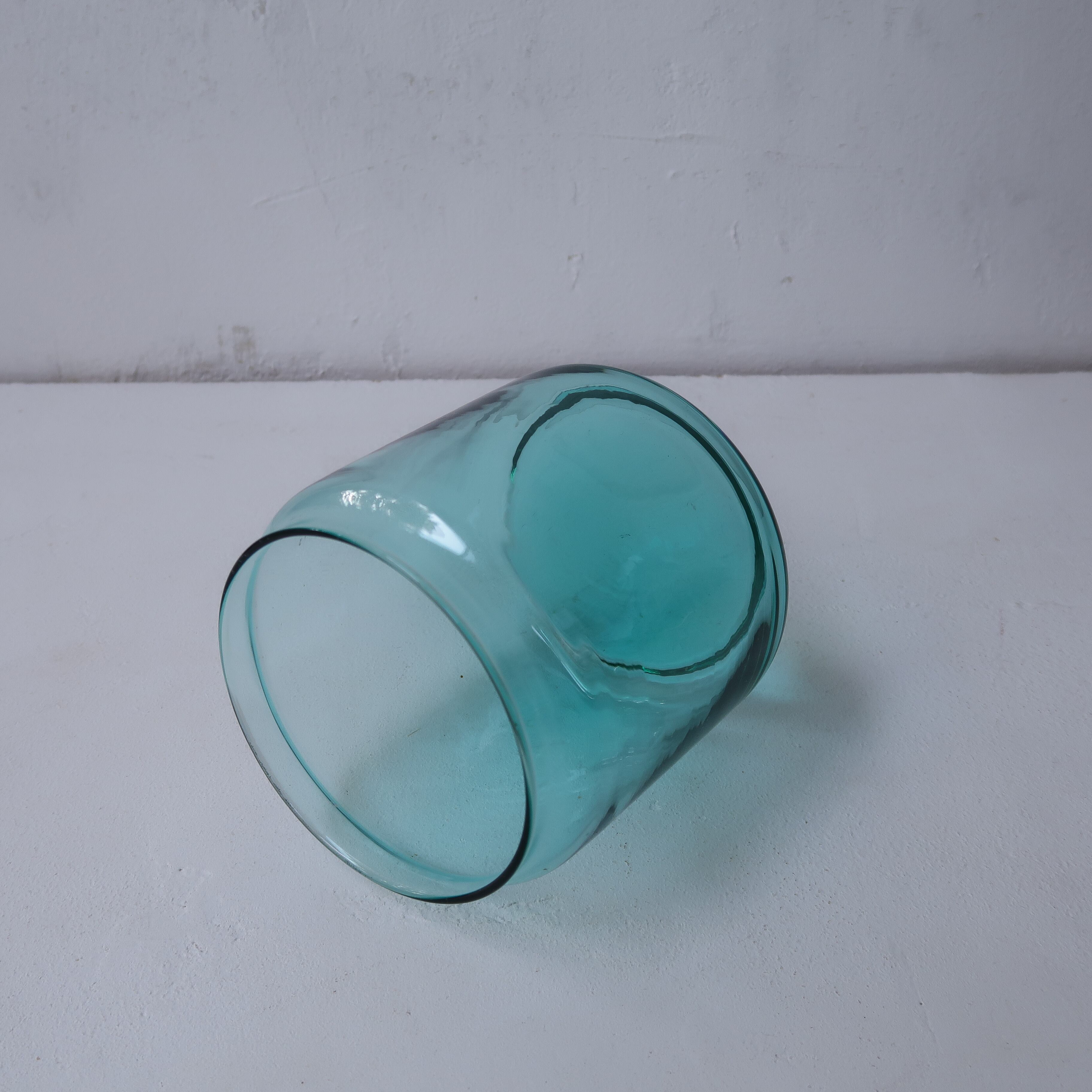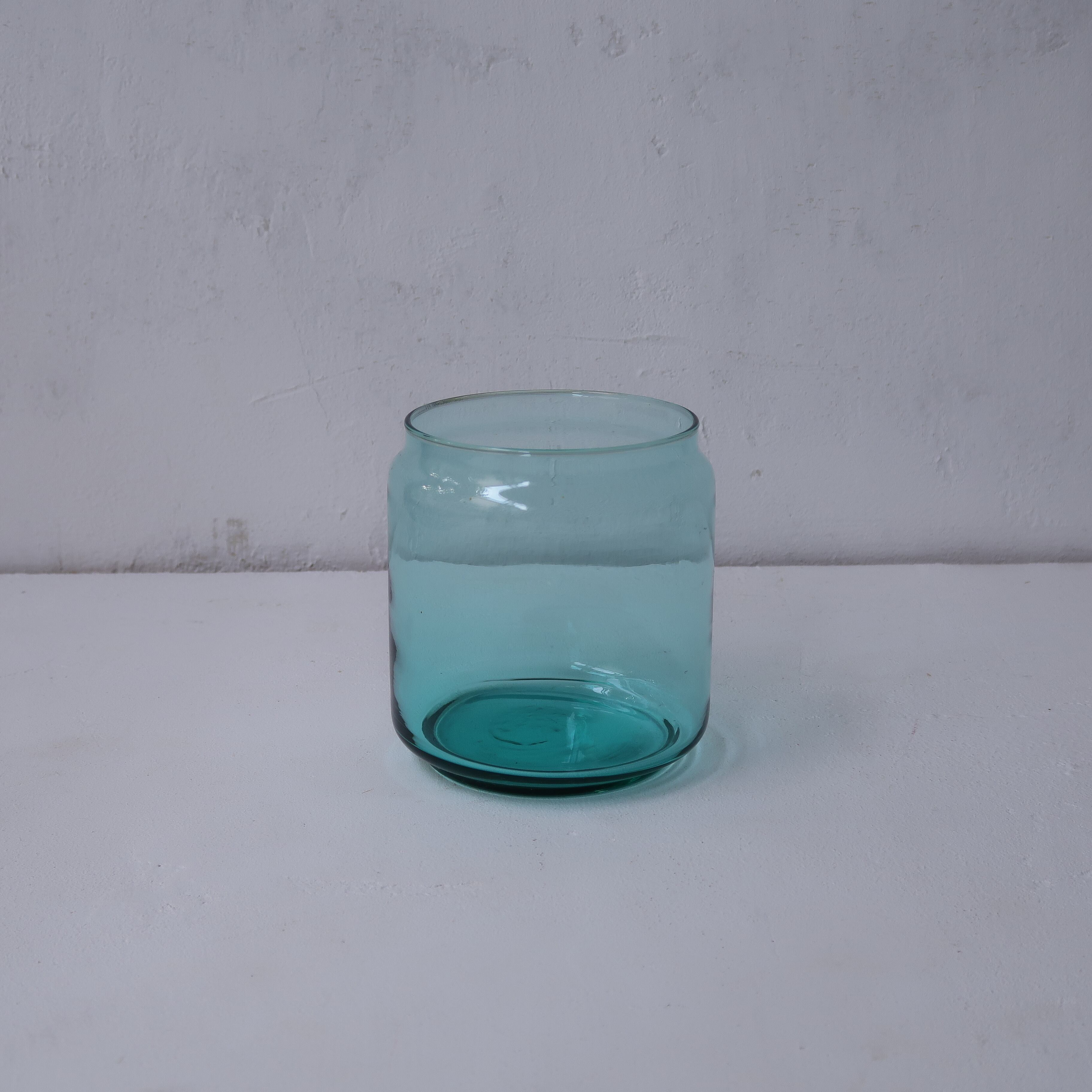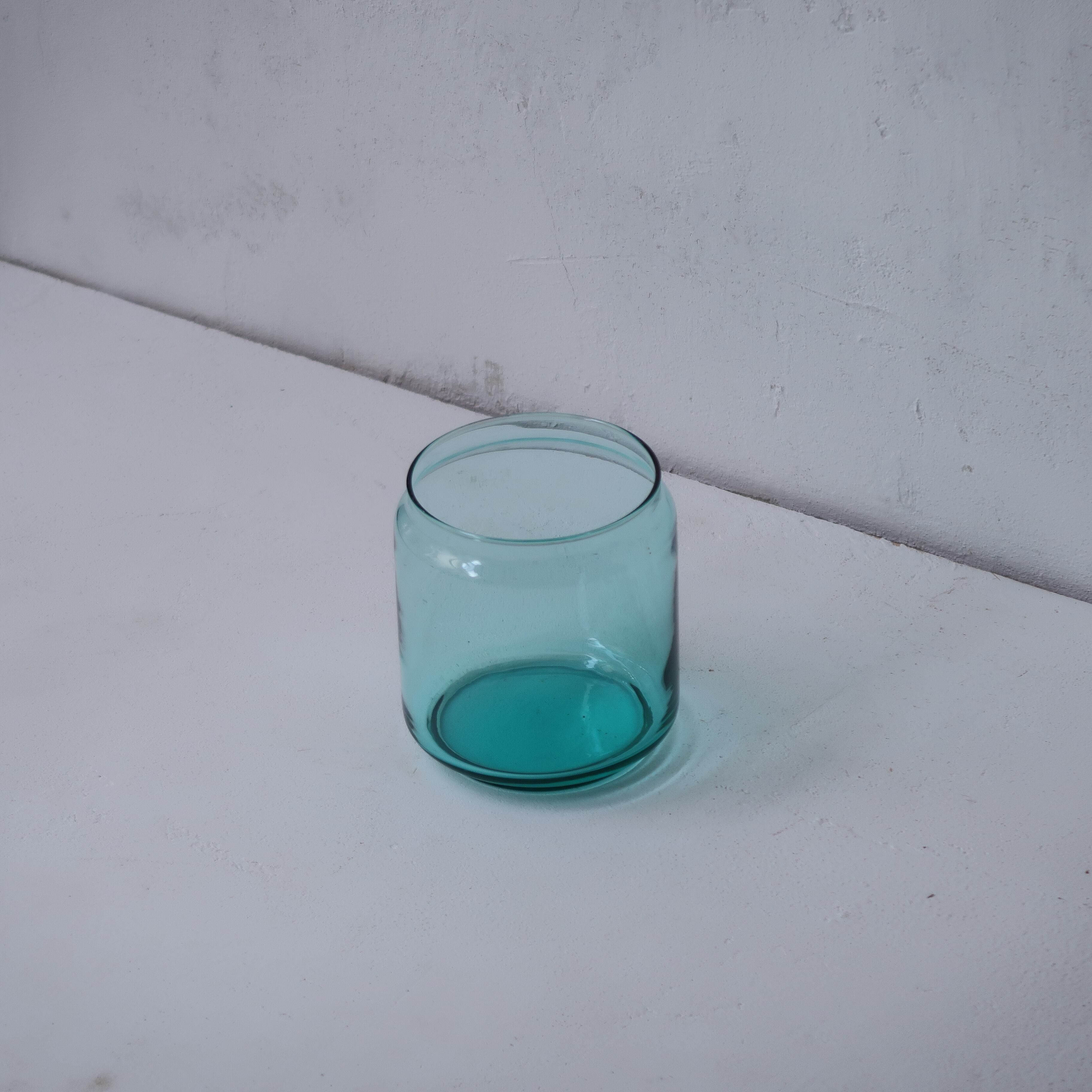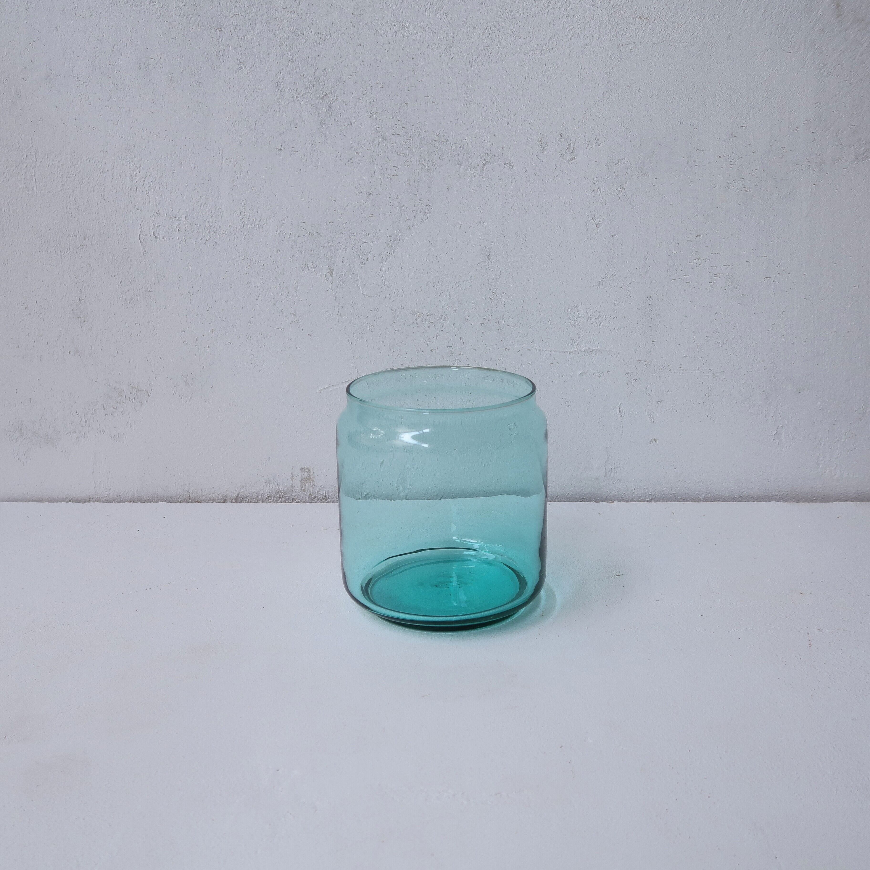 水色とみどりの間のような色合いのガラスの花瓶。正方形のようなフォルムで、なにかの空き瓶なのかな?と思わせるアイテムです。駄菓子とかたくさん詰め込まれていたら、わくわくする。すこし低めの花瓶としても、お使いいただけます。