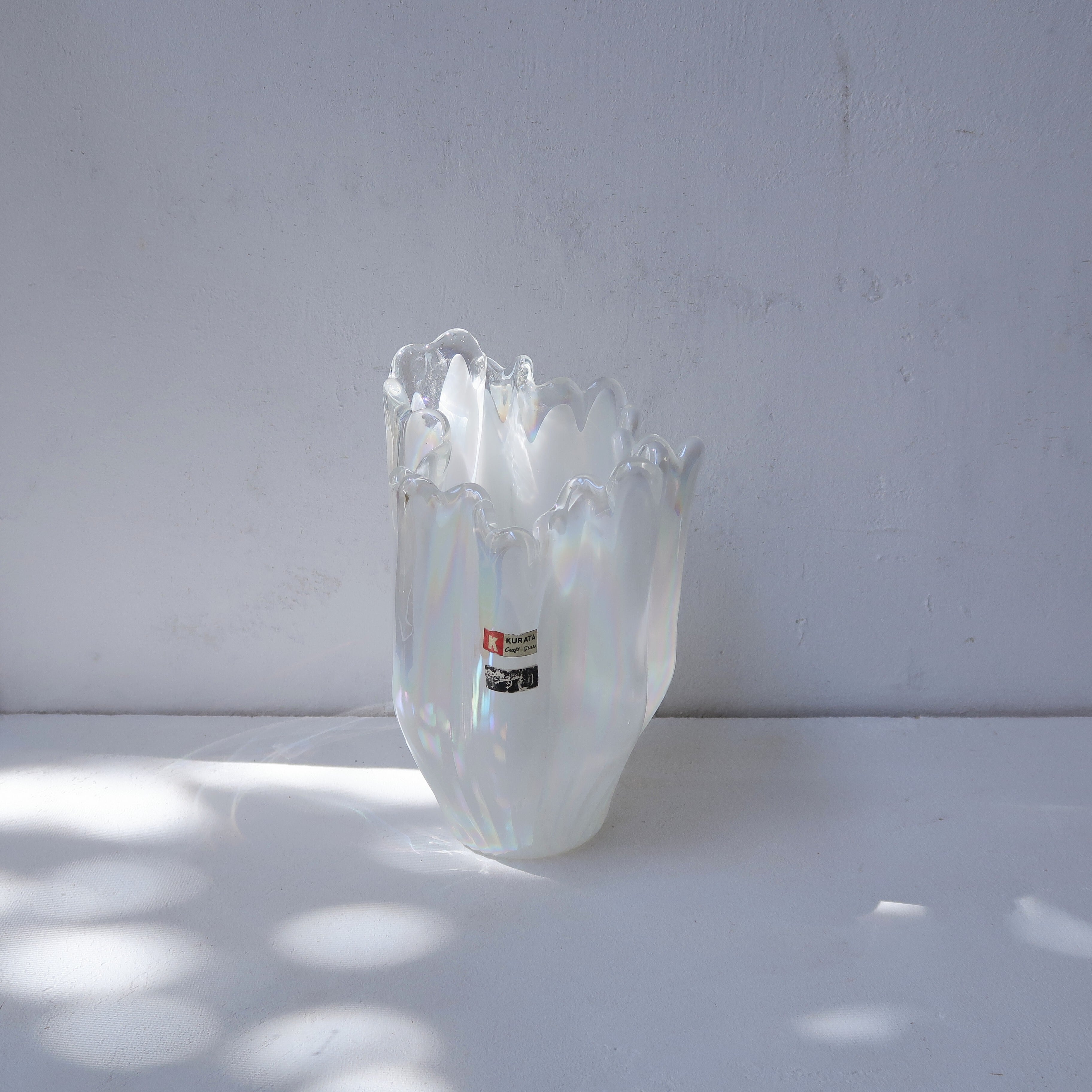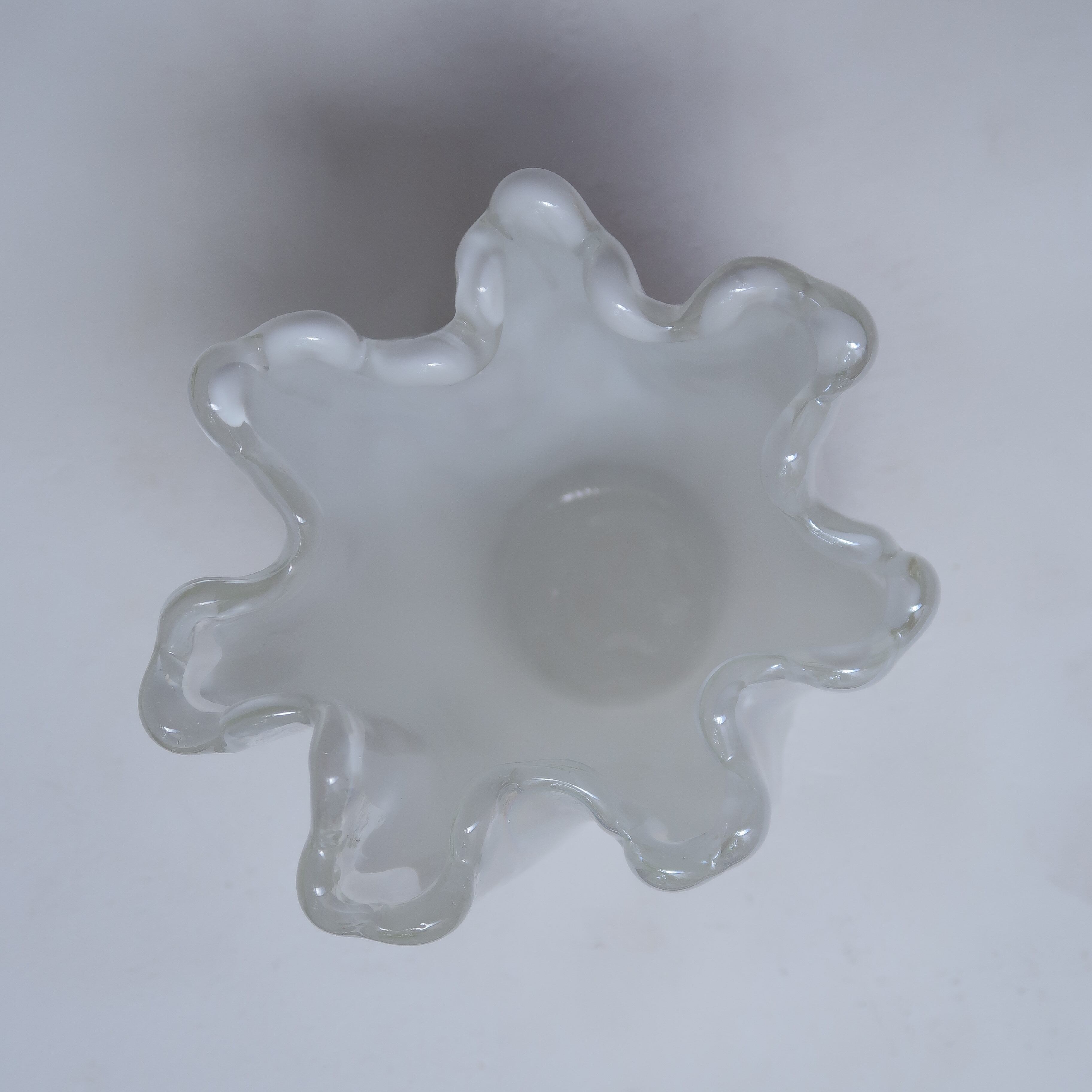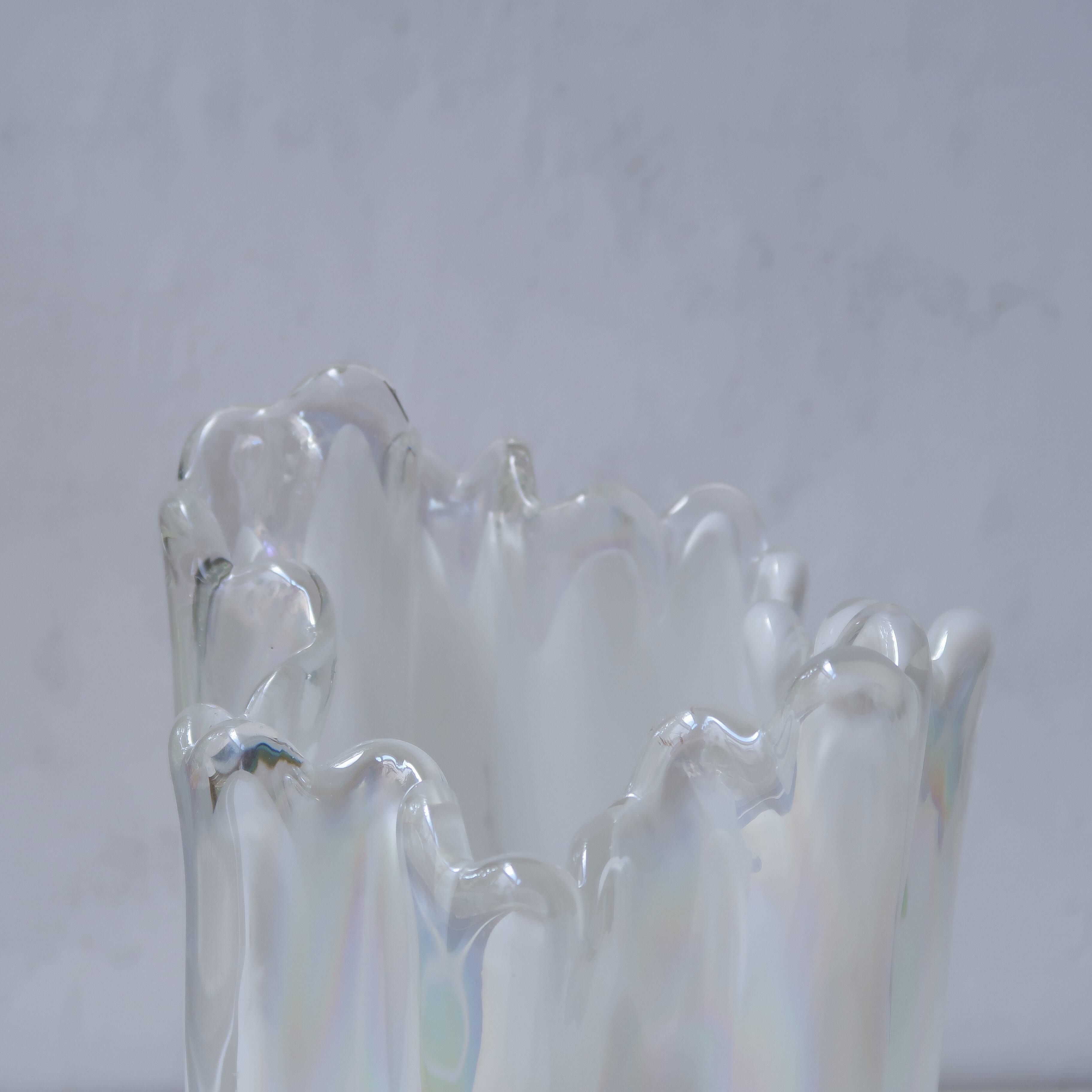 今回のアイテムは、ひと回り小ぶりのタイプ。かたちとしてはすらっとしており、ひらひらが比較的細やかなで、氷柱のような印象があります。真っ白かと思いきや、ふちの部分をよく見ると、とうめいのガラスがかかっており、透明感があります。