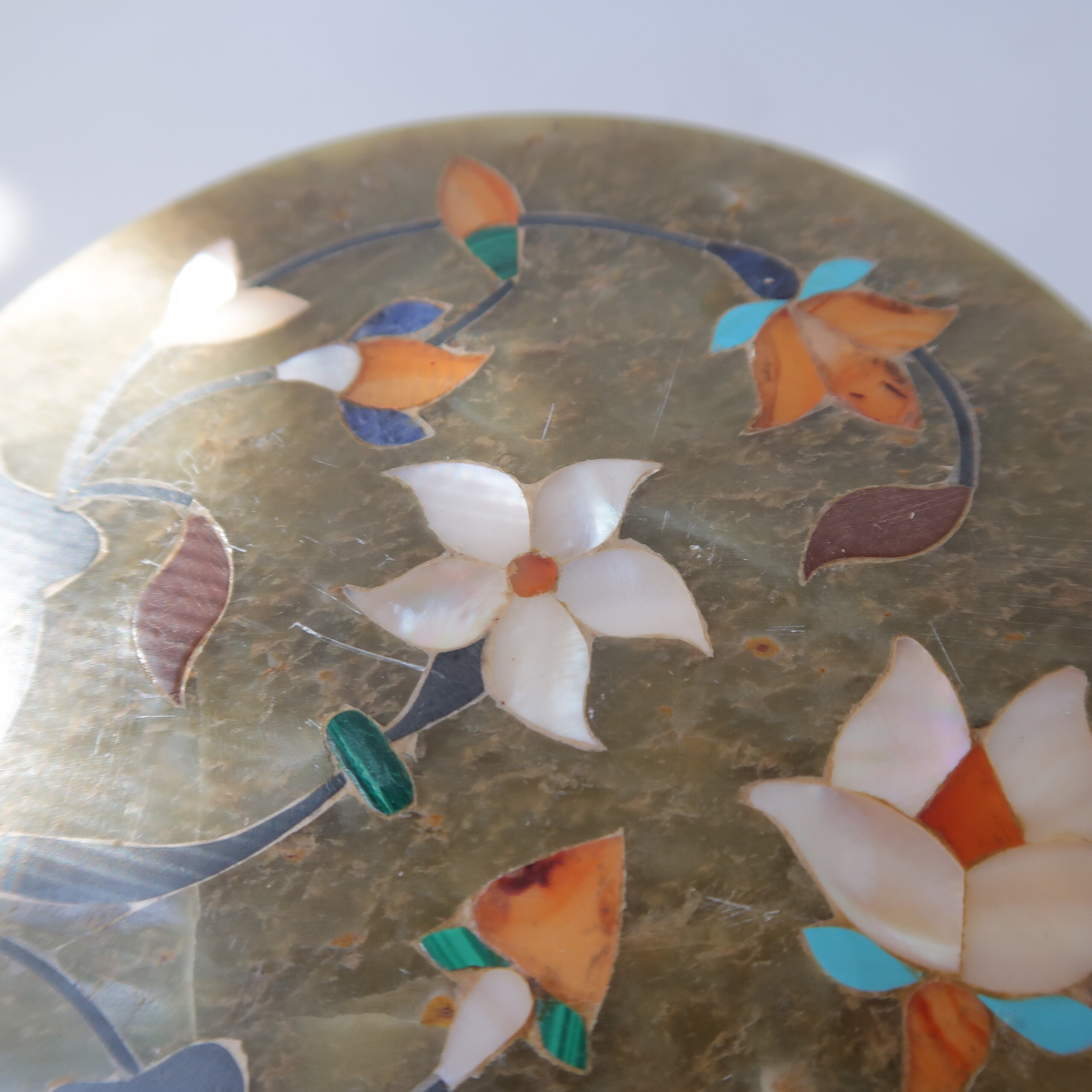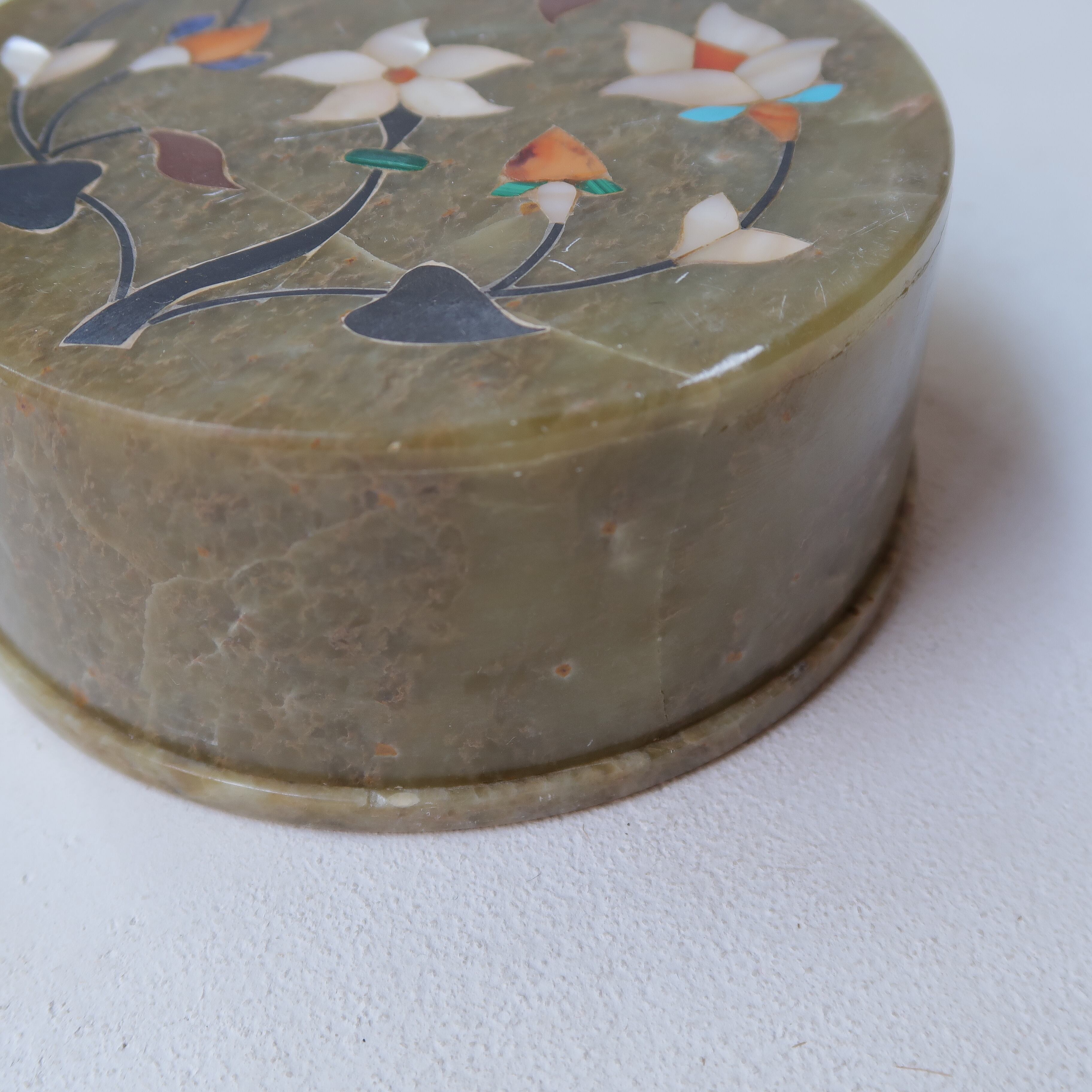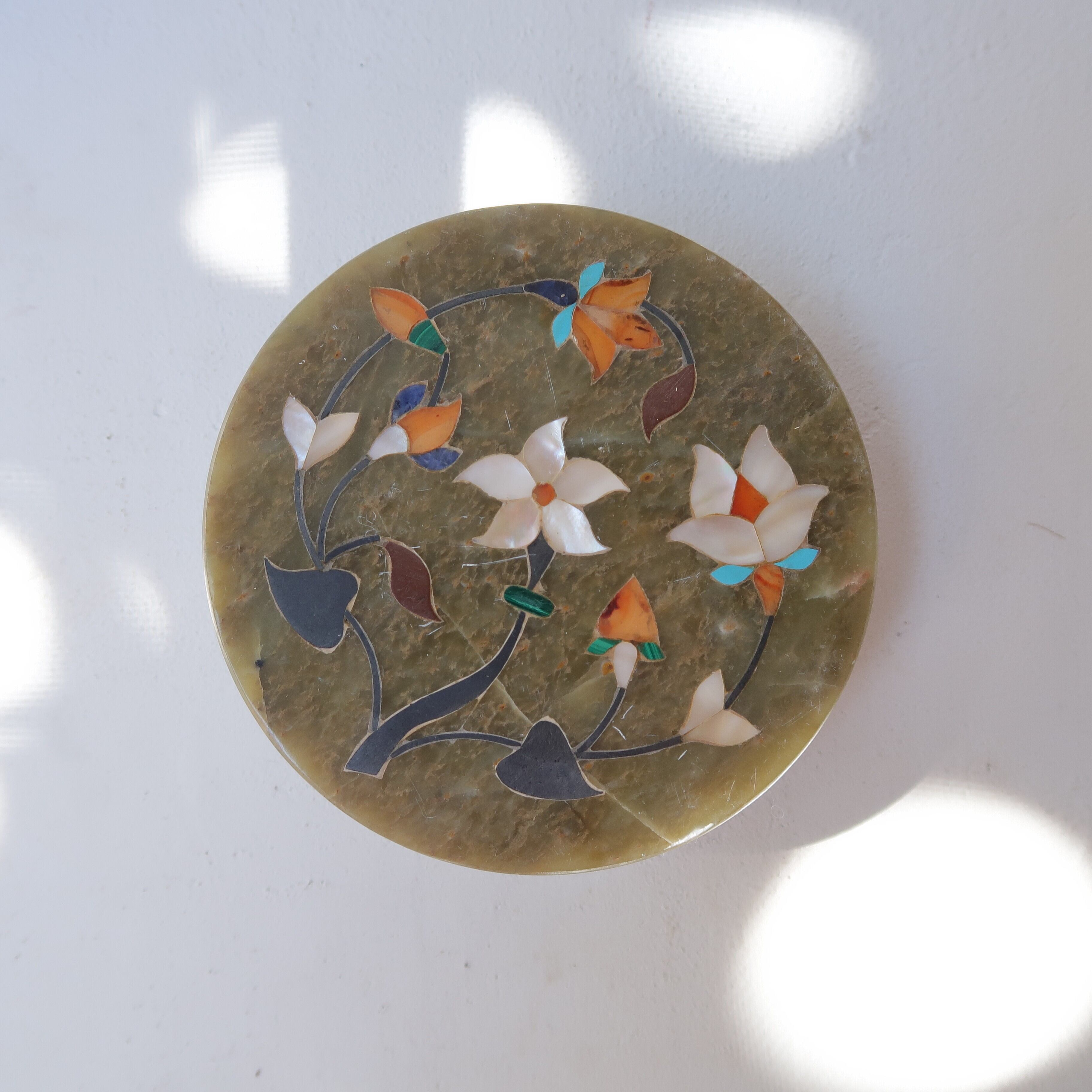 お花の象嵌がほどこされたジュエリーケース。かぶせるタイプのふたがついたもので、閉めるときにスーッと沈んでいくのがたのしい。