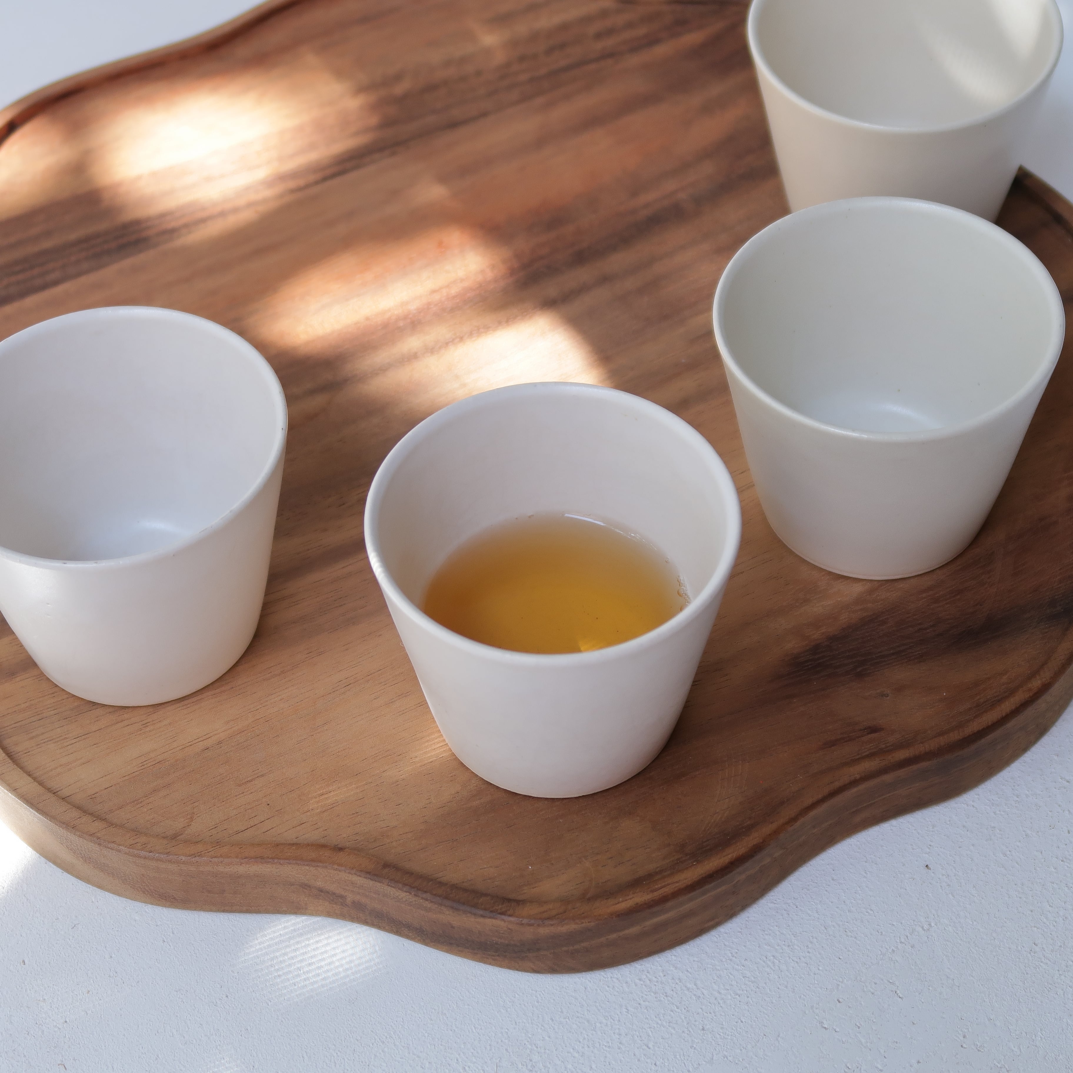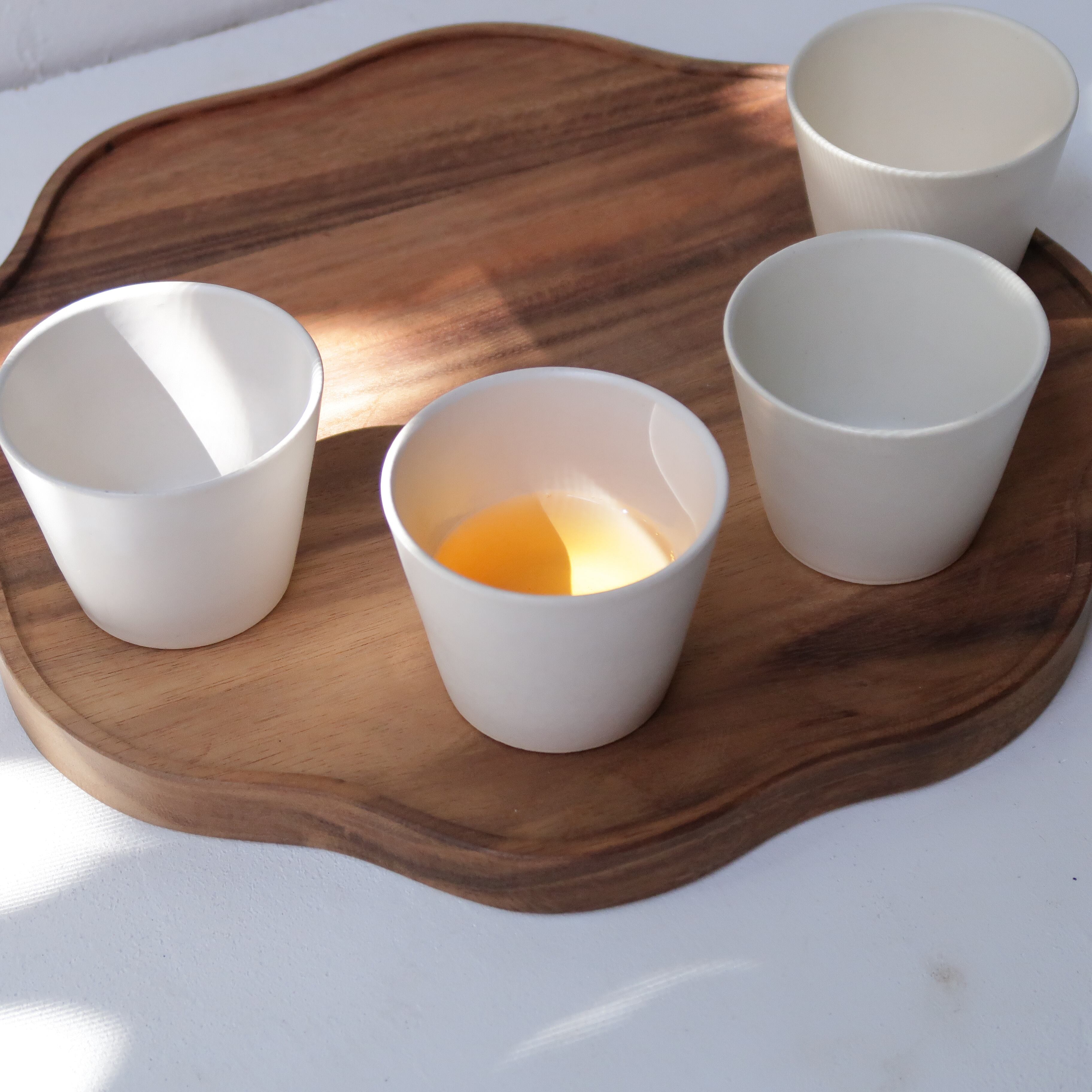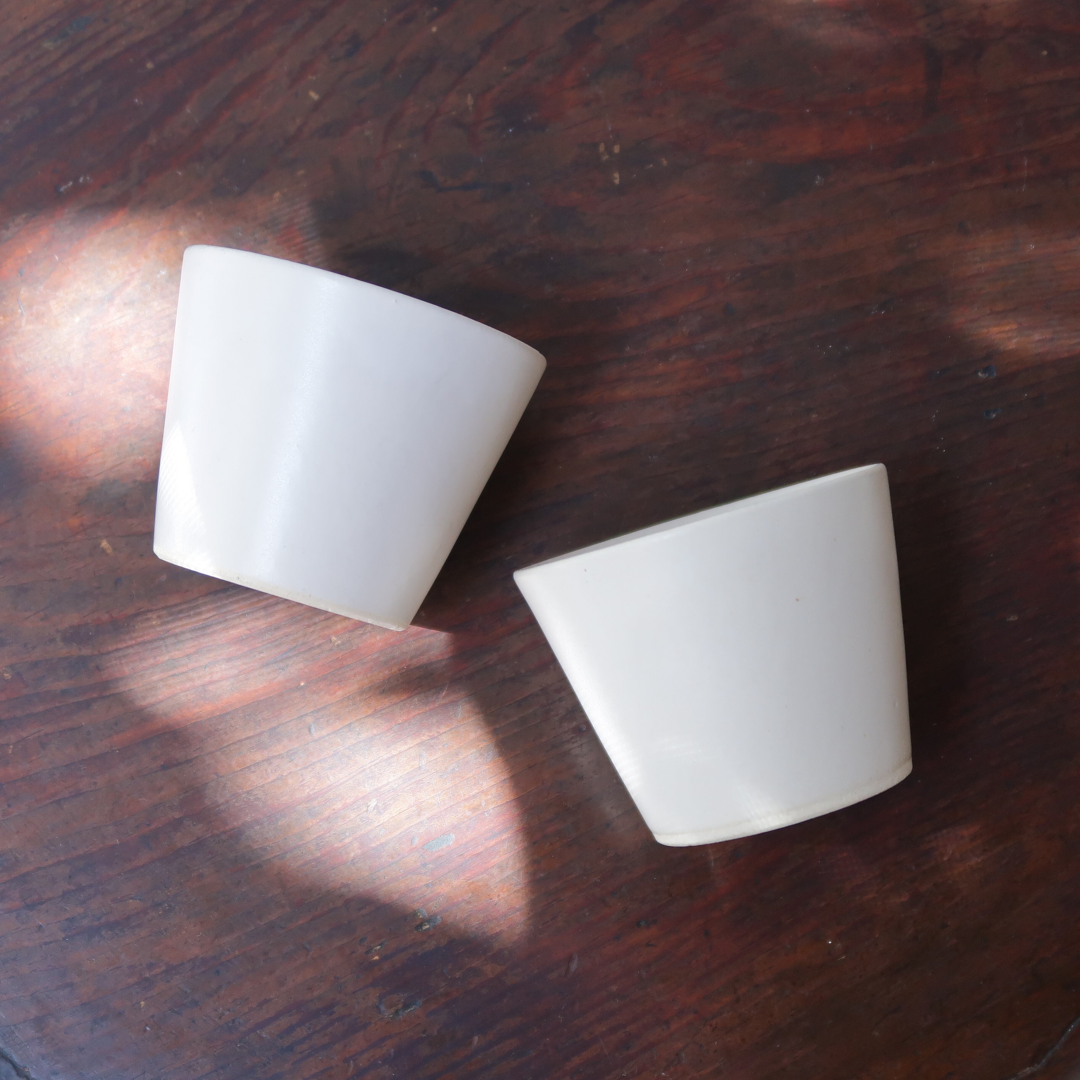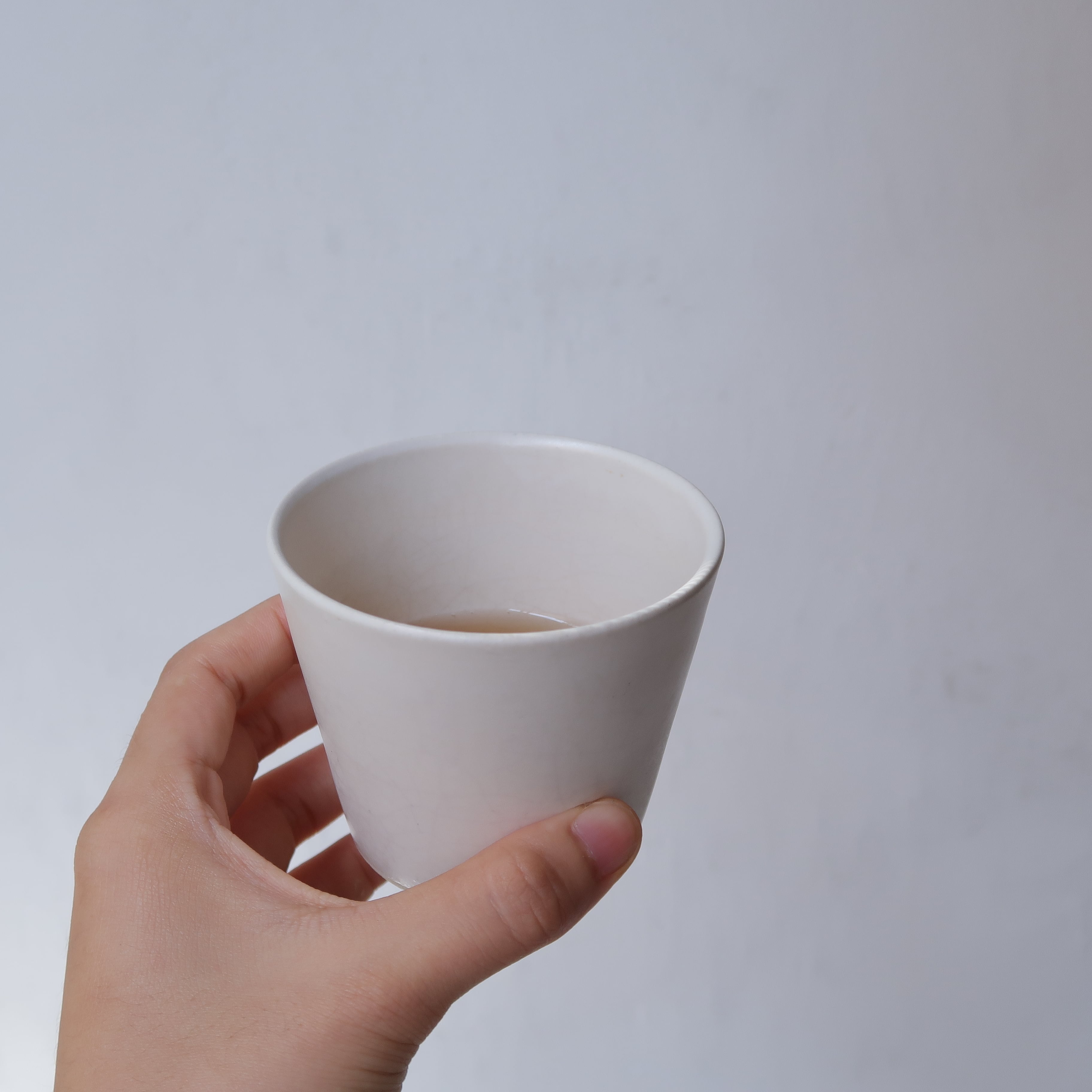 反対向きの台形のような、シンプルなフォルム。マットな質感に、少しだけピンクがかったような白い湯呑みです。シンプルながらも、表面や内側の貫入がいい味を出してます。