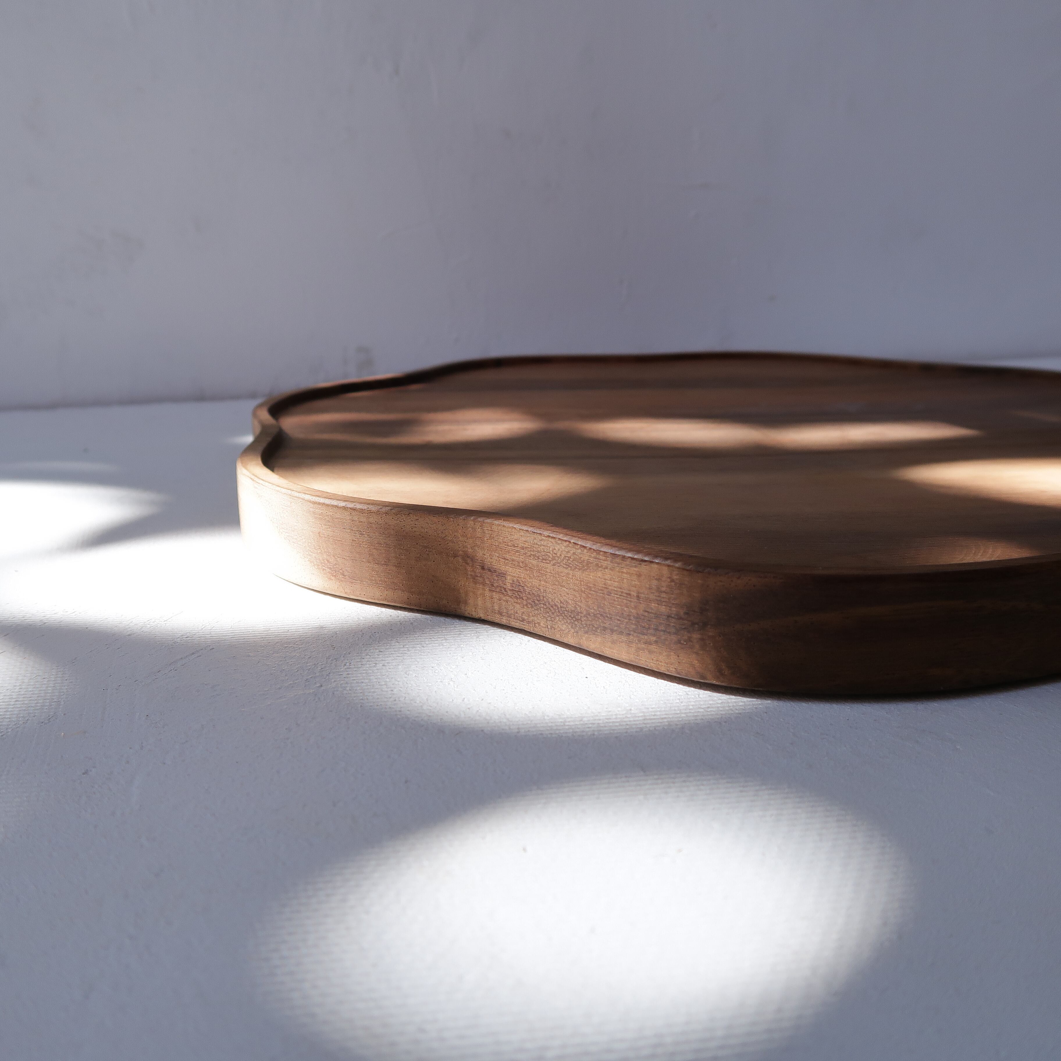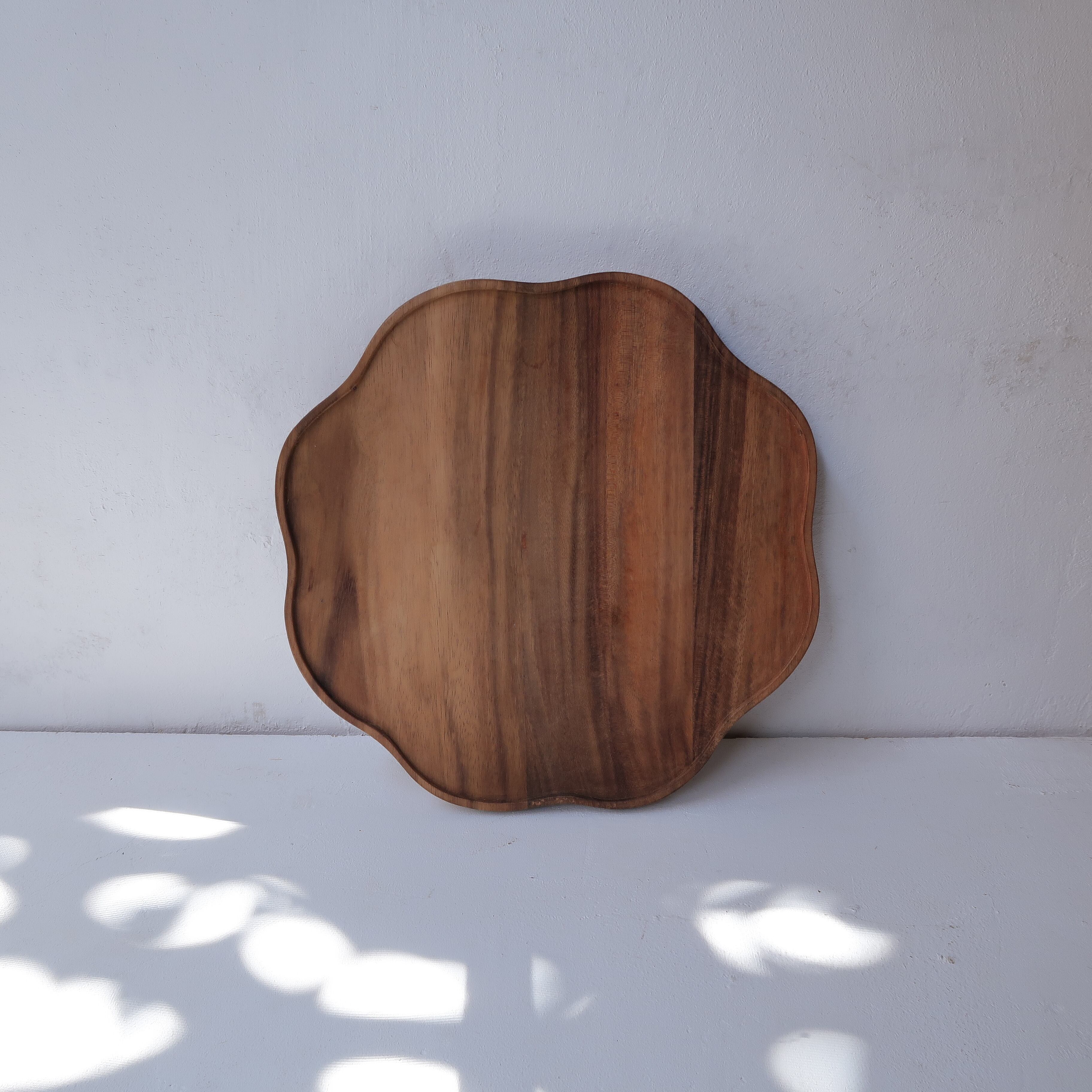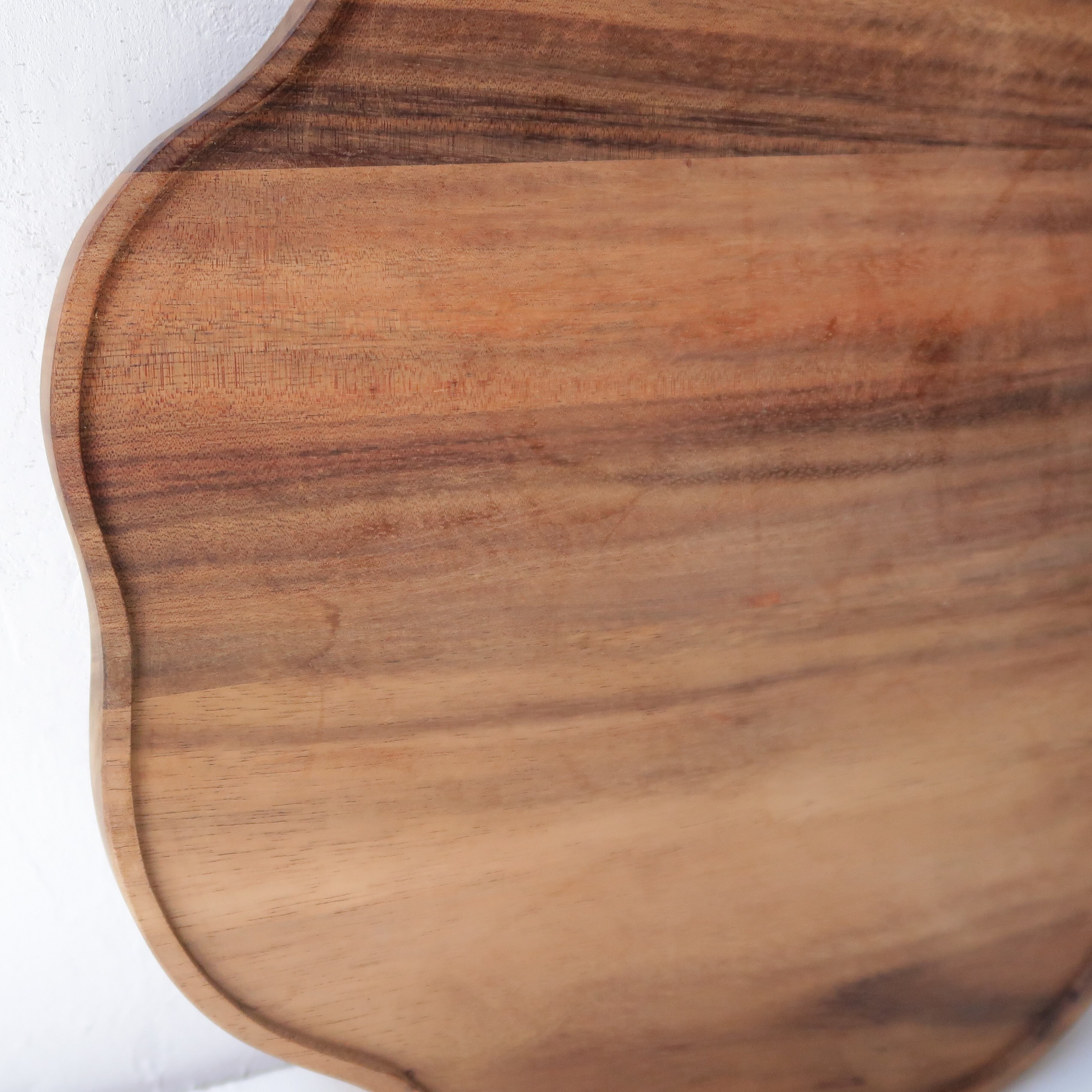 なみなみとしたお花型がかわいい木製のトレイ。厚みがあるぶん、少し重みもありますが、立体的なフォルムがディスプレイにも効いてきます。木目を縦に使っても、横に使っても。ティータイムや、1人分のお食事のトレイとしてなど、活躍してくれそうです。
