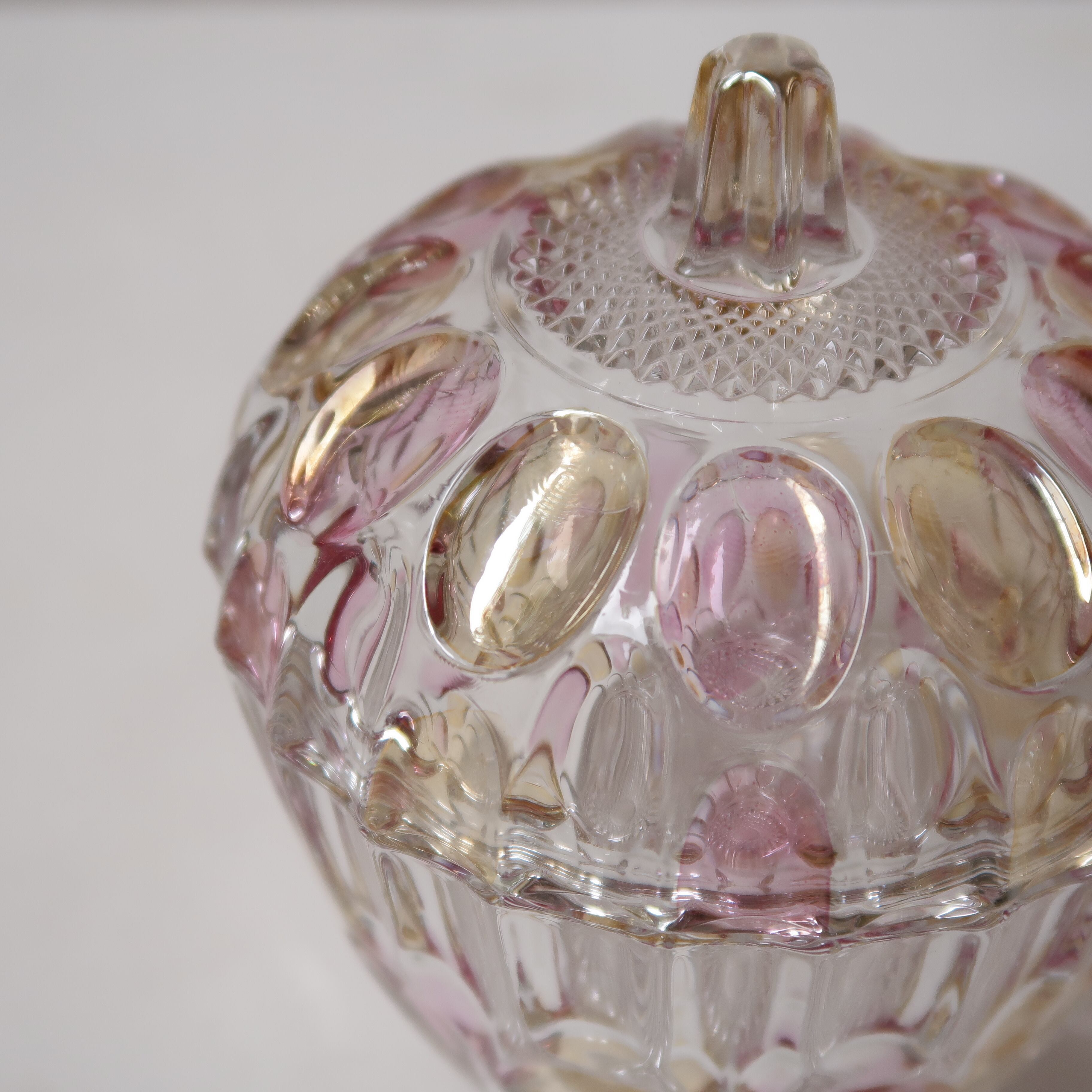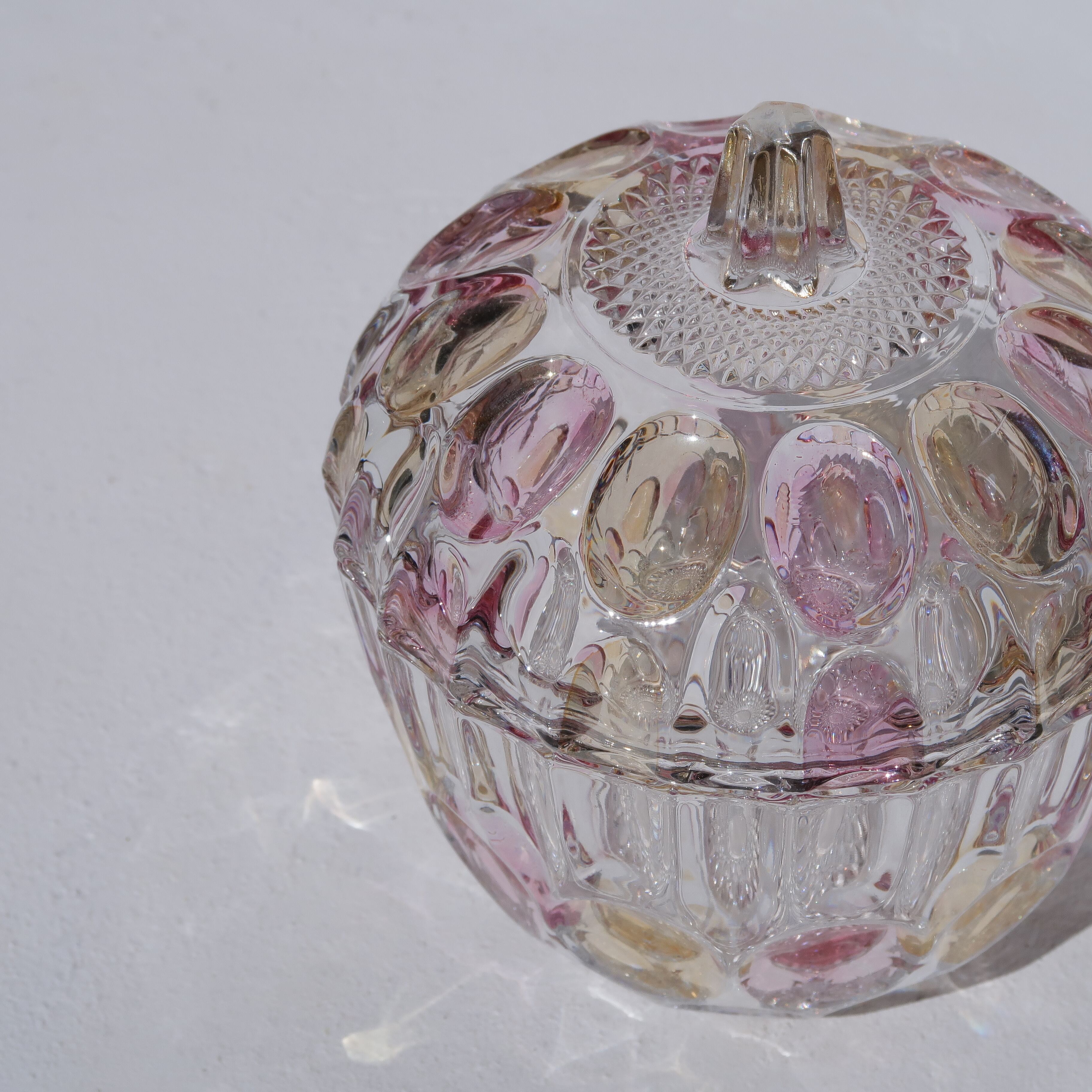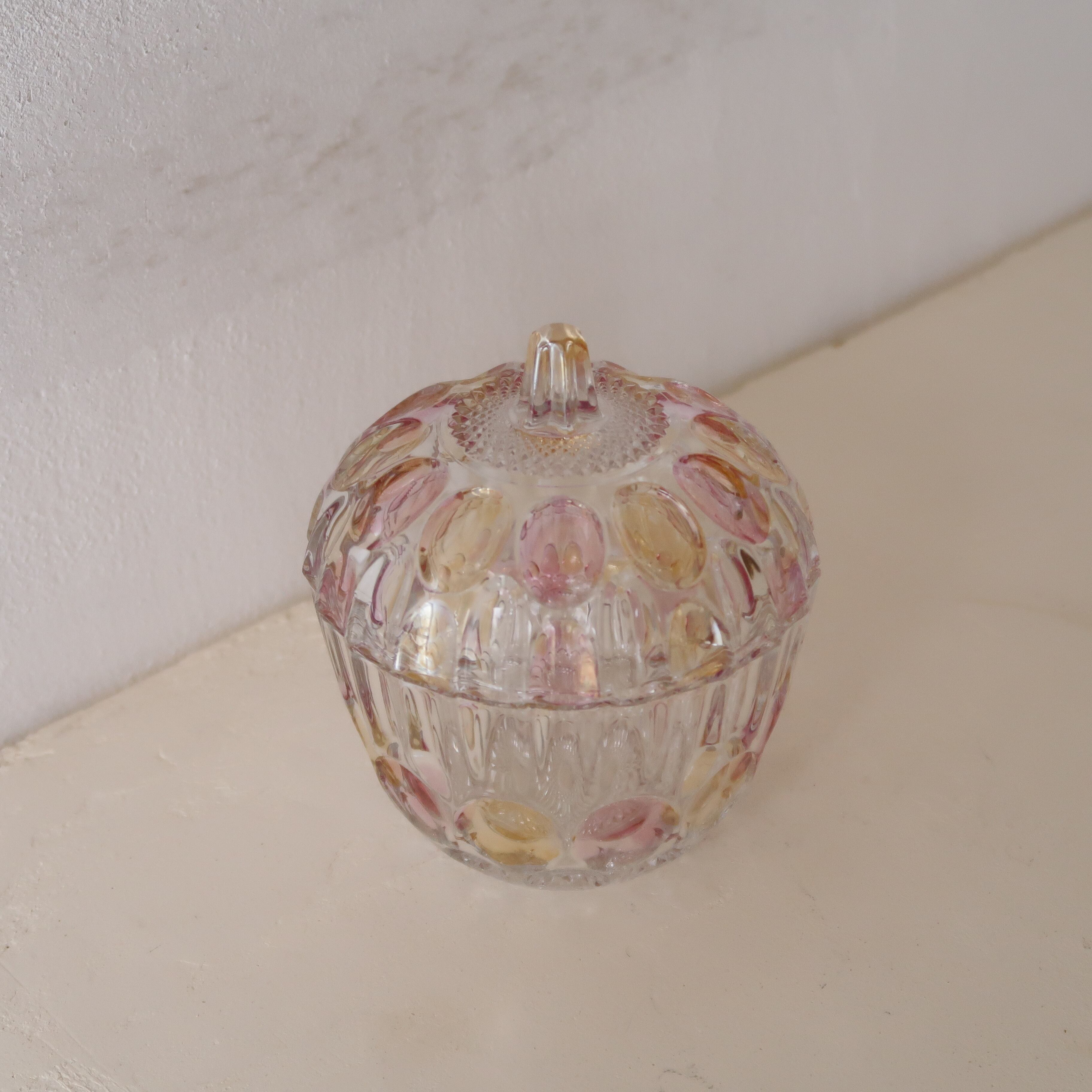淡いピンクとオレンジがきらきらしているジュエリーボックス。丸いくぼみに、ピンクやオレンジのカラーがほどこされています。光に当たるときらっきら。お気に入りのジュエリーを入れておくのに◎