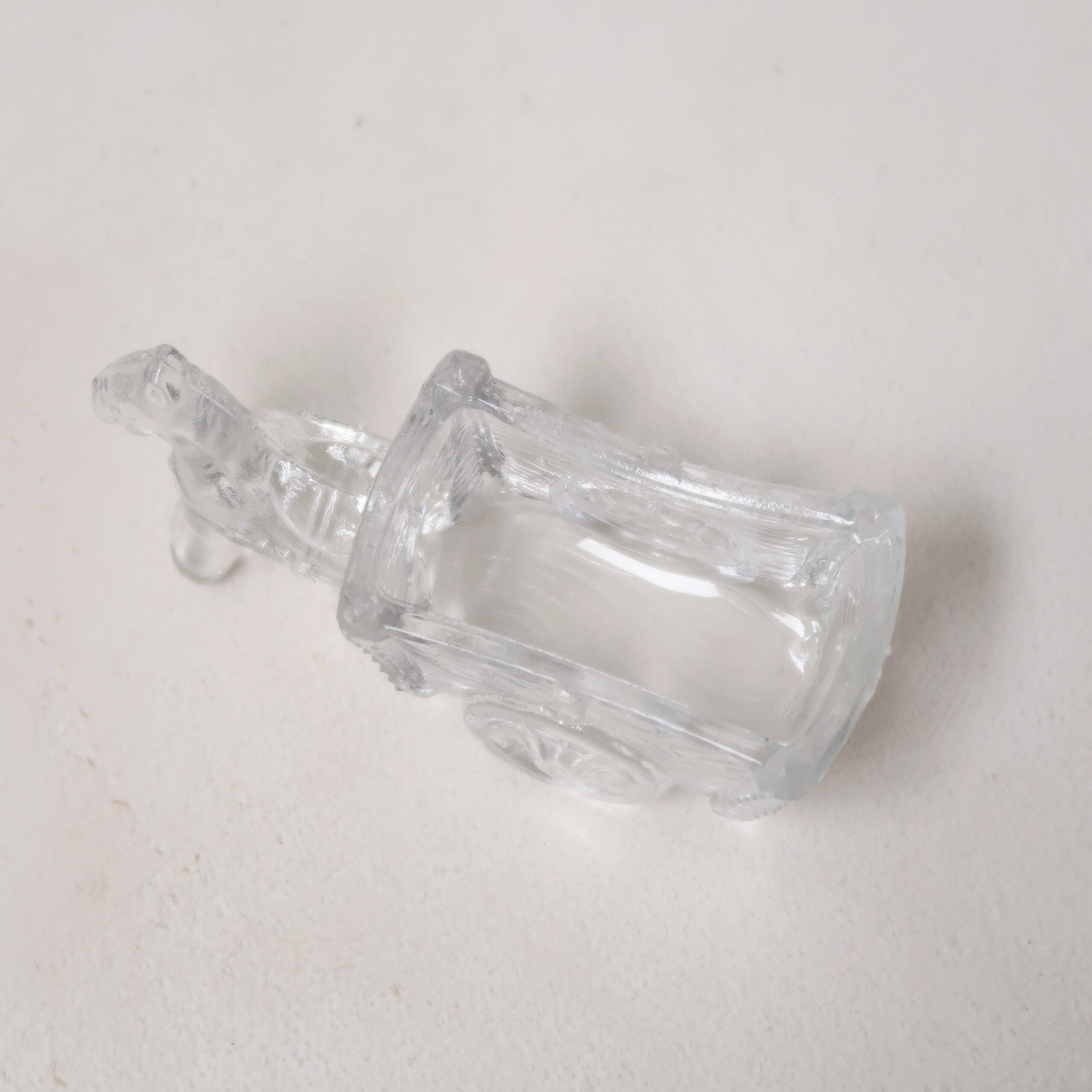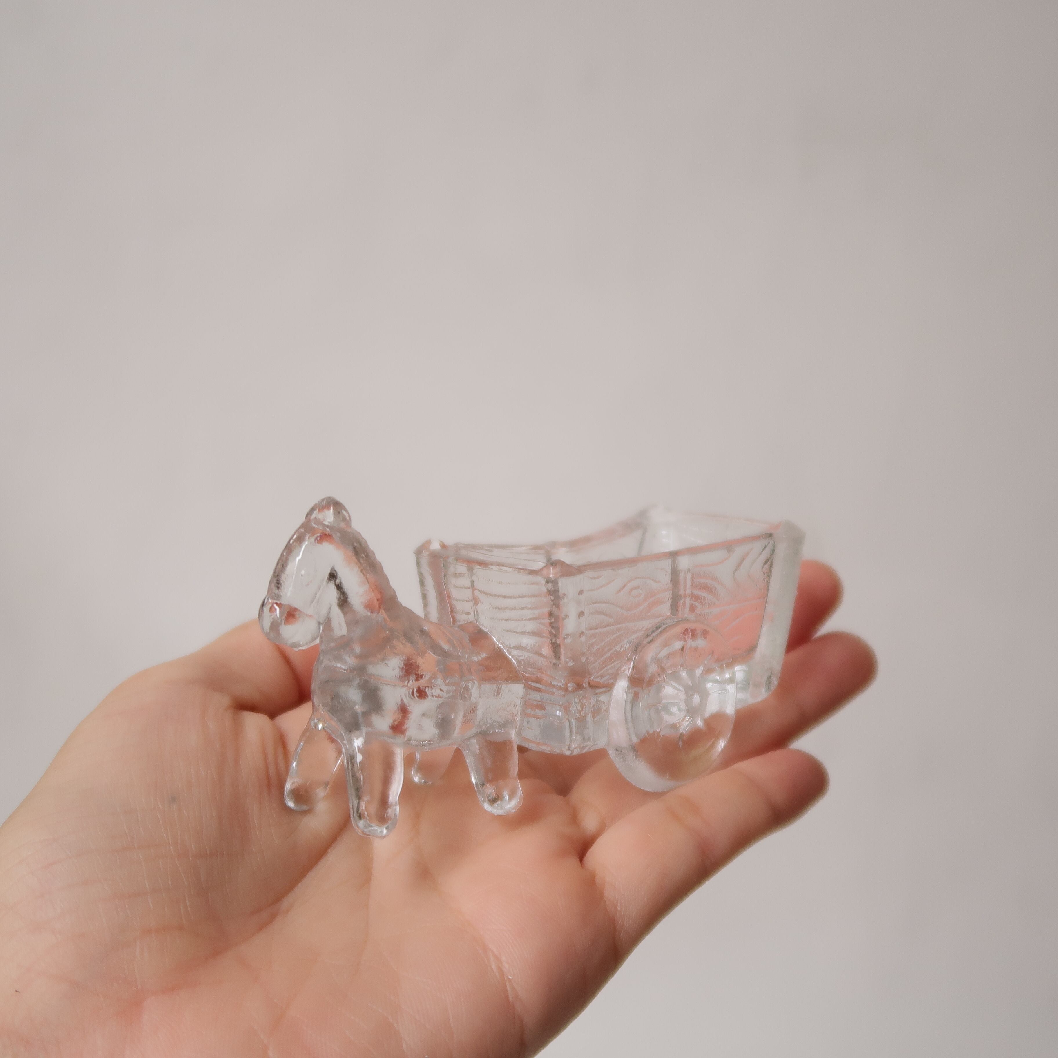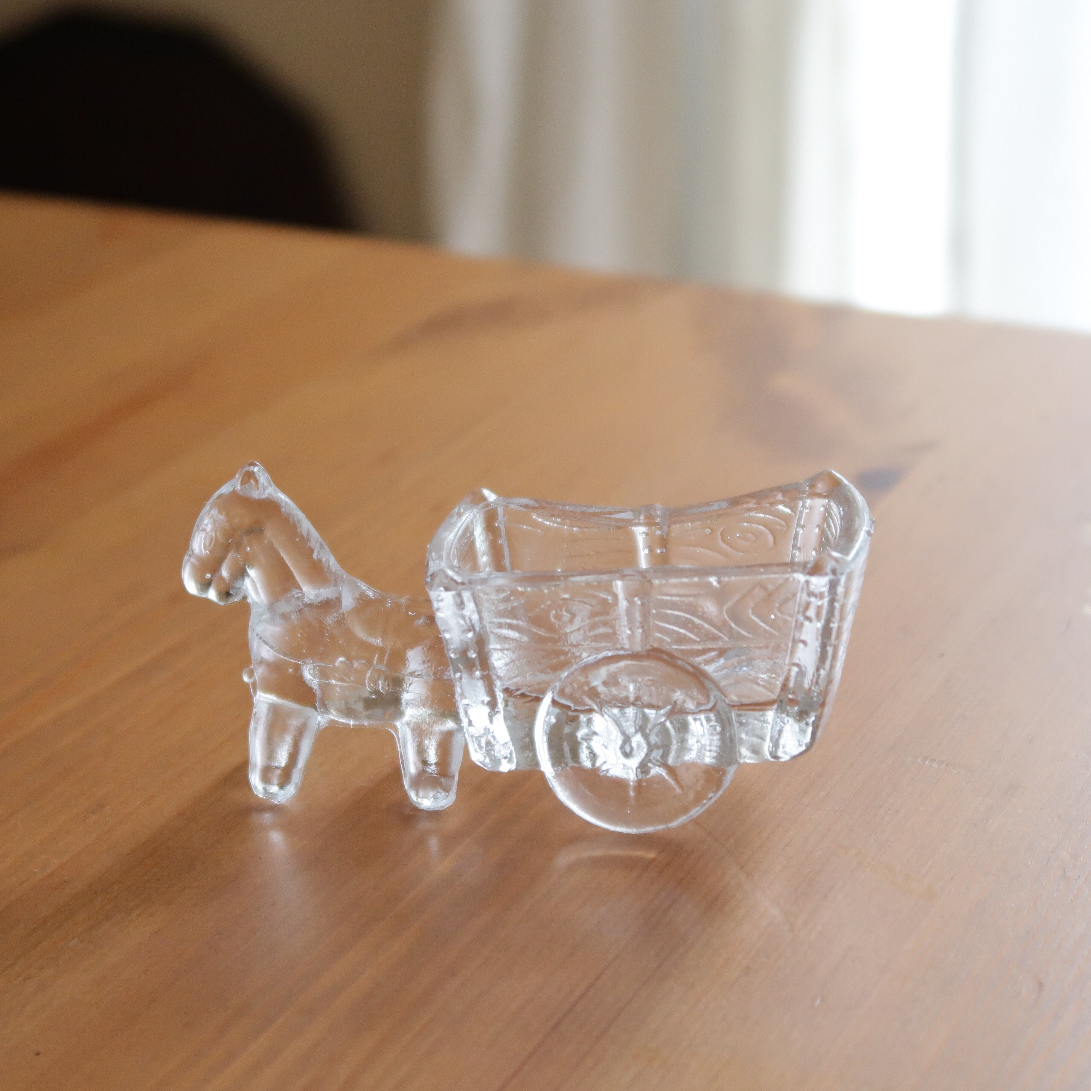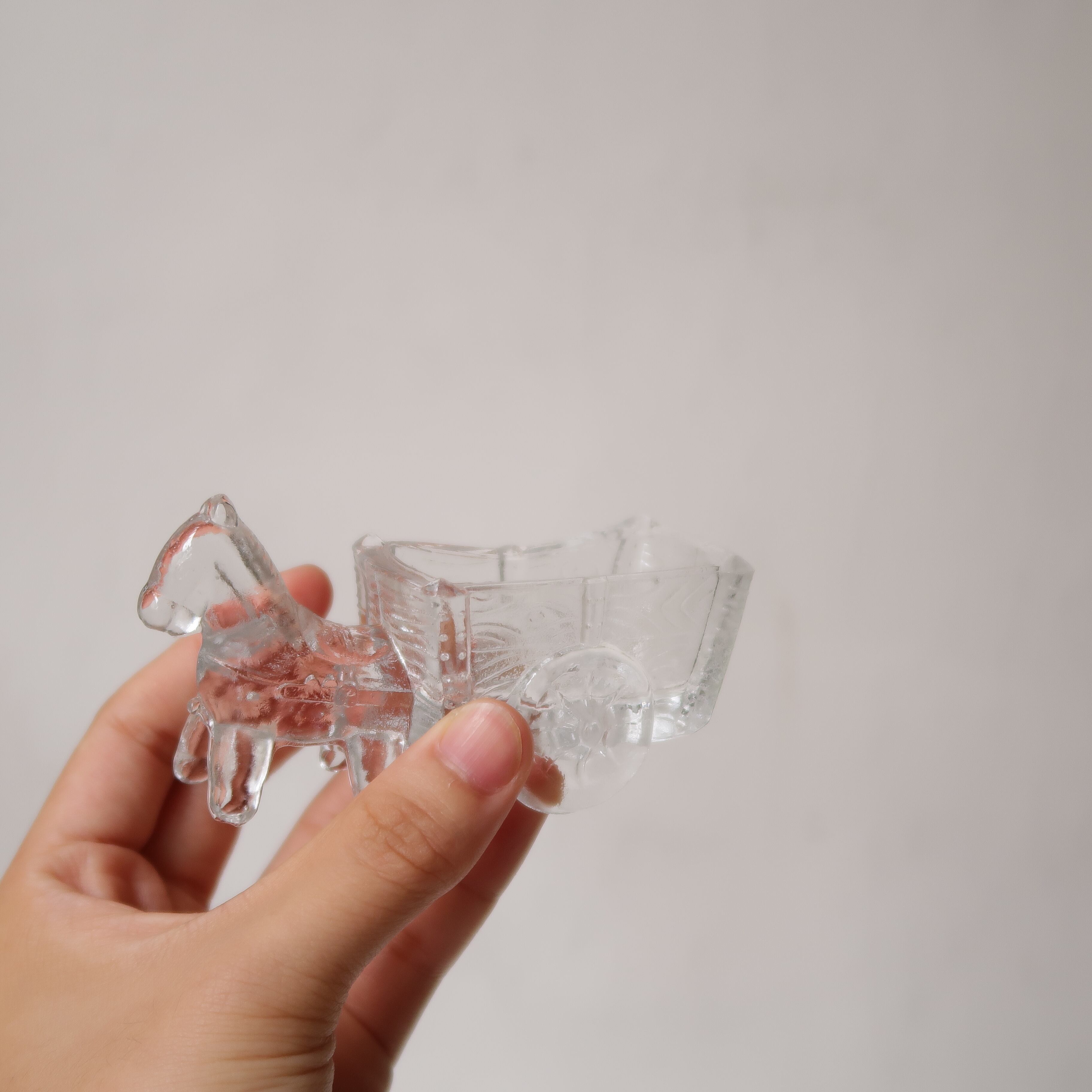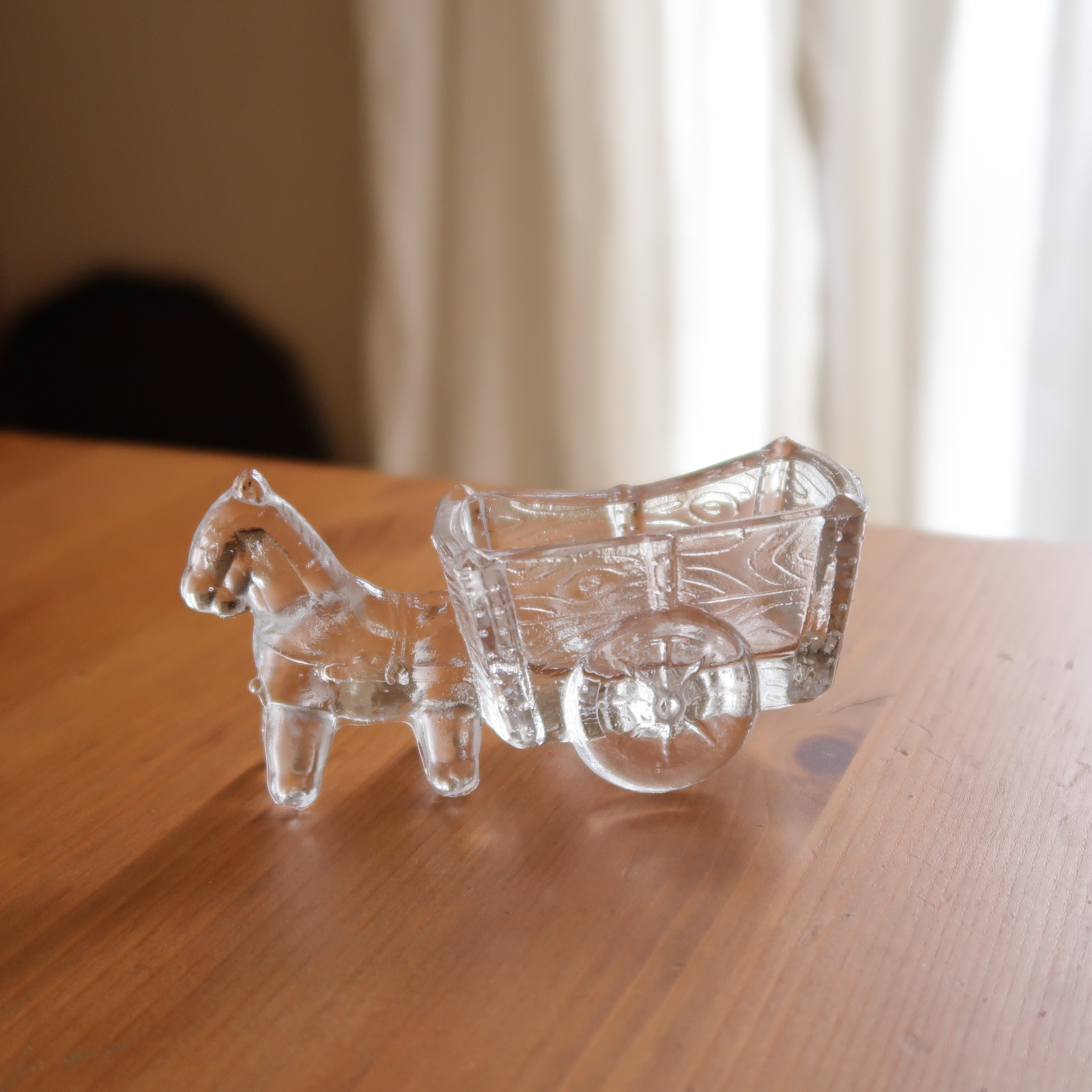 こんなキュートな物が!と驚いた、ガラスの馬車のジュエリートレイ。よく見ると、かごには木目が、車輪やお馬さんのお顔など、忠実に再現されています。アクセサリーを入れて飾っておいたら、とても愛らしい。