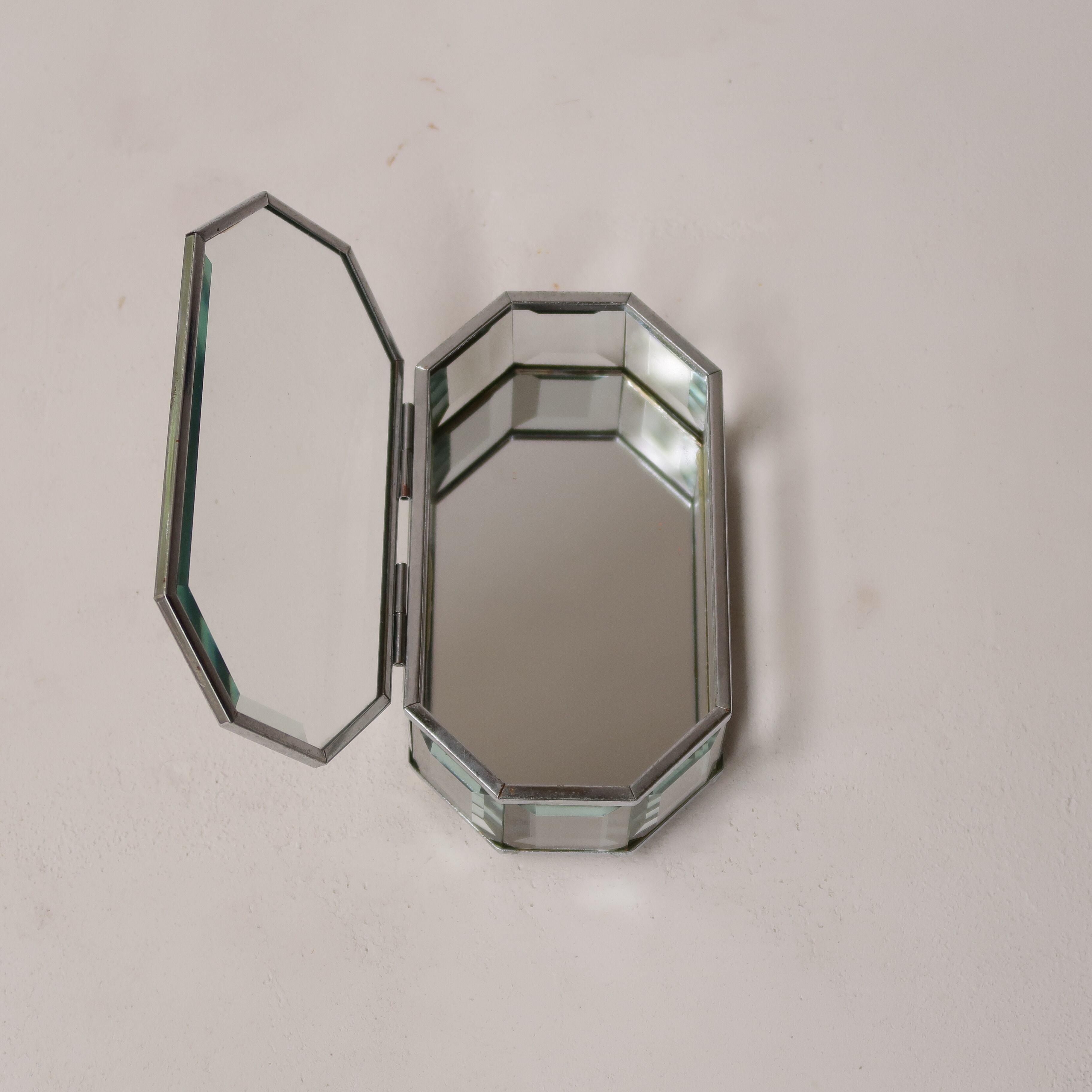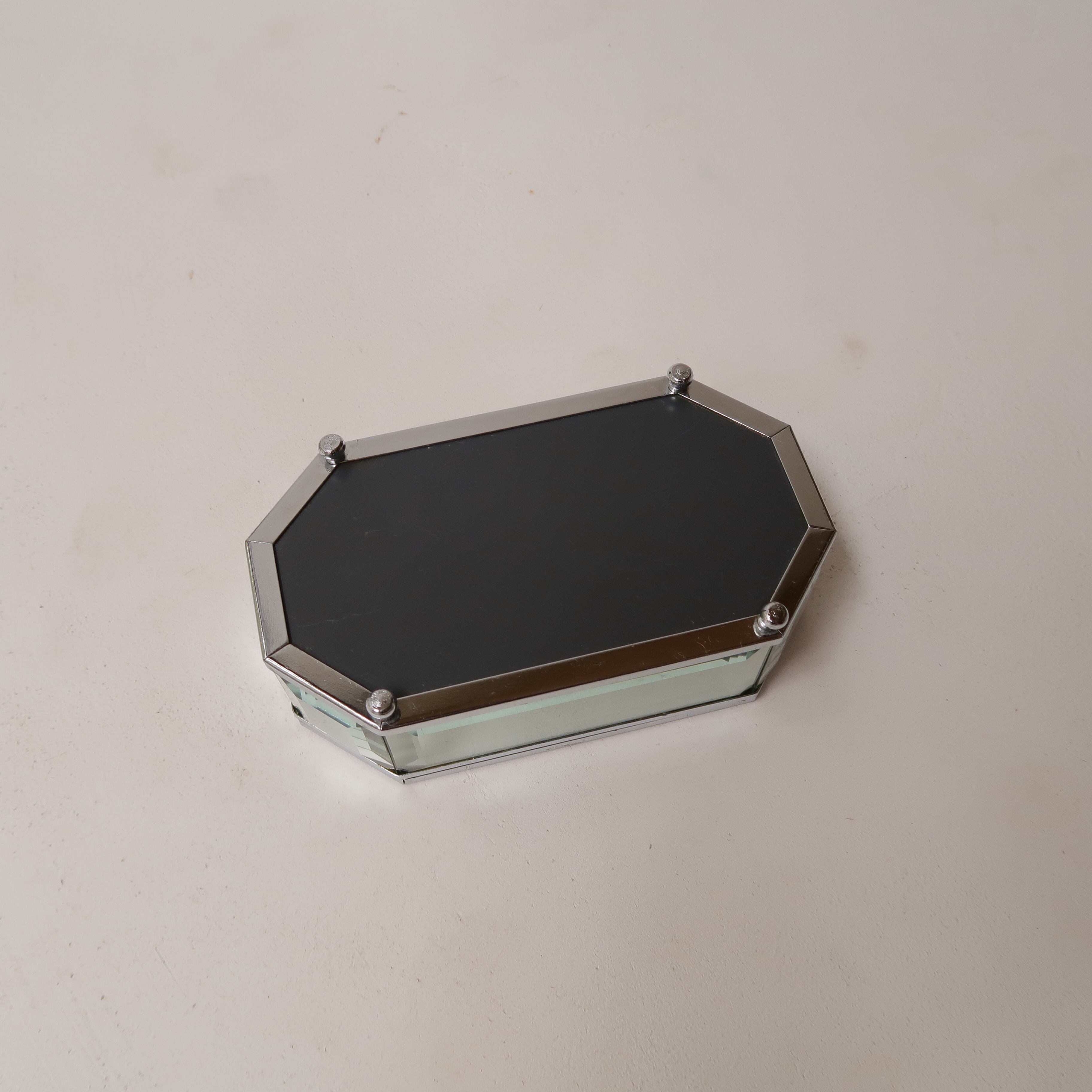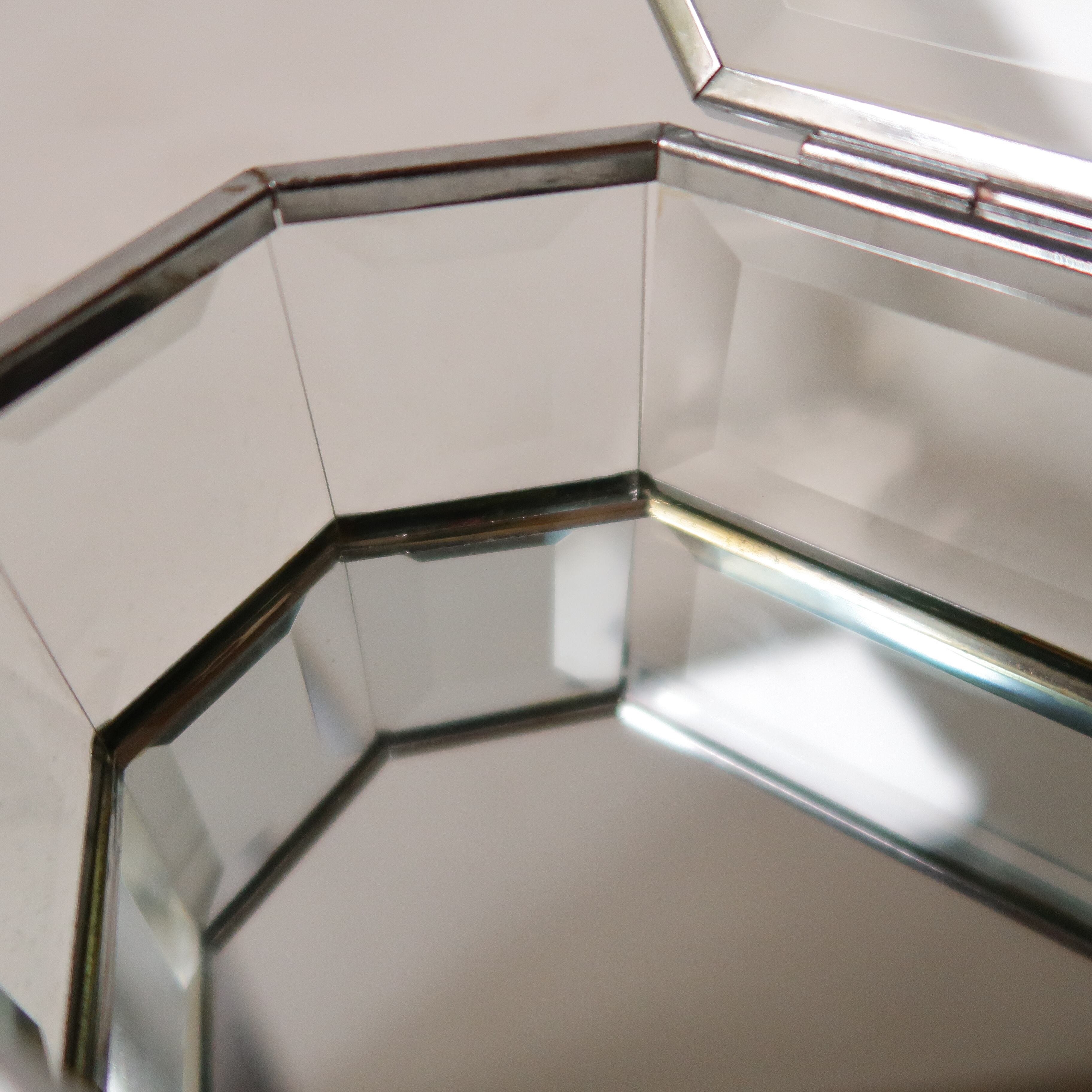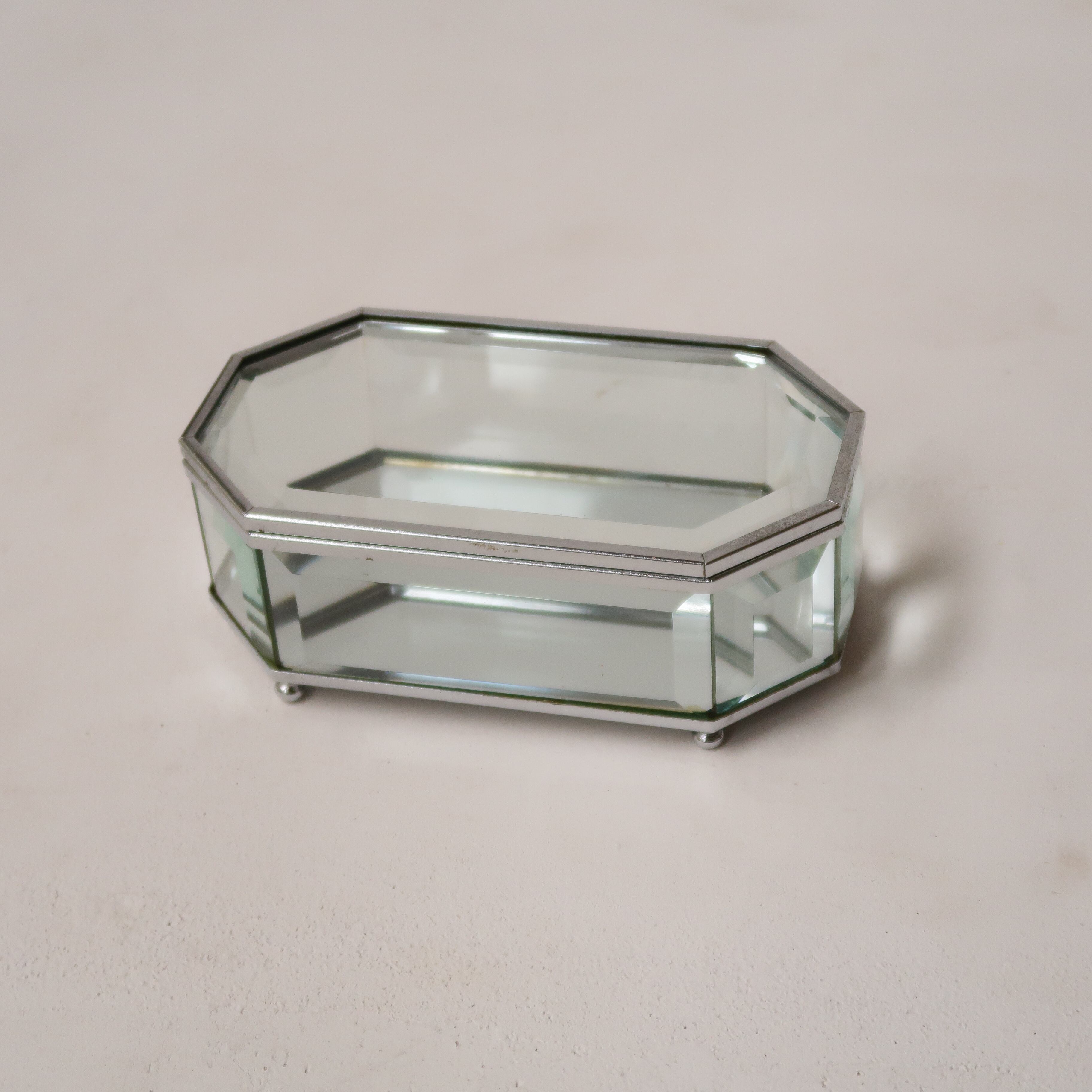 この、縦に長い多角形のかたちがなんかよくて、SUISUIっぽさのあるアイテム。底だけミラーになっていて、ジュエリーをより美しく見せてくれます。また、面のガラスは、縁に向かって斜めにカットが入っていて、きらきら。銀色の縁には、少し経年変化が見られます。