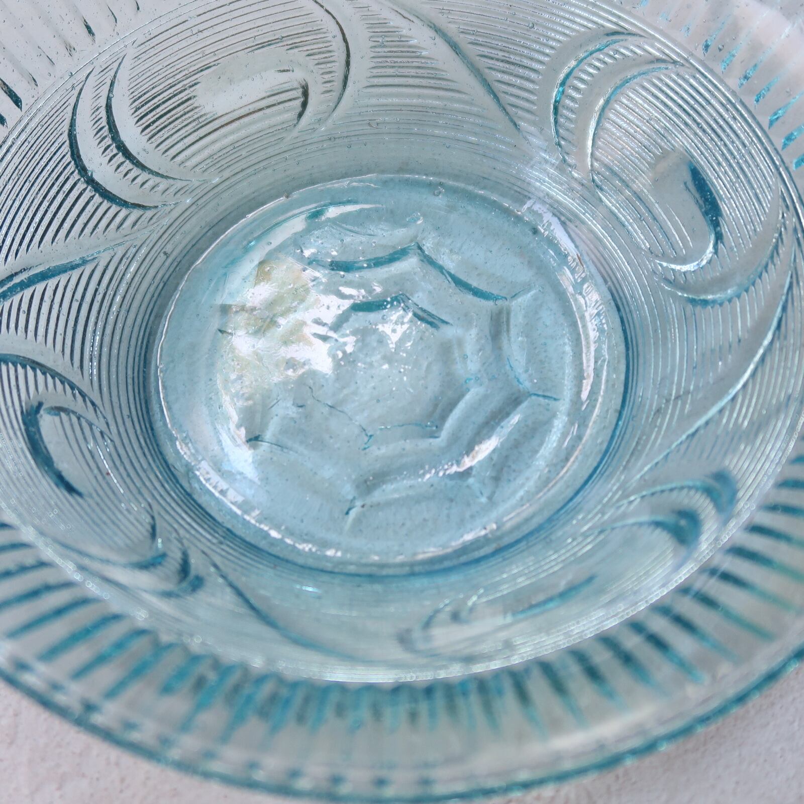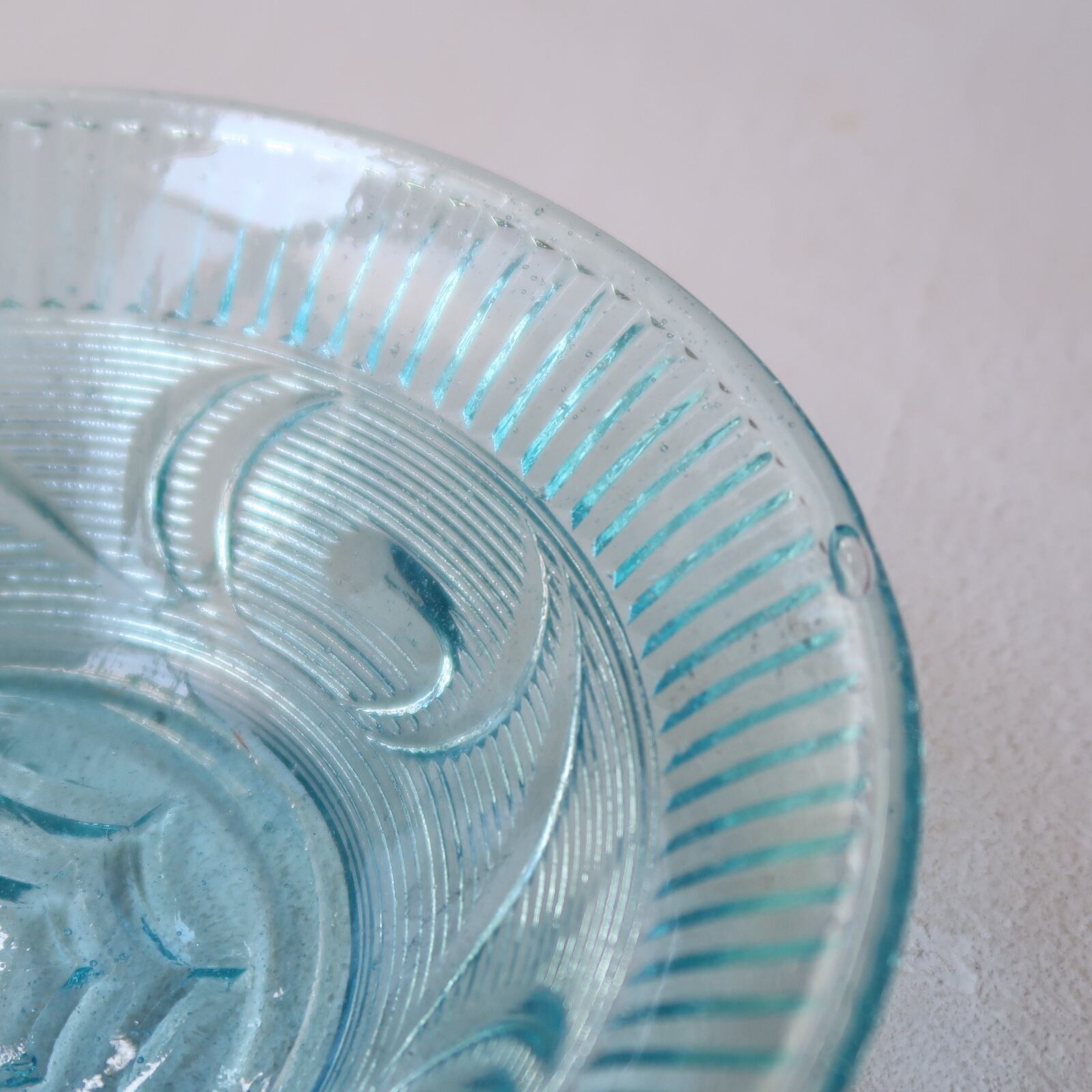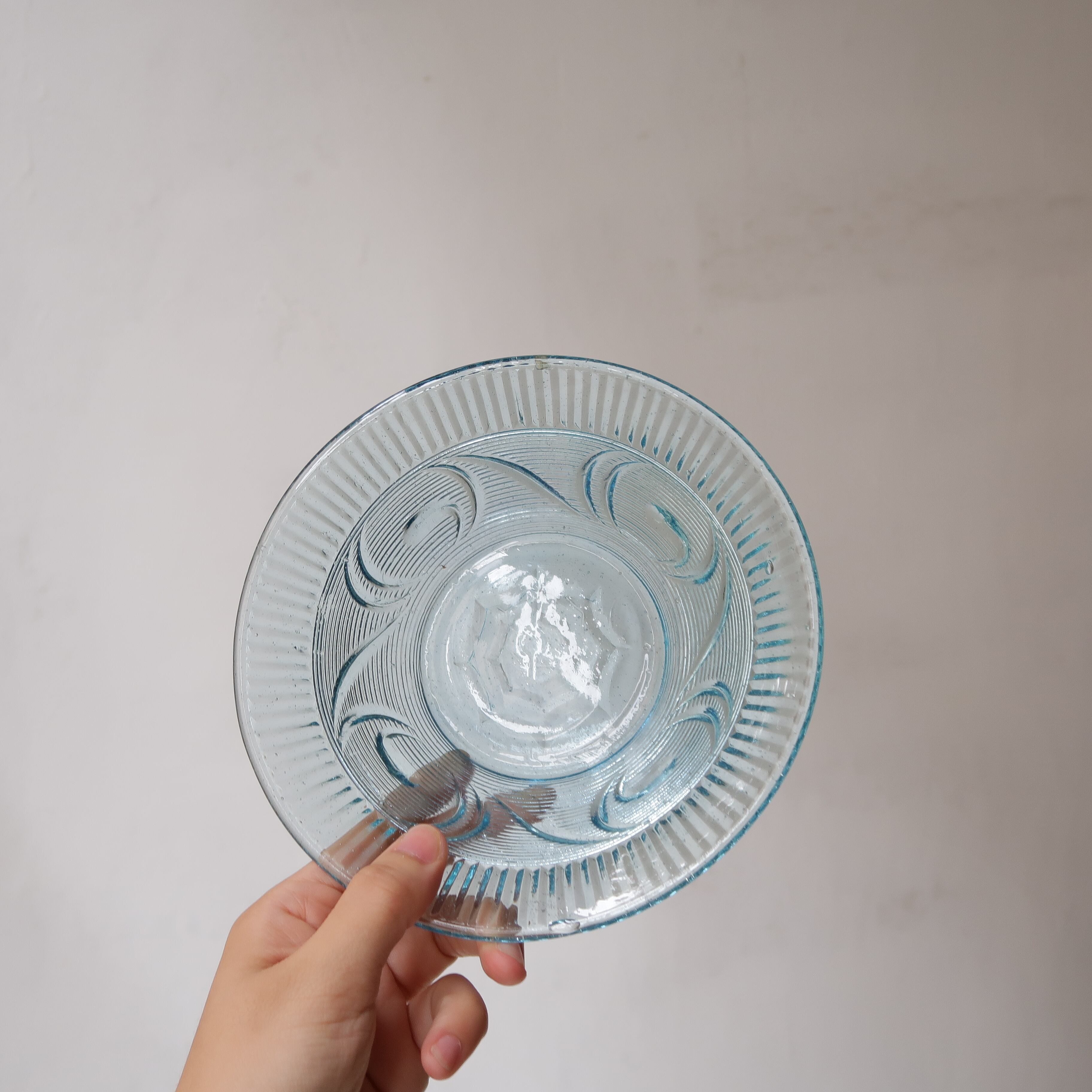 すこしだけグリーンがかったような、ブルーのガラスのお皿。渦のような、星のような模様がさっぱりとしていて美しいアイテムです。
