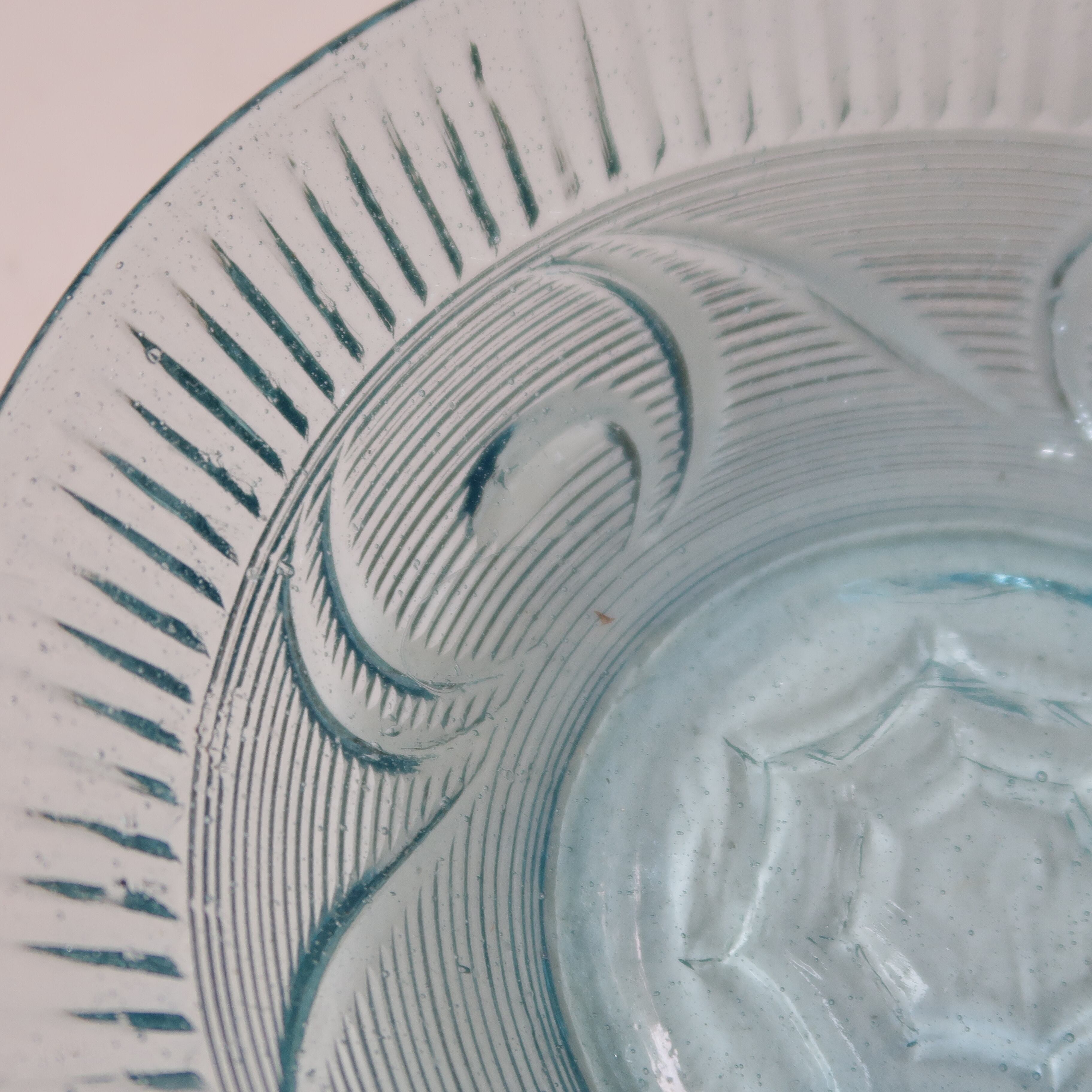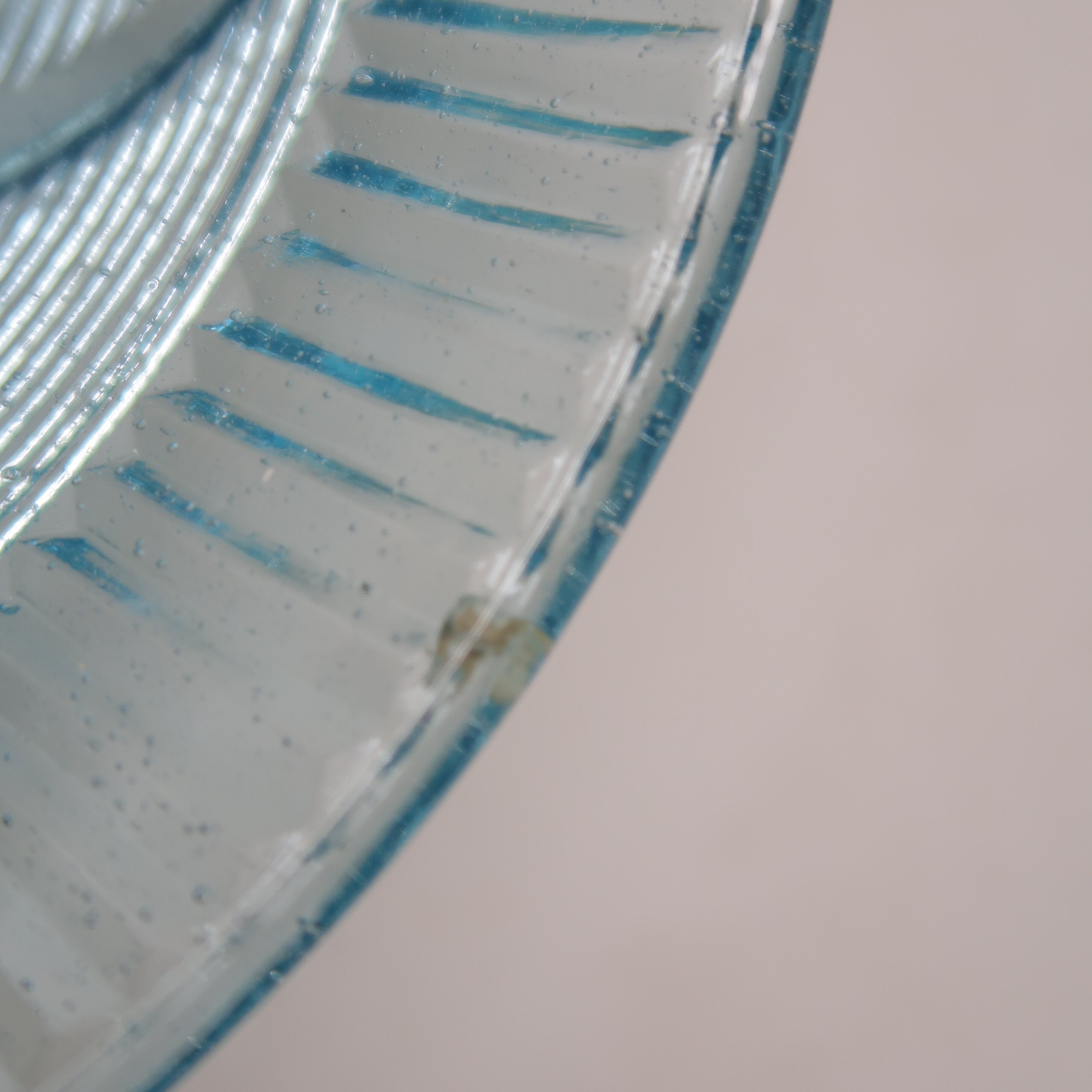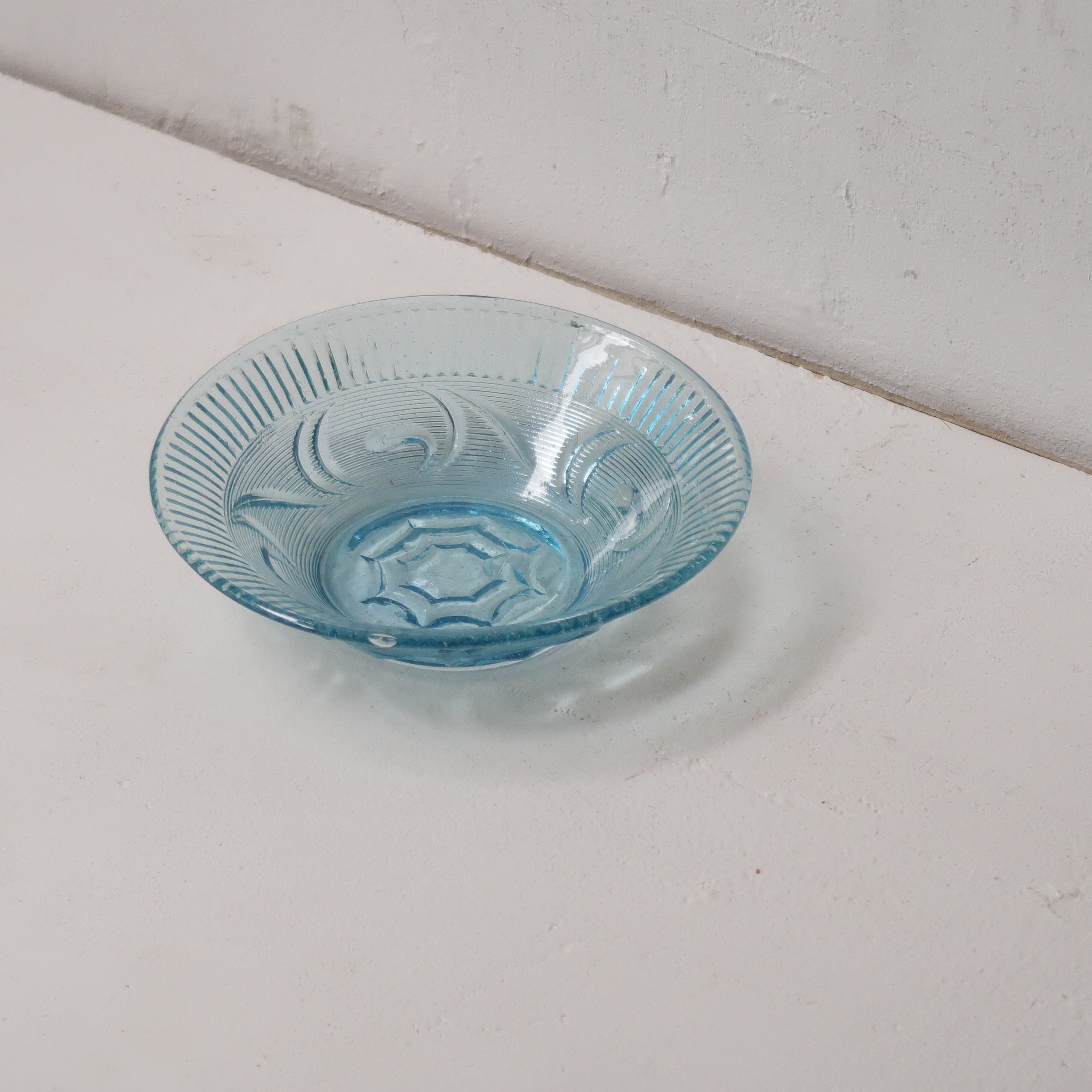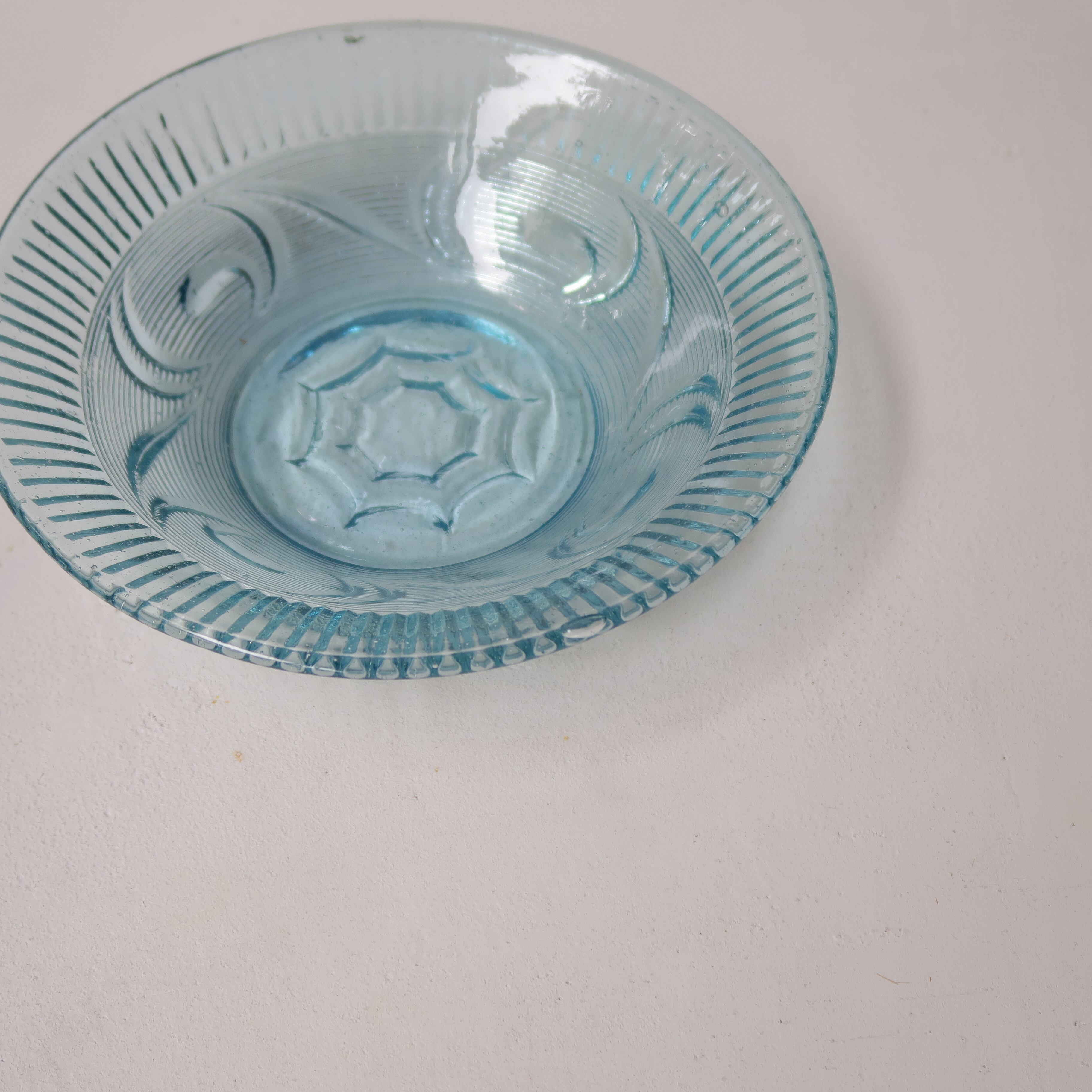 すこしだけグリーンがかったような、ブルーのガラスのお皿。渦のような、星のような模様がさっぱりとしていて美しいアイテムです。