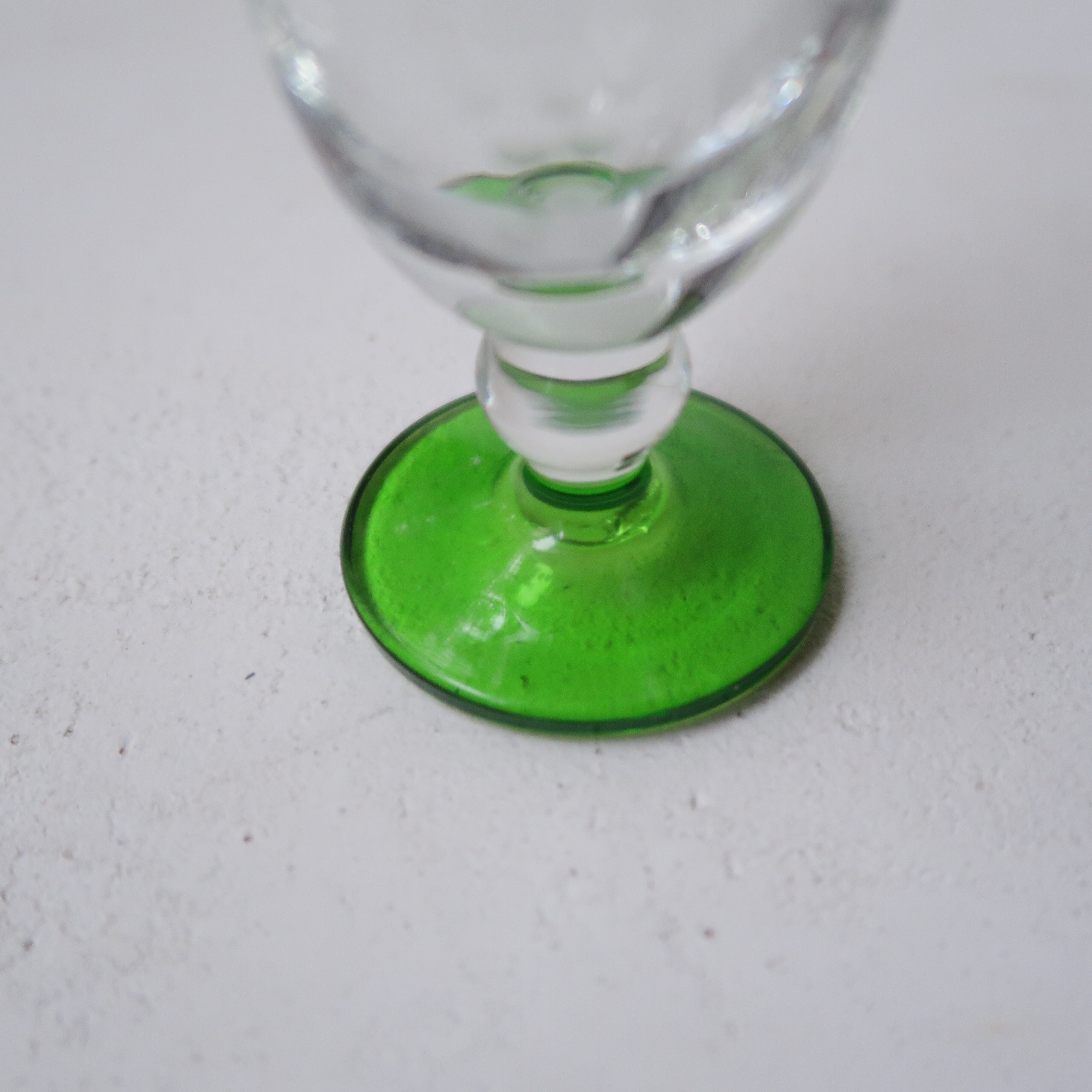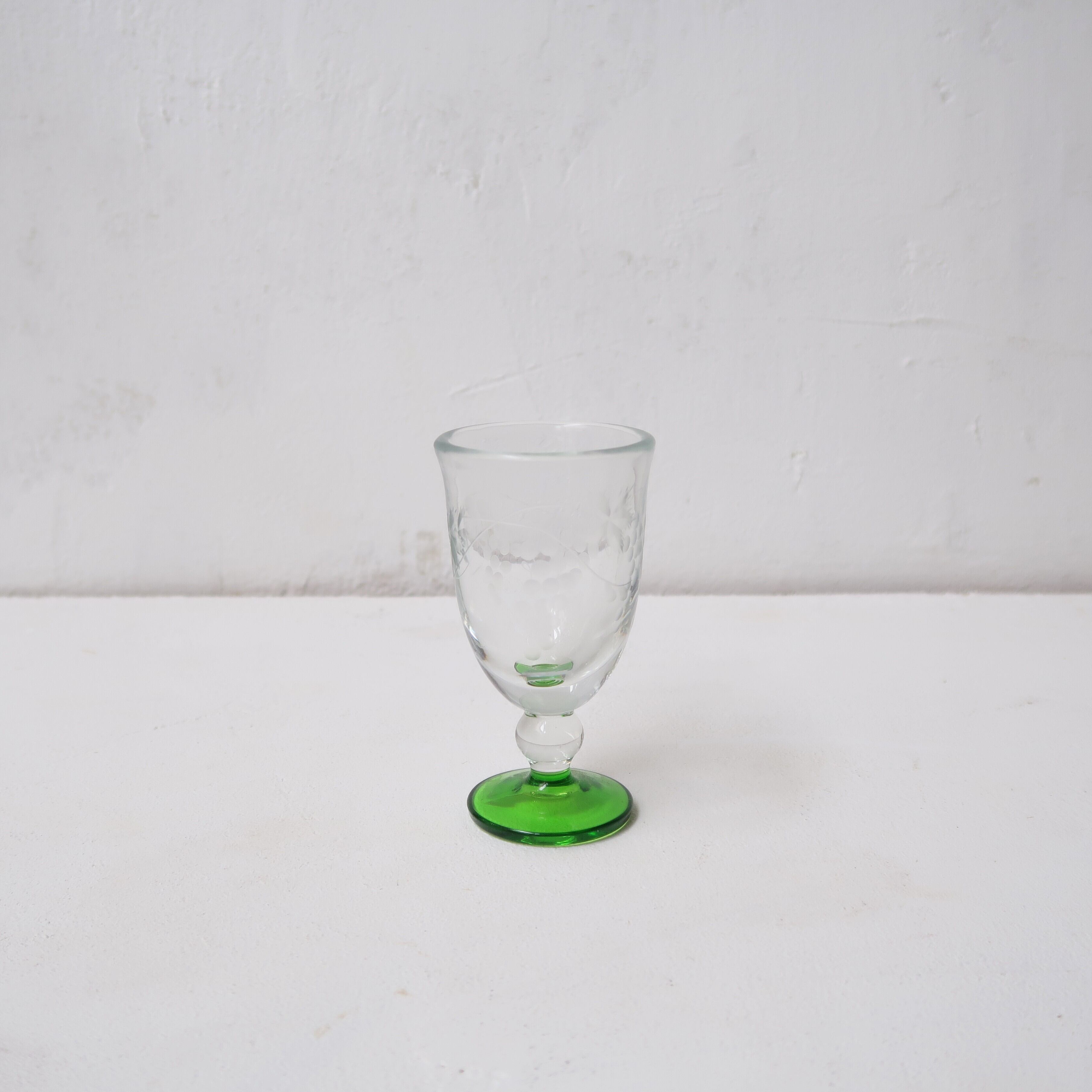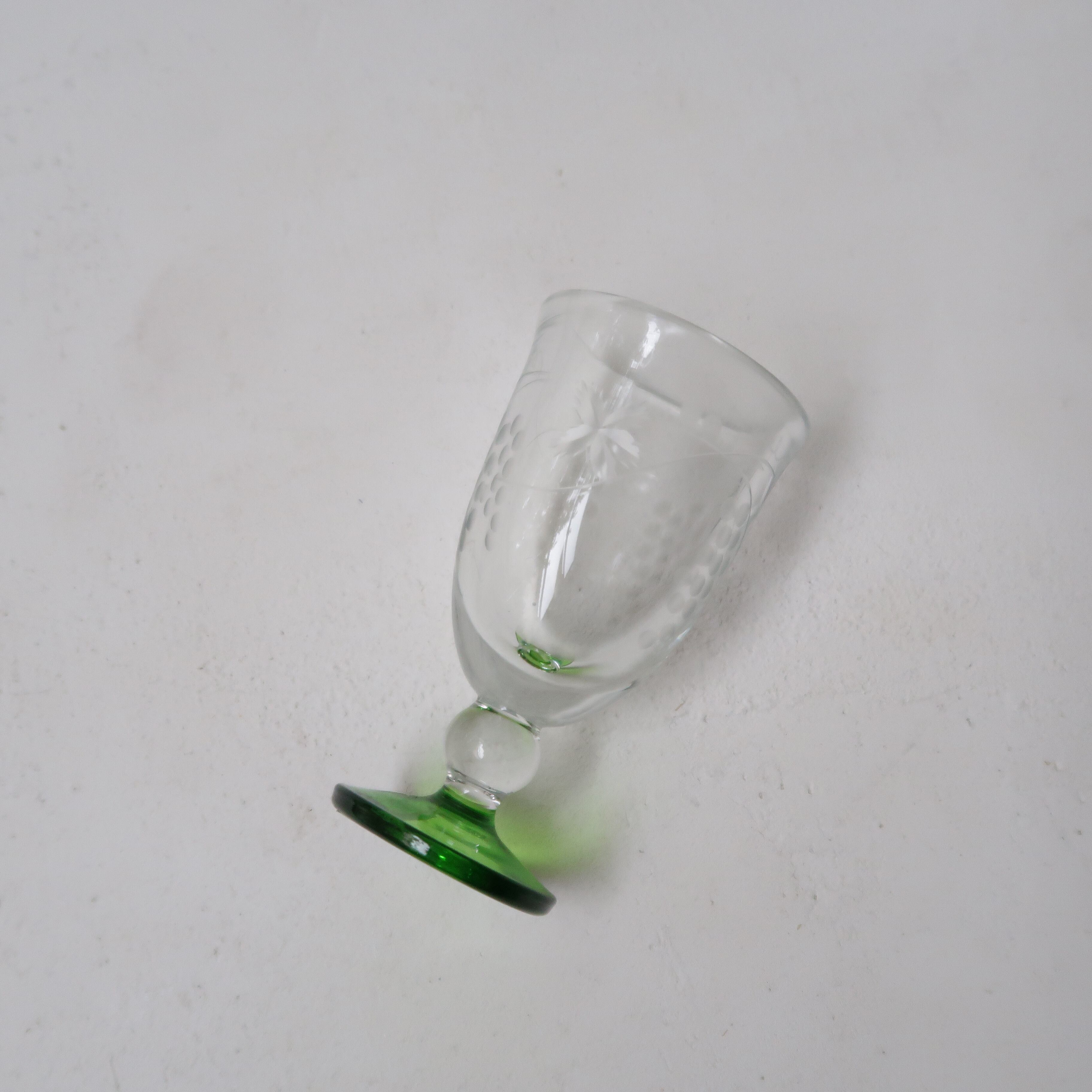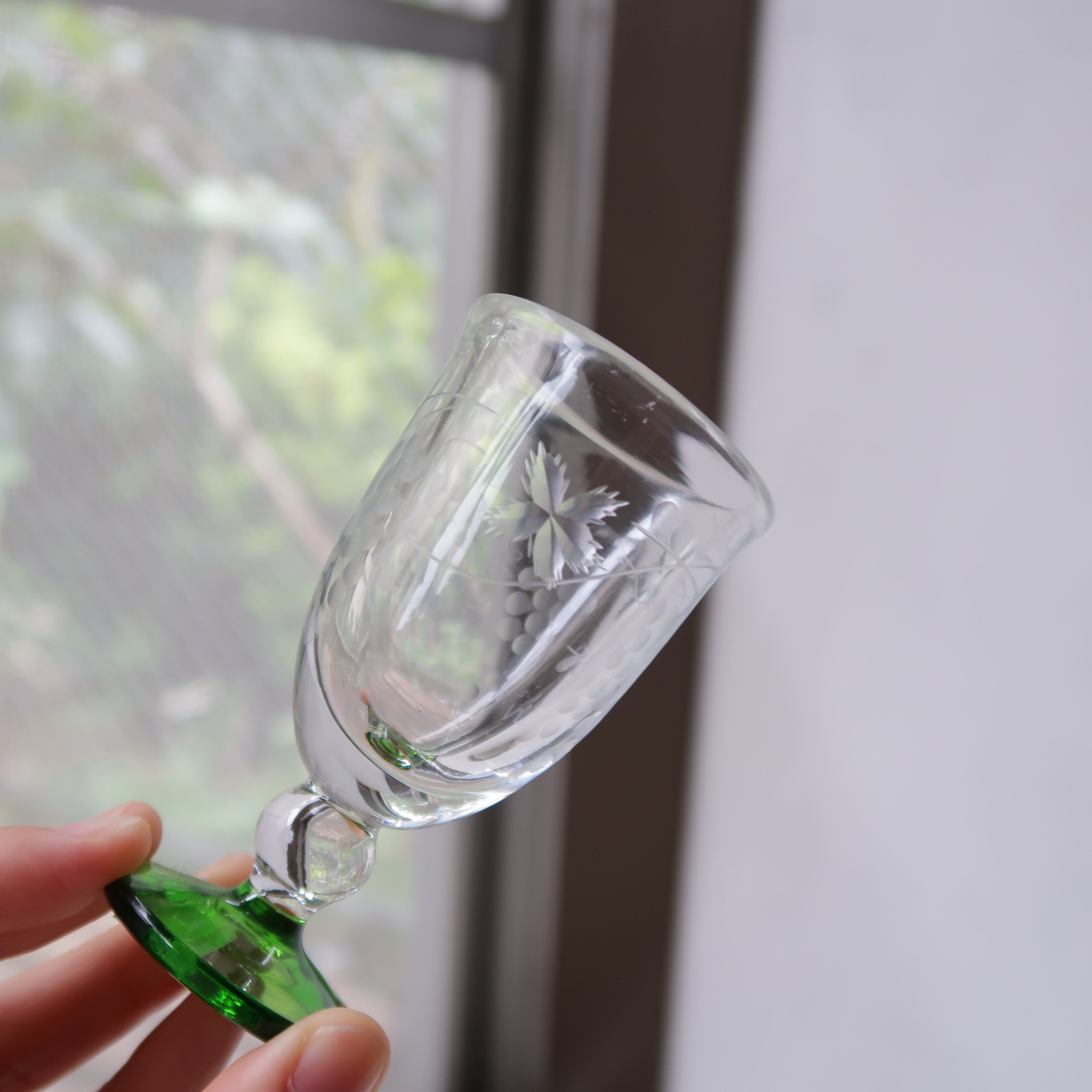 よく見ると、ぶどうの実やツル、葉っぱが彫られたミニグラス。脚だけグリーンなのもかわいいポイントです。アクセサリーを飾っておくのに◎