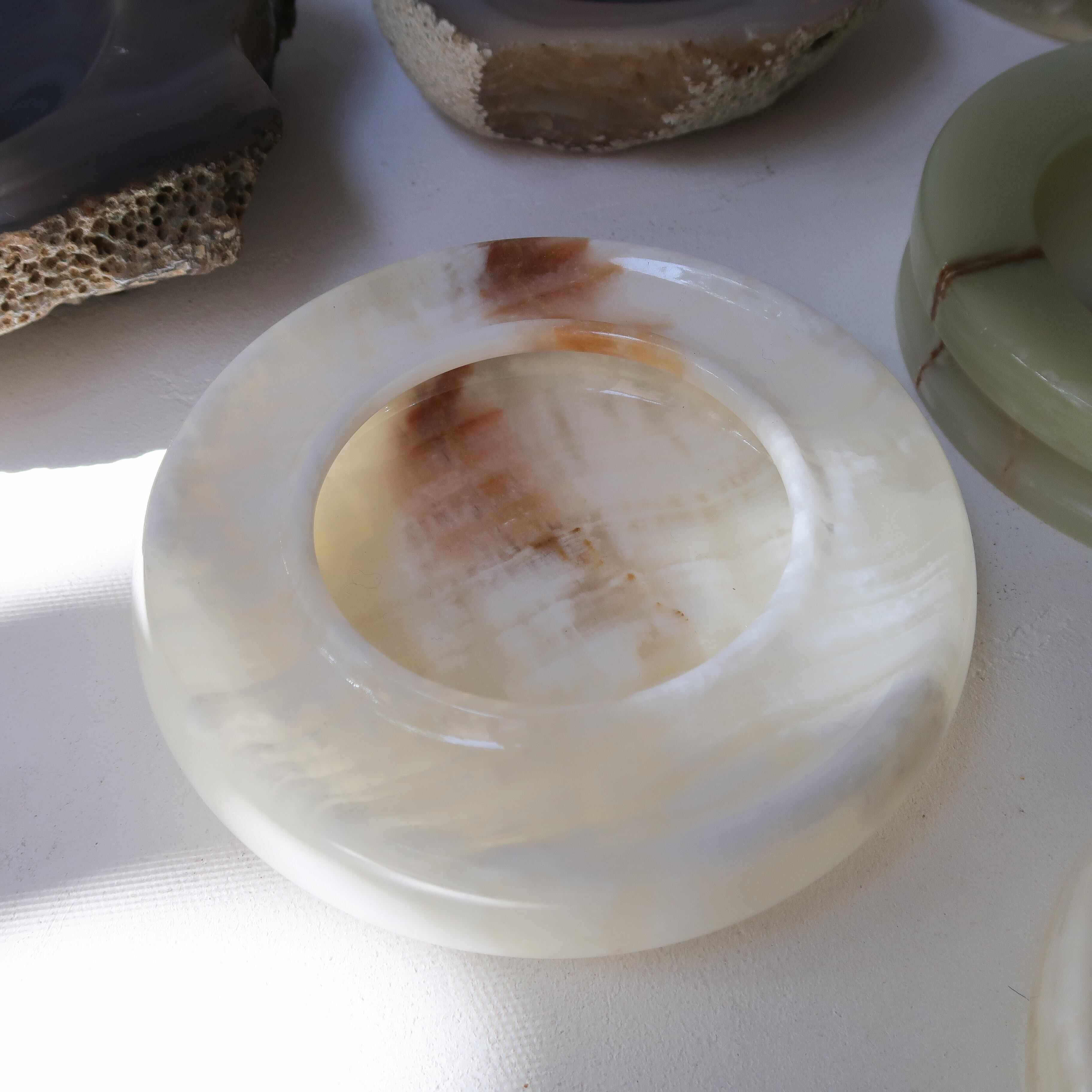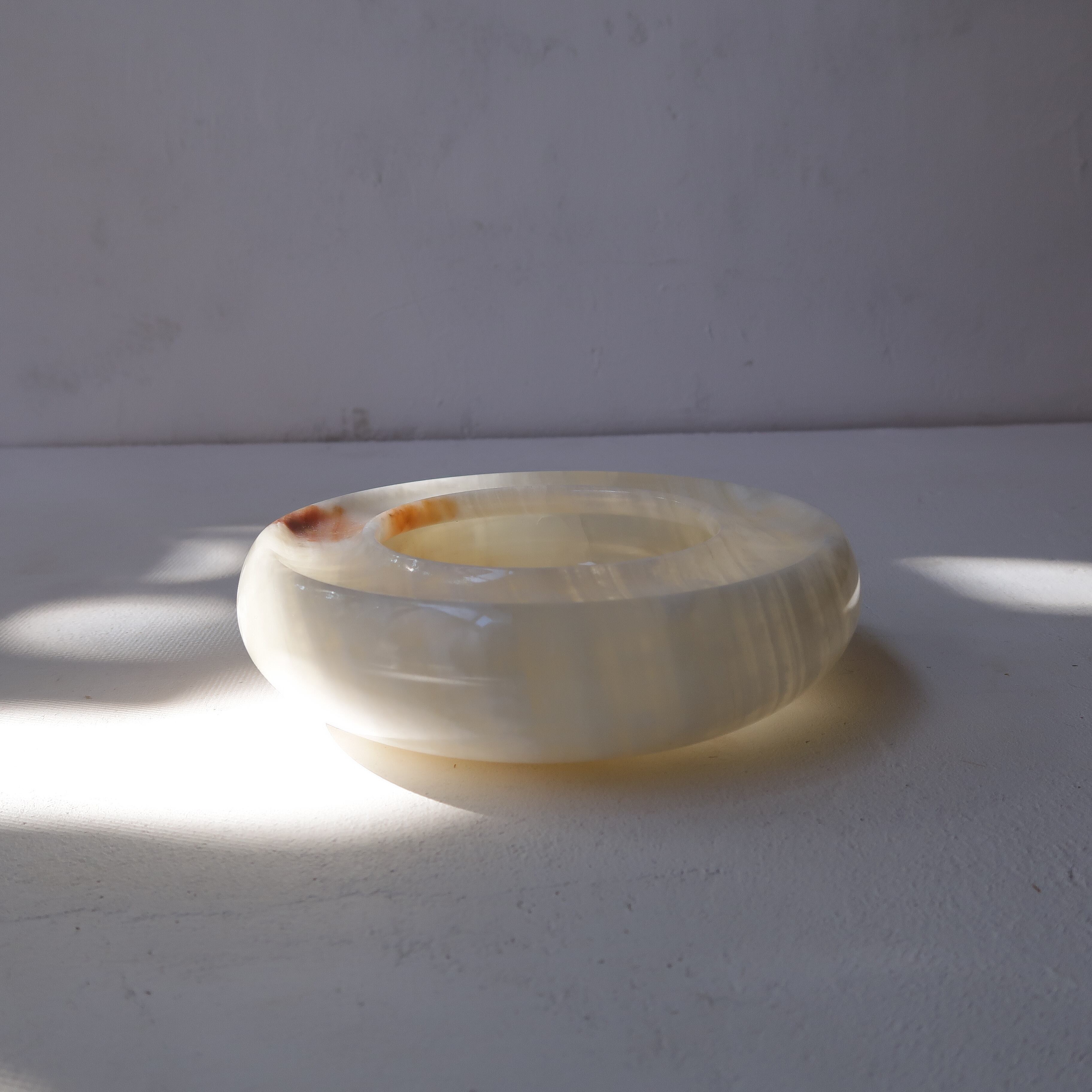 大きくて重たい、石のアッシュトレイ。全体的にホワイトでつるりとしていて、透け感がきれいです。ちょっぴりブラウンがなんだか愛らしい。
