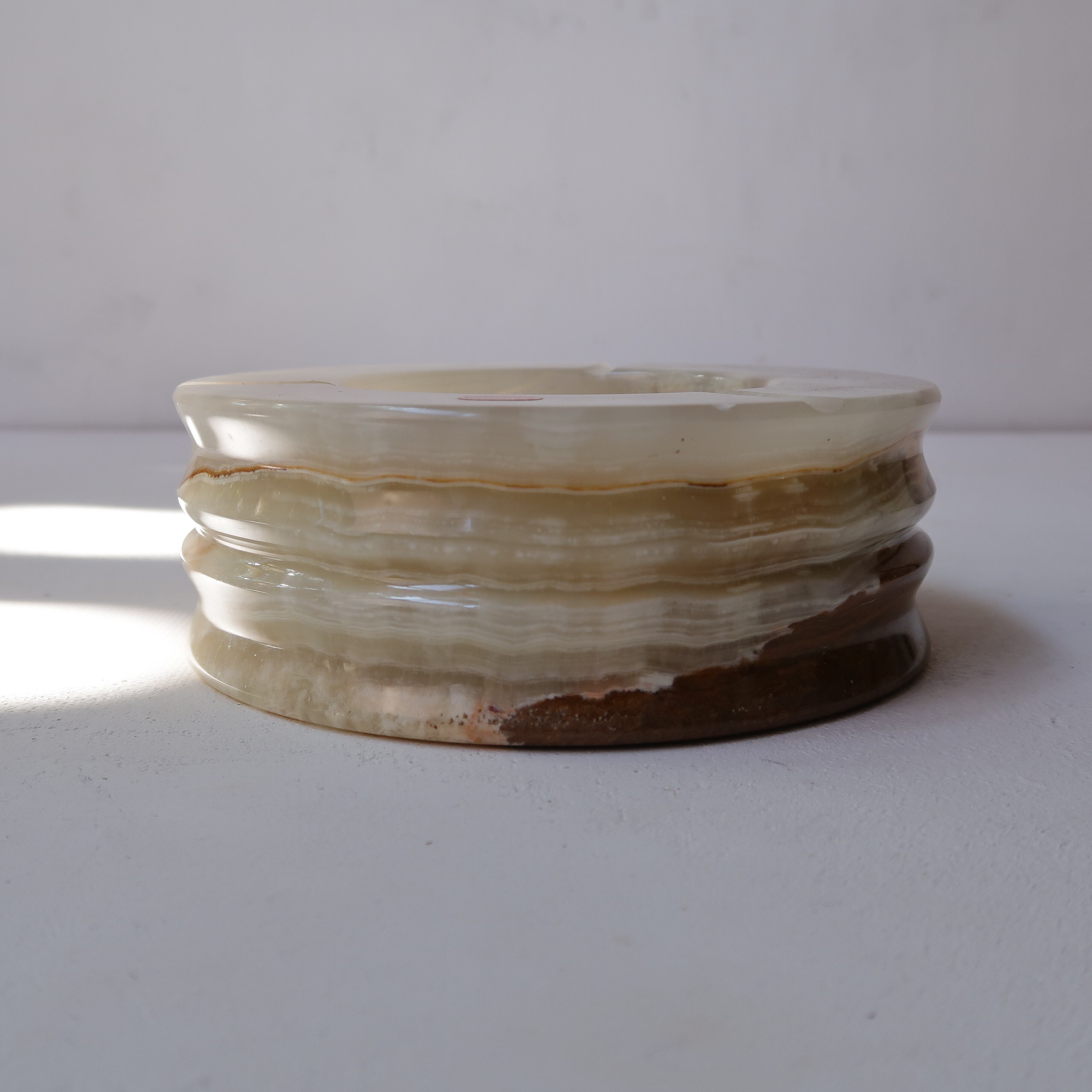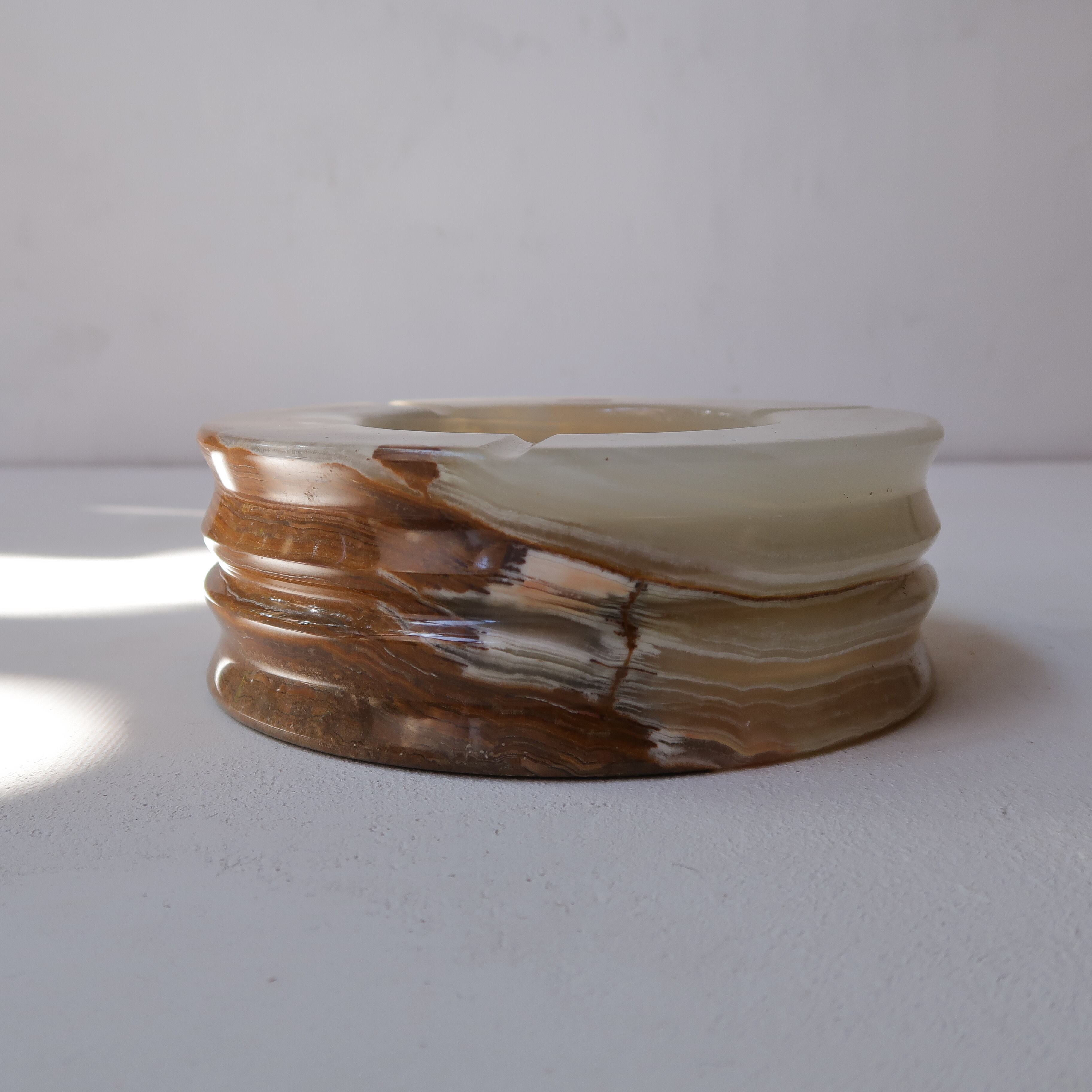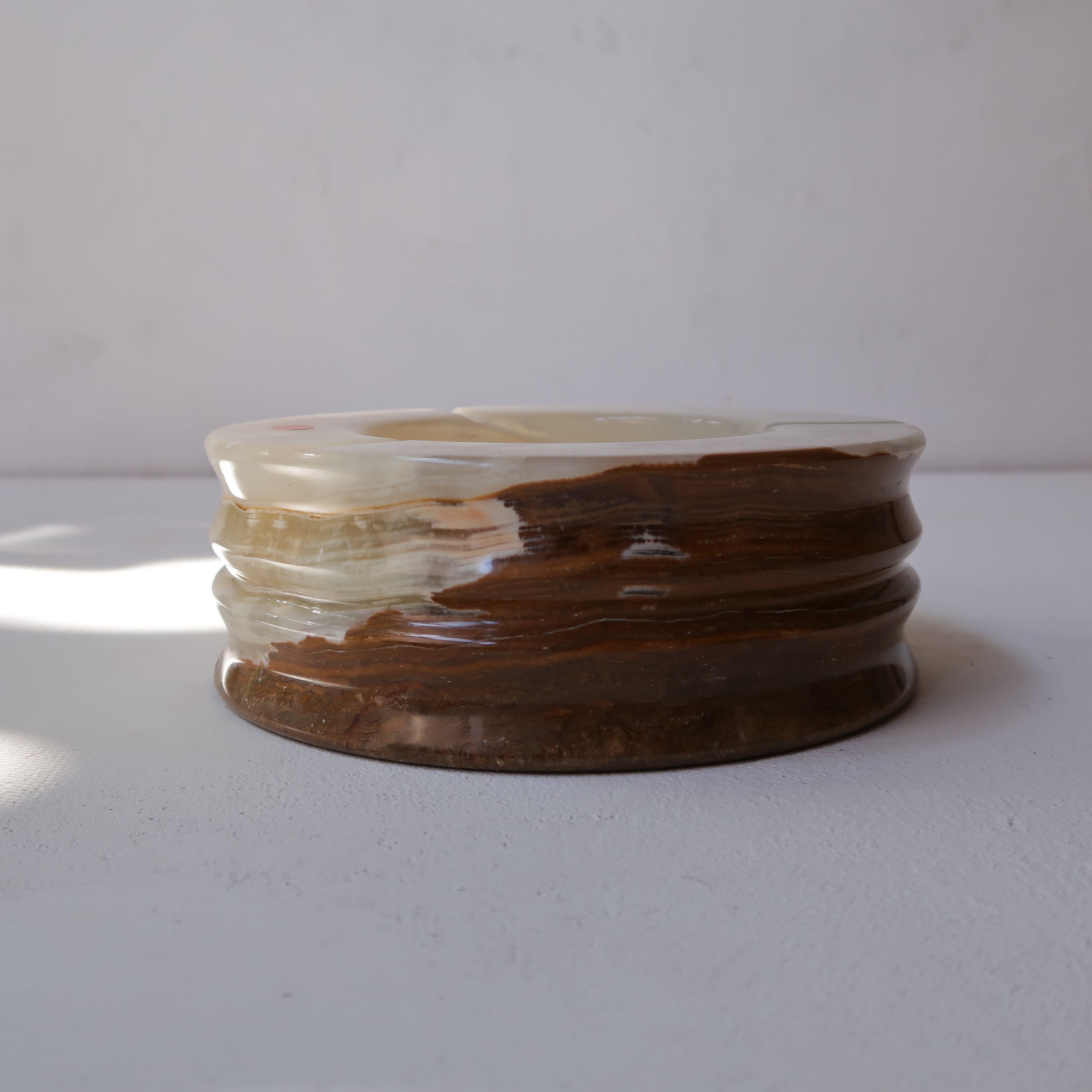 大きくて重たい、石のアッシュトレイ。ホワイトとブラウンが合体したような色分けがなんだか大胆な印象です。側面は段々になっていて、さながらポンプのよう。高さも比較的あるタイプ。