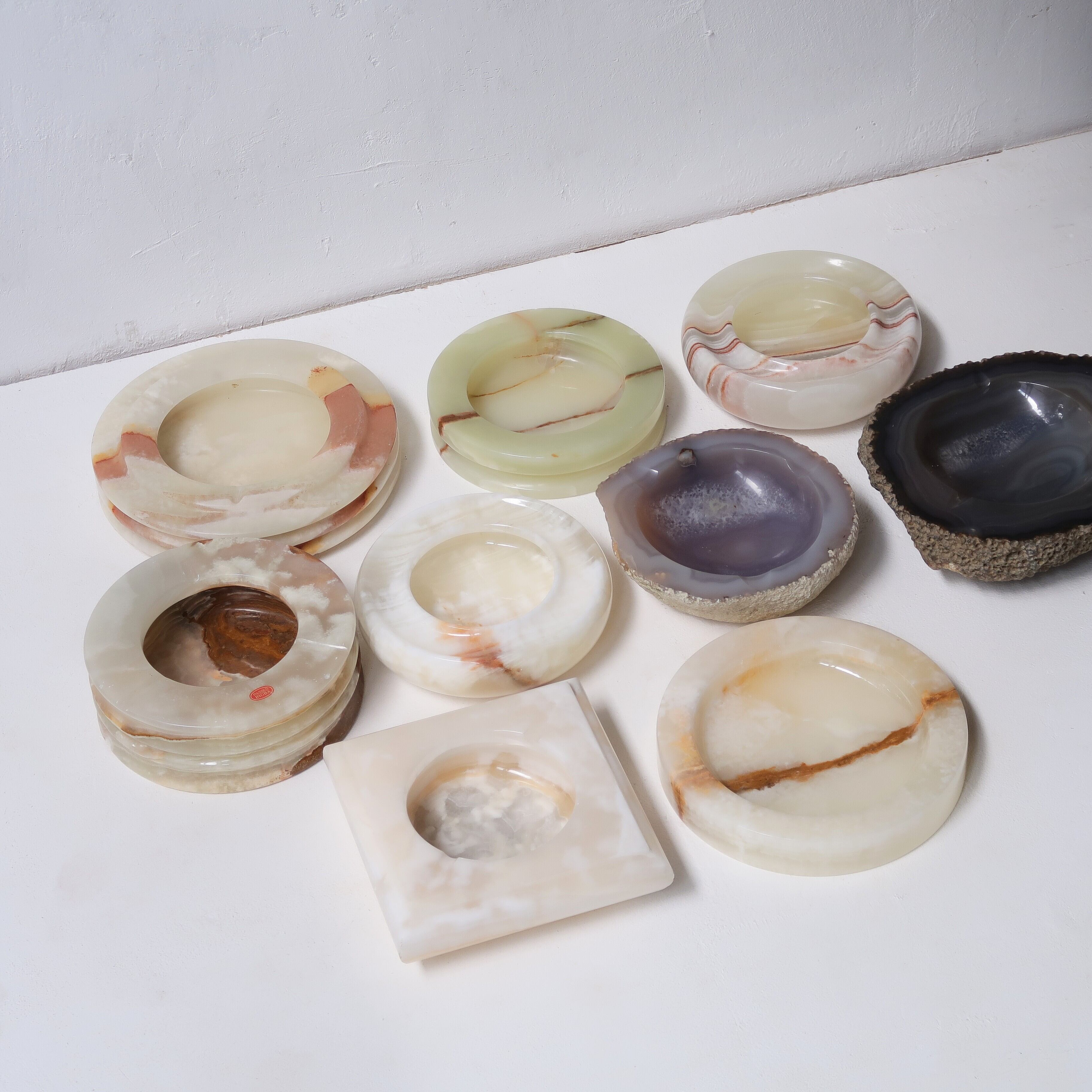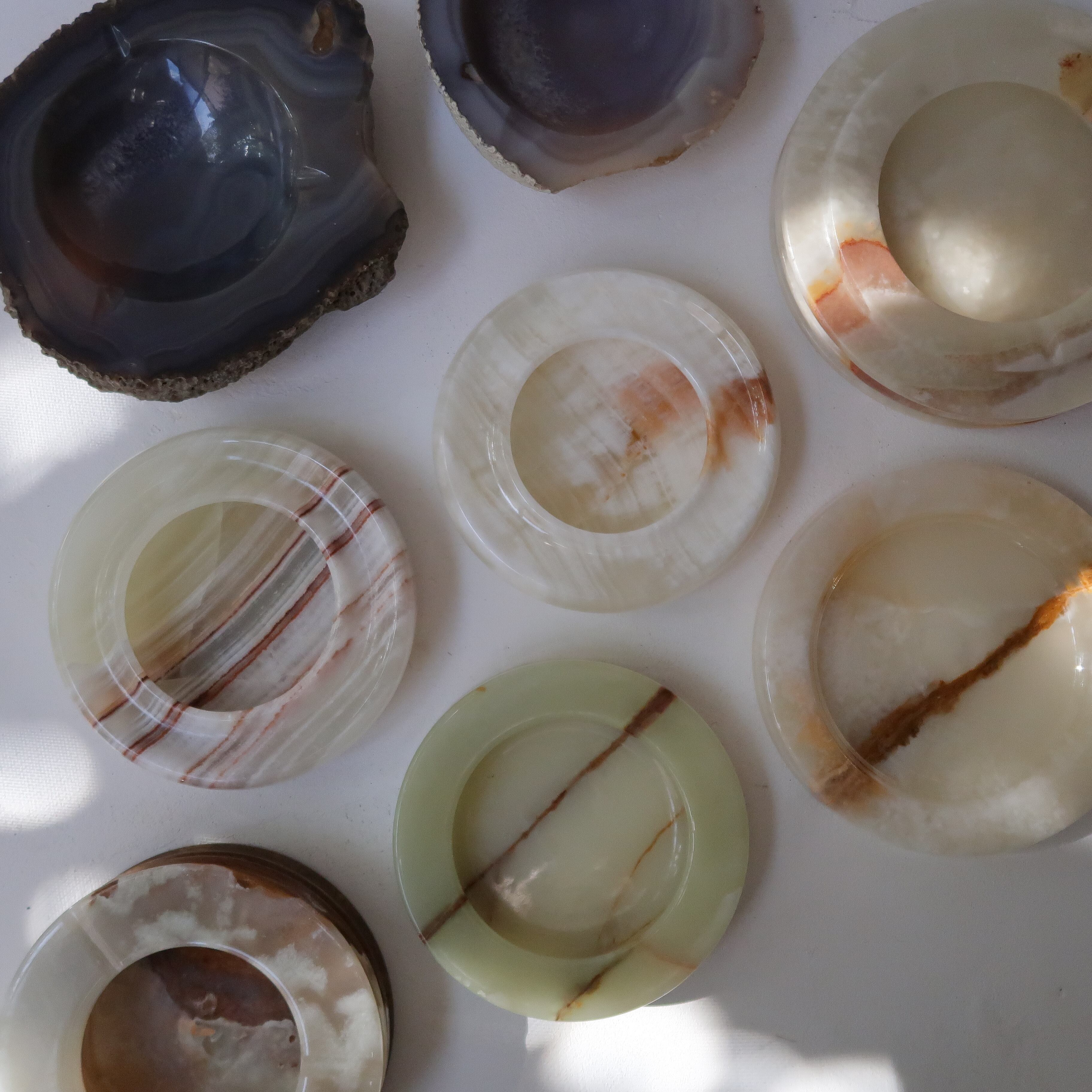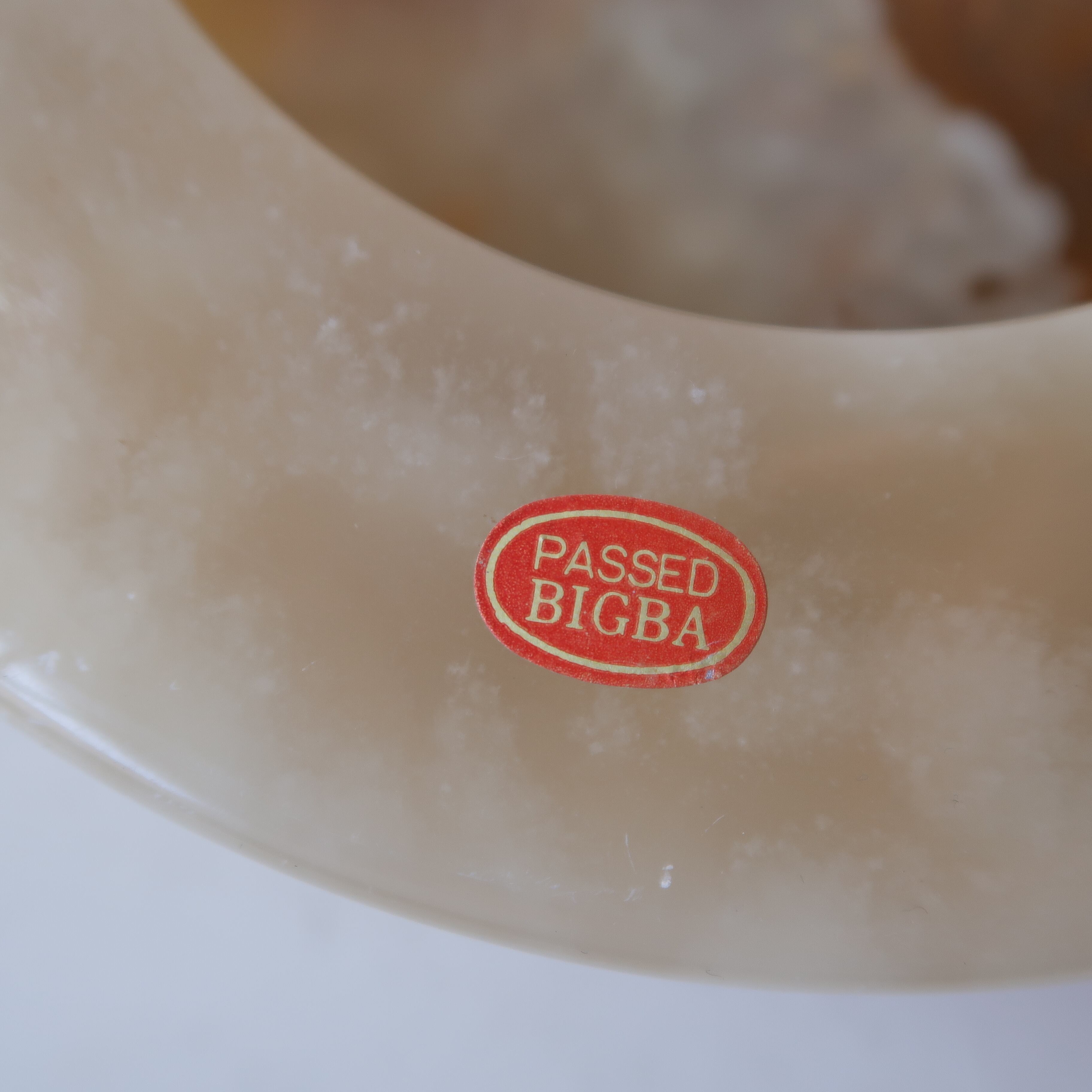 大きくて重たい、石のアッシュトレイ。ホワイトとブラウンが合体したような色分けがなんだか大胆な印象です。側面は段々になっていて、さながらポンプのよう。高さも比較的あるタイプ。