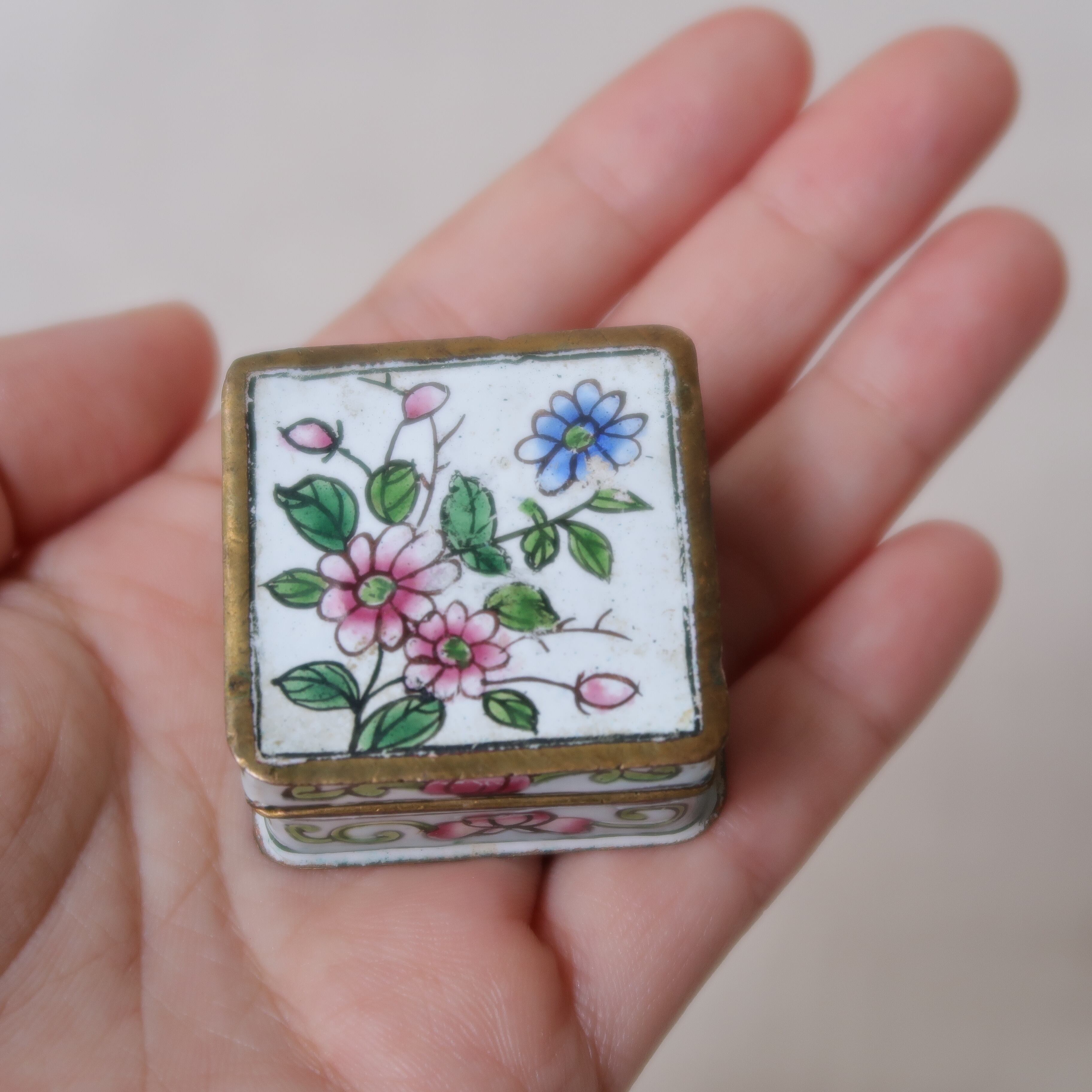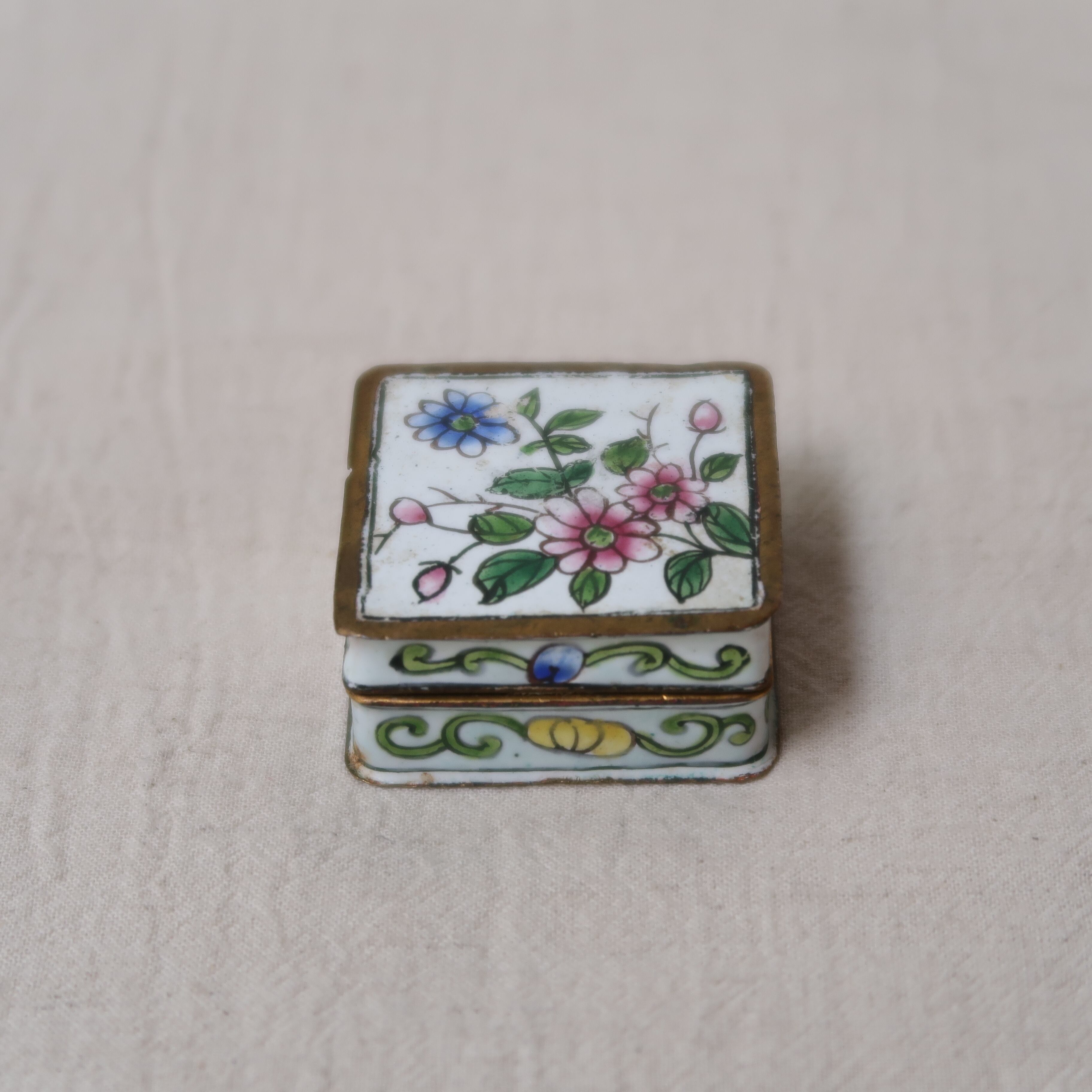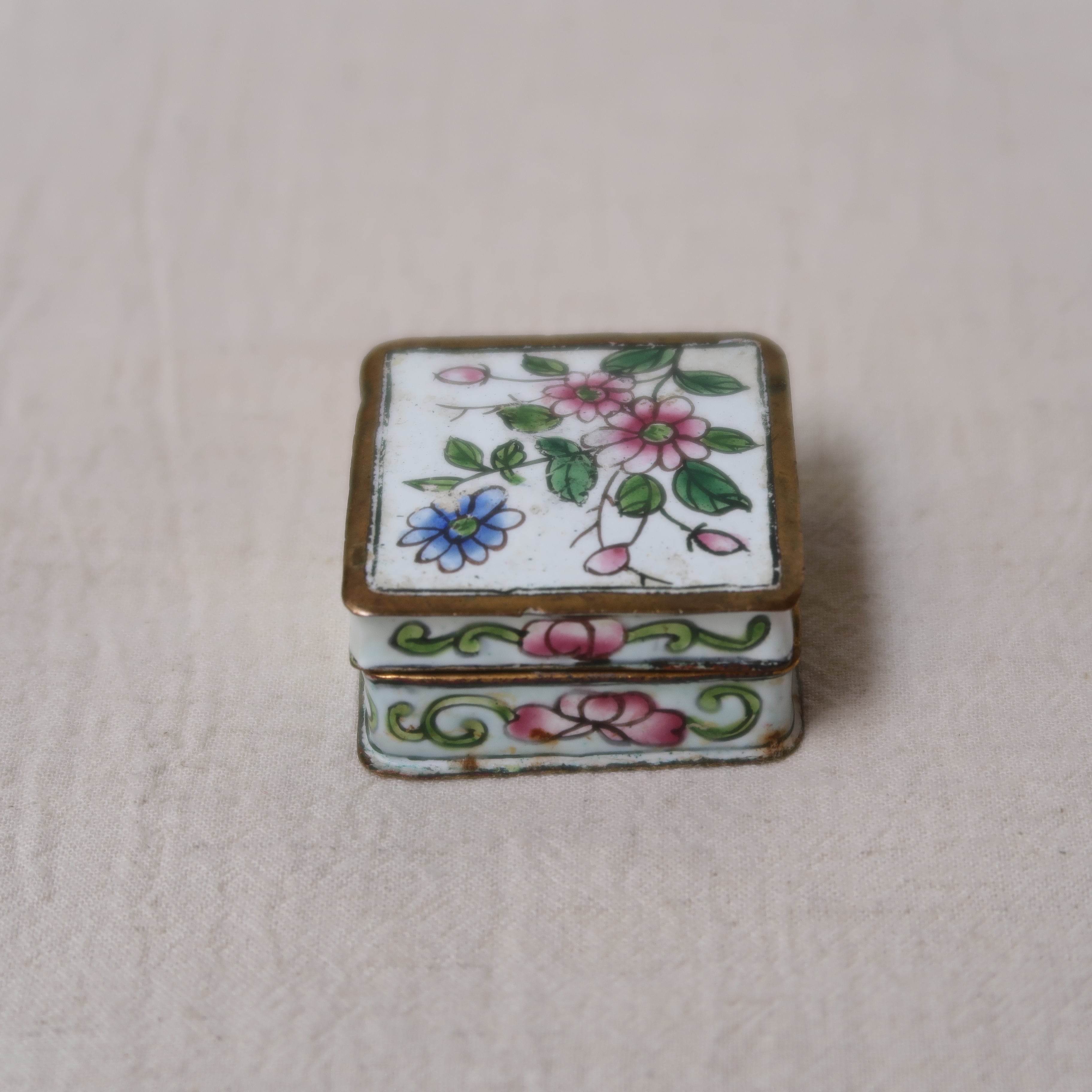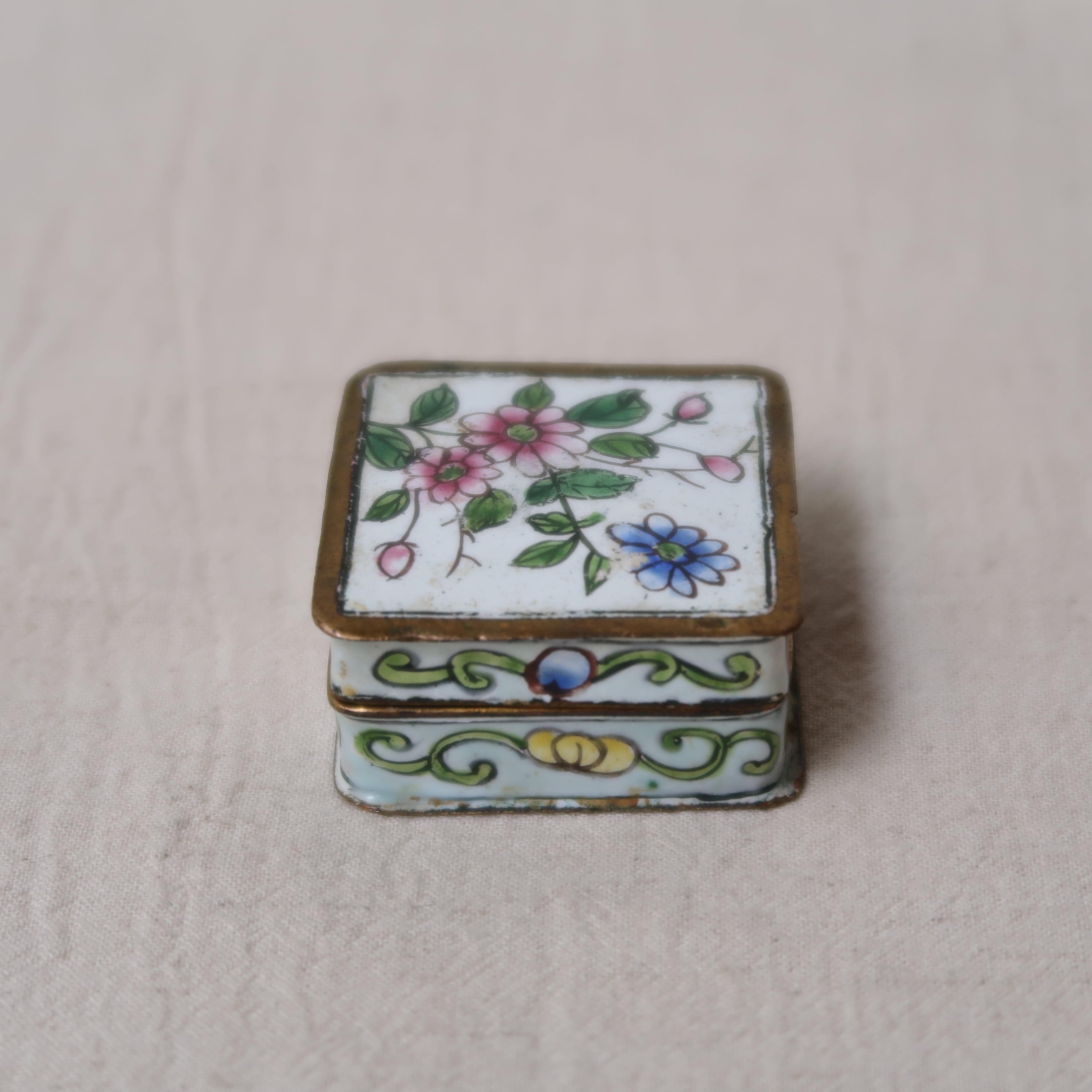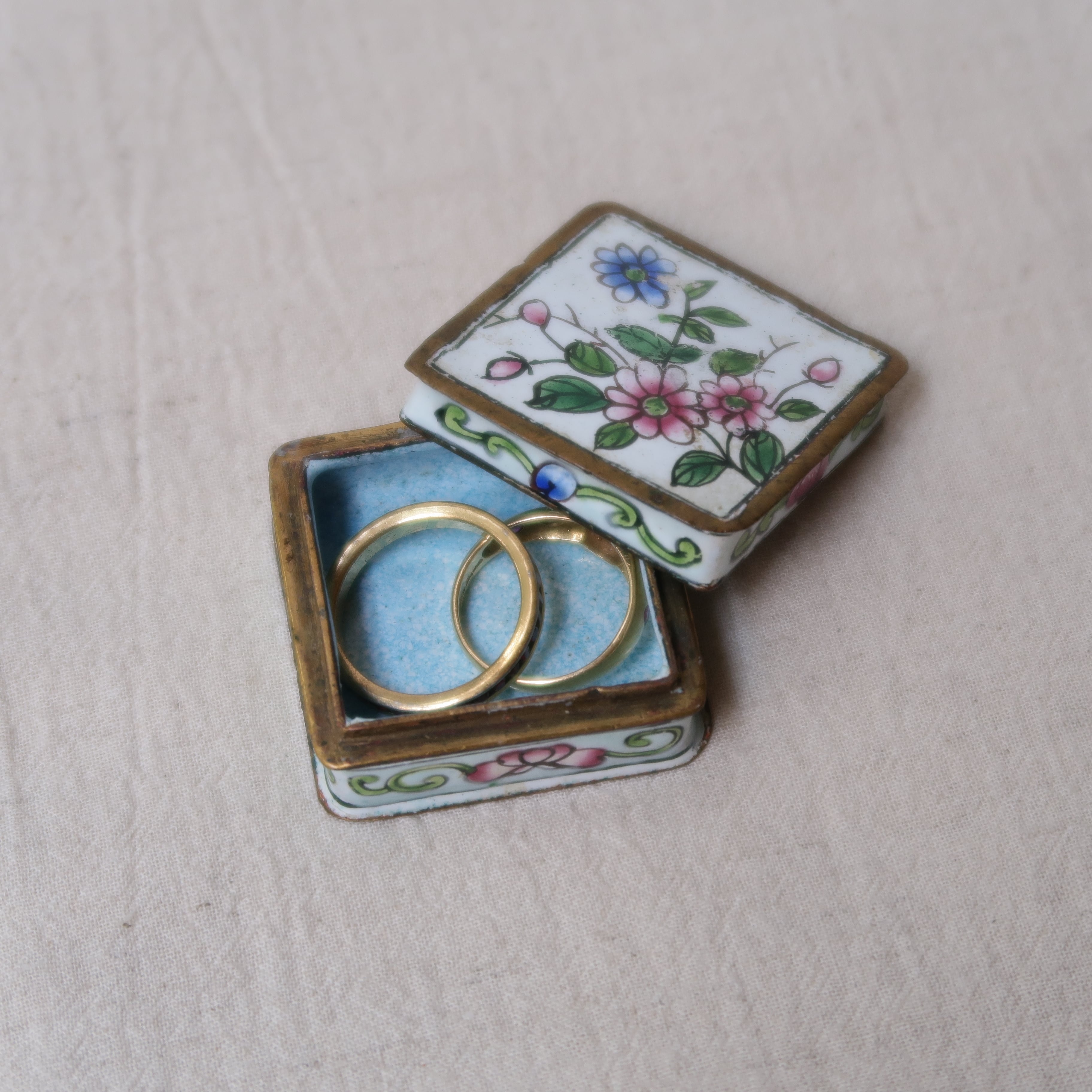 ピンクや青、黄色いお花が描かれたちいさなジュエリーボックス。縁はゴールド、内側は水色になっていて、なんとかわいい…!側面の唐草模様からも漂う、アジアンテイスト。