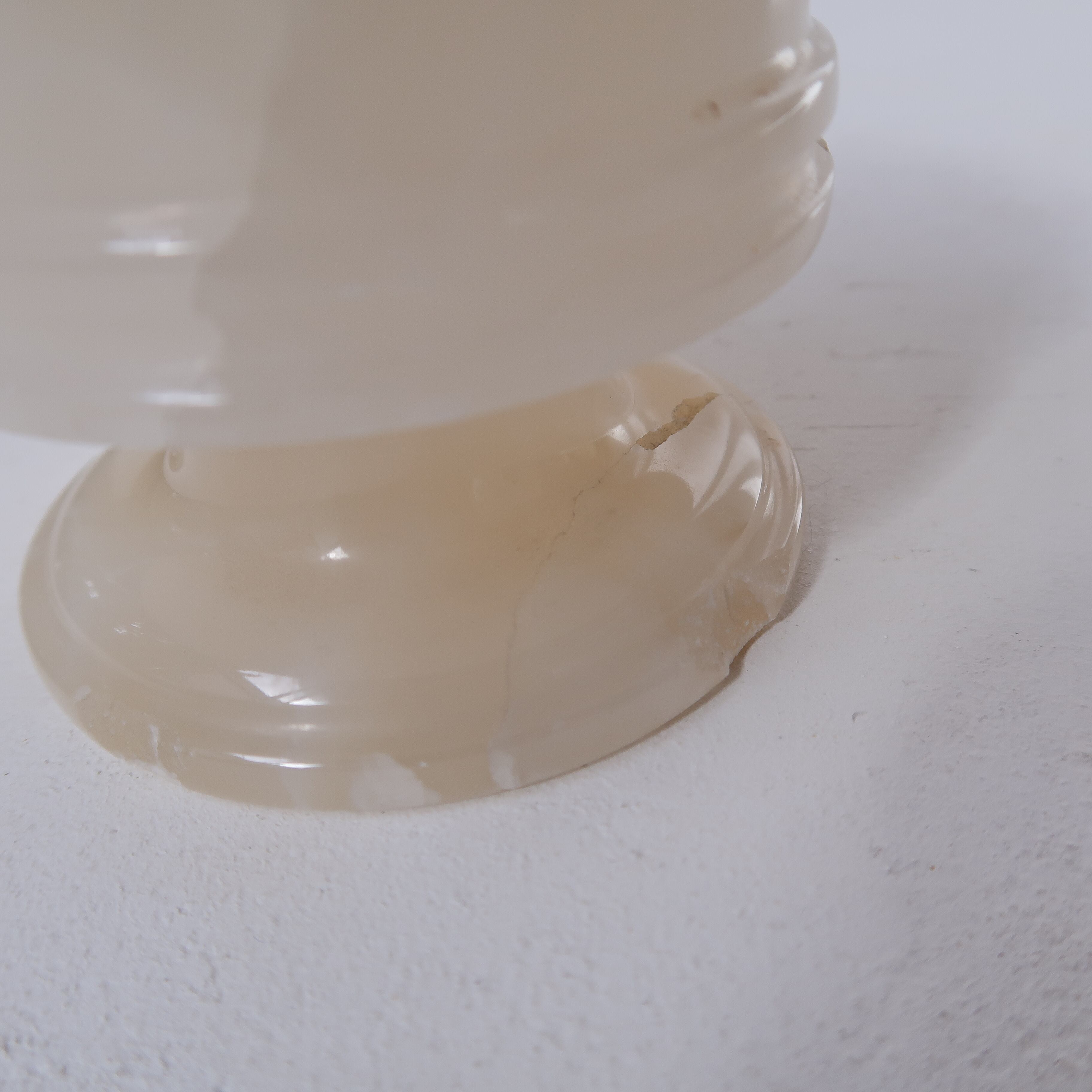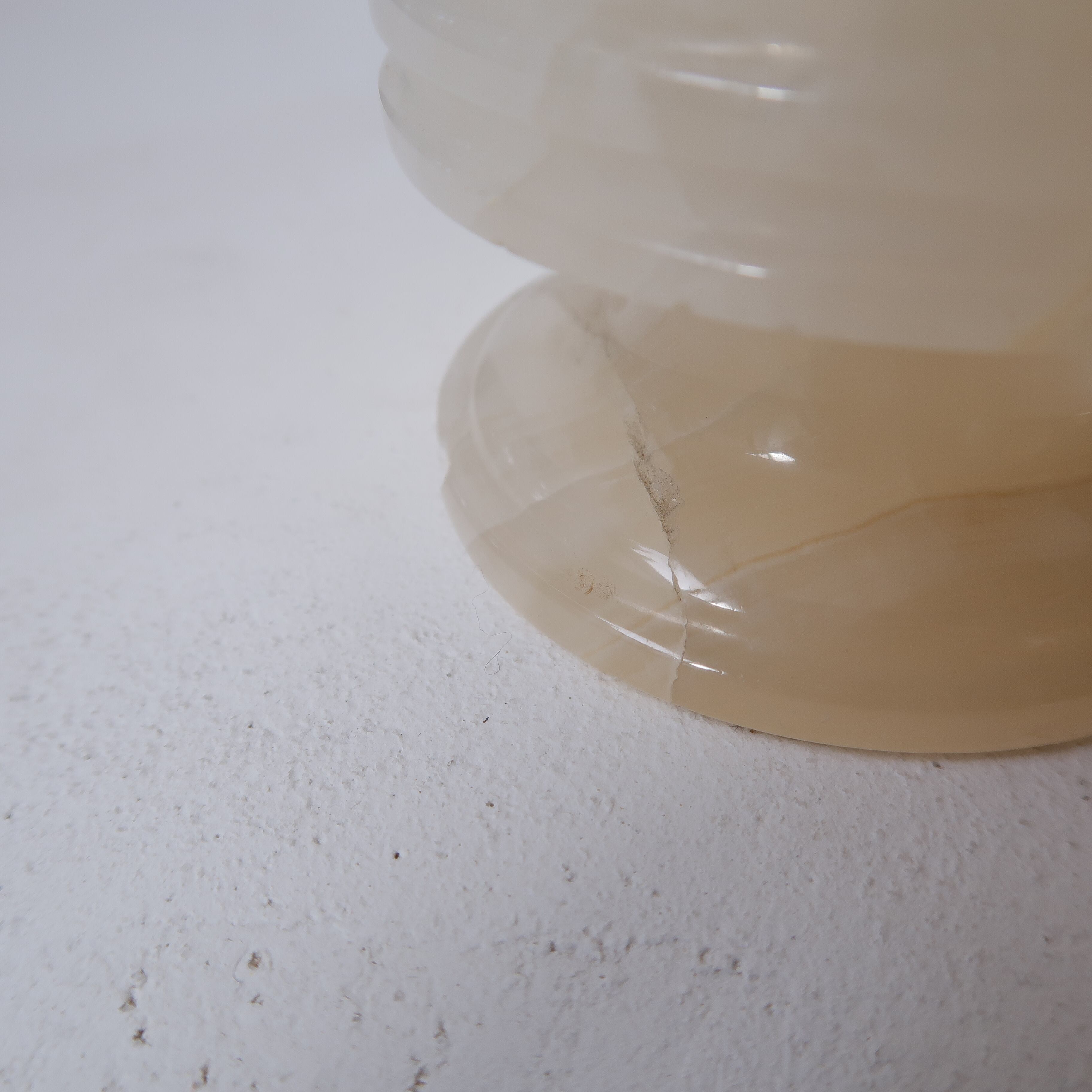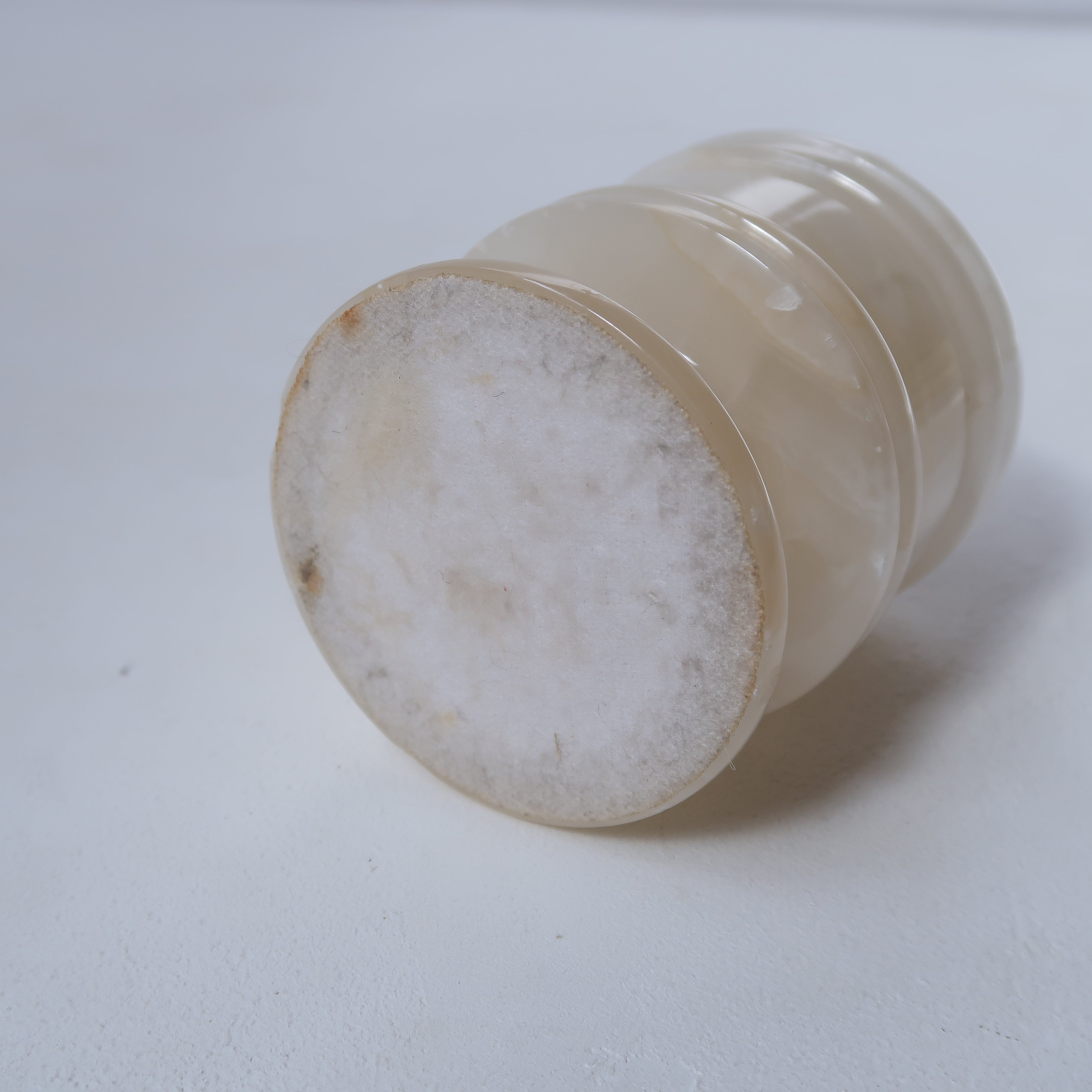 透明感がかわいいですが、重さはしっかり。安定感があります。底にはフェルトが貼ってあり使用感がありますが、机など傷つけないため便利なのでそのまま残しています。脚にはすこし欠けがあります。